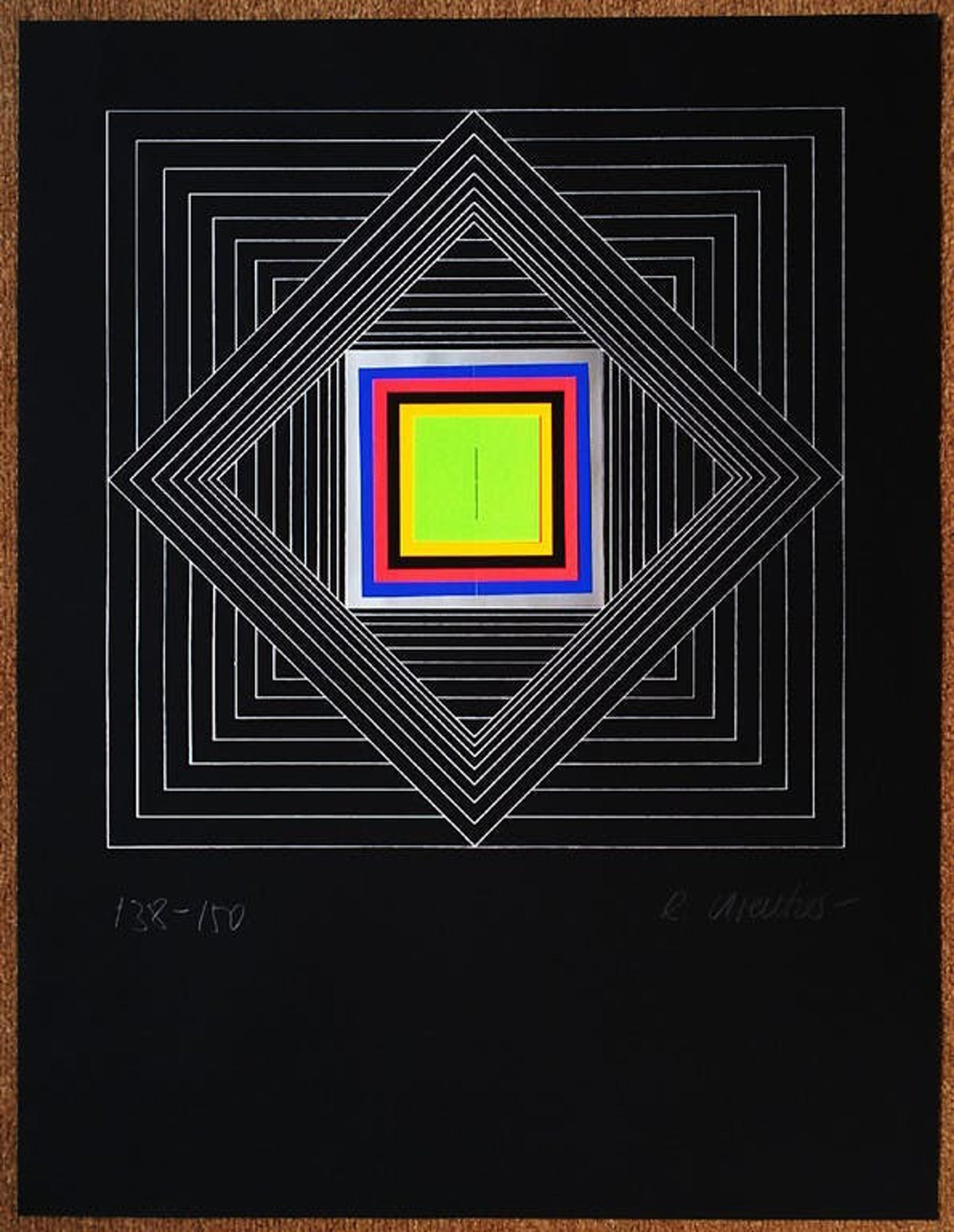 Oogverblindend geometrisch werk van een vooralsnog onbekende kunstenaar (waarschijnlijk een Duitse(r) want dit werk komt uit een map met Duitse hedendaagse kunst). Zeefdruk met collage (de kleurige vellen in het centrum, zie foto’s) op zwart papier, met potlood gesigneerd en genummerd (138-150), te dateren jaren 70. In uitstekende conditie.