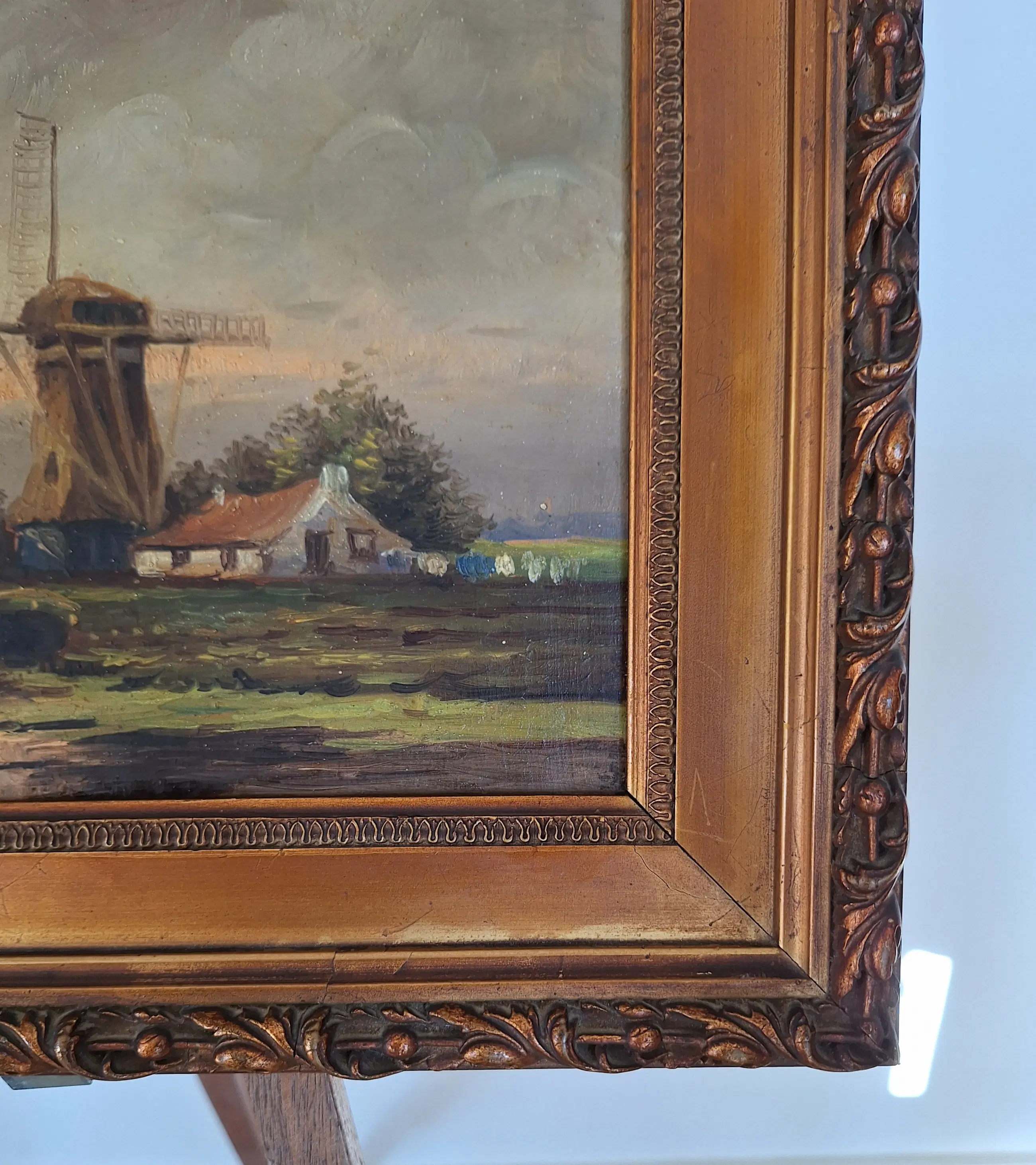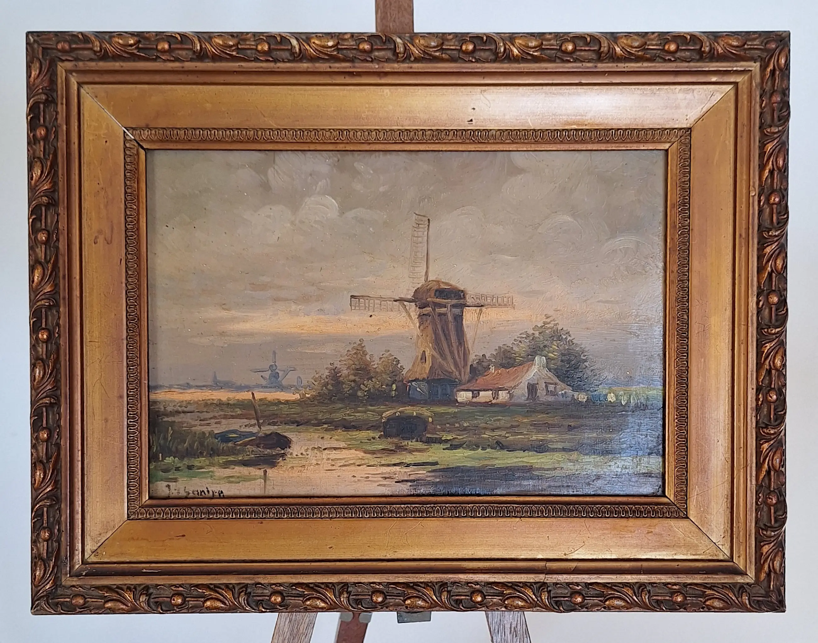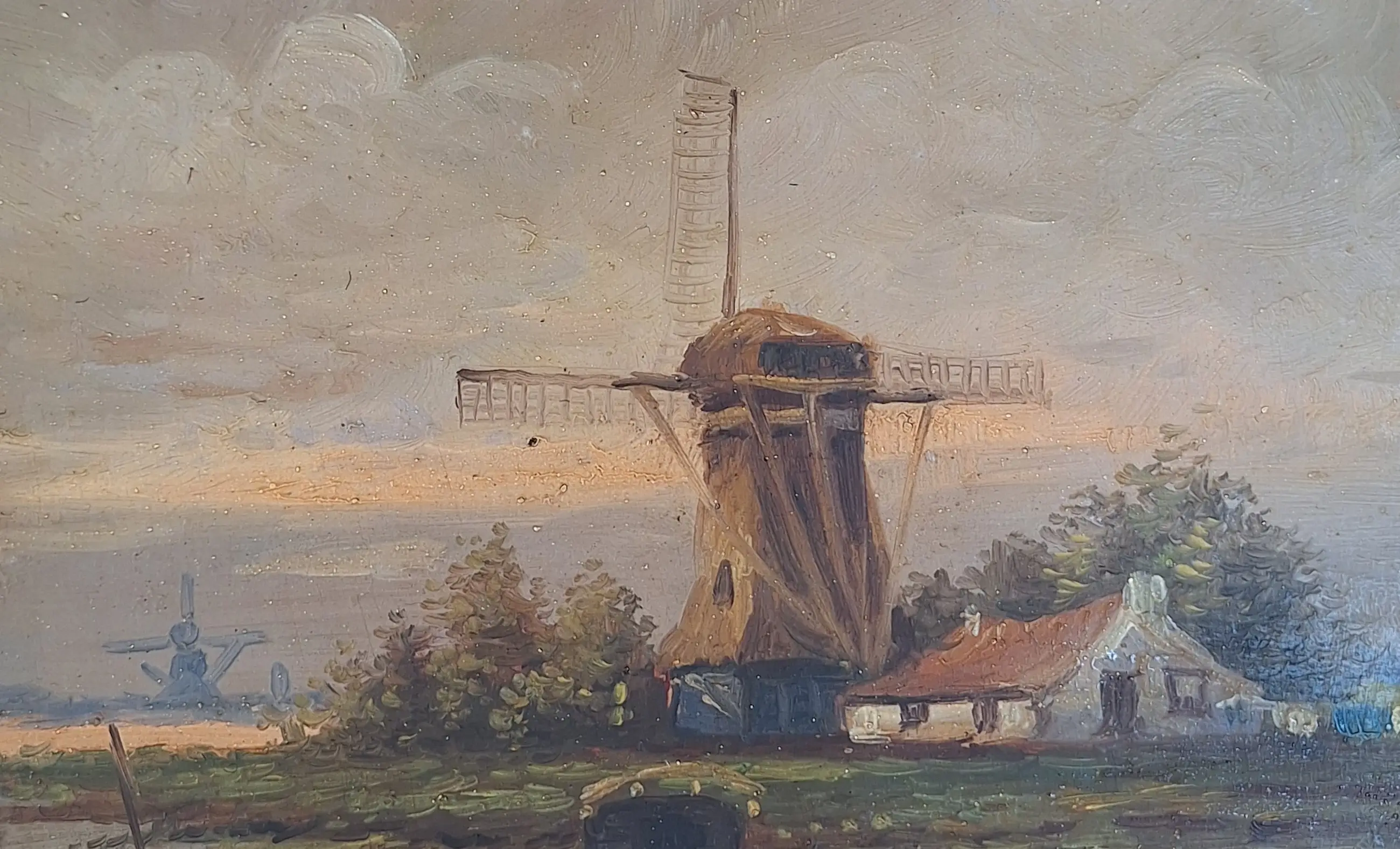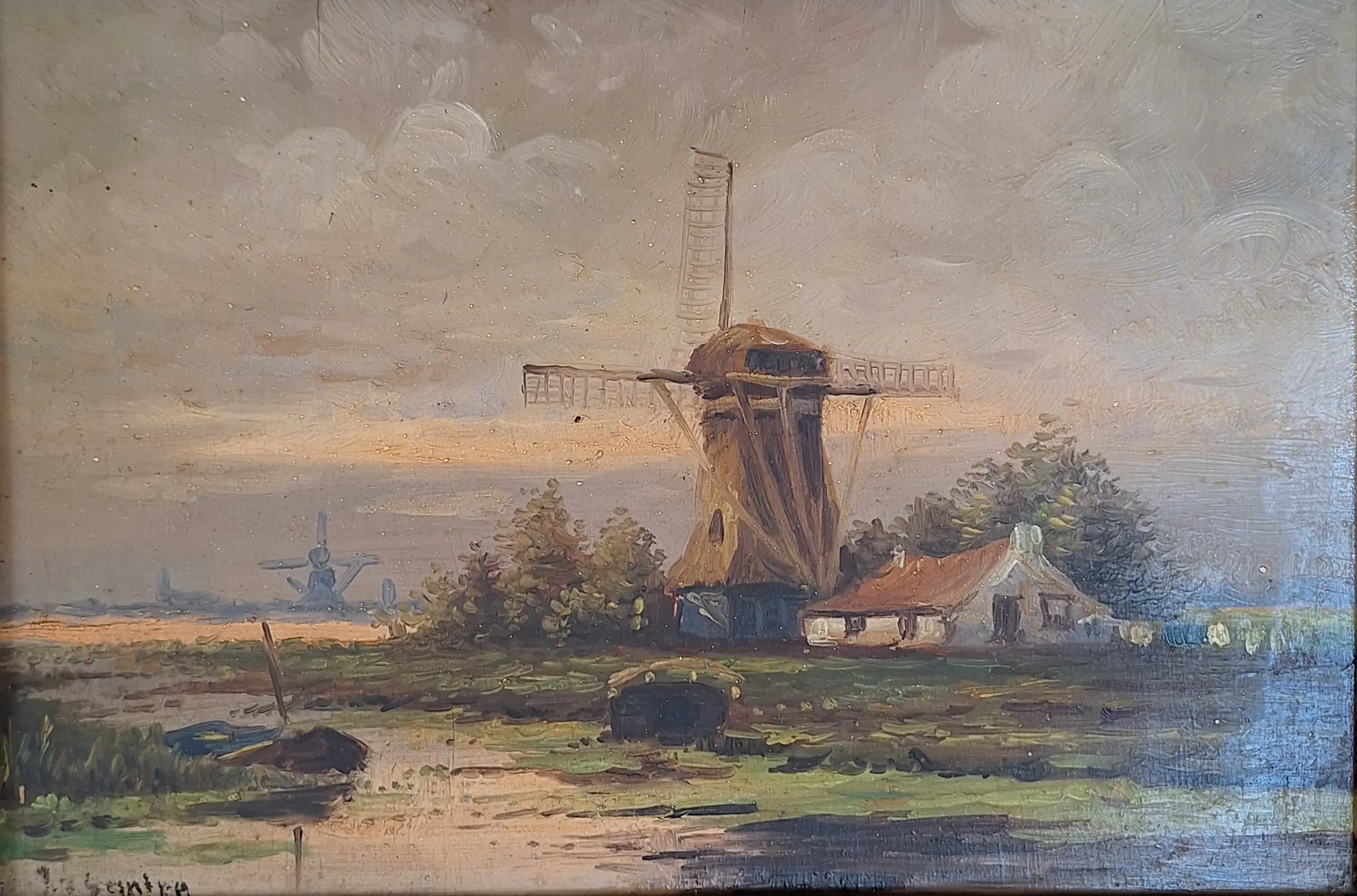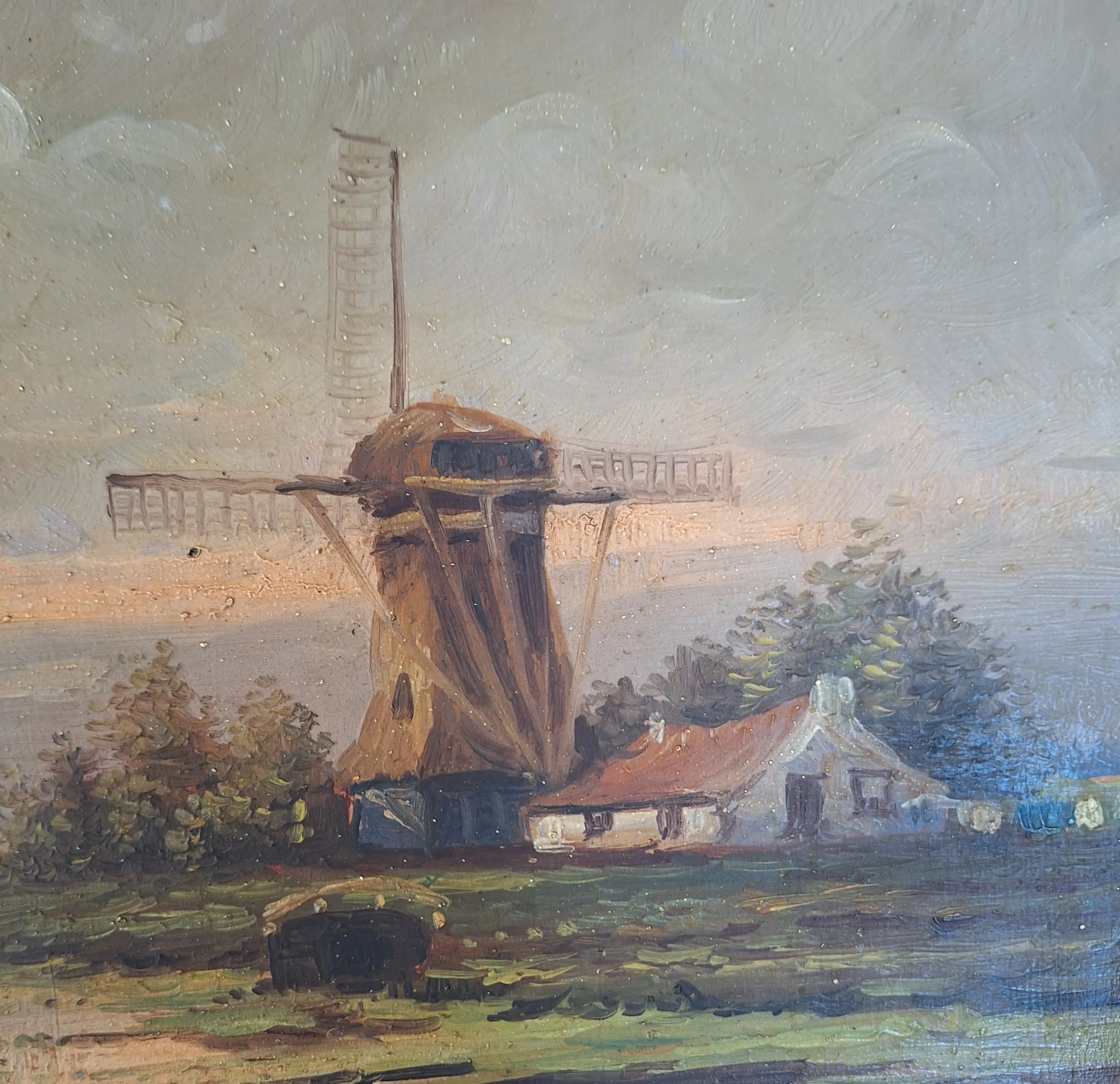 Landschap met molens. Zeer fraai werk - olieverf op paneel - l.o. gesigneerd, maar helaas niet door mij te herleiden tot de maker. Mooie heldere kleurstelling.