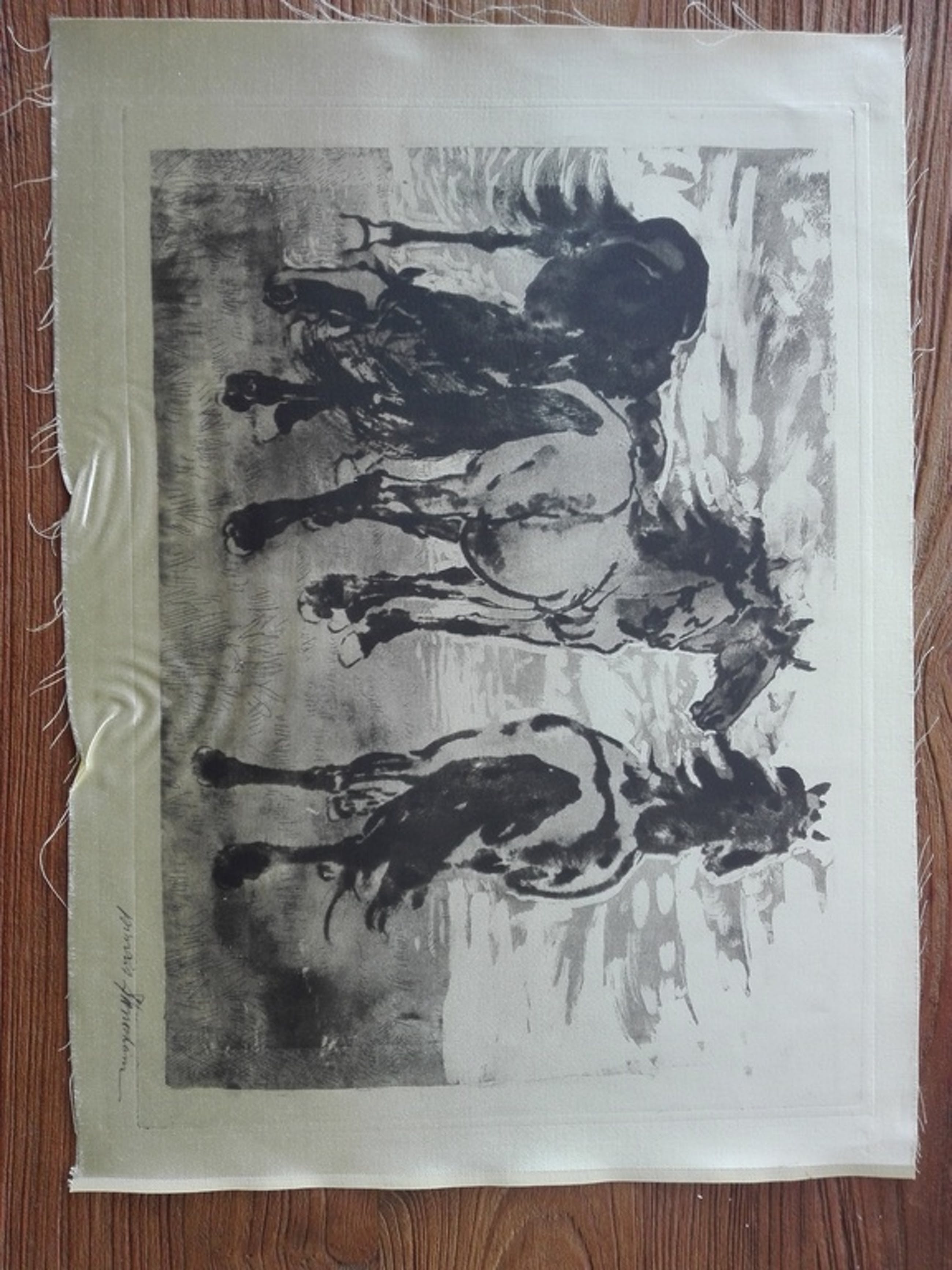 Zoals op de foto's te zien, is de zijde midden onder enigszins gekreukeld. Dit valt weg, zodra de ets achter glas is ingelijst.