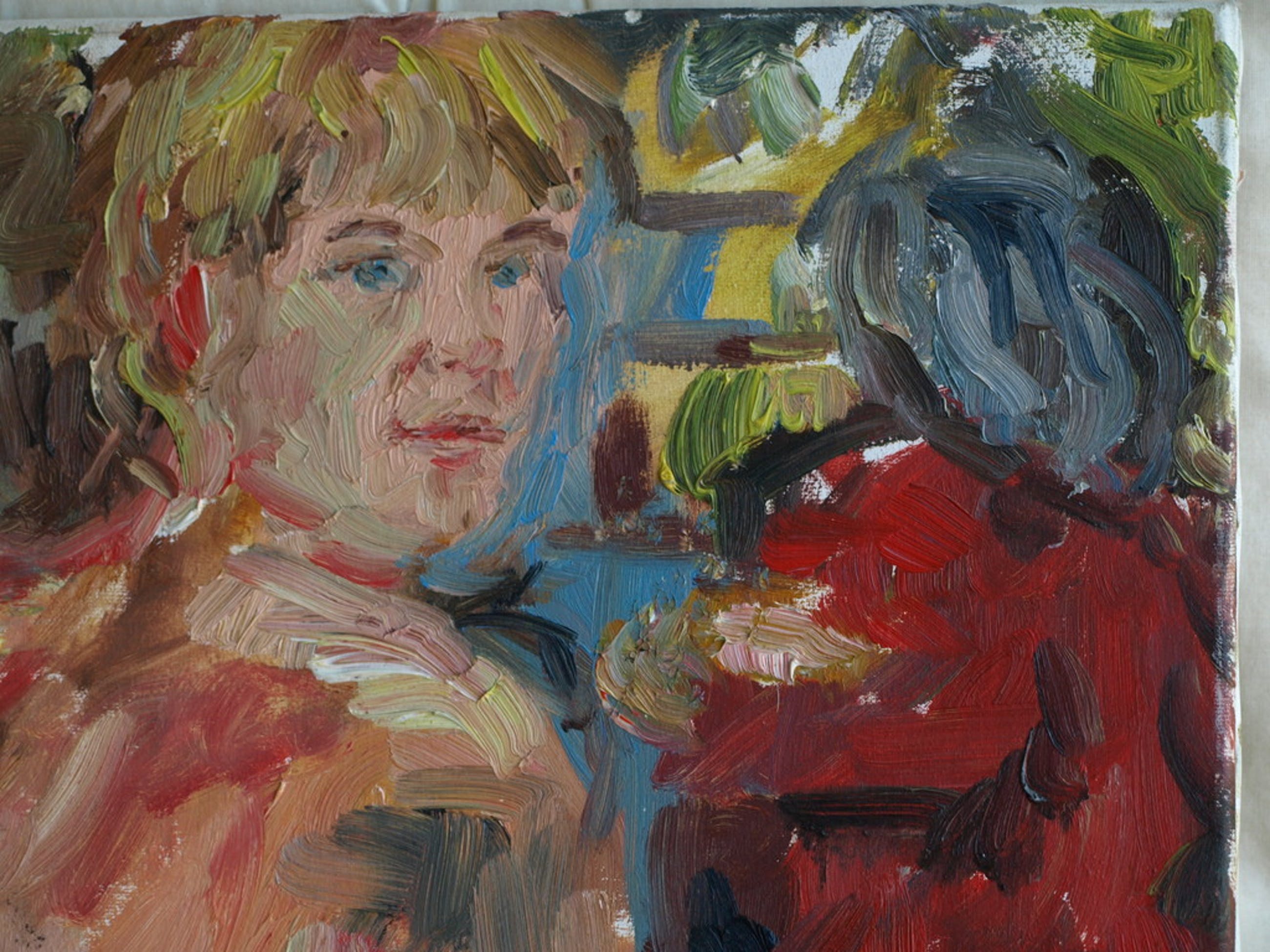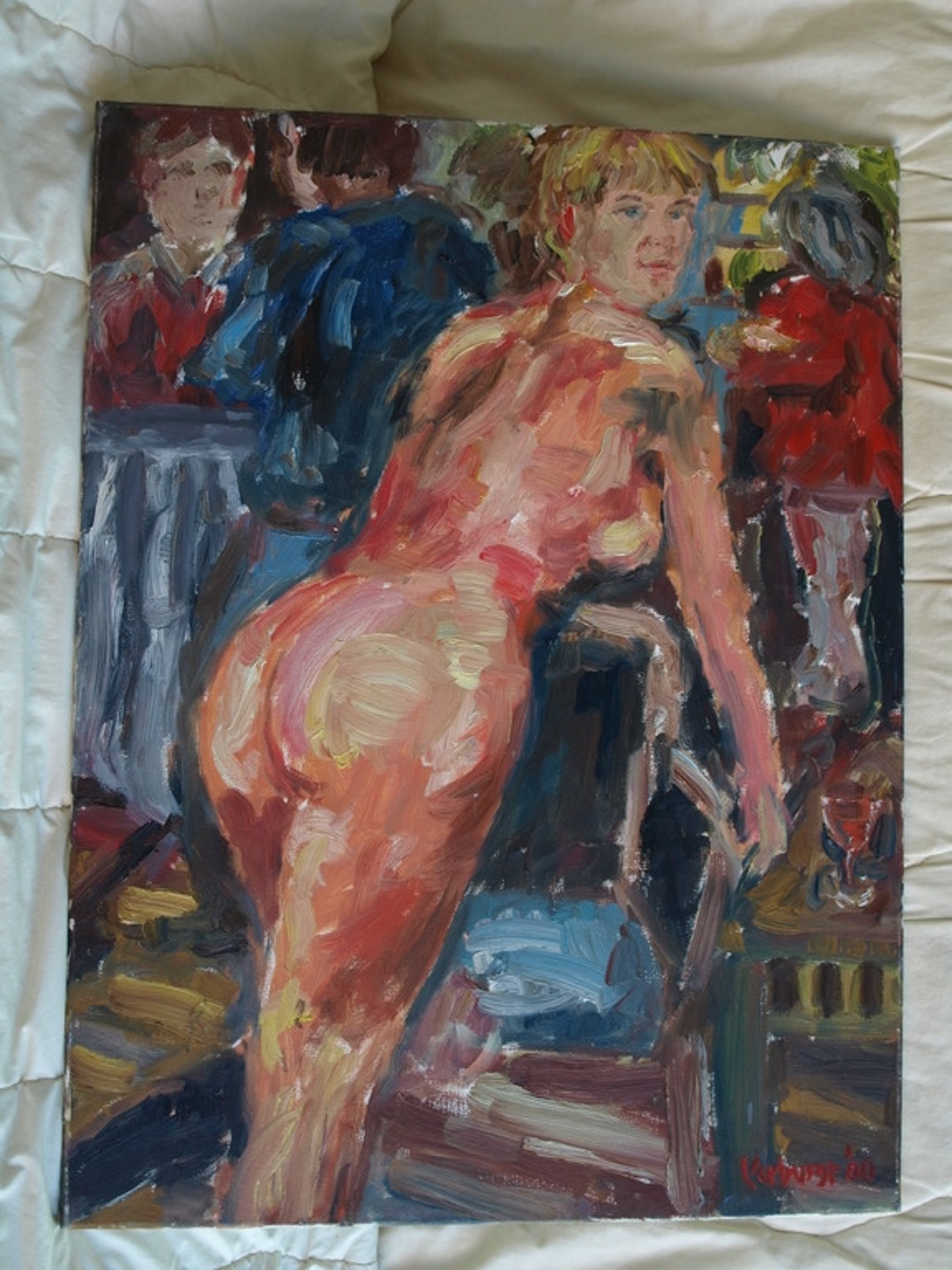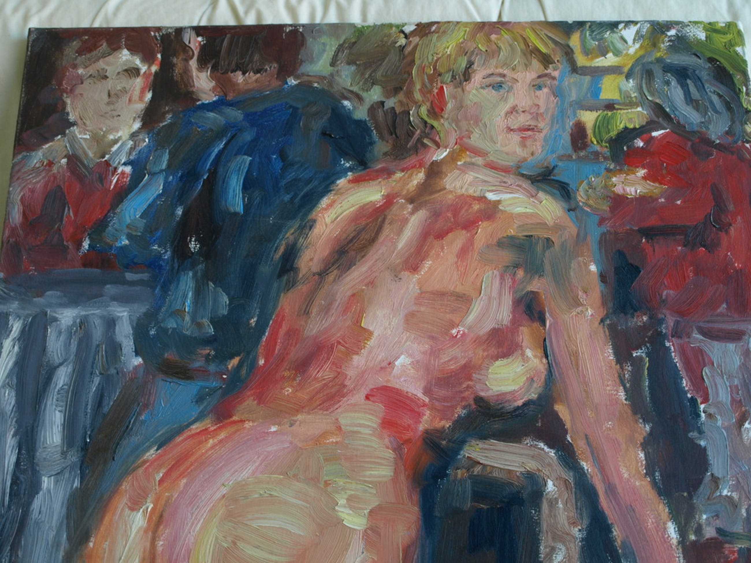 Een schilderij uit het jaar 2000 met een voorstelling van een naakte vrouw op een terras.