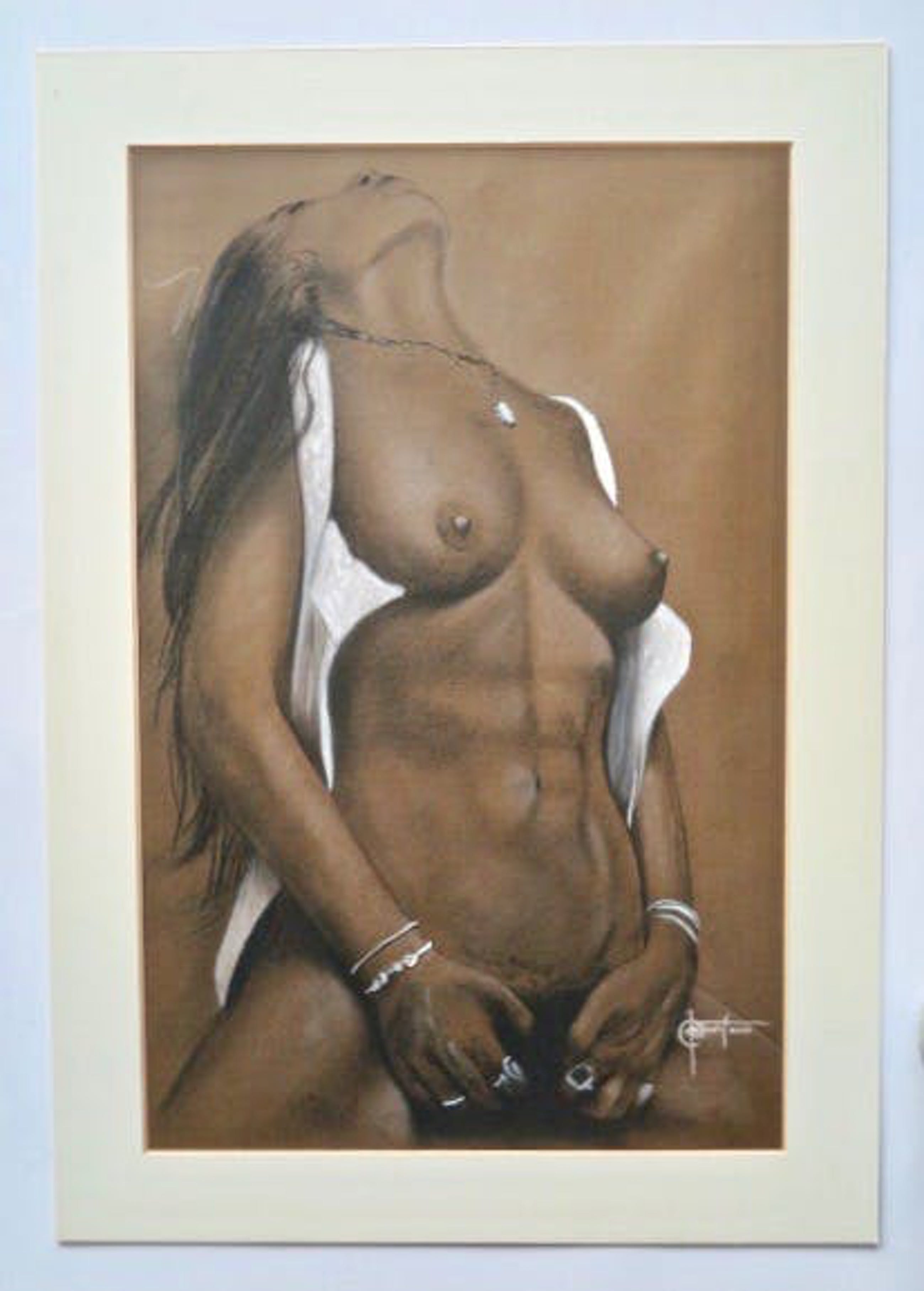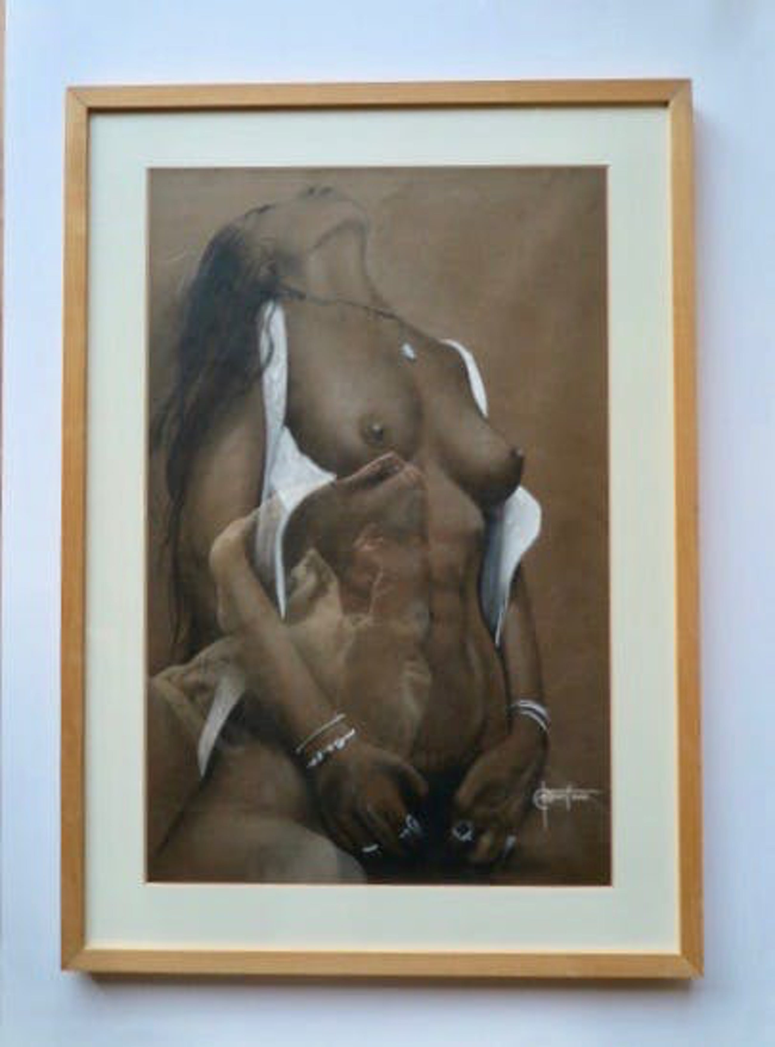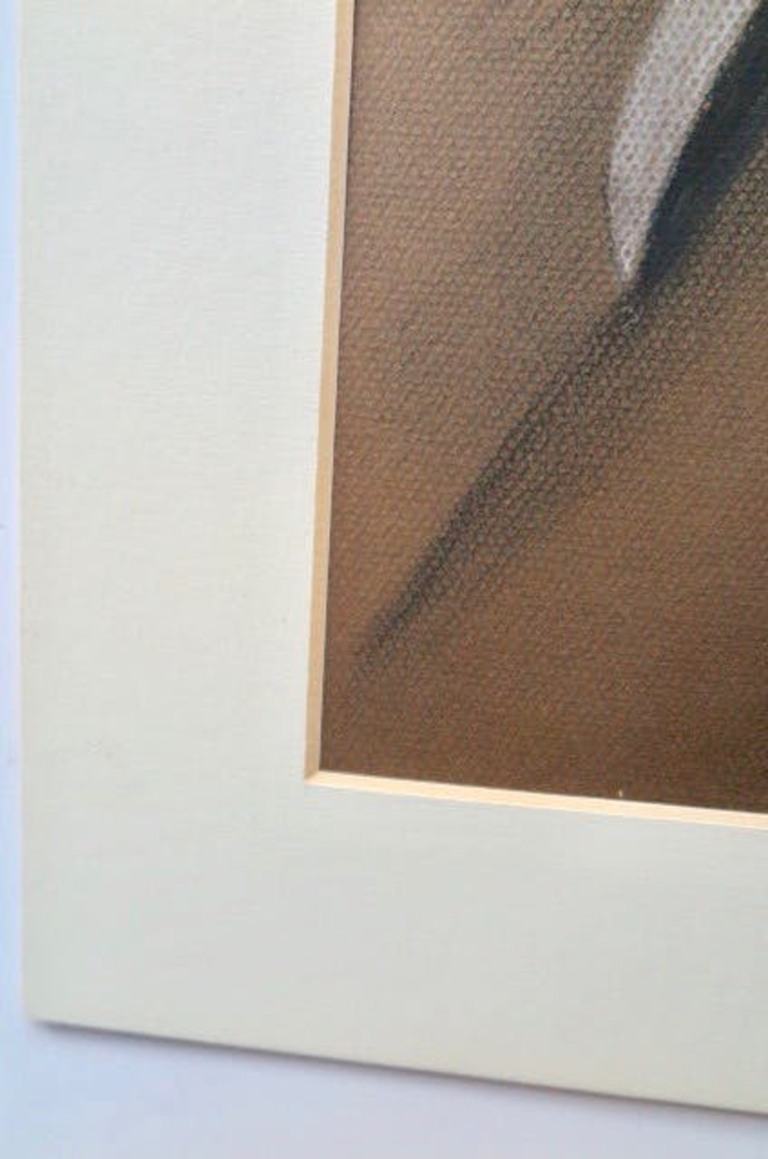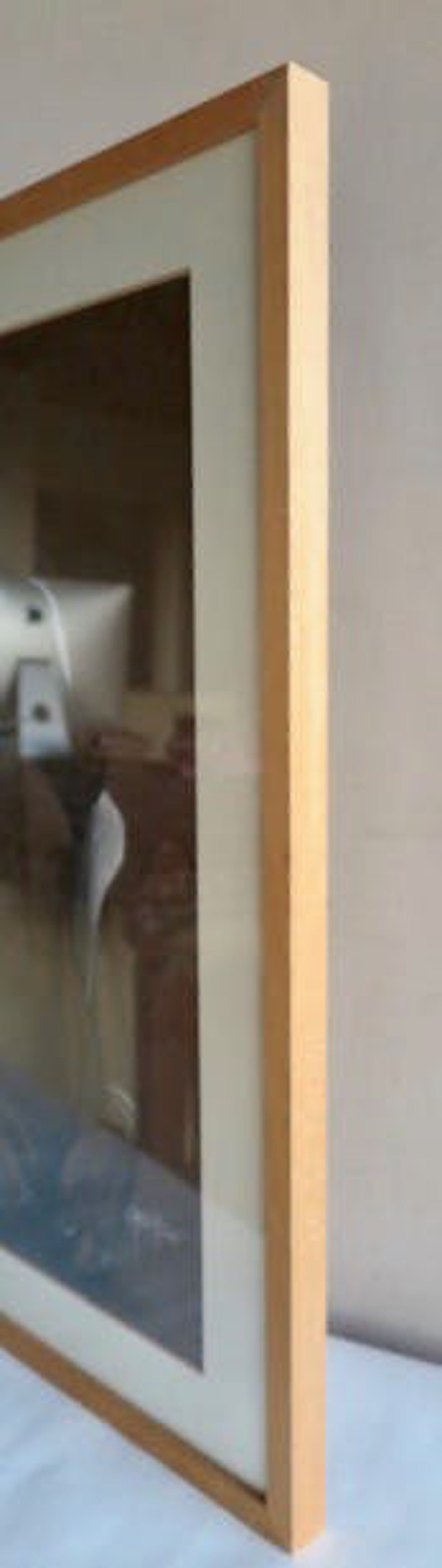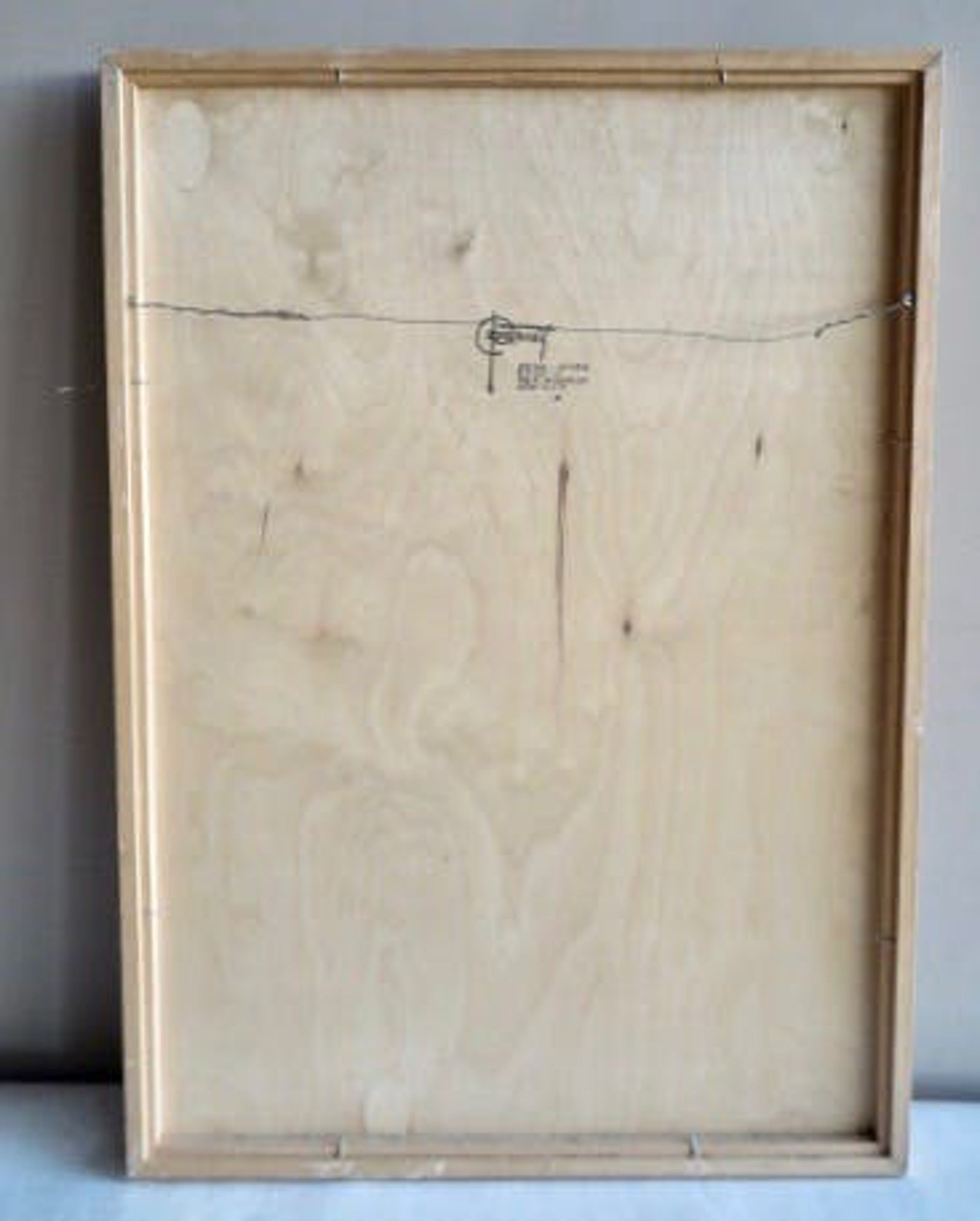 Fraai ingelijst in dik passe-partout zodat het werk vrij ligt. Achter glas in handgemaakte houten lijst, zo goed als nieuw.