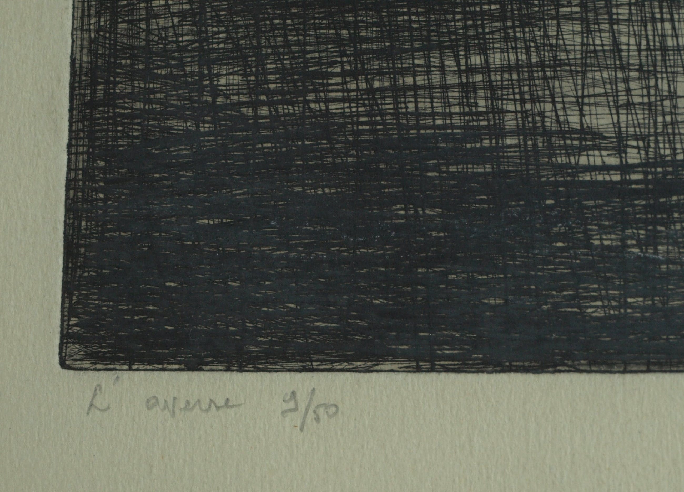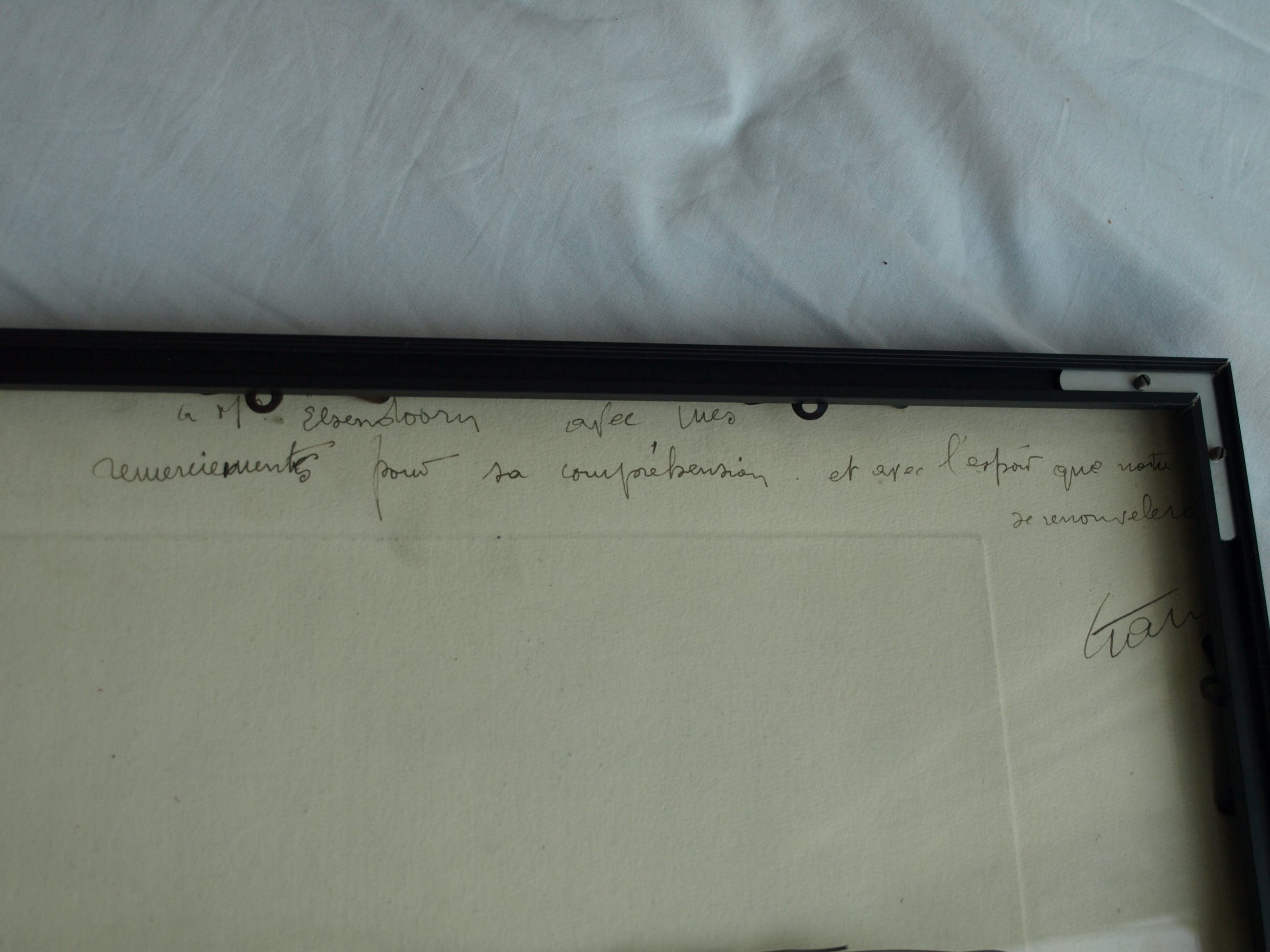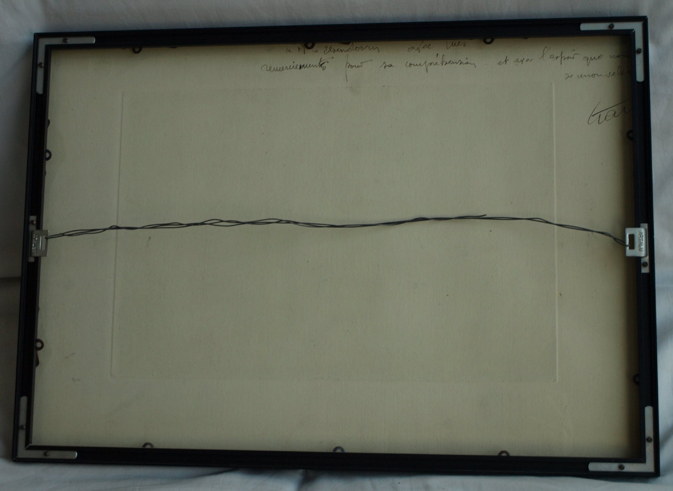-Ingelijst in een metalen lijst met glasplaat. Op de achterkant staat een Franstalige, handgeschreven boodschap van de kunstenaar voor de persoon aan wie hij de ets cadeau heeft gegeven (Jo Elsendoorn, zie hieronder bij ‘herkomst’).