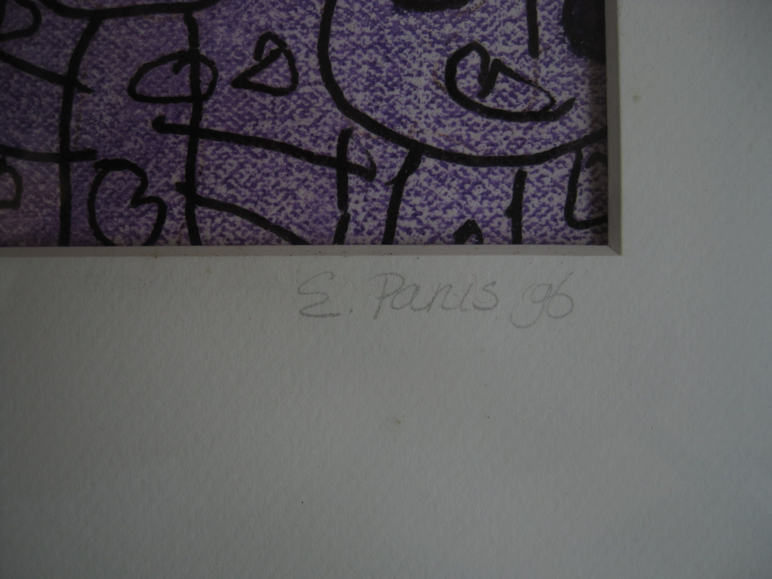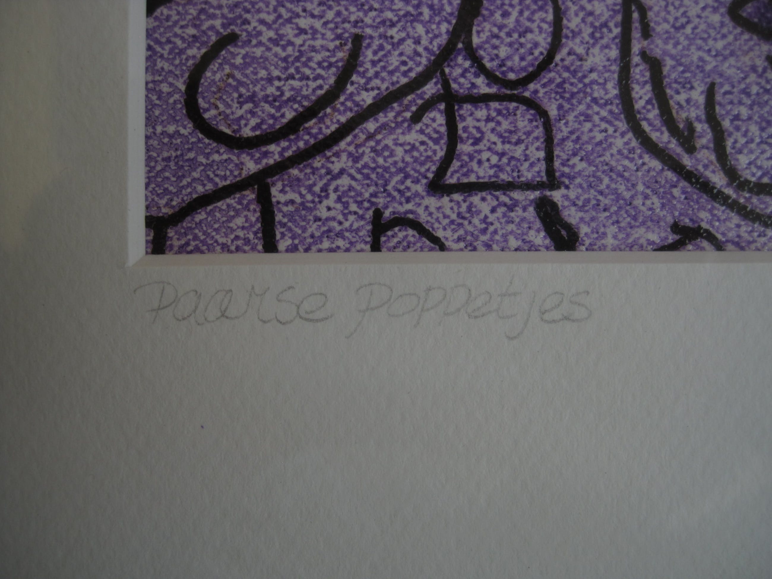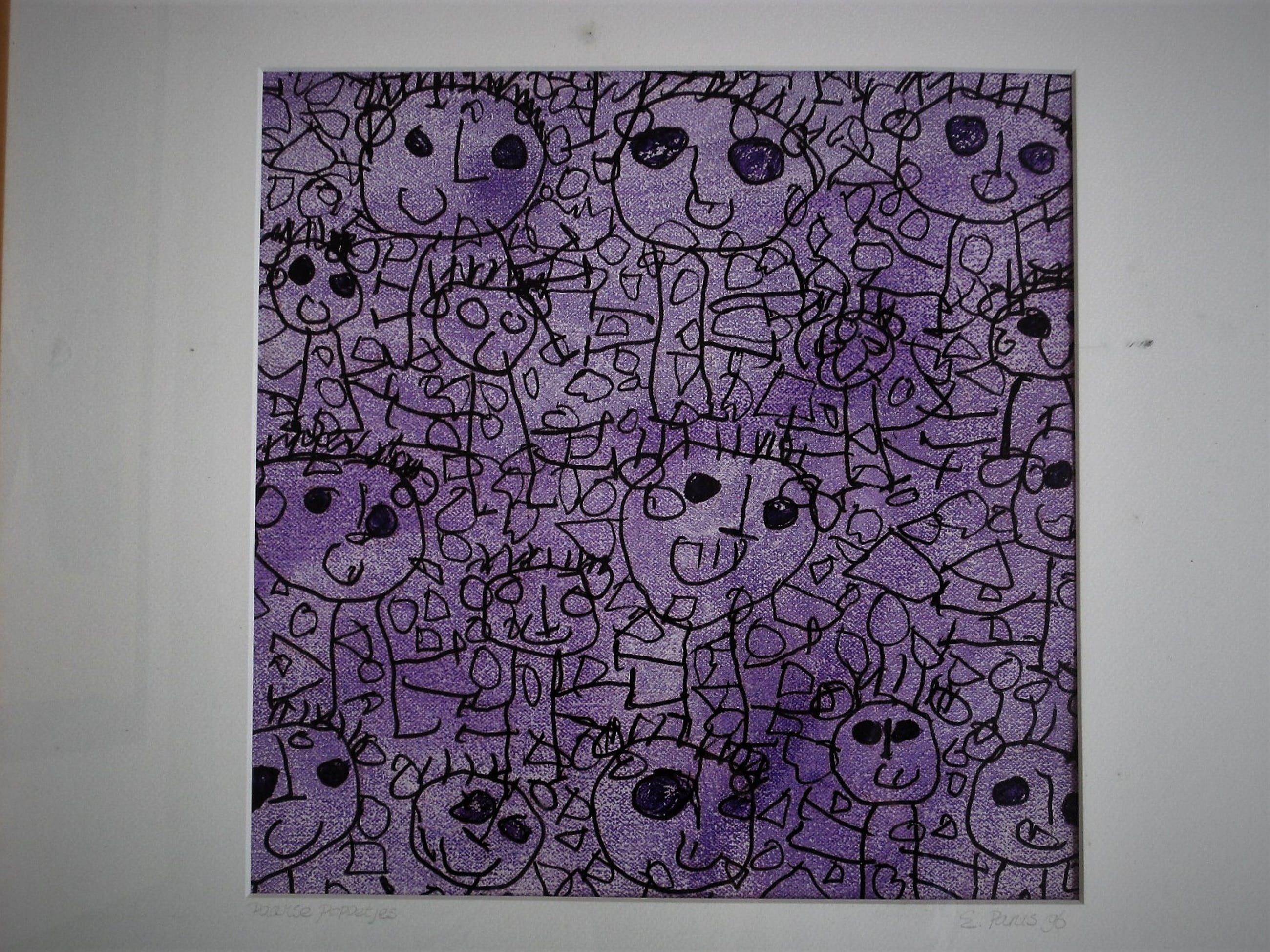 Intrigerende, gesigneerde Lithografie "Paarse Poppetjes". In goede conditie en achter glas geplaatst.