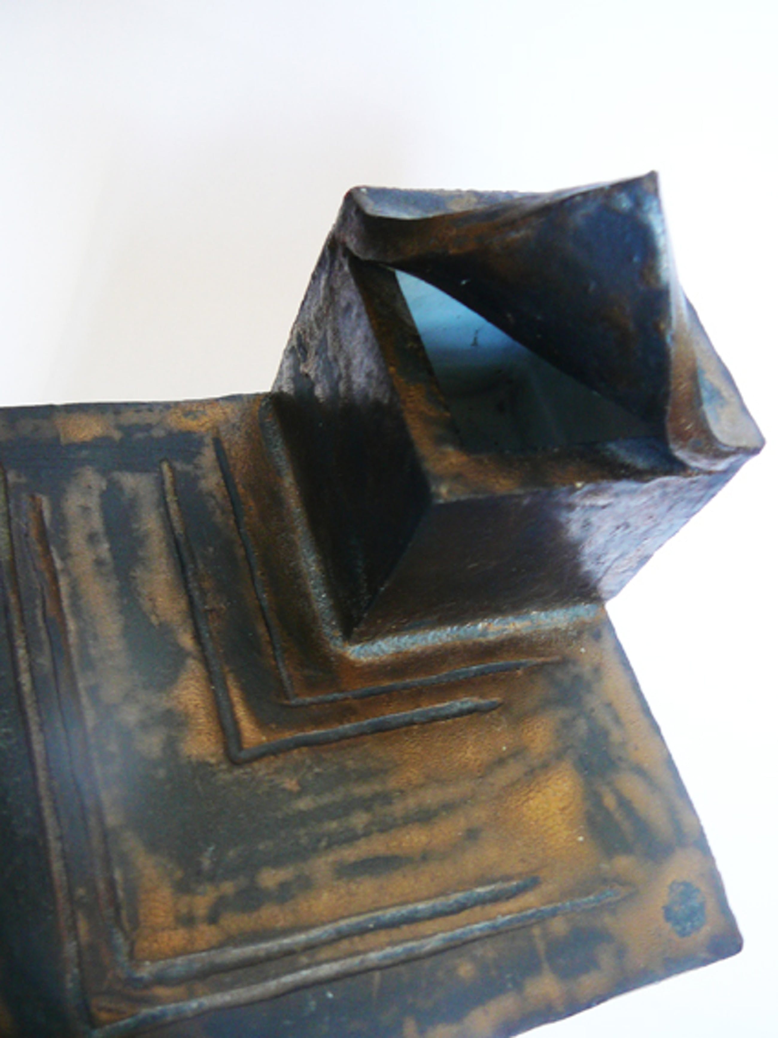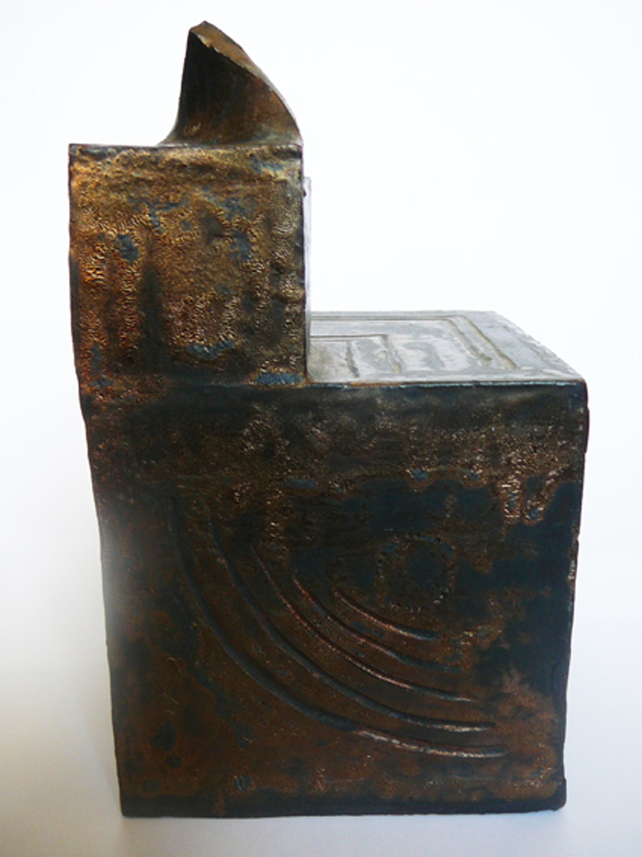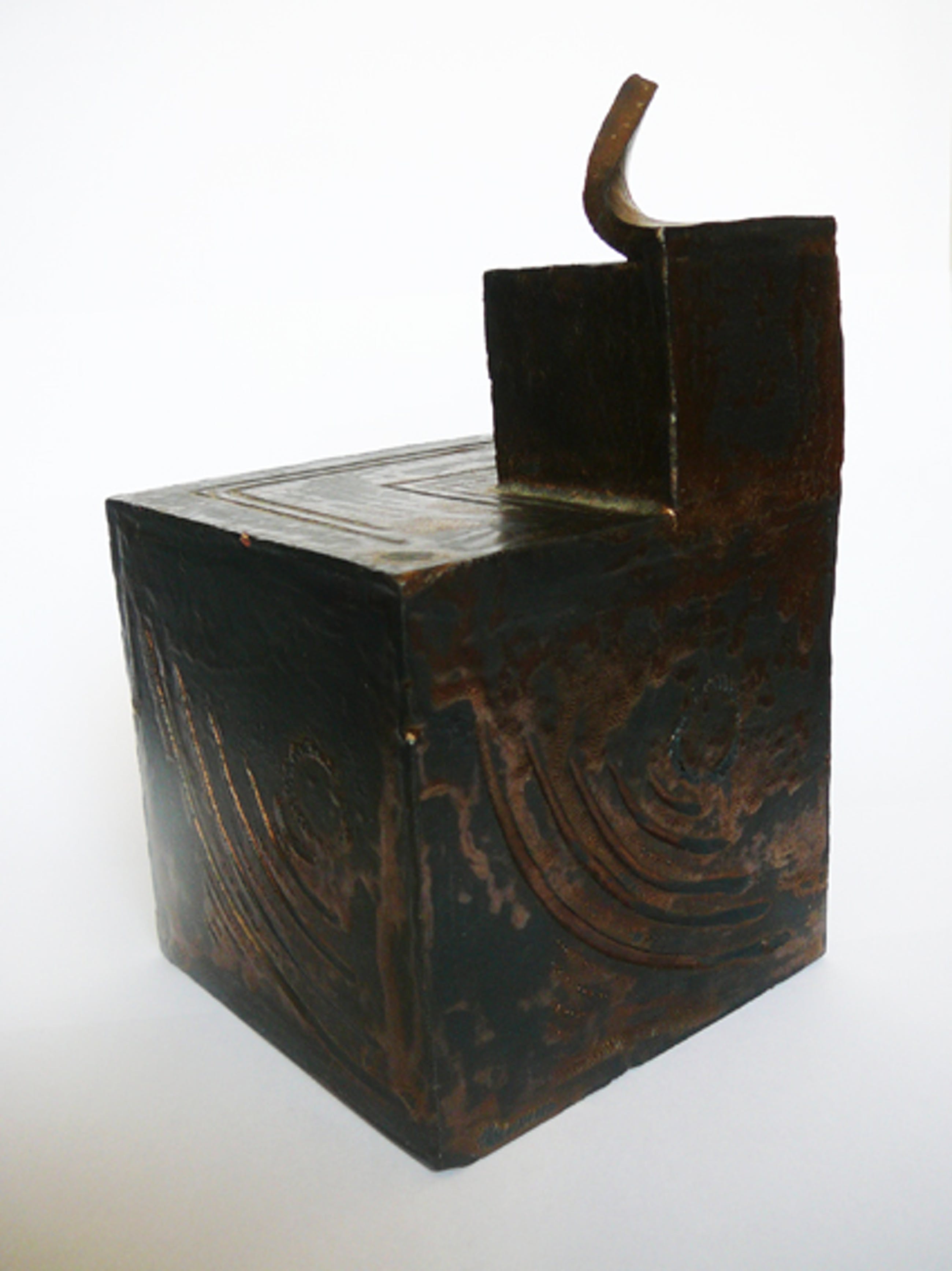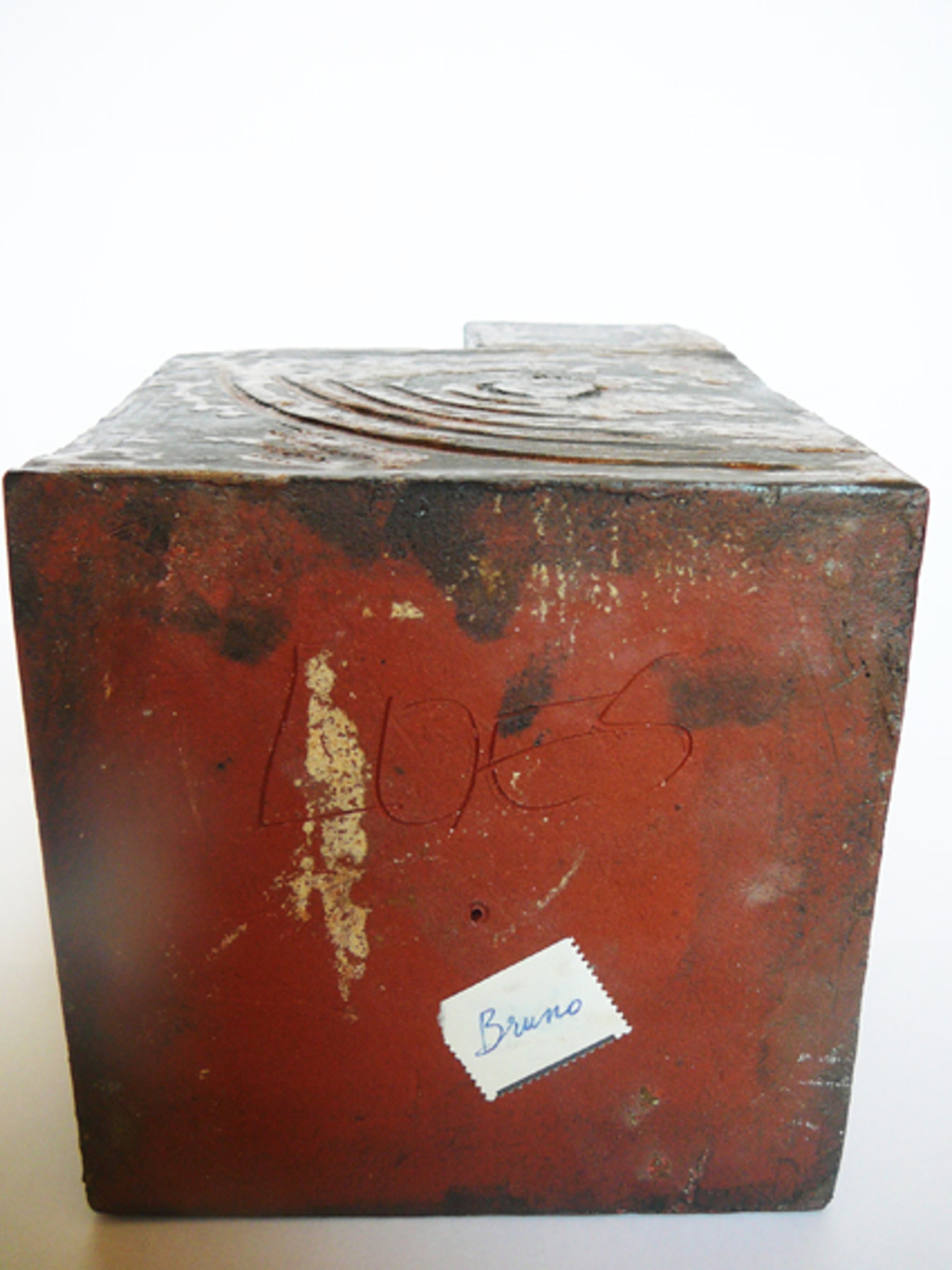 Abstract beeld voorstellende twee gestapelde kubussen met een half geopende zijde (zie foto's). Het object is zwart/bronsachtig gepatineerd en aan alle zijden eenvoudig gedecoreerd. Het beeld is aan de onderzijde gesigneerd 'Loes' en voorzien met een zegeltje 'Bruno'.