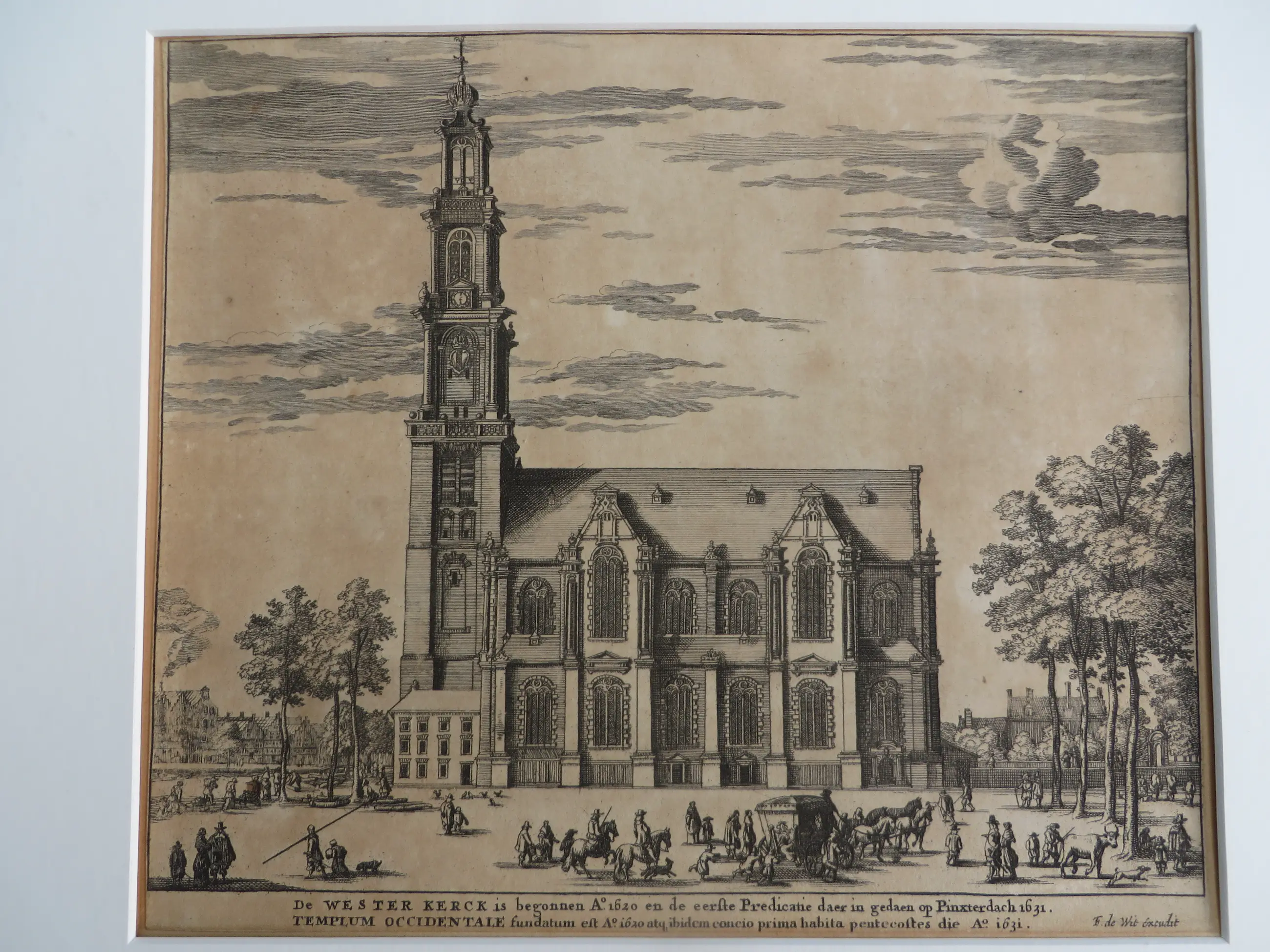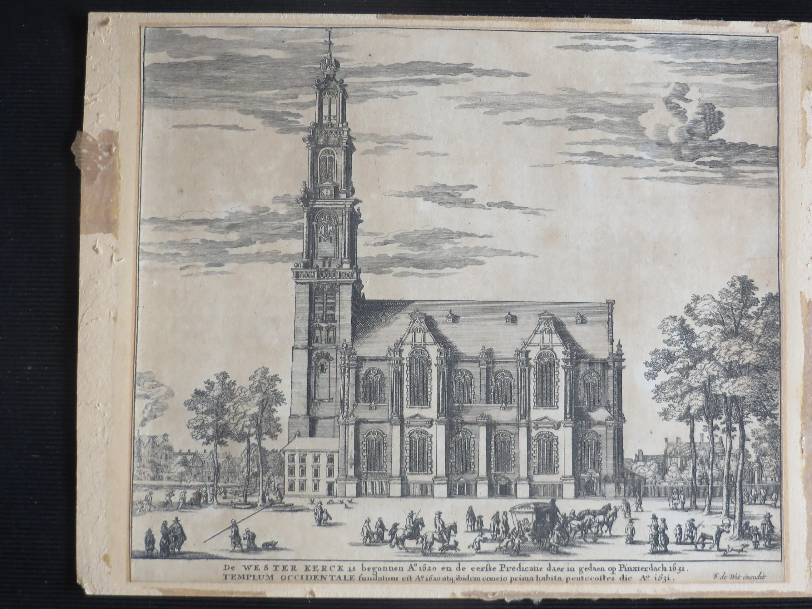 Onderschrift in nederlands en latijn: 'De Westerkerk is begonnen anno 1620, en de eerste Predicatie is gedaan op Pinxterdach 1631'