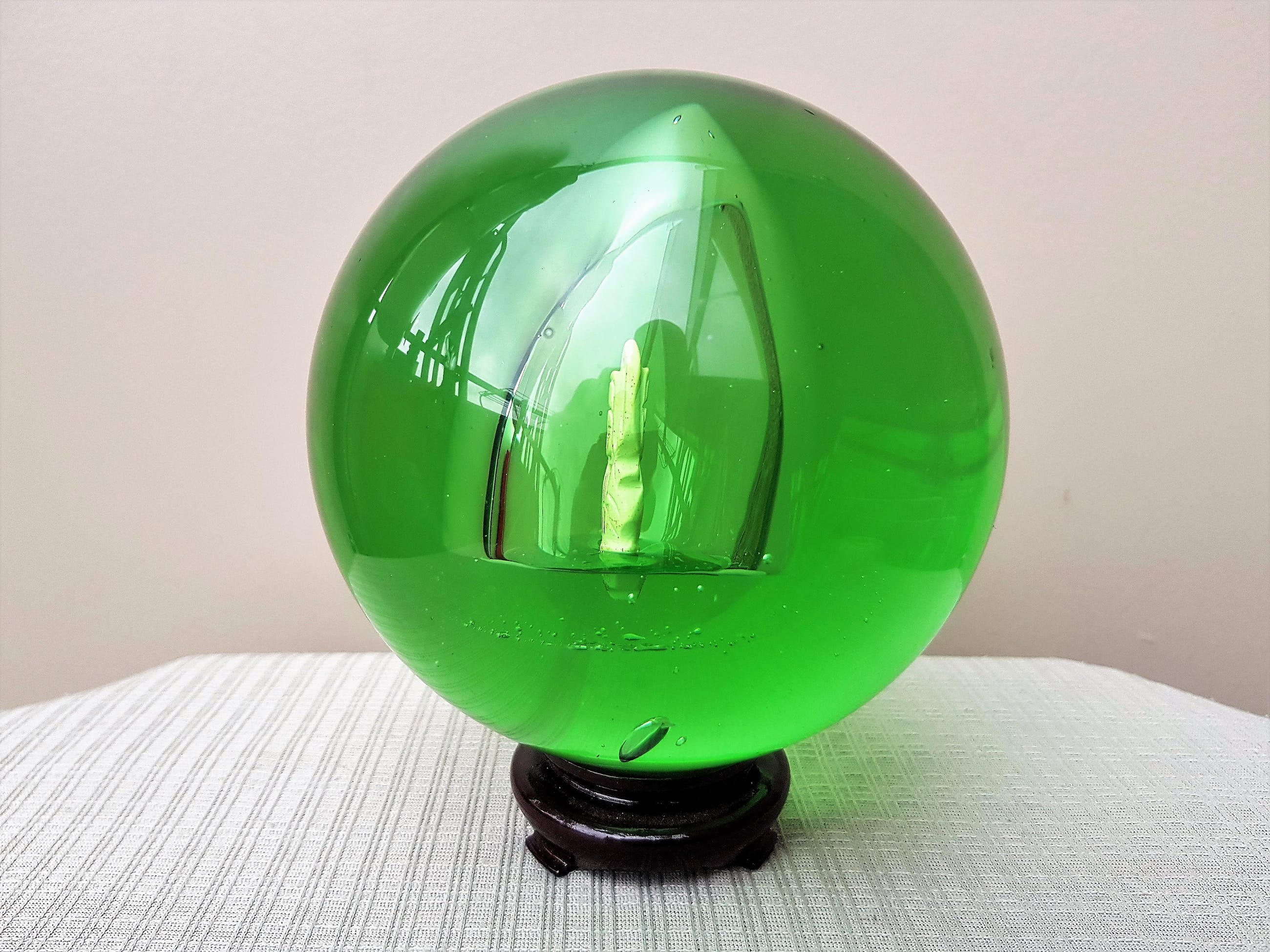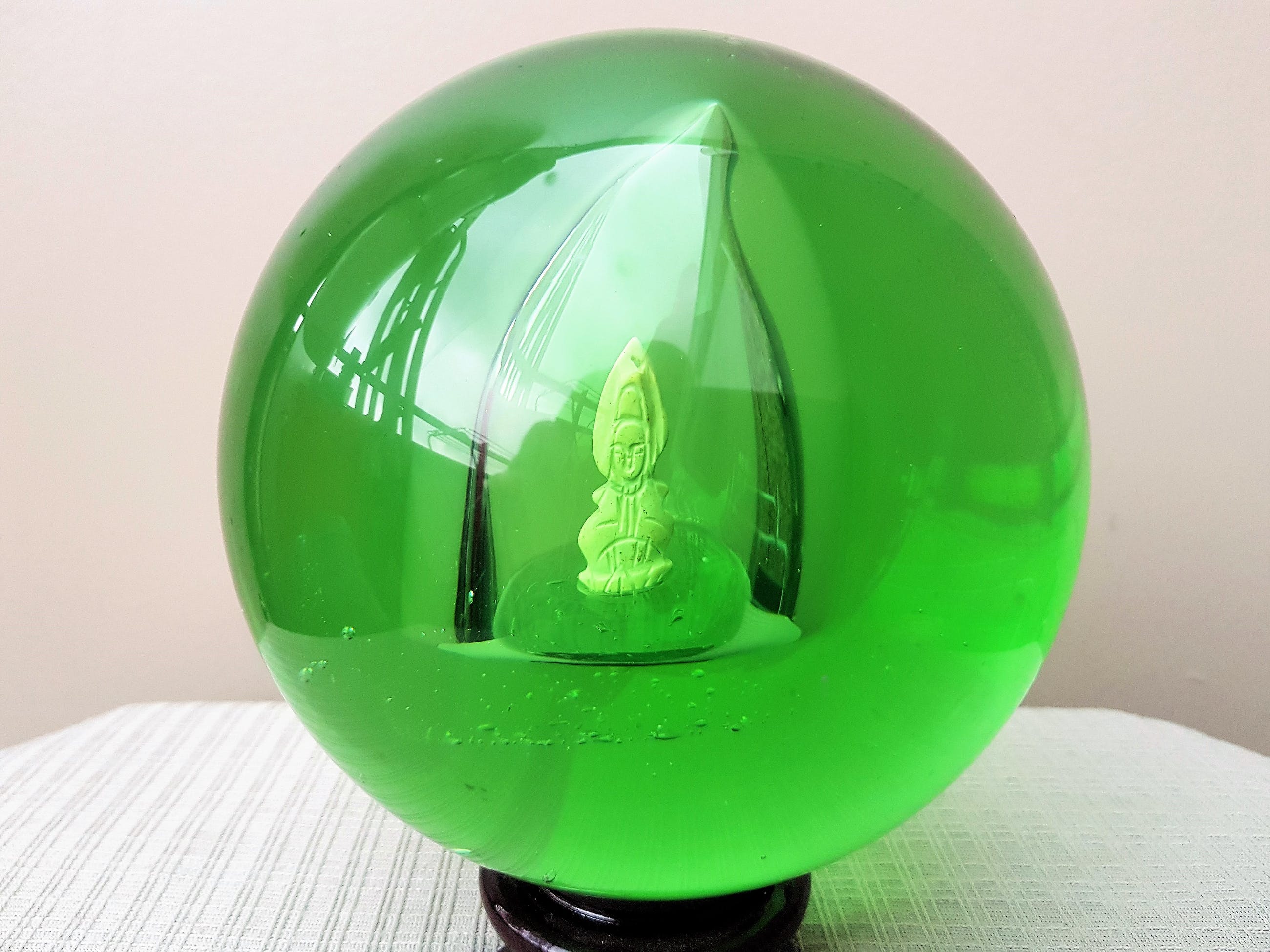 Groen Glazen Bol met Beeldje. Afm: inclusief houten voet: 14.5 cm. Afm: glazen bol: 12 cm. Omtrek: 37 cm. Gewicht: 1974 gram. Conditie: in perfecte staat.