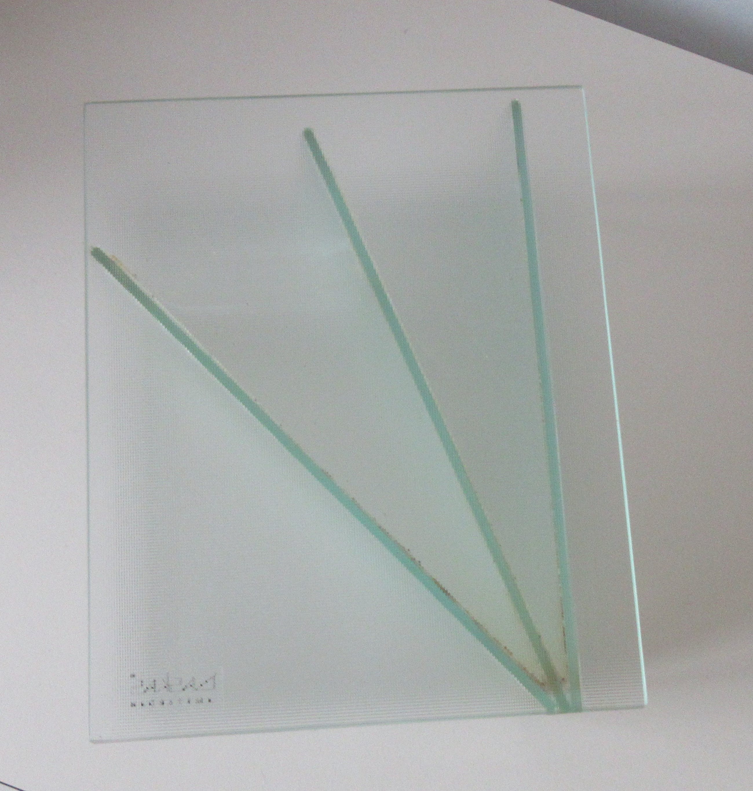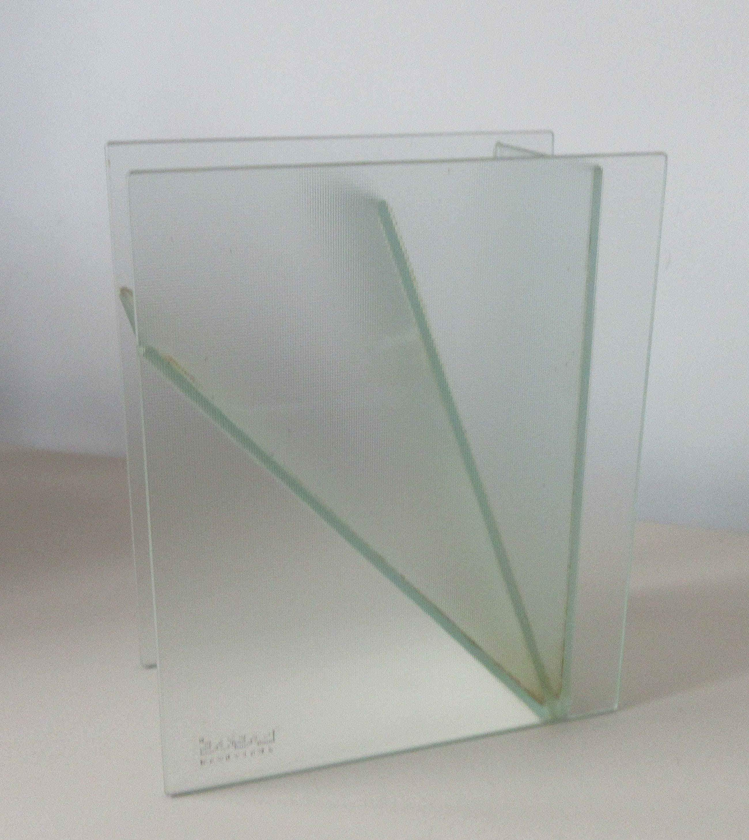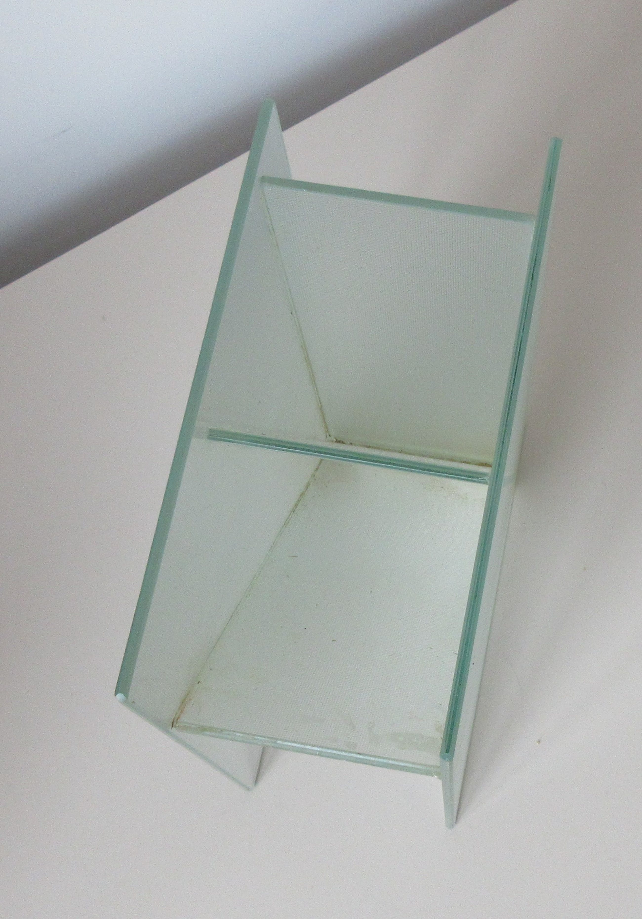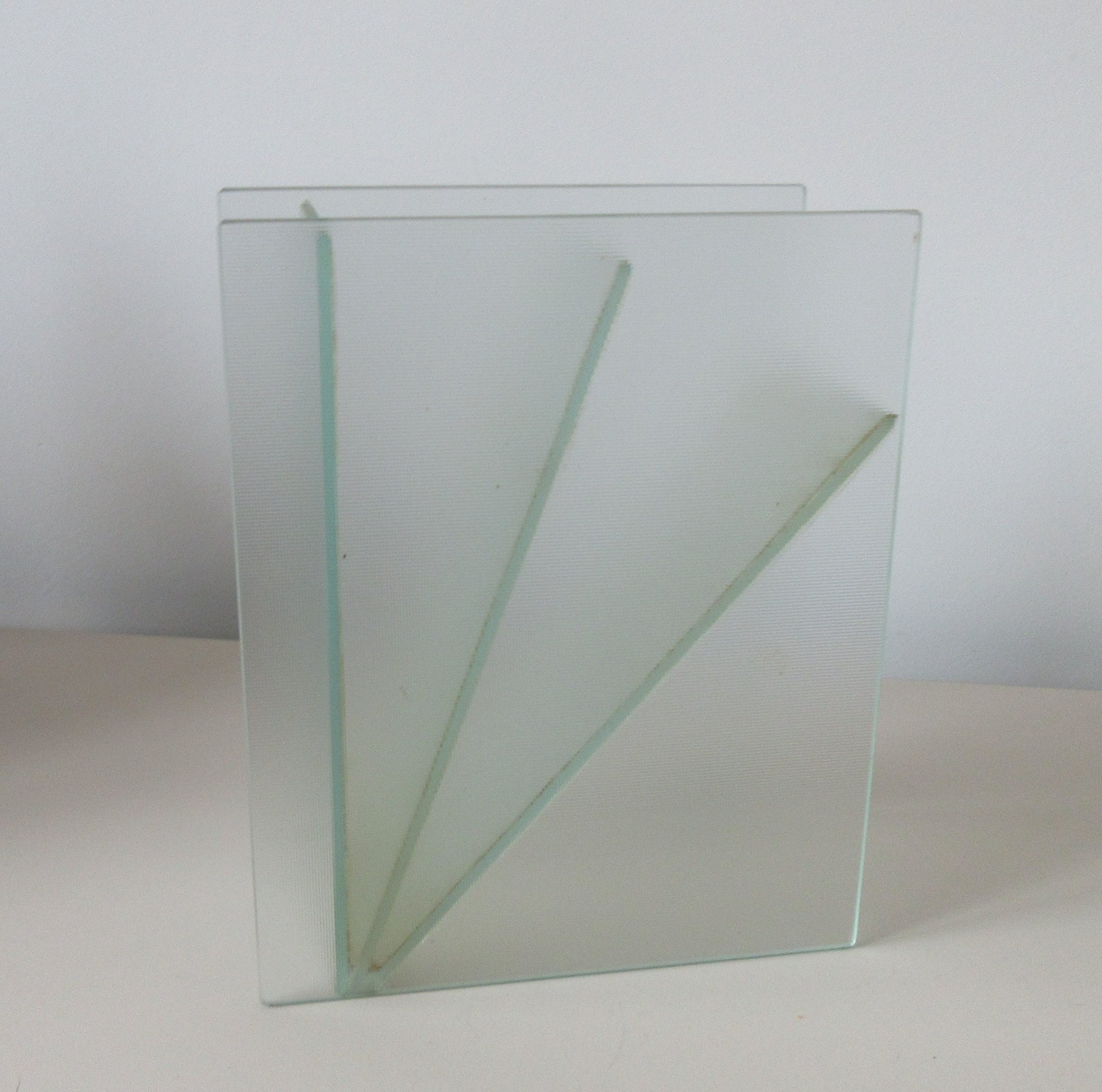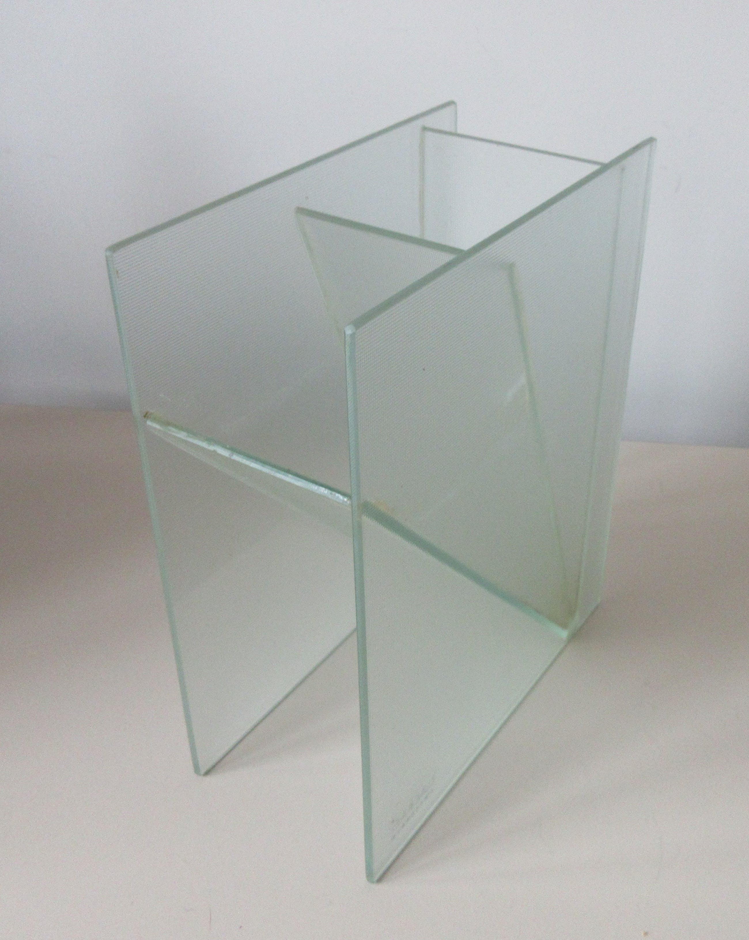 De vaas is 22 cm hoog, 18 cm breed en 9 cm diep. De siliconenkit is licht verkleurd door de tijd, de glas zelf is onbeschadigd.