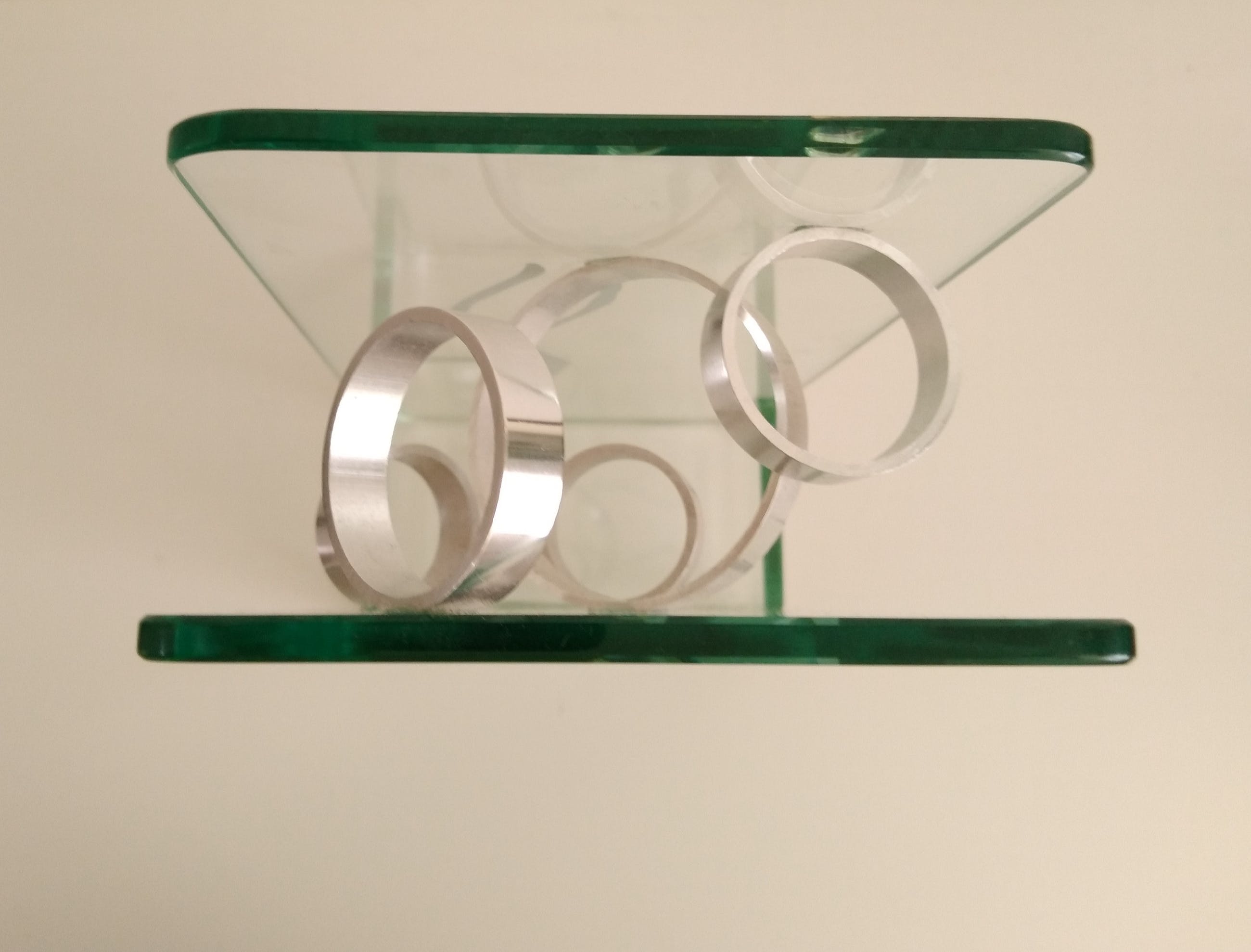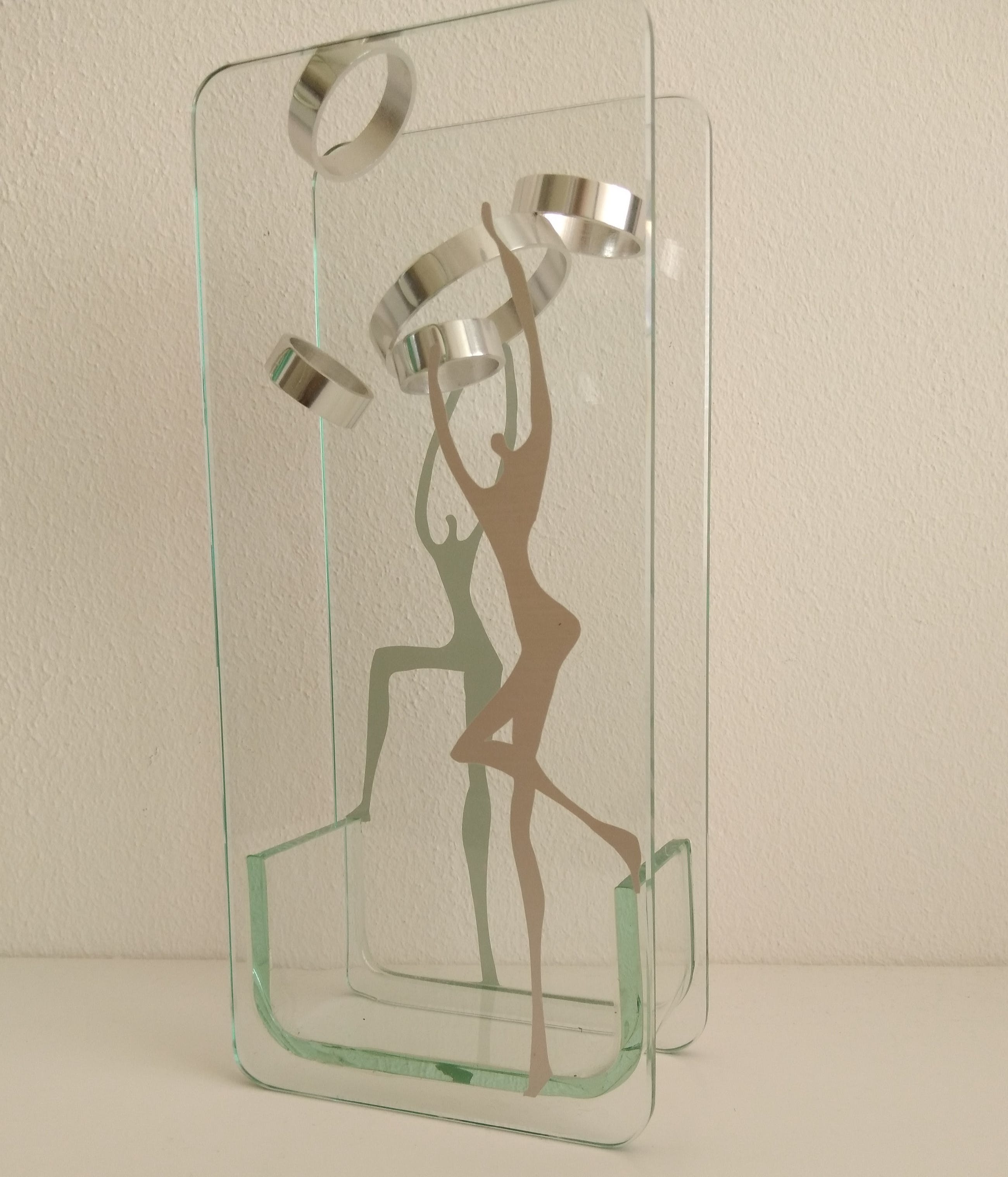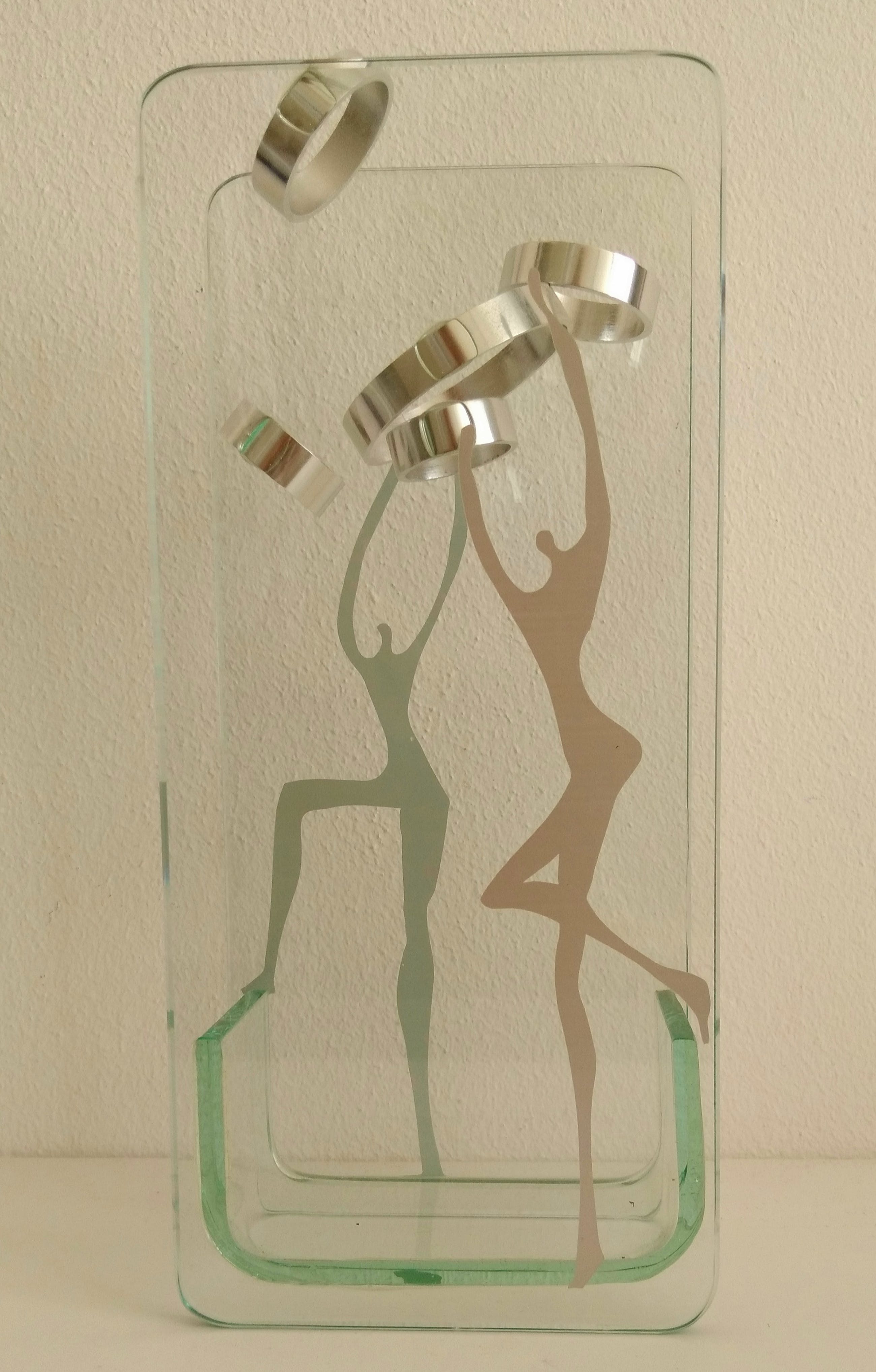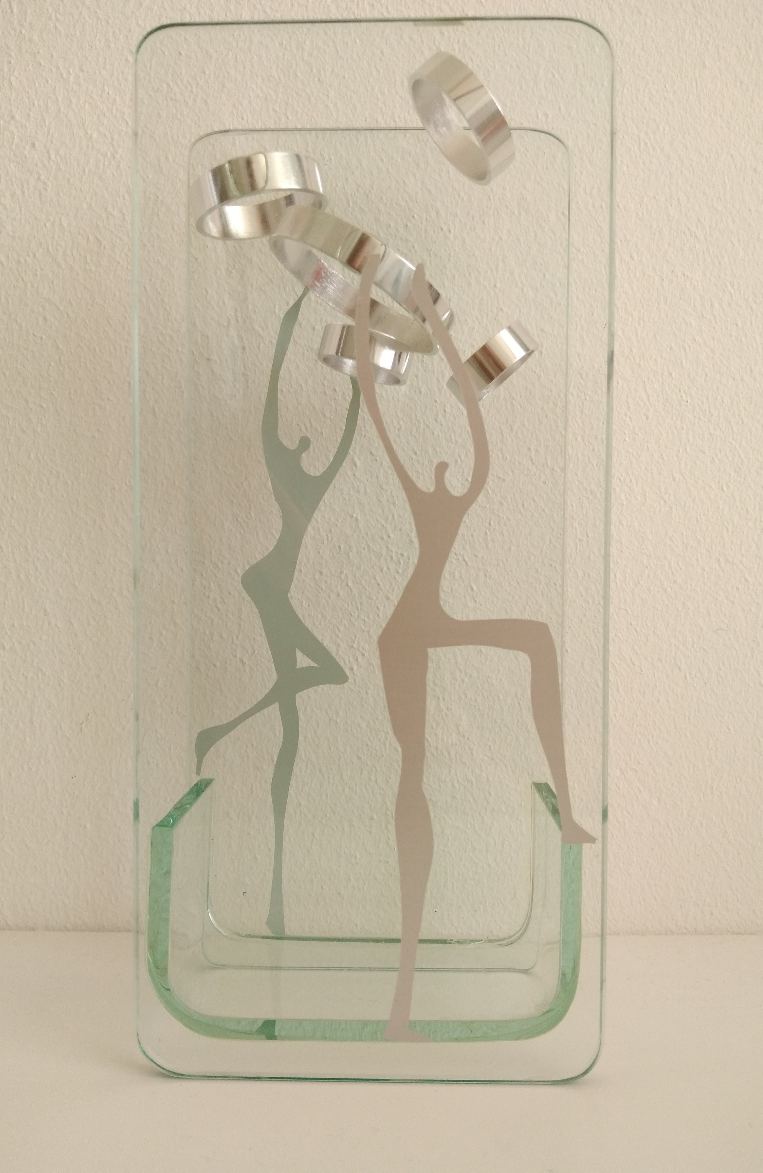 Twee figuren 'spelen' met vijf metalen ringen.