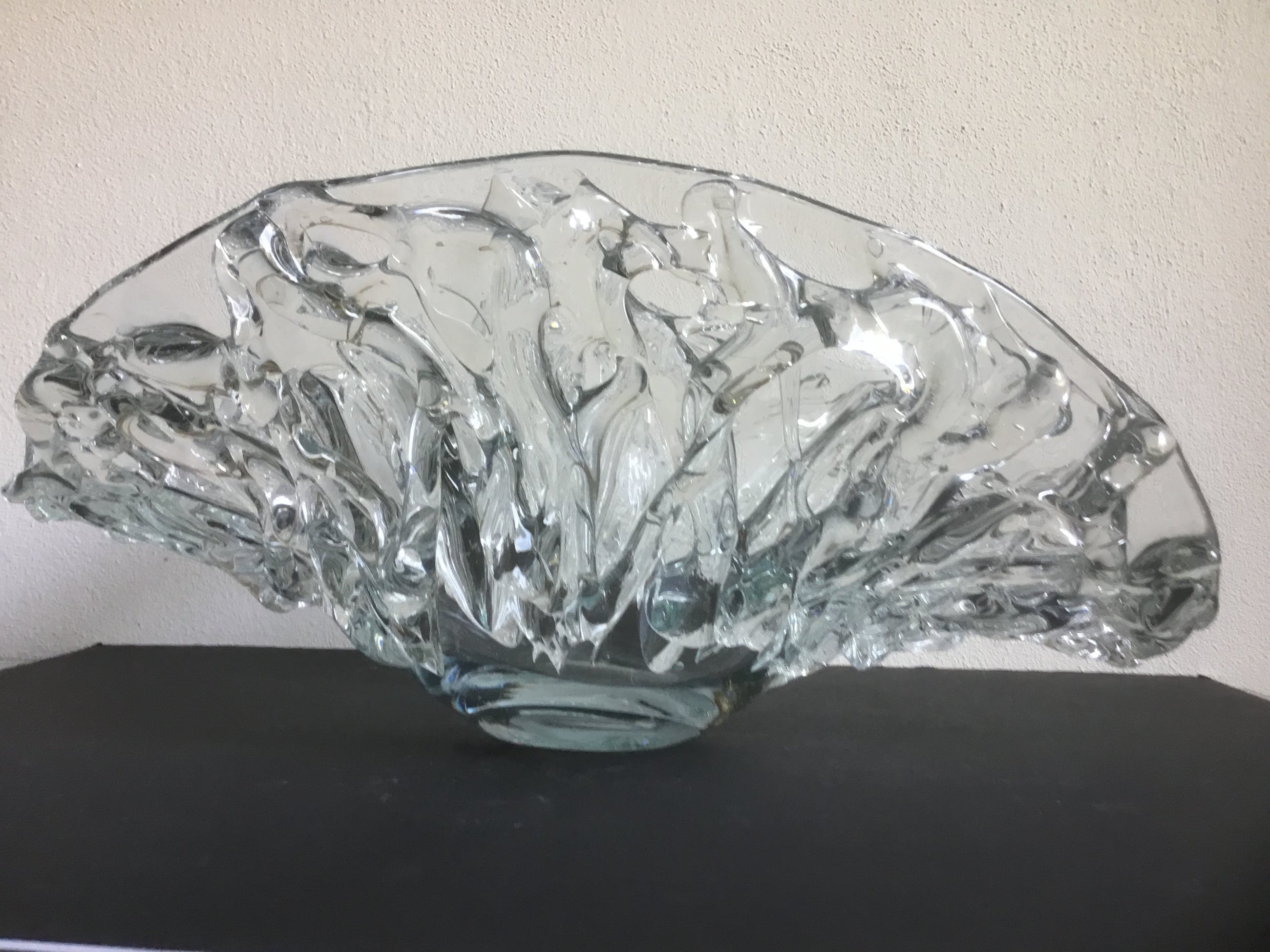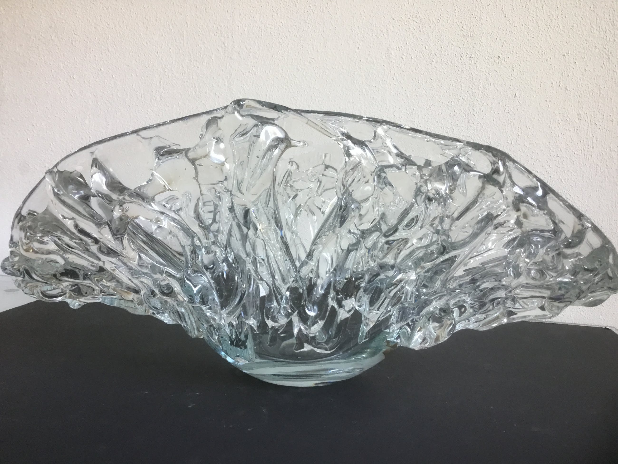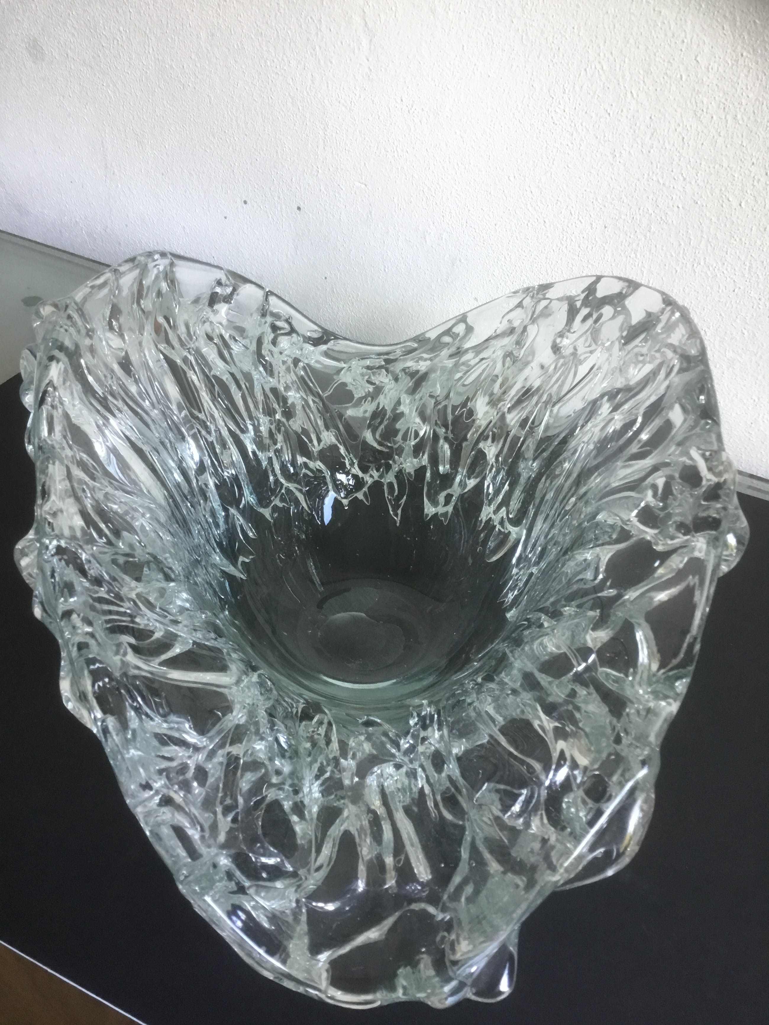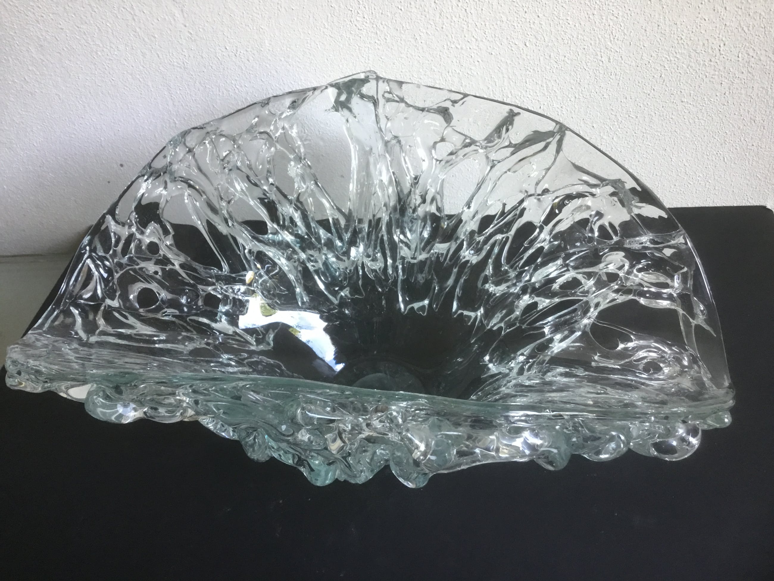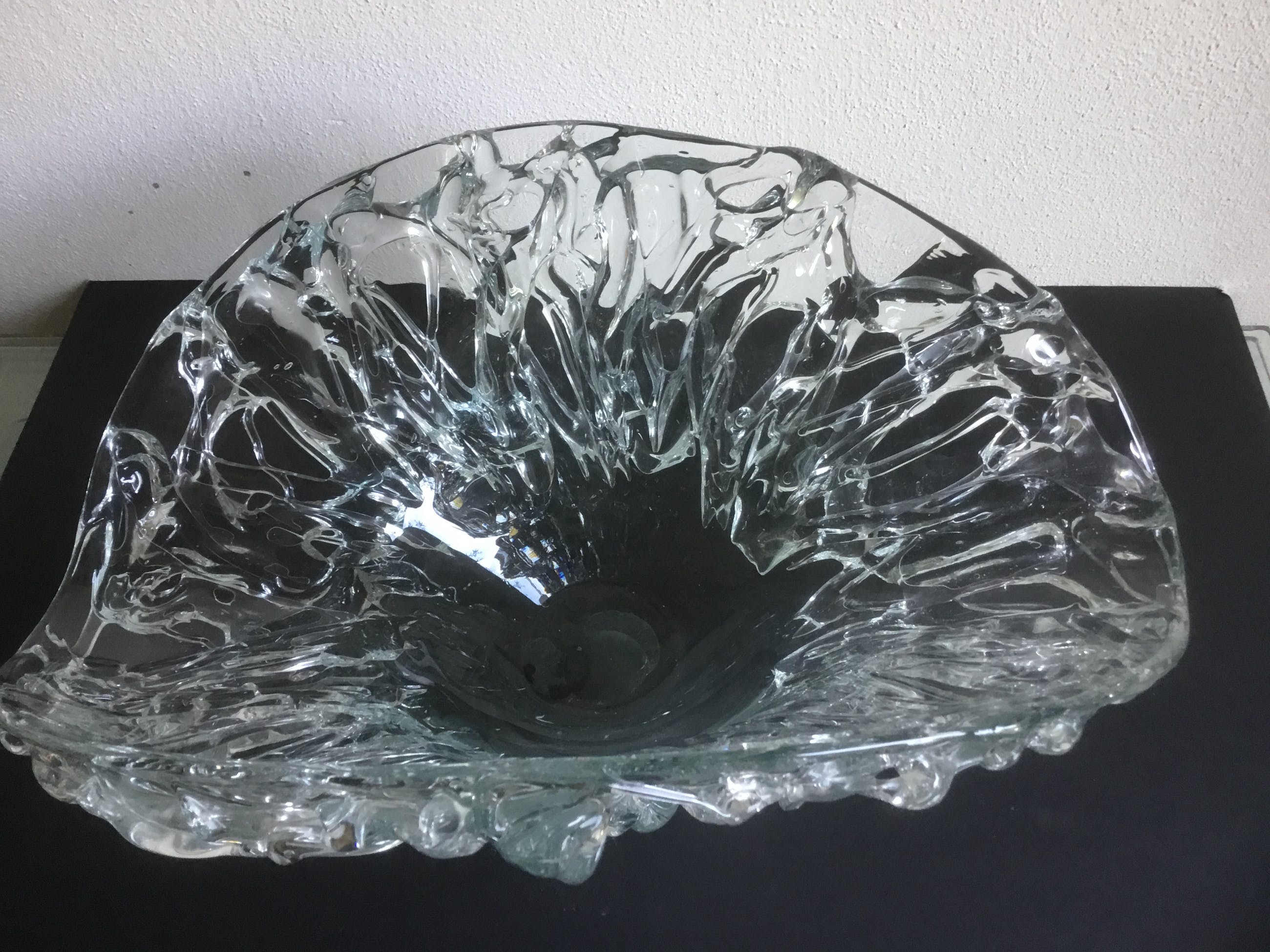 Bijzondere grote unica glazen schaal met een gewicht van ruim 4 kg. De binnenkant van de schaal is glad de buitenzijde heeft gebobbeld reliëf.