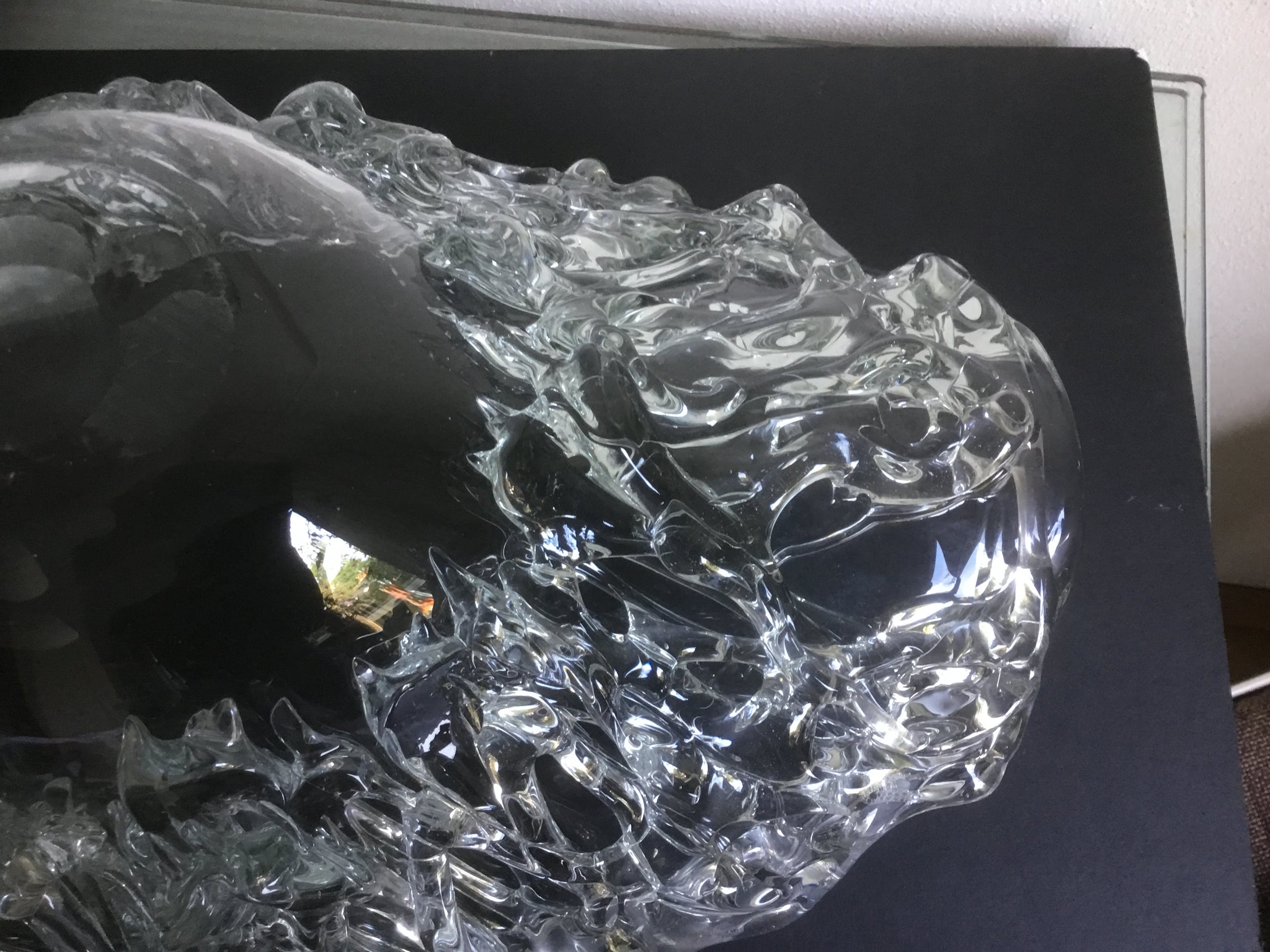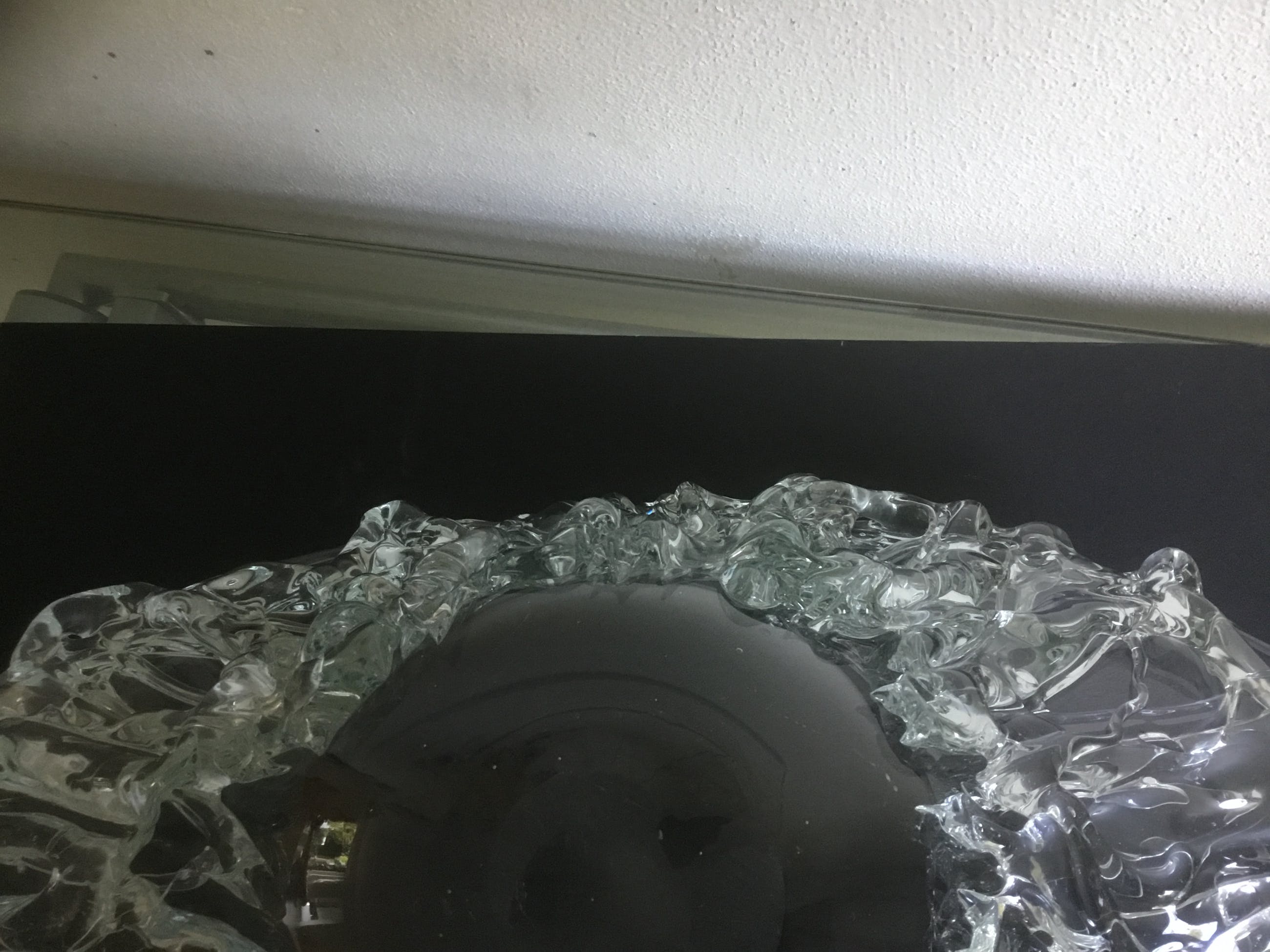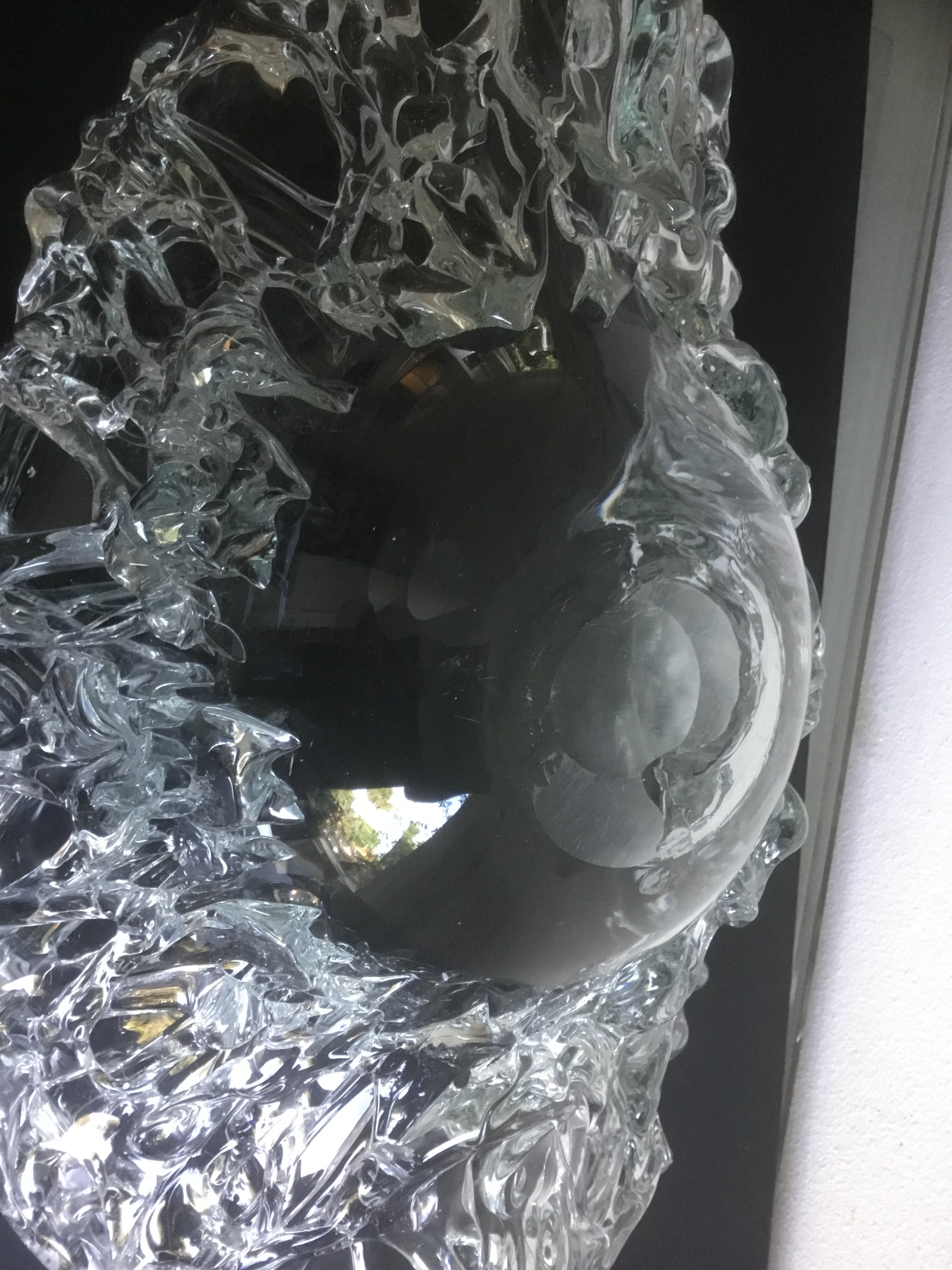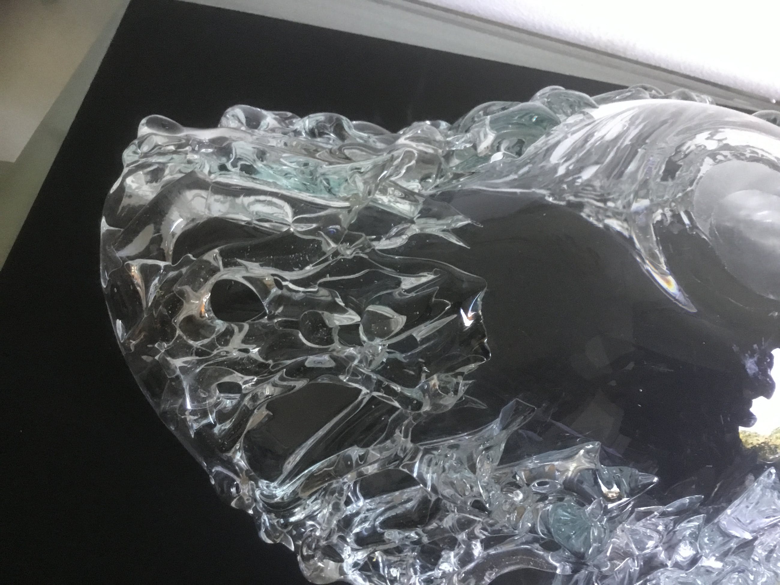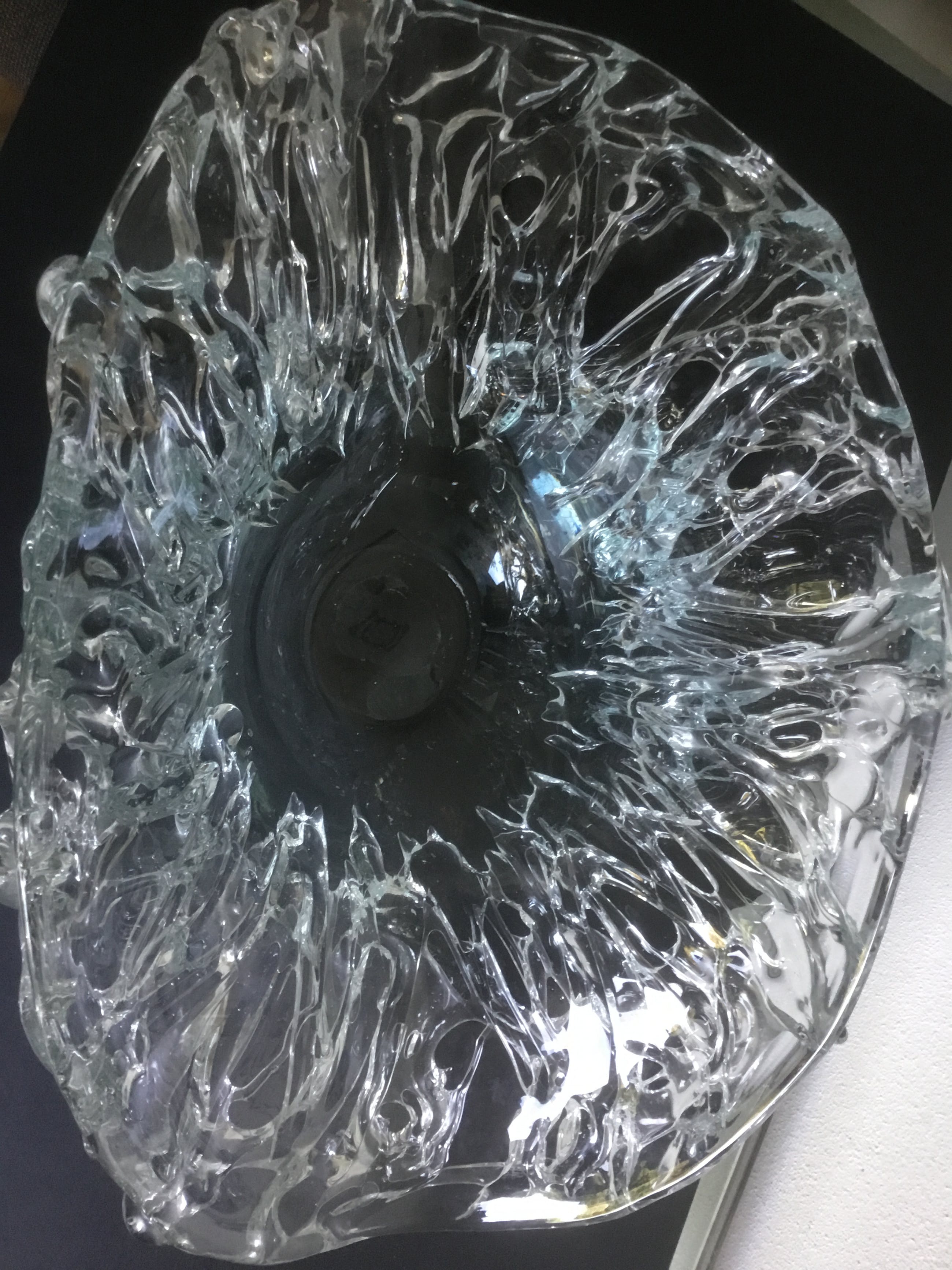 Bijzondere grote unica glazen schaal met een gewicht van ruim 4 kg. De binnenkant van de schaal is glad de buitenzijde heeft gebobbeld reliëf.