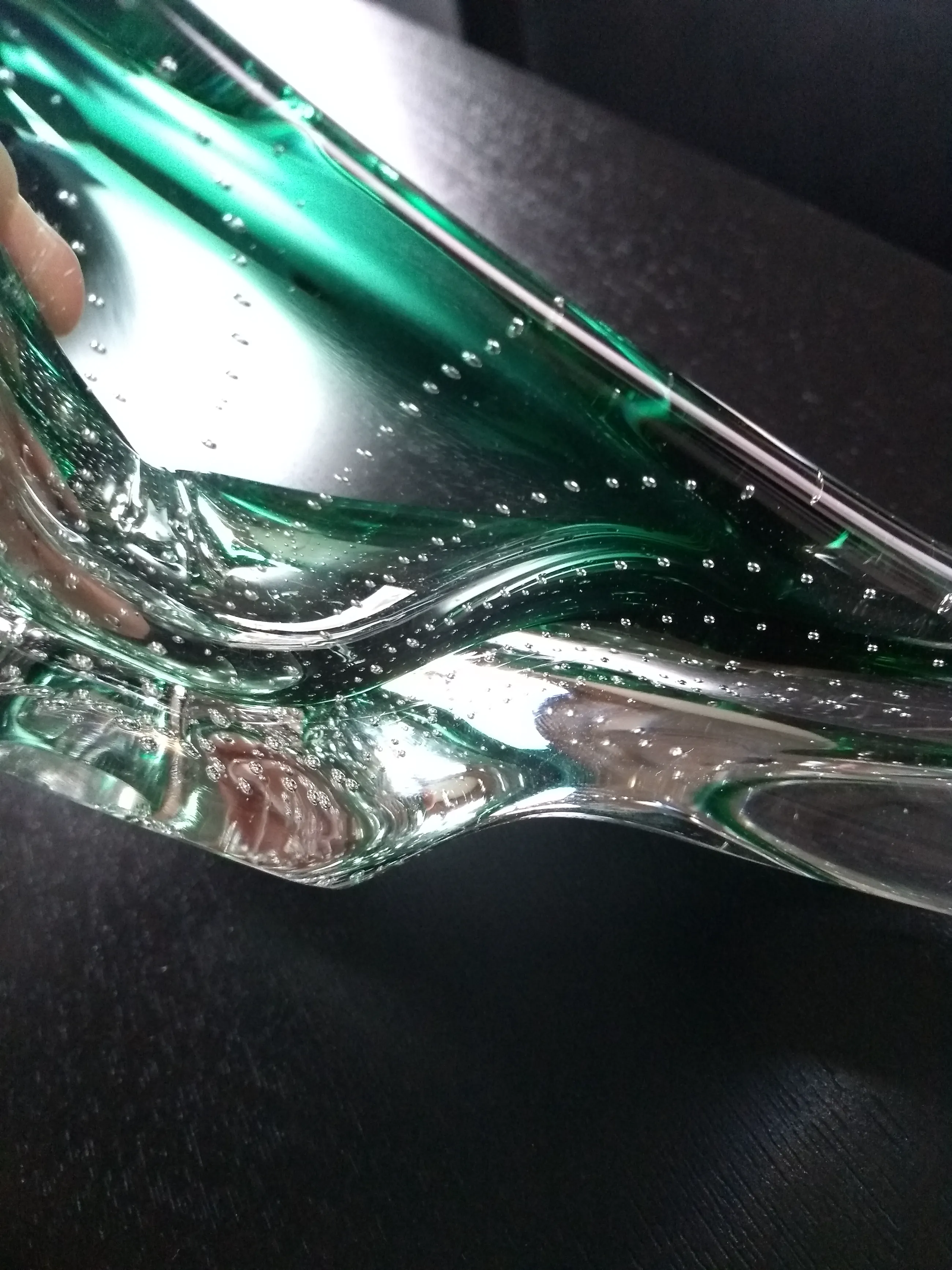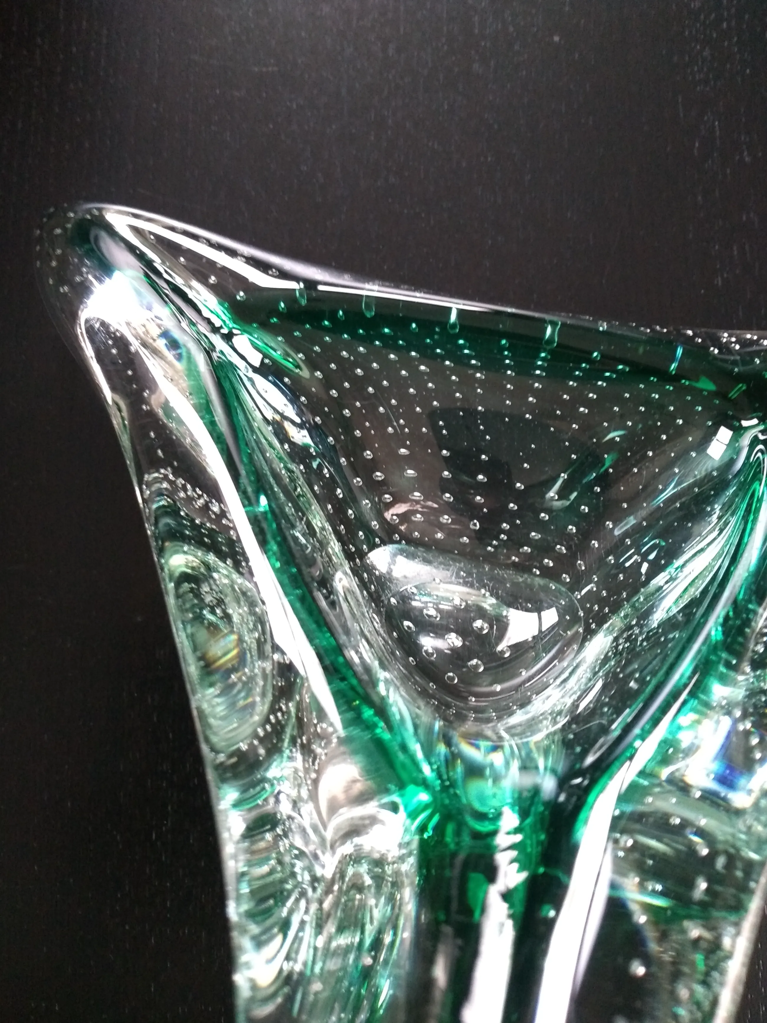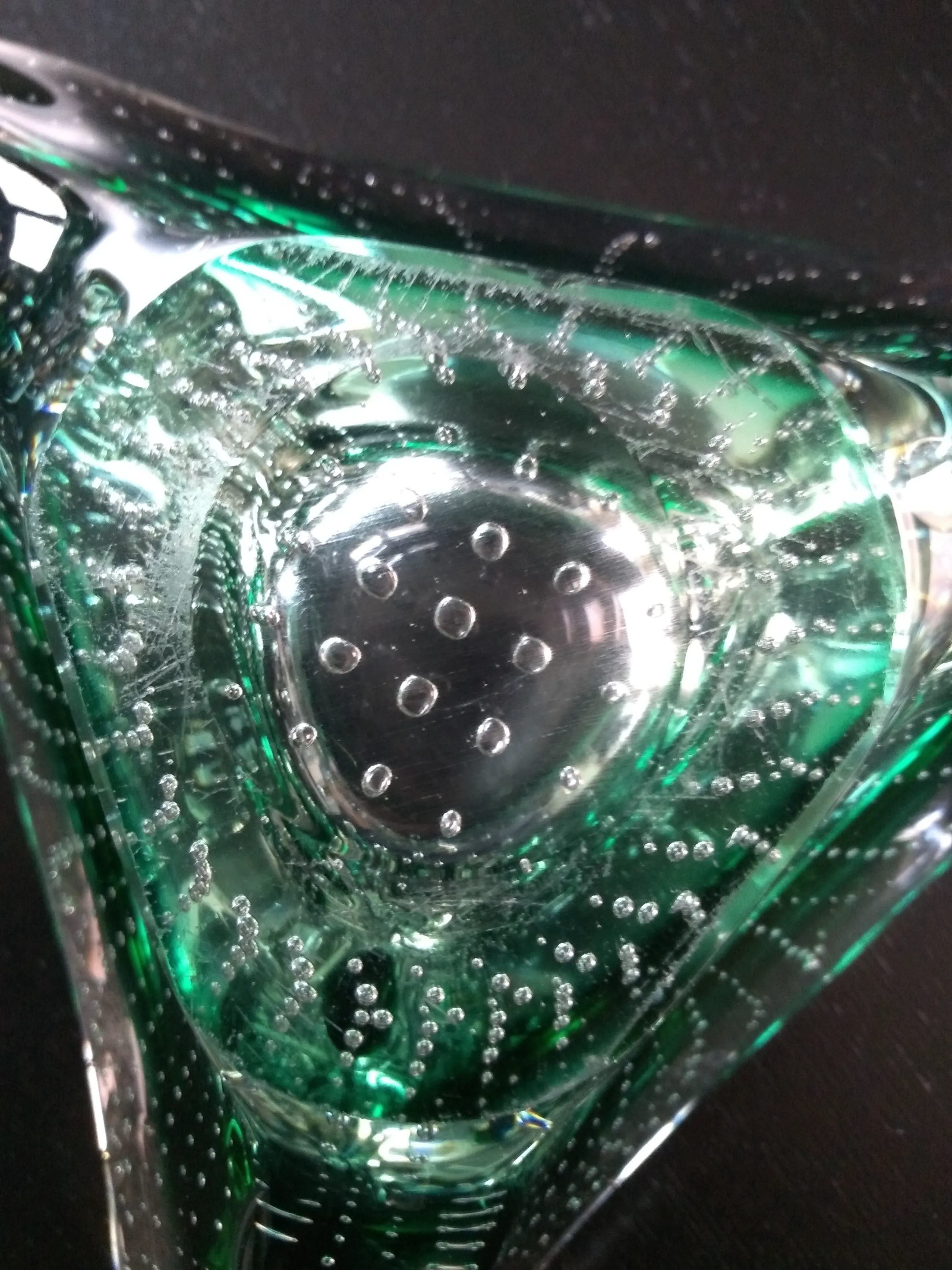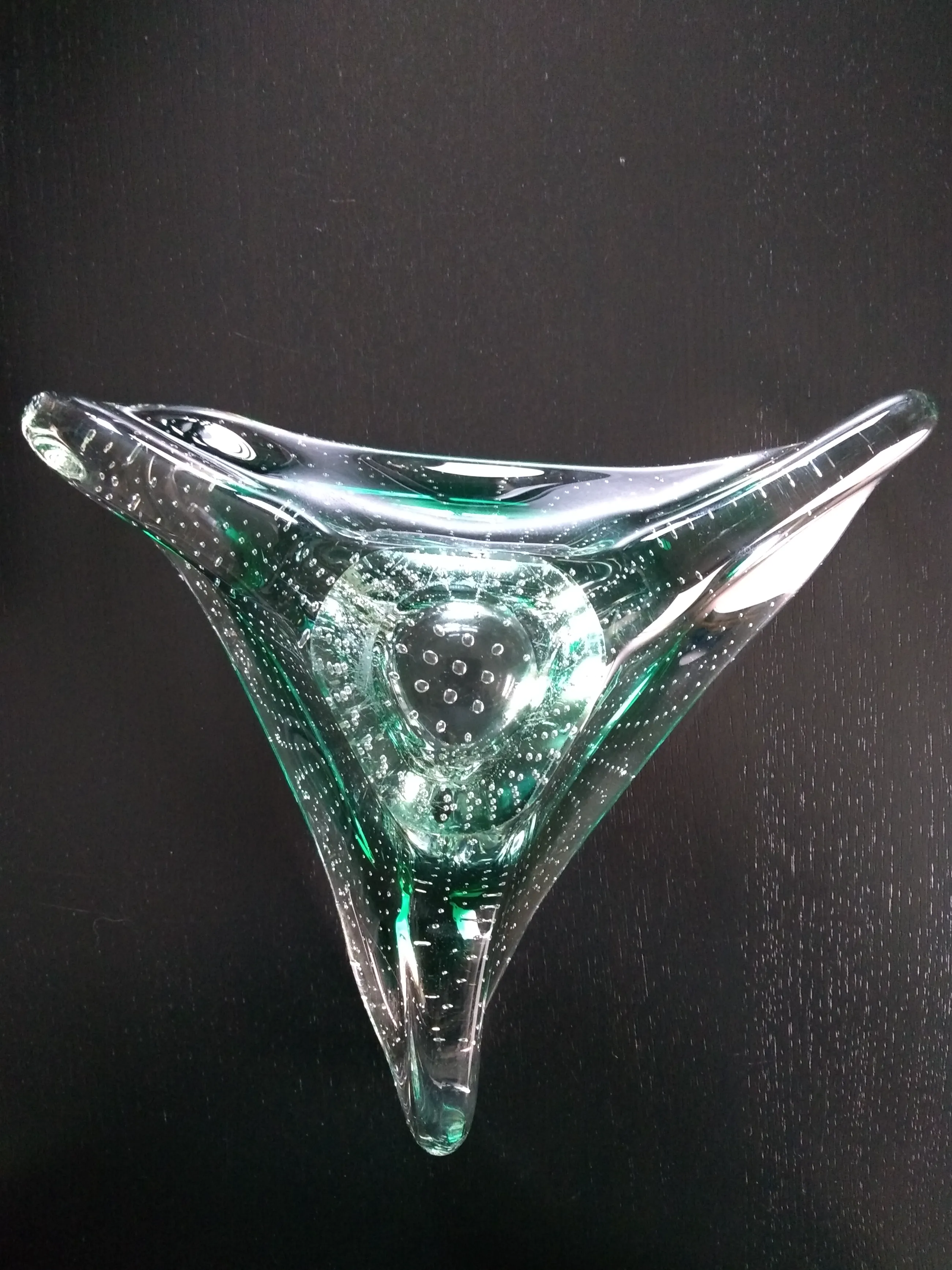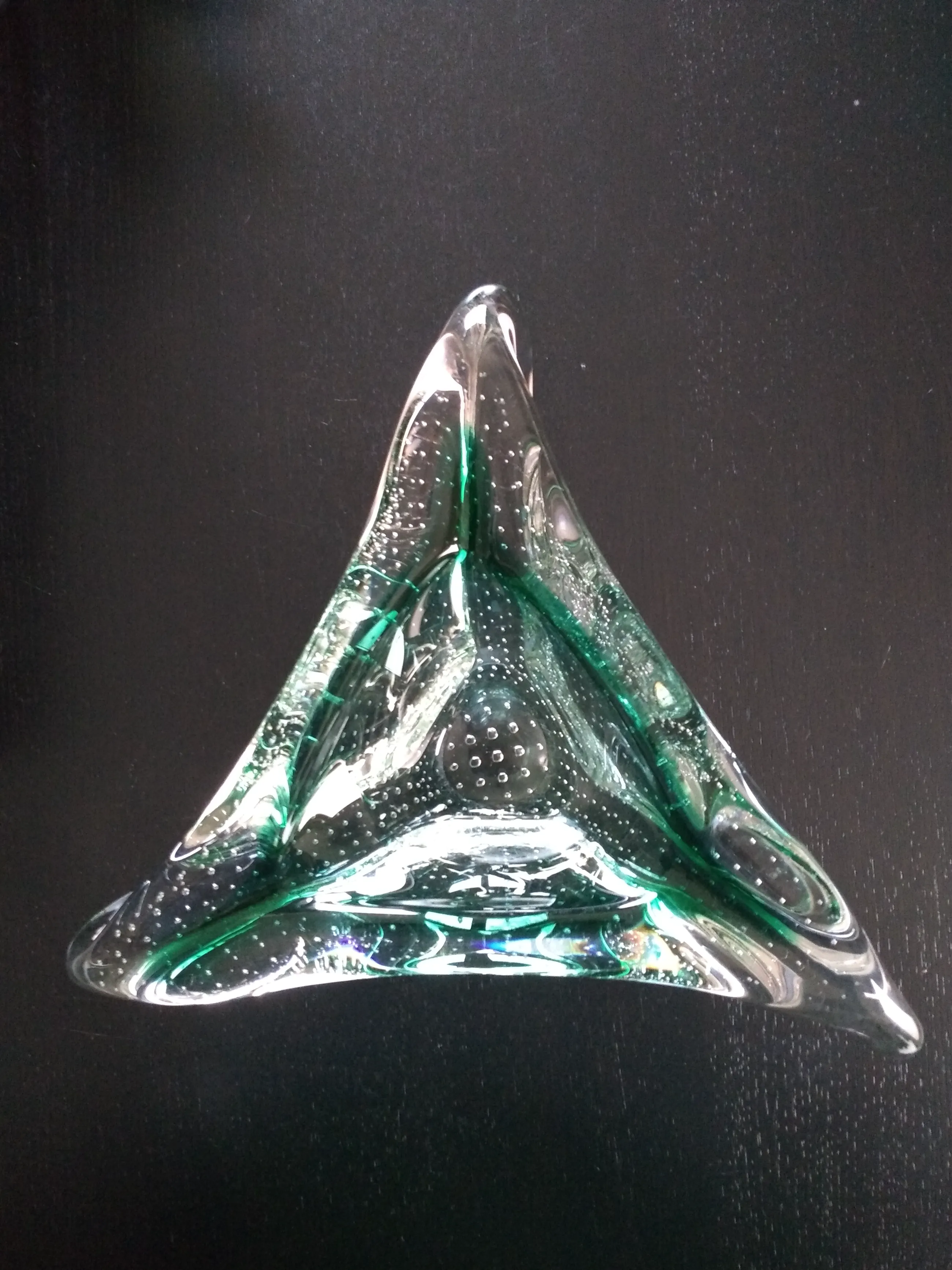 Zeer mooie triangle glas,met glasbelletjes.Van punt naar punt gemeten 23 CM.Hoogte 5,5 CM.Gewicht :1070 gram.Helder glas met mooie overgang,groene schijn.Tip top zonder beschadigingen.Onderzijde lichte gebruiksporen,niet storend.