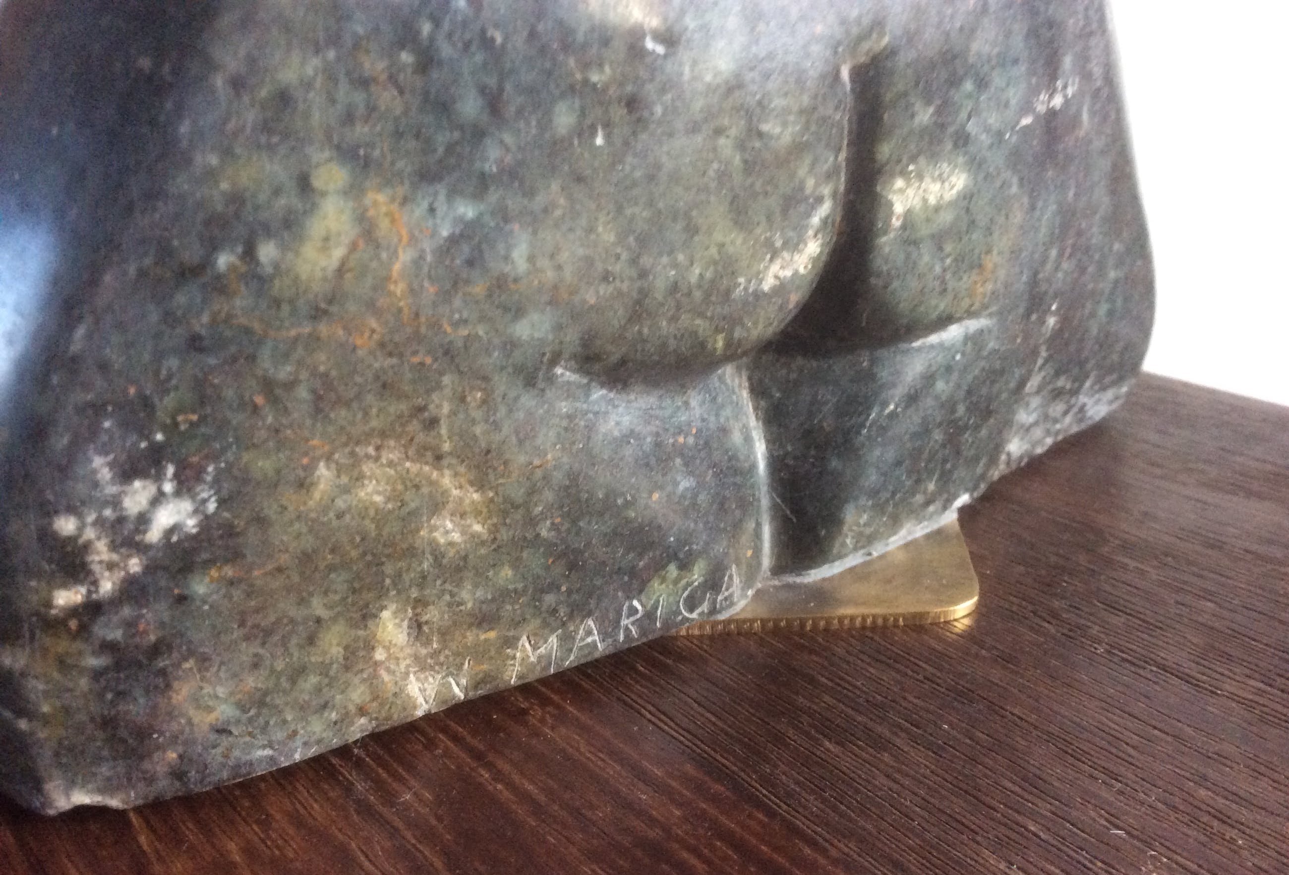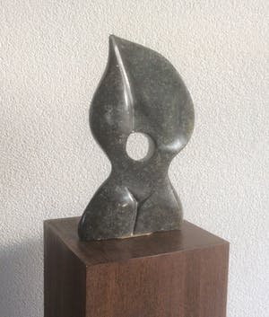 Een granieten beeld met mooie vormen, spiegelglad gepolijst,Het hoogste punt van de sculptuur is 35 cm, de breedte aan de onderkant is ongeveer 20 cm en het dikste punt is ongeveer 6 cm. De sculptuur heeft een paar onopvallende, minuscule beschadigingetjes. De sculptuur staat stevig d.m.v. een stevig koperen plaatje op de onderkant. Aan de achterzijde gesigneerd met W MARICA