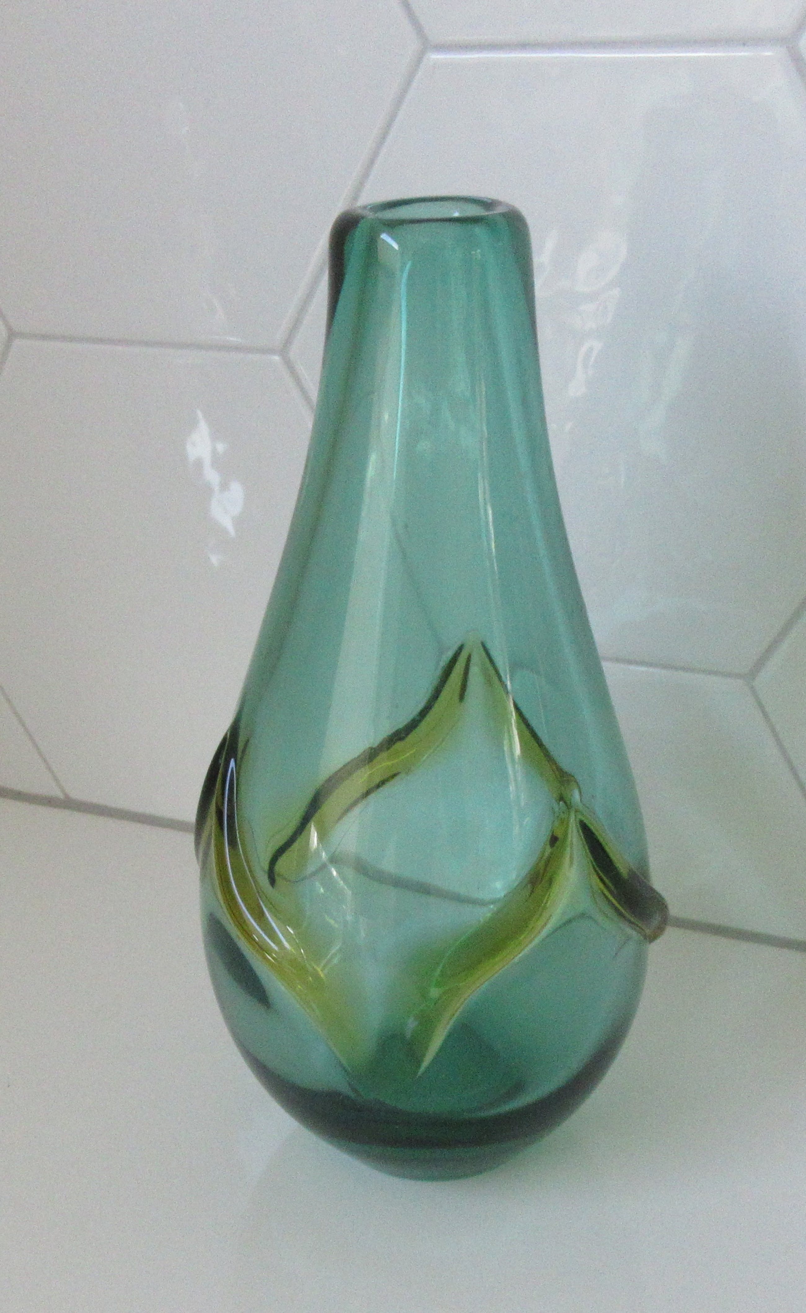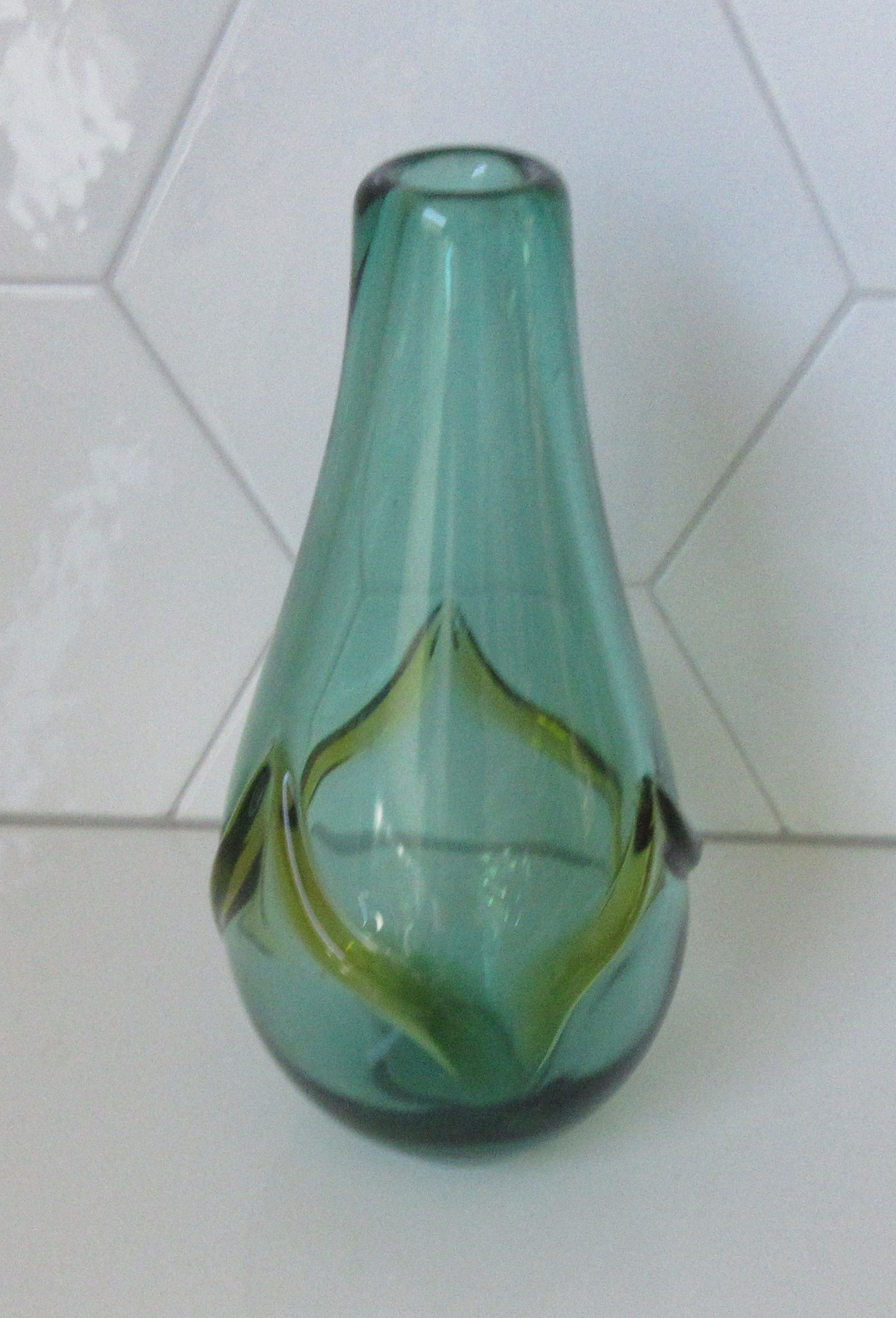 Groen en amber dikwandige vintage glazen vaas. Niet gemerkt. Uitvoring waarschijnlijk Murano en anders een van de Boheemse glasfabrieken zoals Skrdlovice - Beranek, Mstisov, Harrachov etc. Heeft lichte aanslag aan binnenzijde.