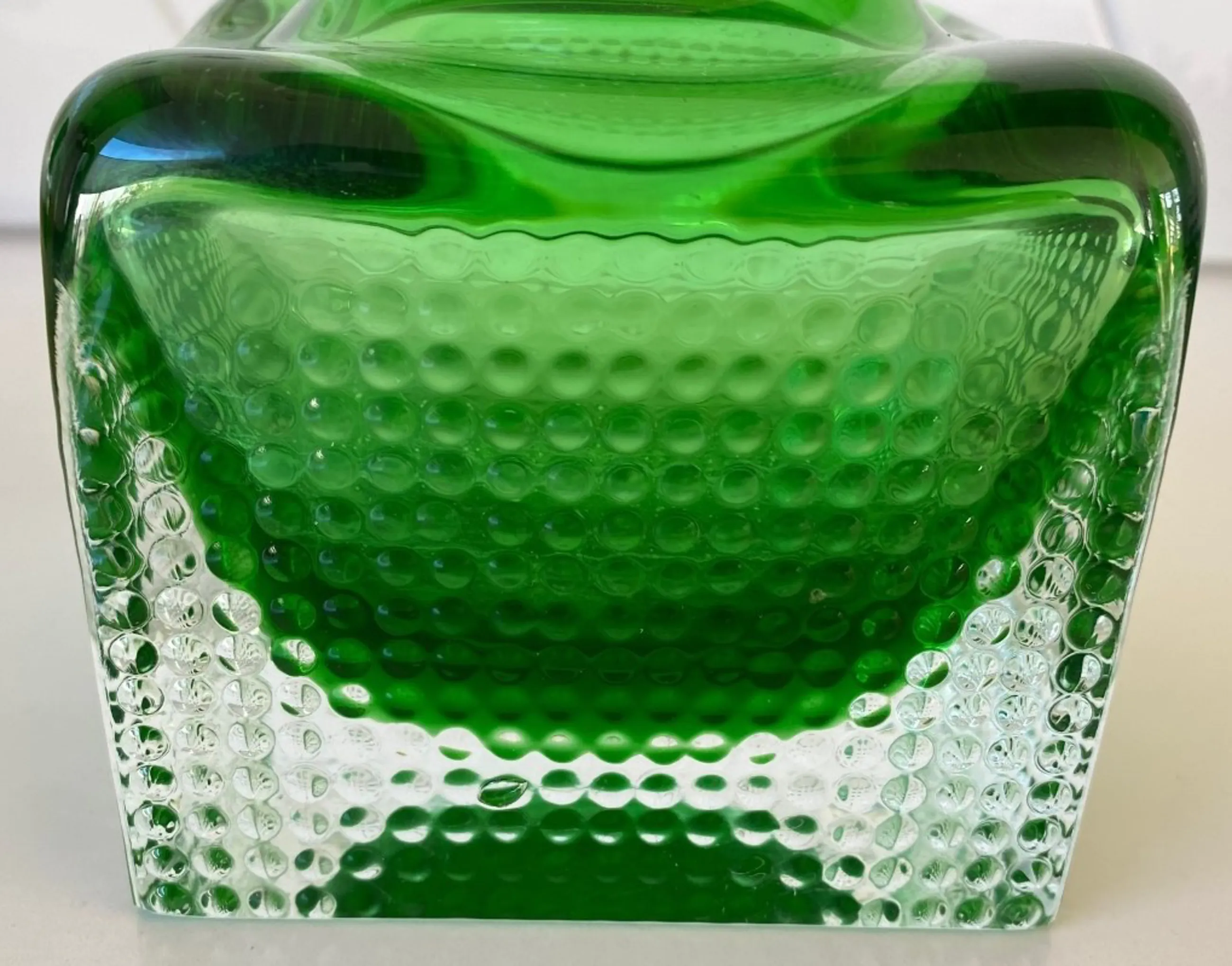 Groene dubbelwandige glazen noppen vaas met een gepolijste gladde onderzijde. In zeer onbeschadigde conditie, niet gemerkt. Herkomst of ontwerper onbekend maar zeer waarschijnlijk van Scandinavische of Duitse origine.