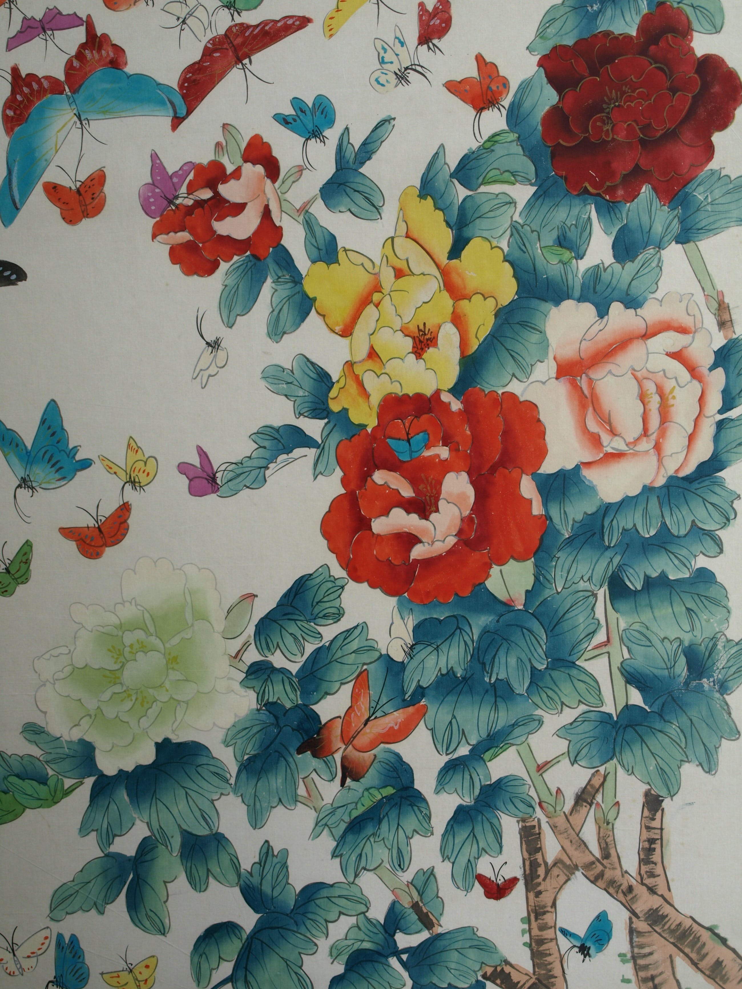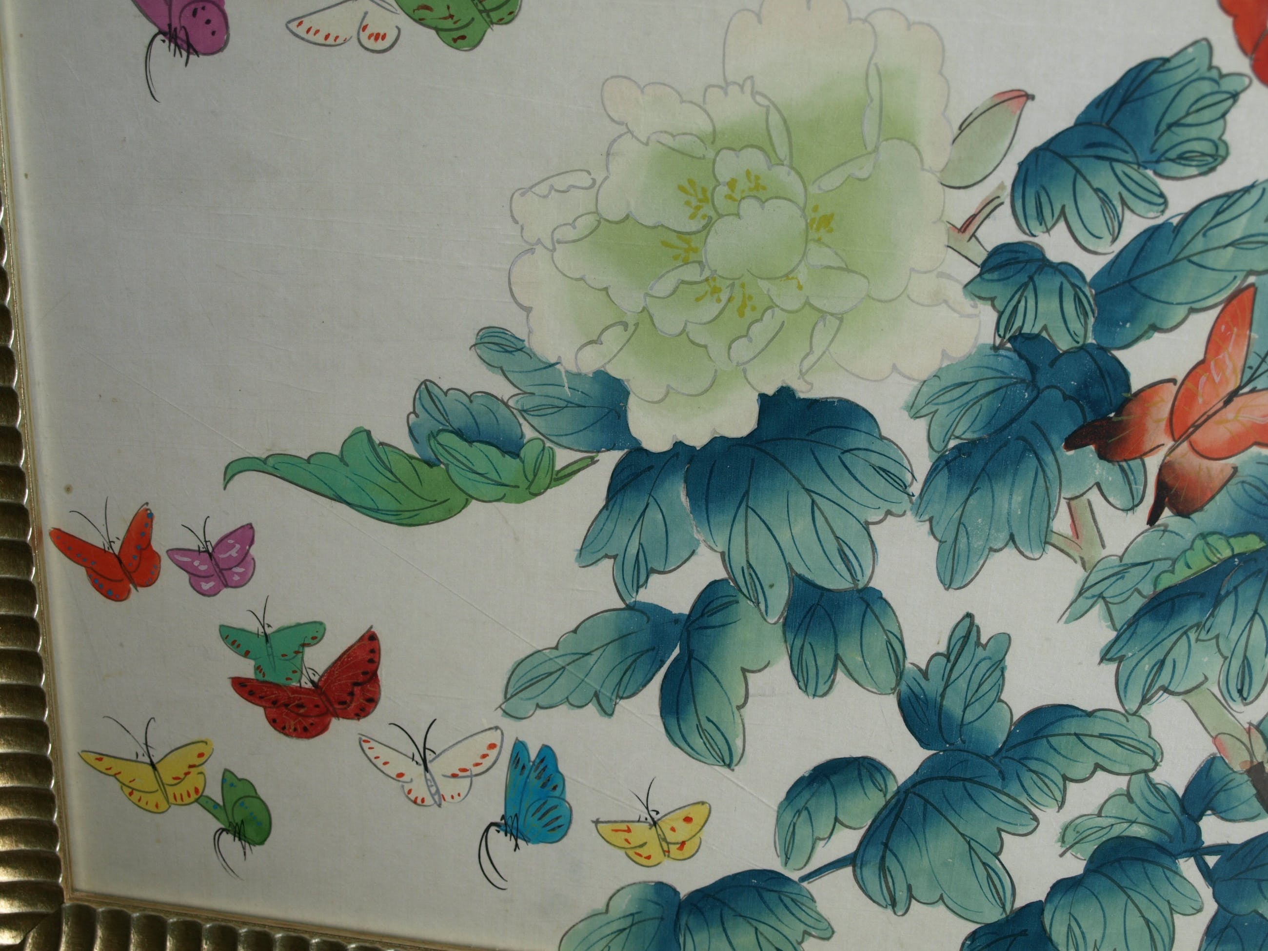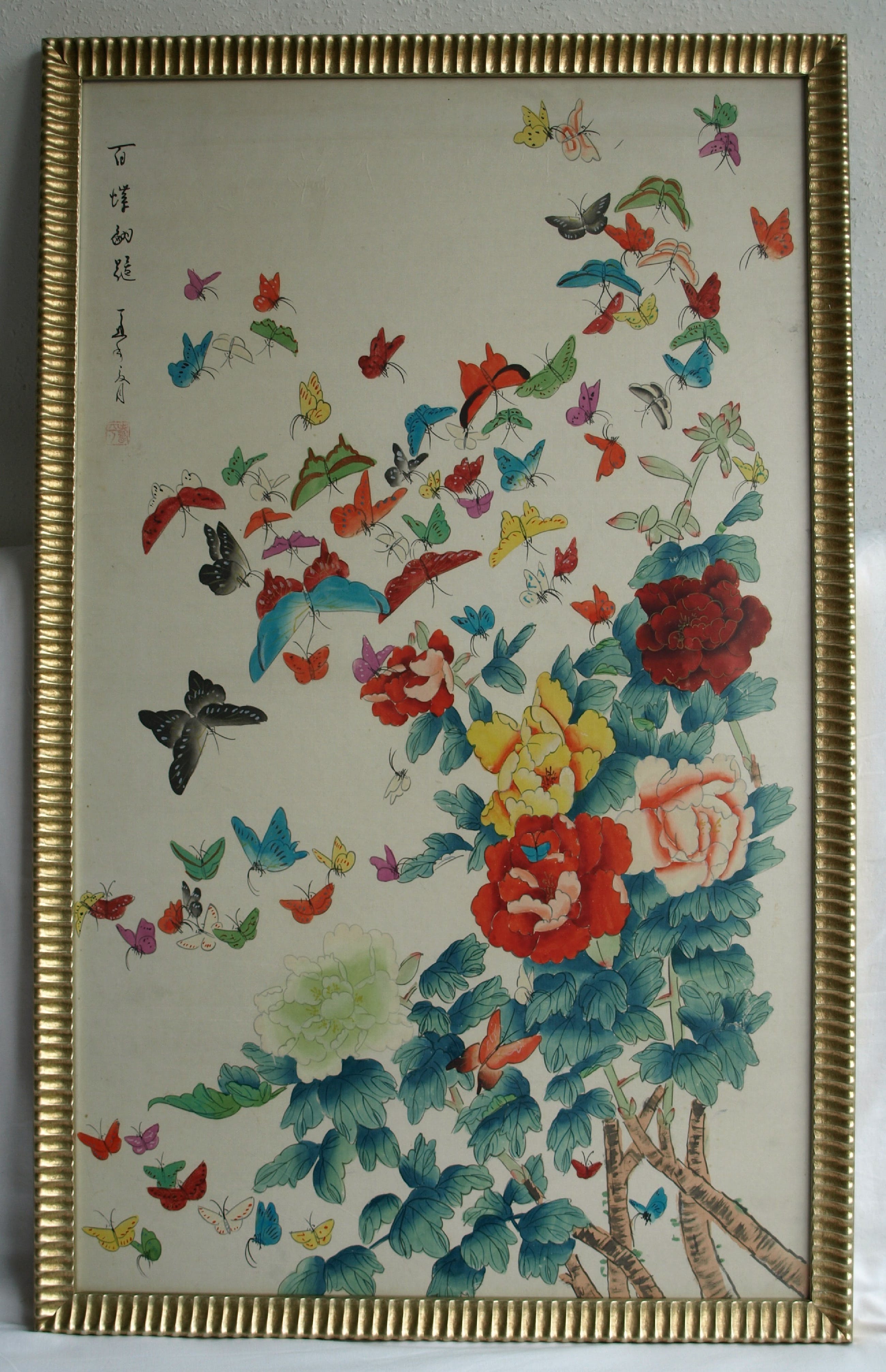 | In goede staat met lichte ouderdomssporen, wat vlekjes in het zijden doek. Zie ook de foto’s voor een eigen indruk. Kan zo aan de muur. | |