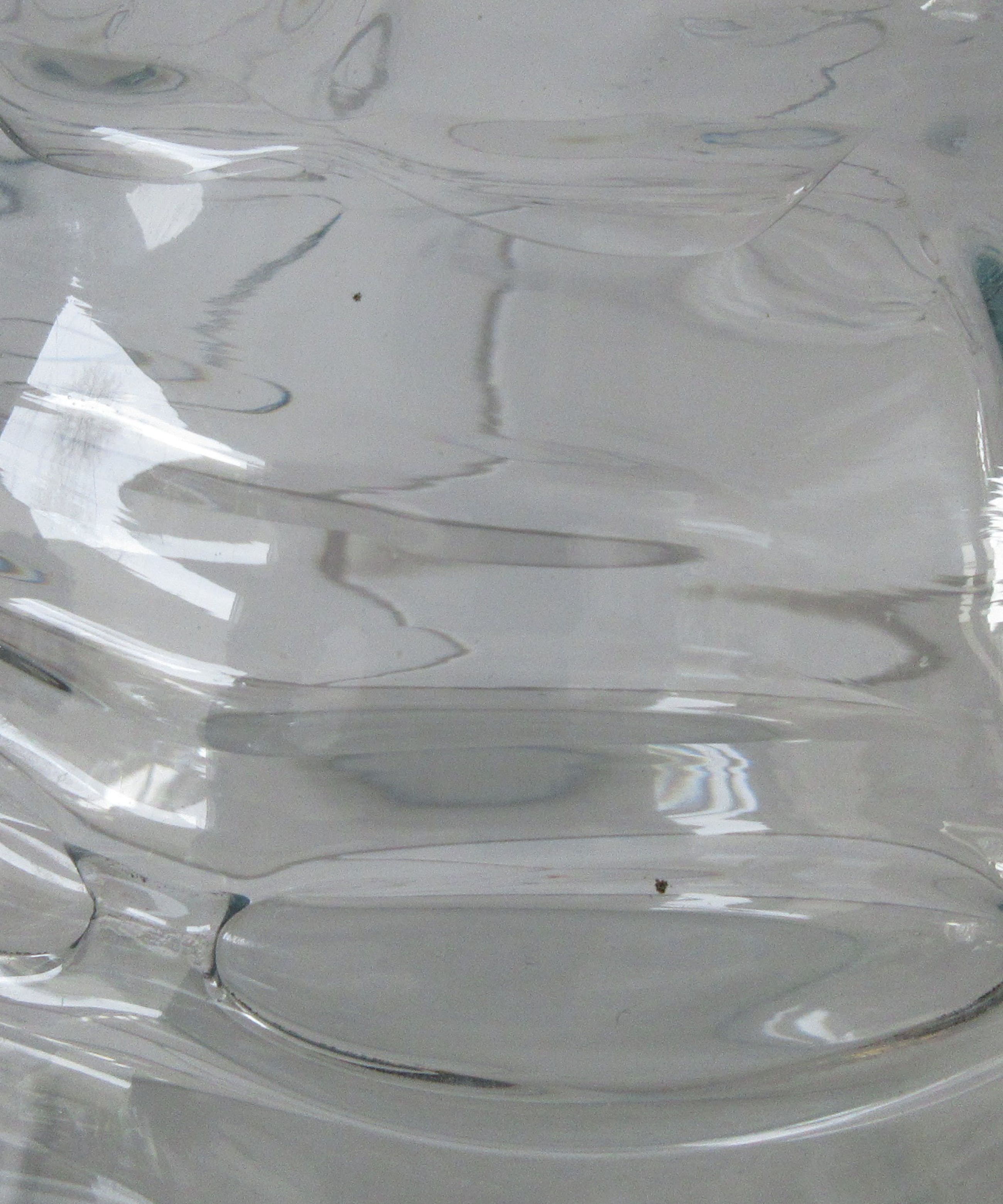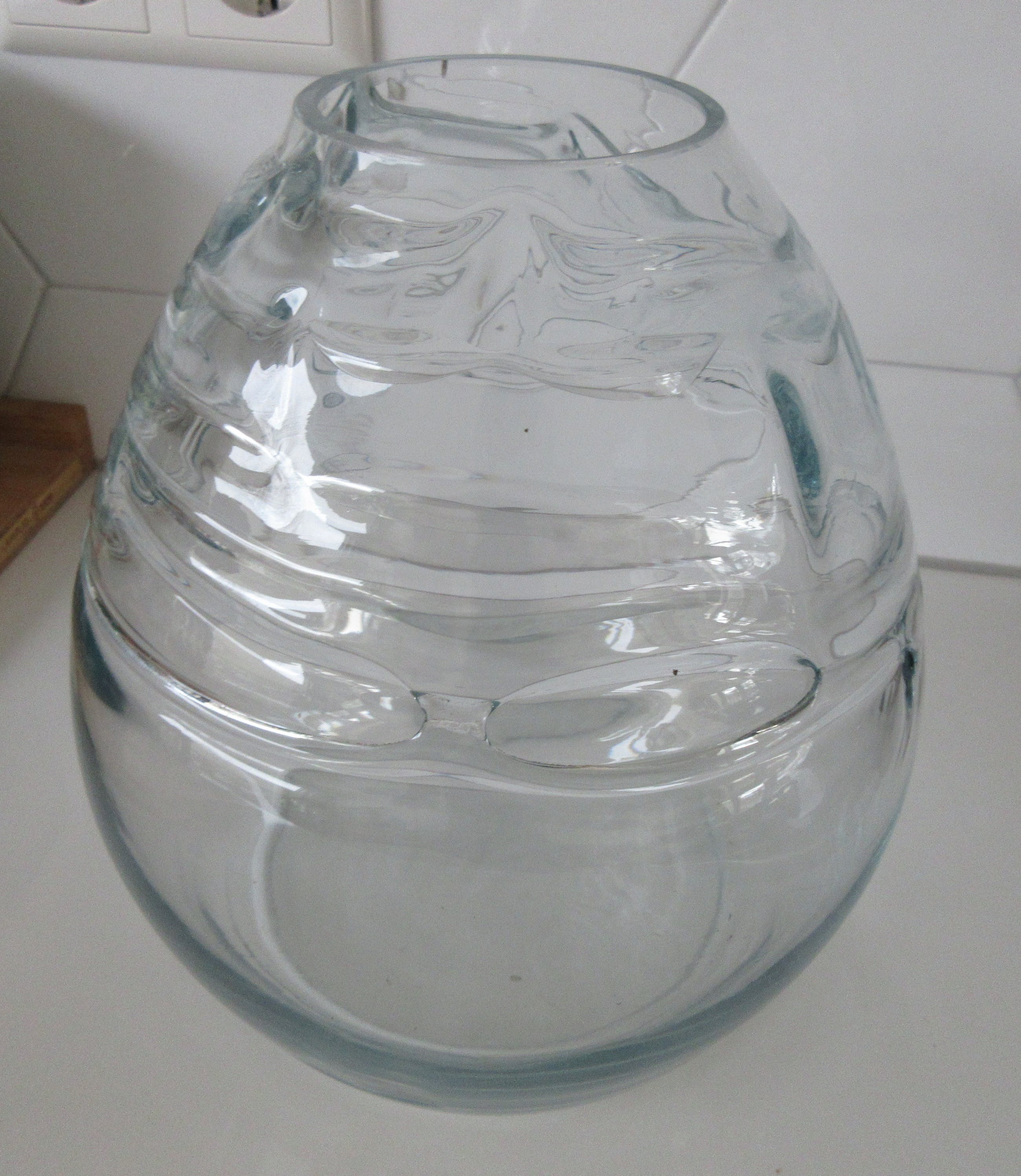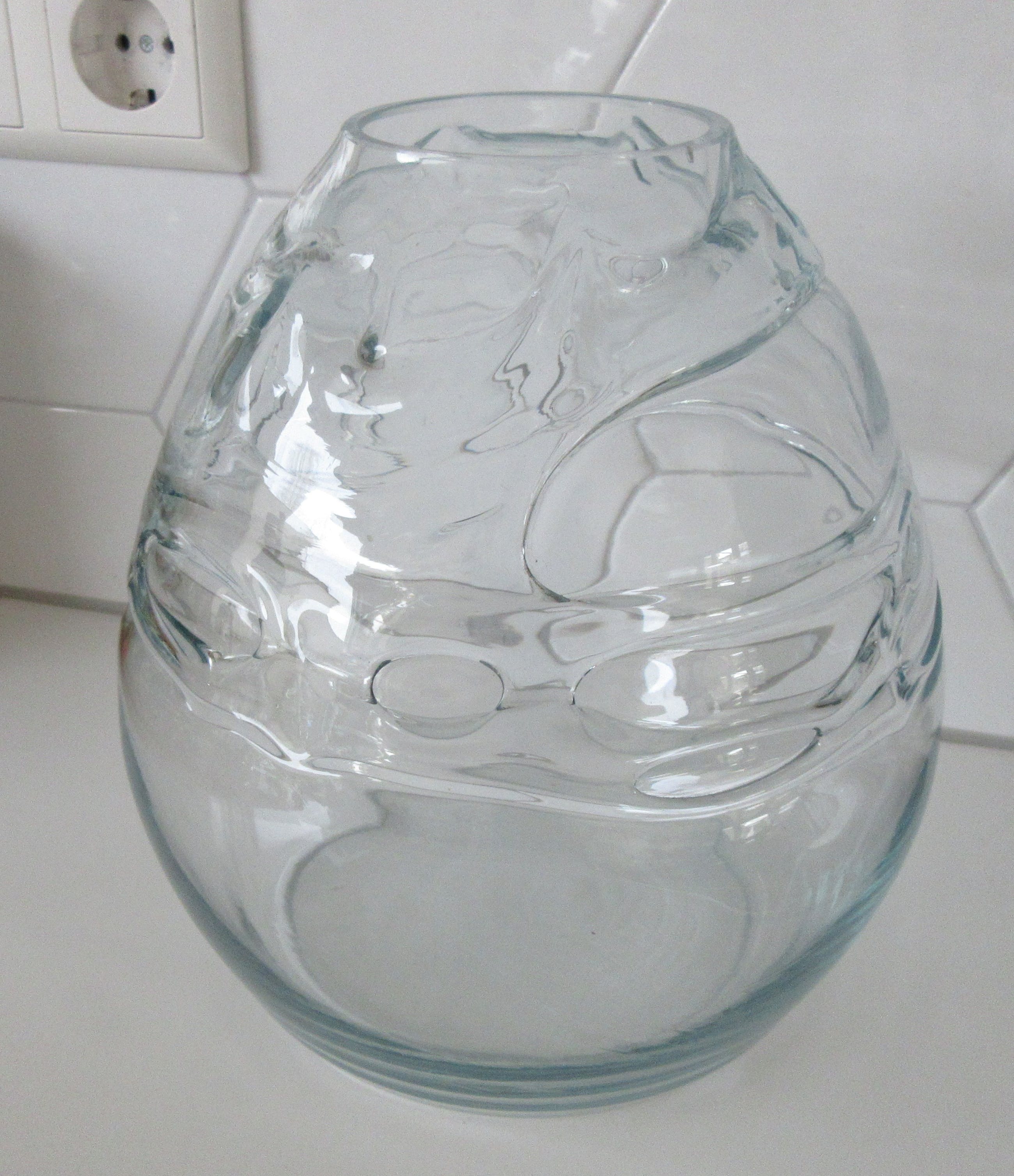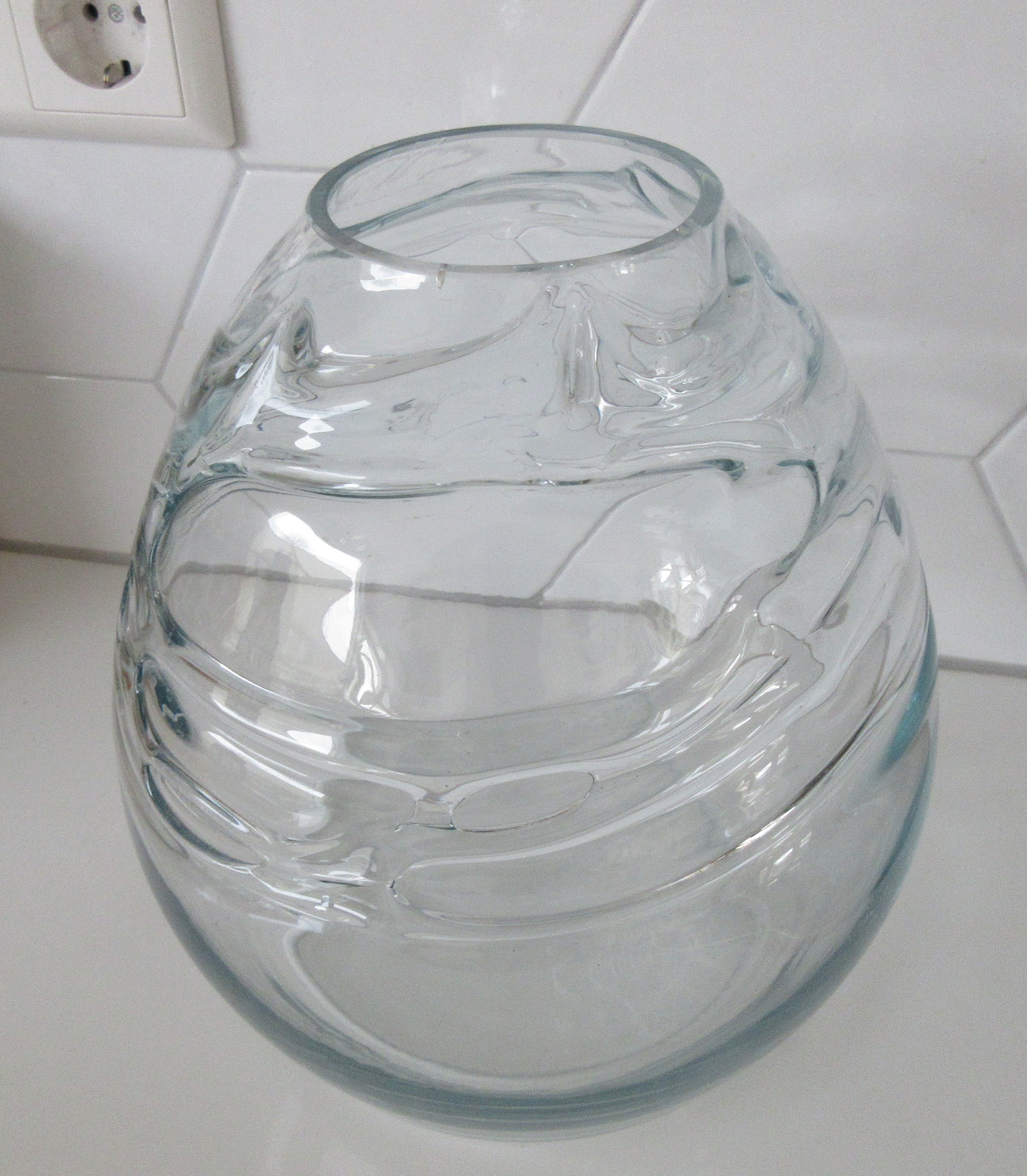 Grote lichte blauwe Studio glazen design vaas, prachtige lichtblauwe gloed licht er over de vaas. De grillige vormen in de vaas geven prachtige effecten in het licht. Niet gesigneerd dus maker onbekend. Wel voorzien van een gepolijst pontil merk aan de zijkant van de vaas.
