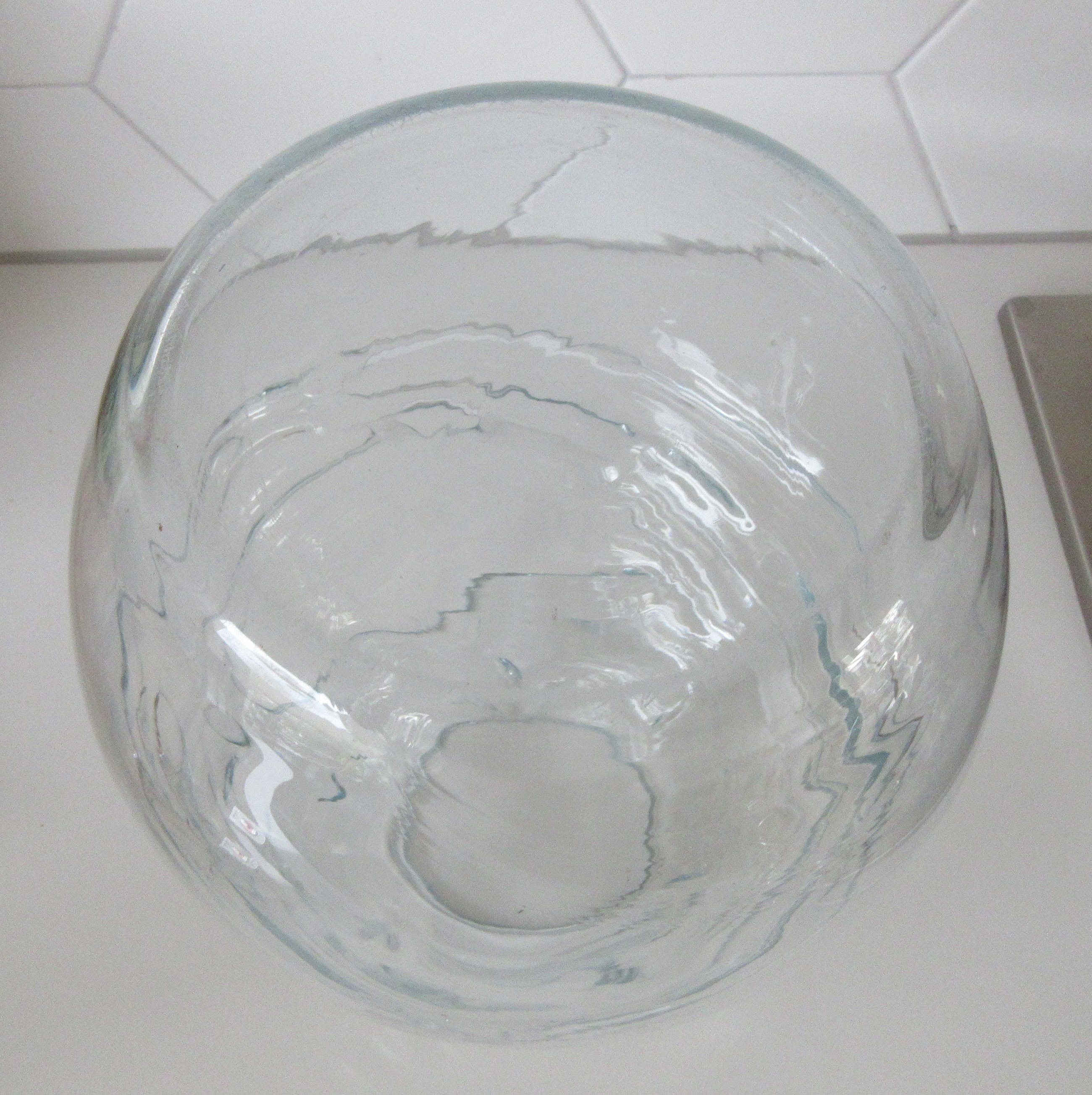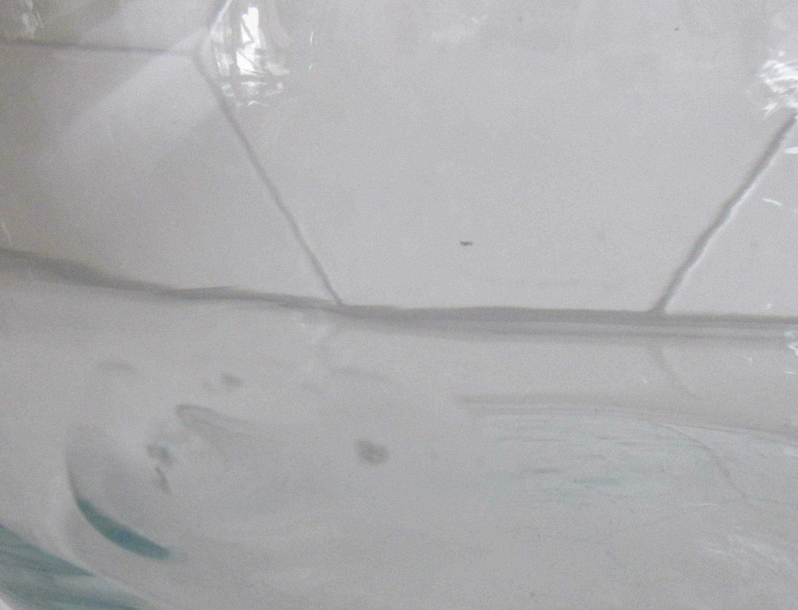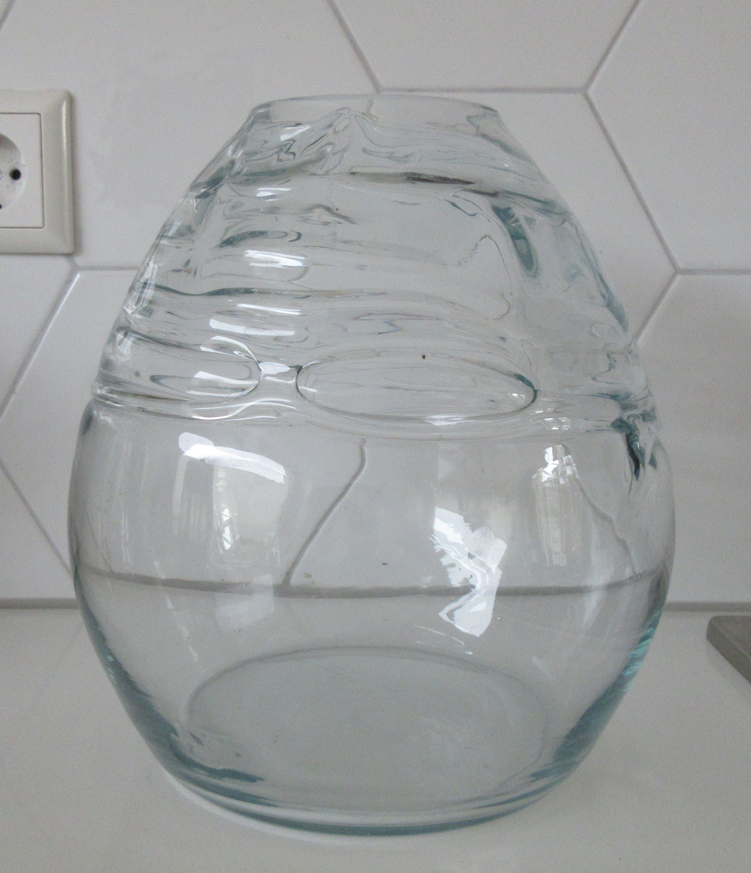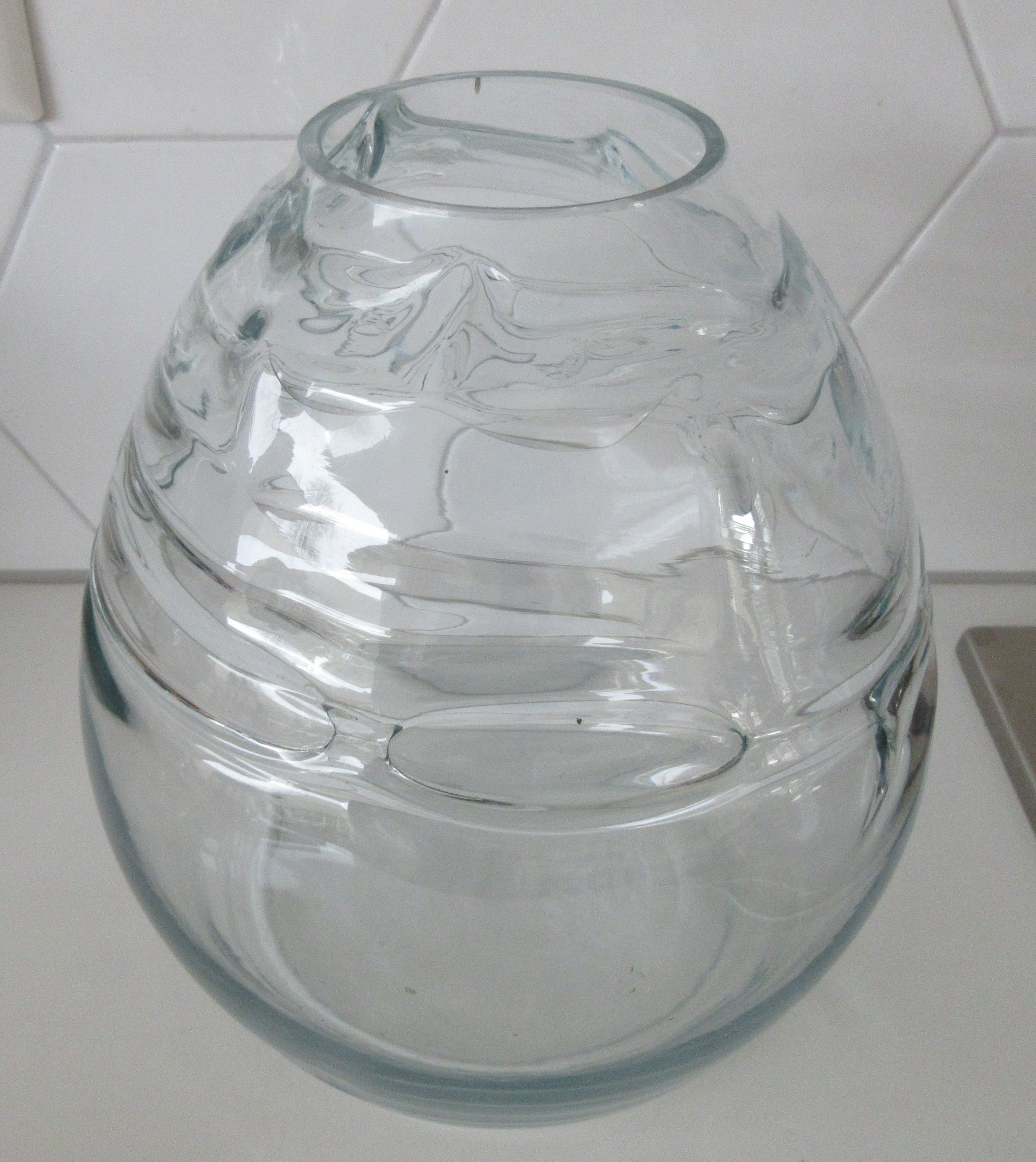Grote lichte blauwe Studio glazen design vaas, prachtige lichtblauwe gloed licht er over de vaas. De grillige vormen in de vaas geven prachtige effecten in het licht. Niet gesigneerd dus maker onbekend. Wel voorzien van een gepolijst pontil merk aan de zijkant van de vaas.