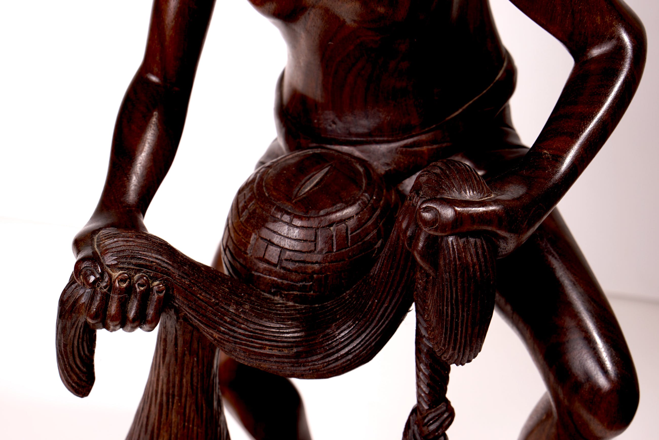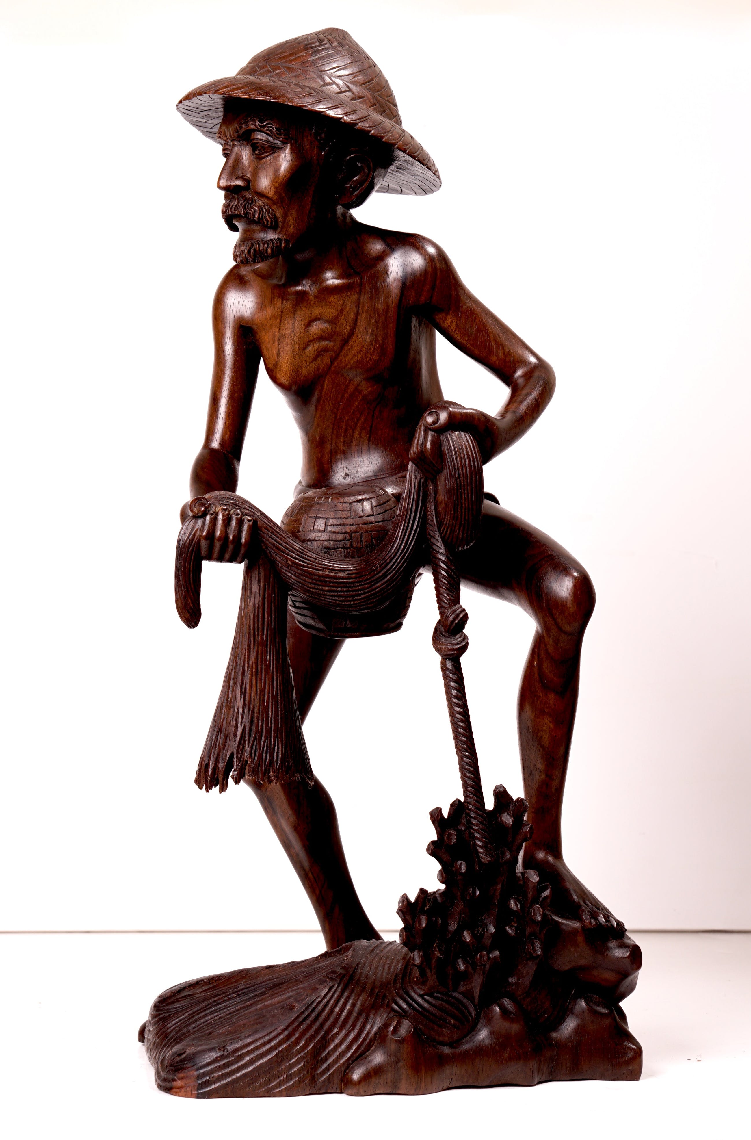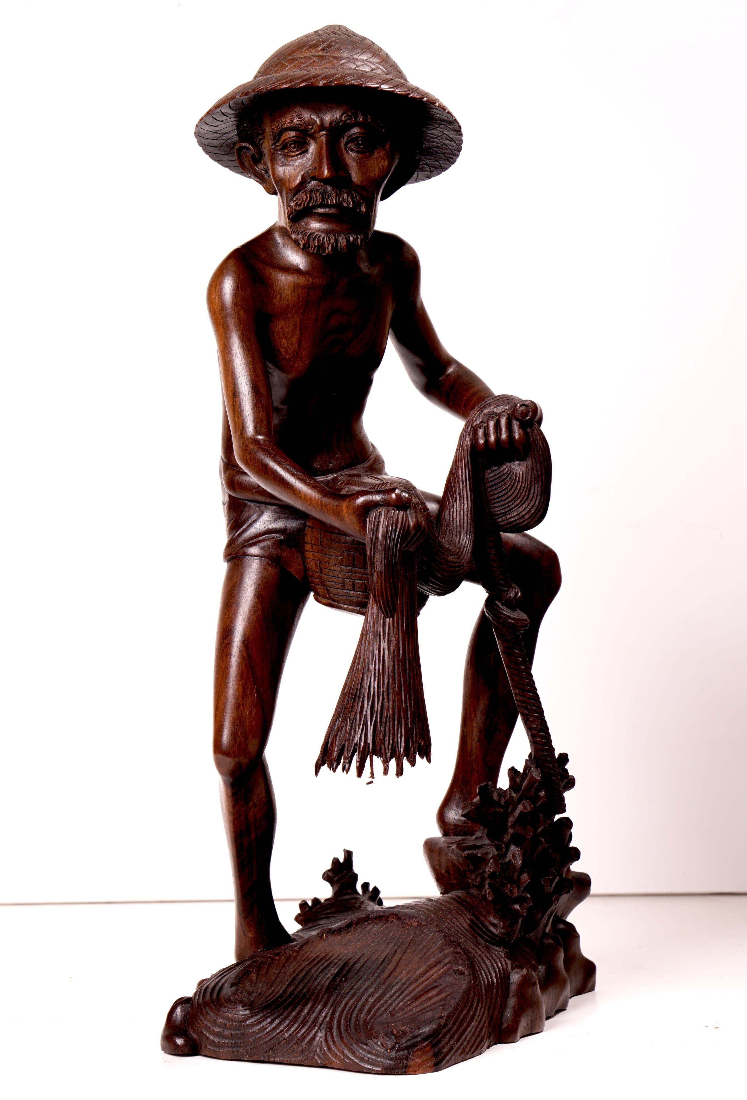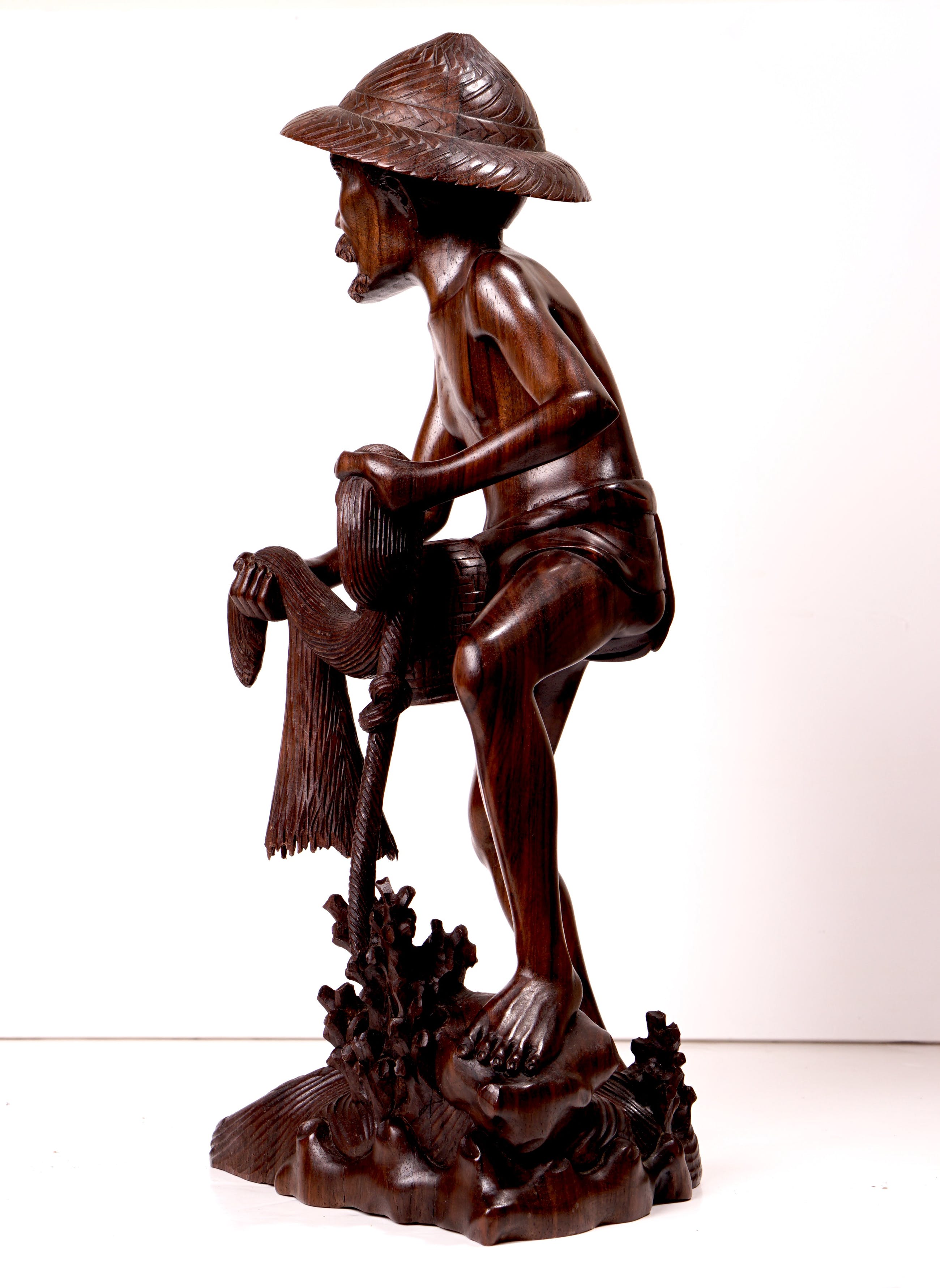 Groot, goed dynamisch vormgegeven en uitzonderlijk goed gestoken beeld van een visser staand in het water, terwijl hij een net uitwerpt. Stofuitdrukking en lichaam is zeer natuurgetrouw. Het beeld is in prima staat. Bij de onderzijde van het net zijn wat lichte beschadigingen, maar dat voegt zelfs iets toe aan de natuurgetrouwheid van het net (zie foto's). Beeld is verder niet gesigneerd.