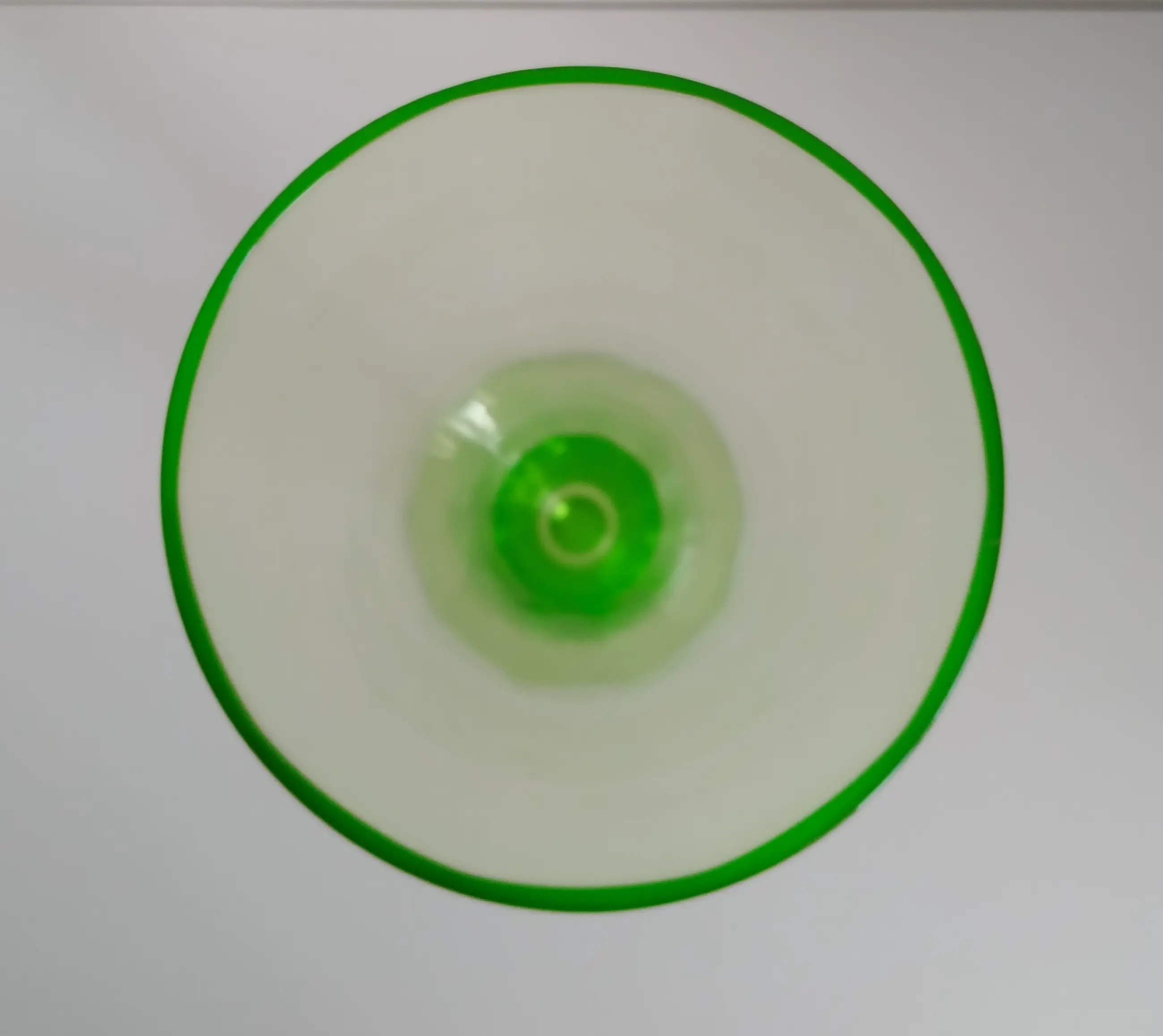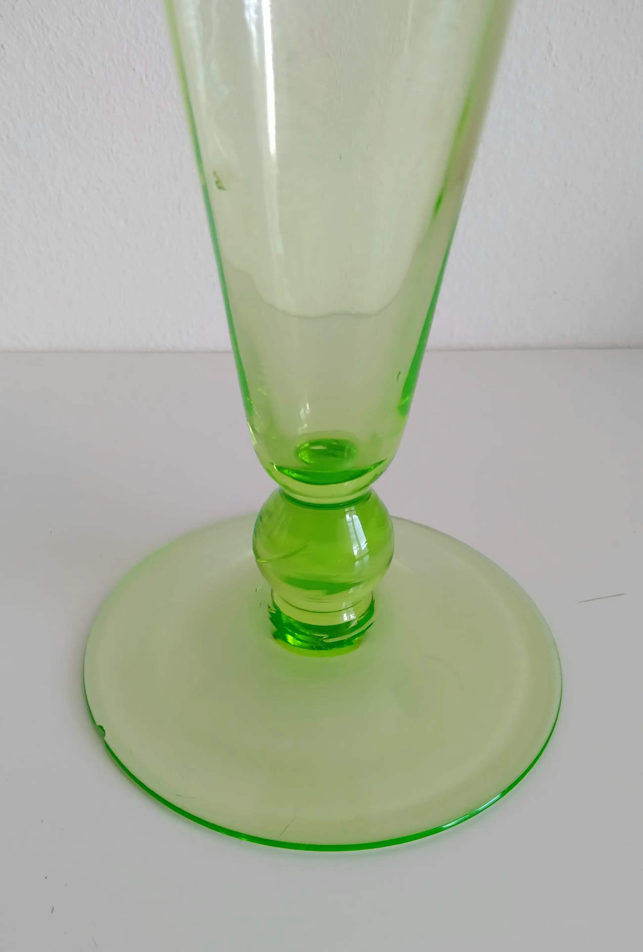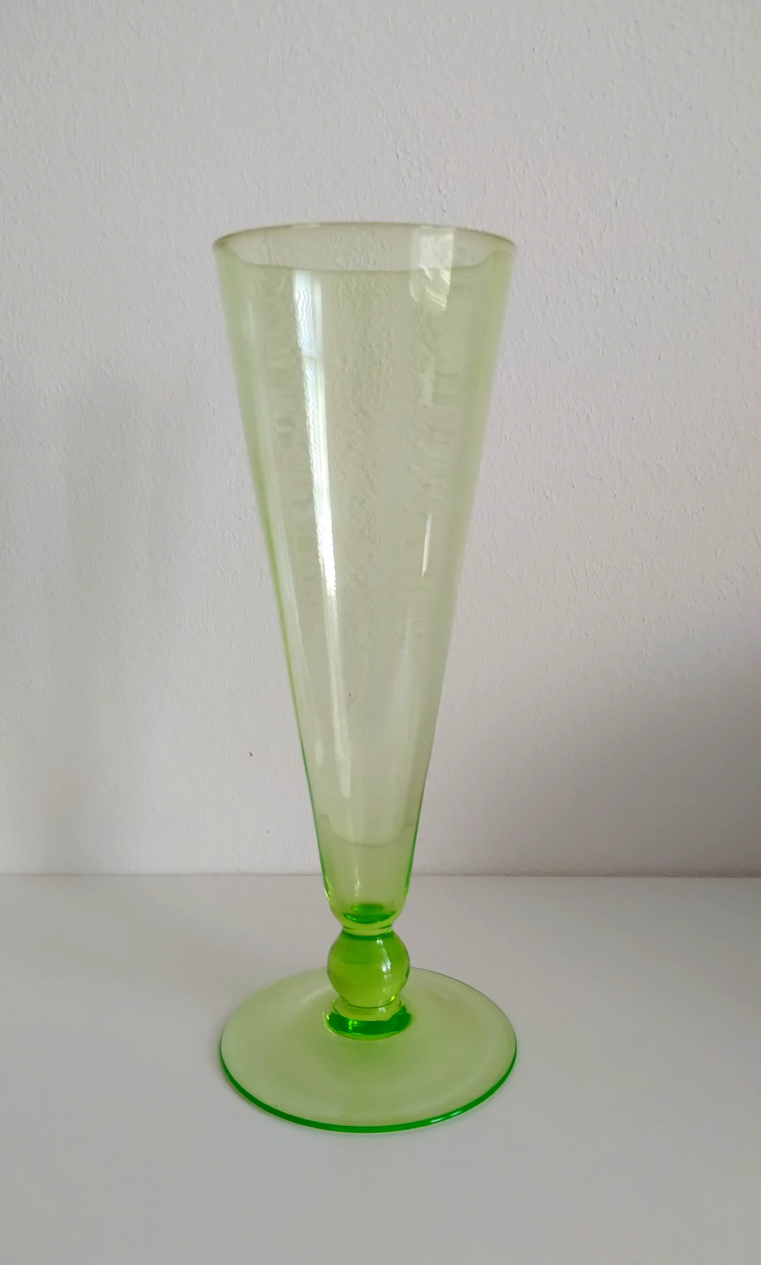 Charmante, uitlopende vaas van uraniumglas. Heeft zeer subtiele zeskant in het glas.