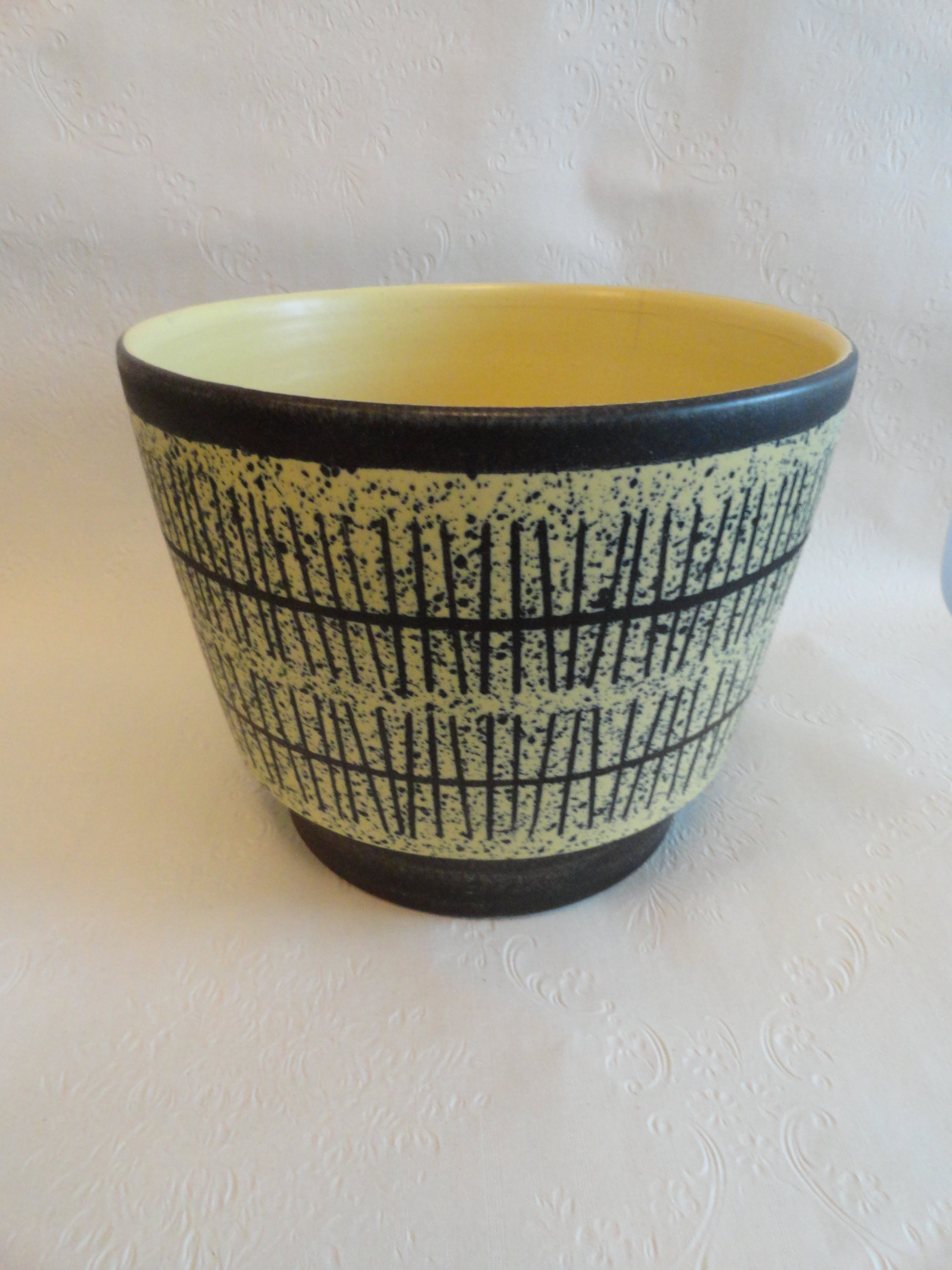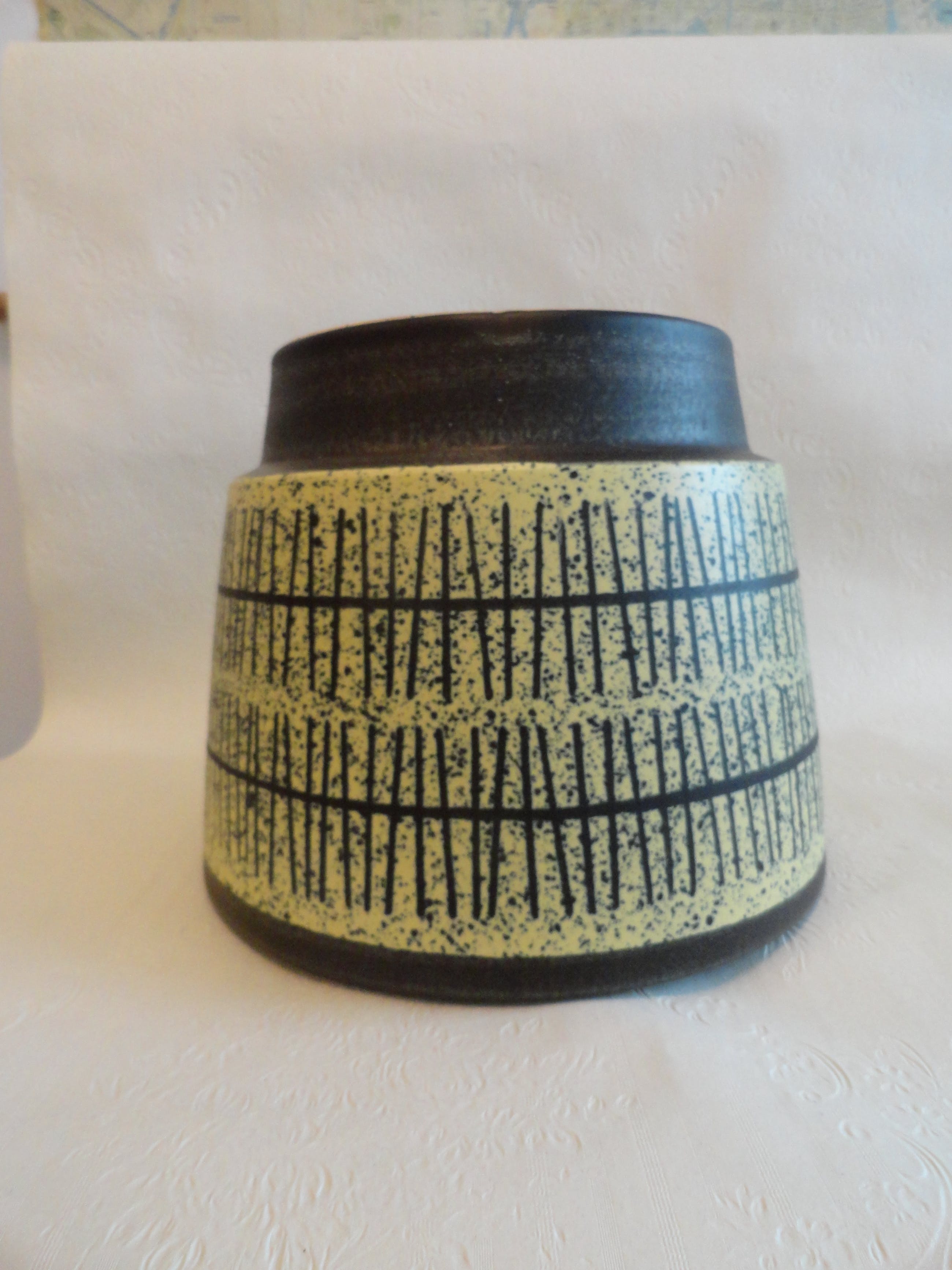 Mooie gave pot uit de rijke West-Germany keramiek geschiedenis Gemerkt aan onderzijde code 3535/2 Goede kleuren en aparte decoratie maakt dat deze pot een uniek en moeilijk te vinden item is Buitenkant gespikkeld en streepjes decoratie Kleurstelling geel / bruin / zwart Dit is een groot exemplaar