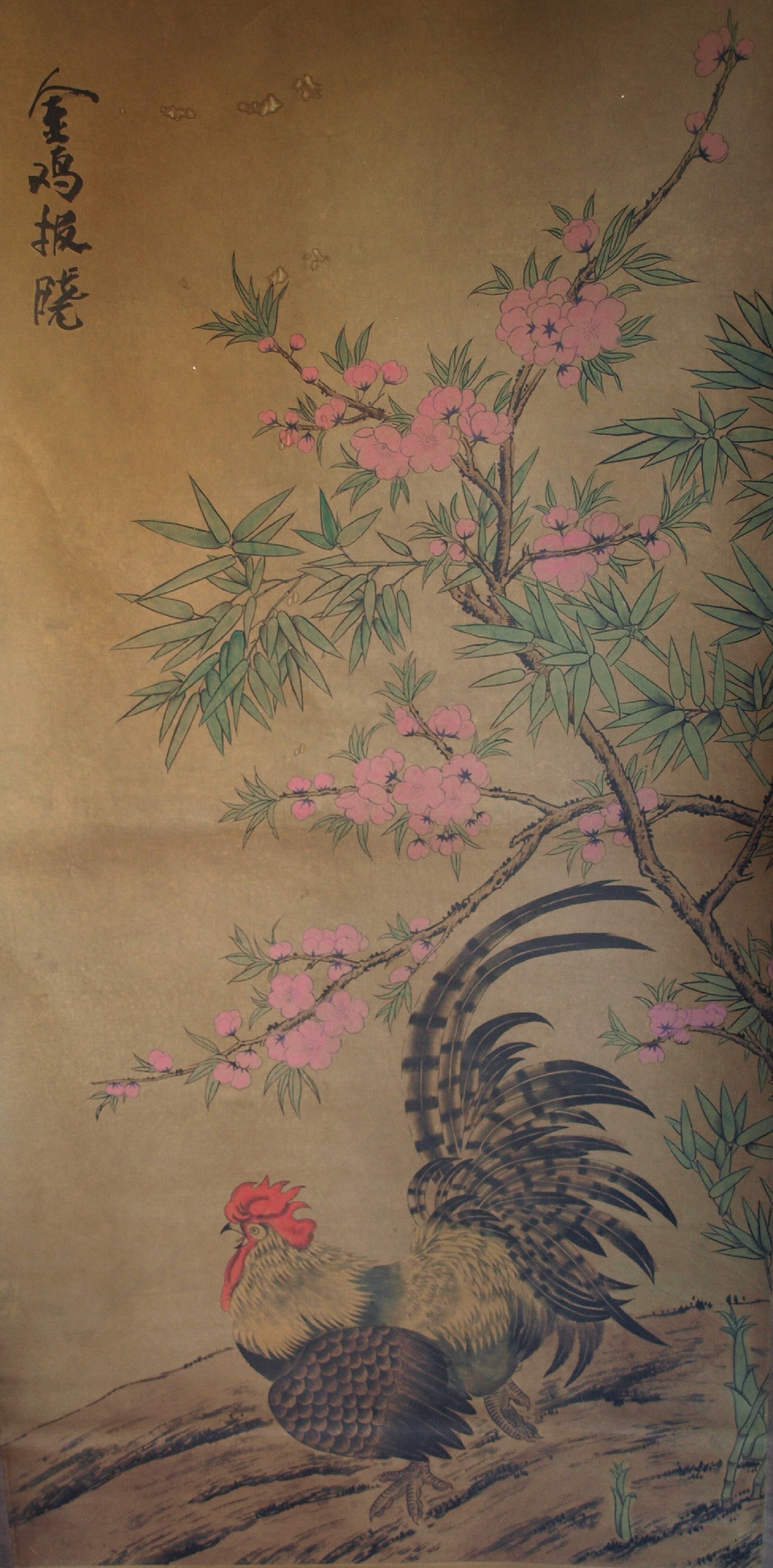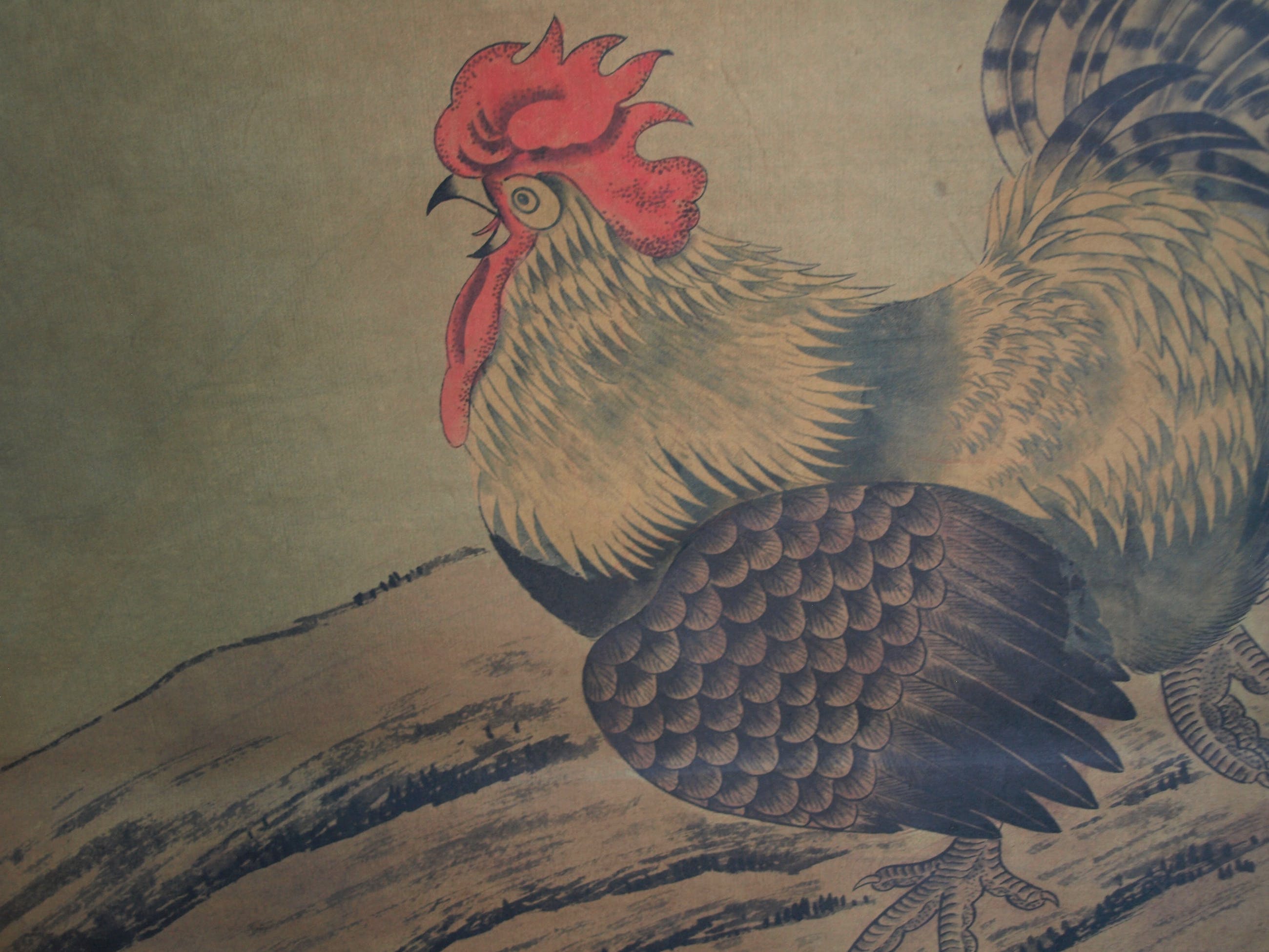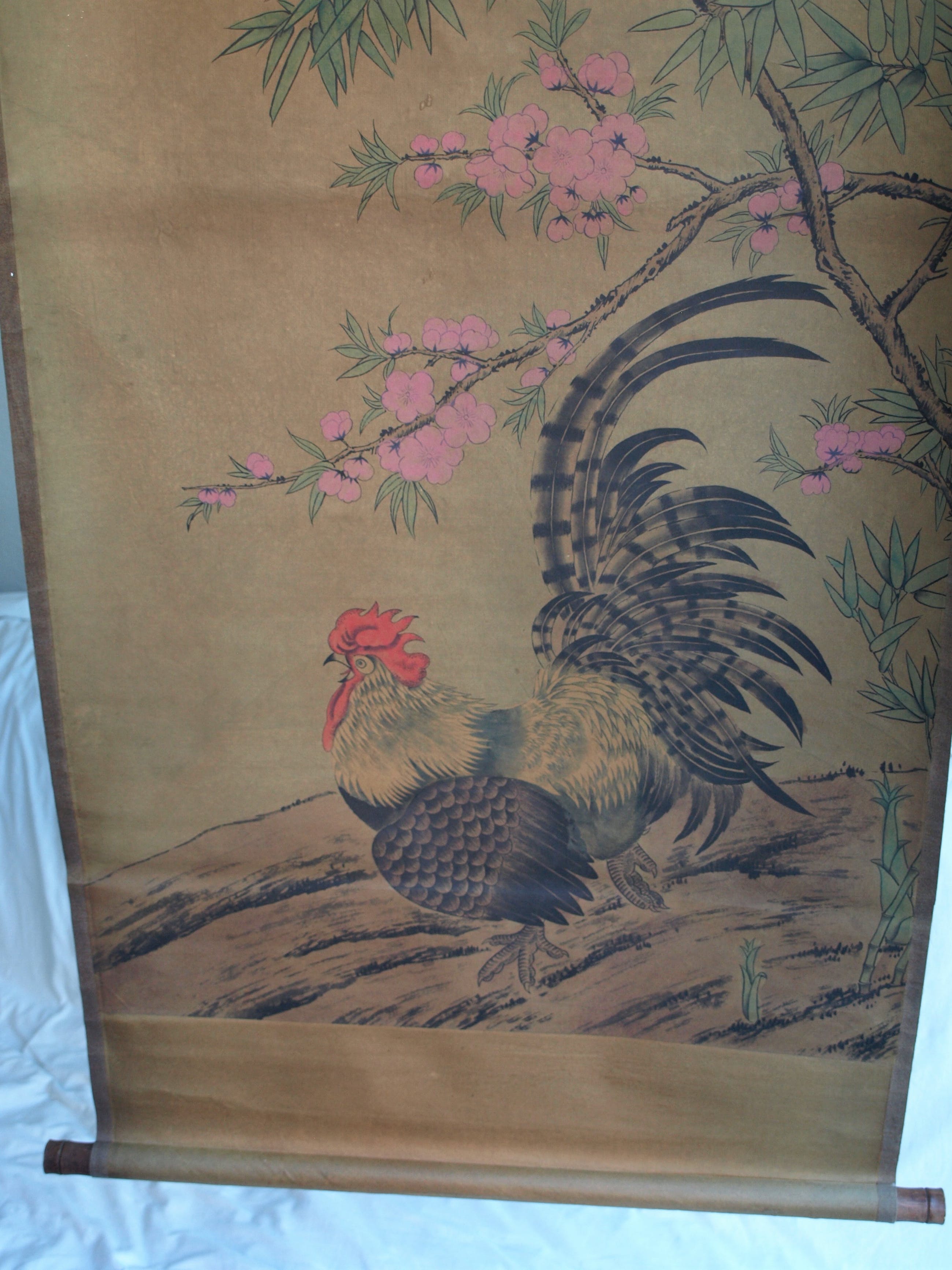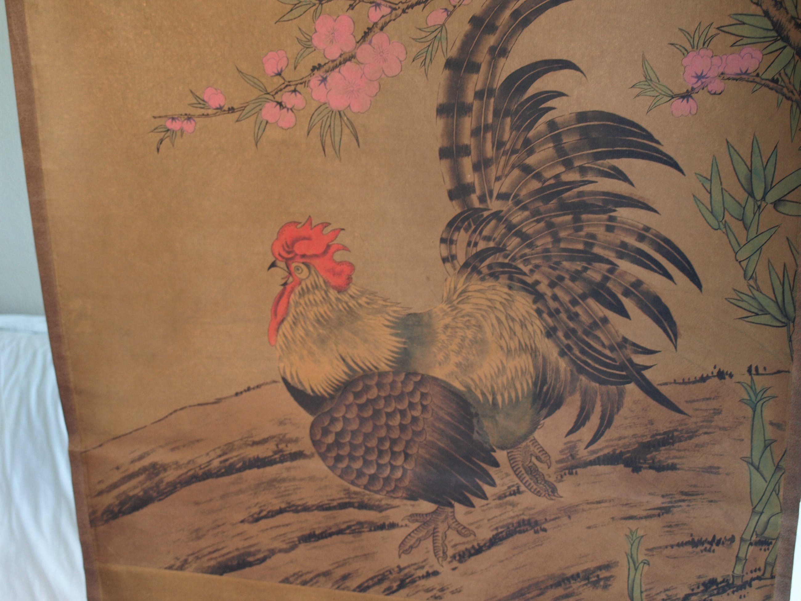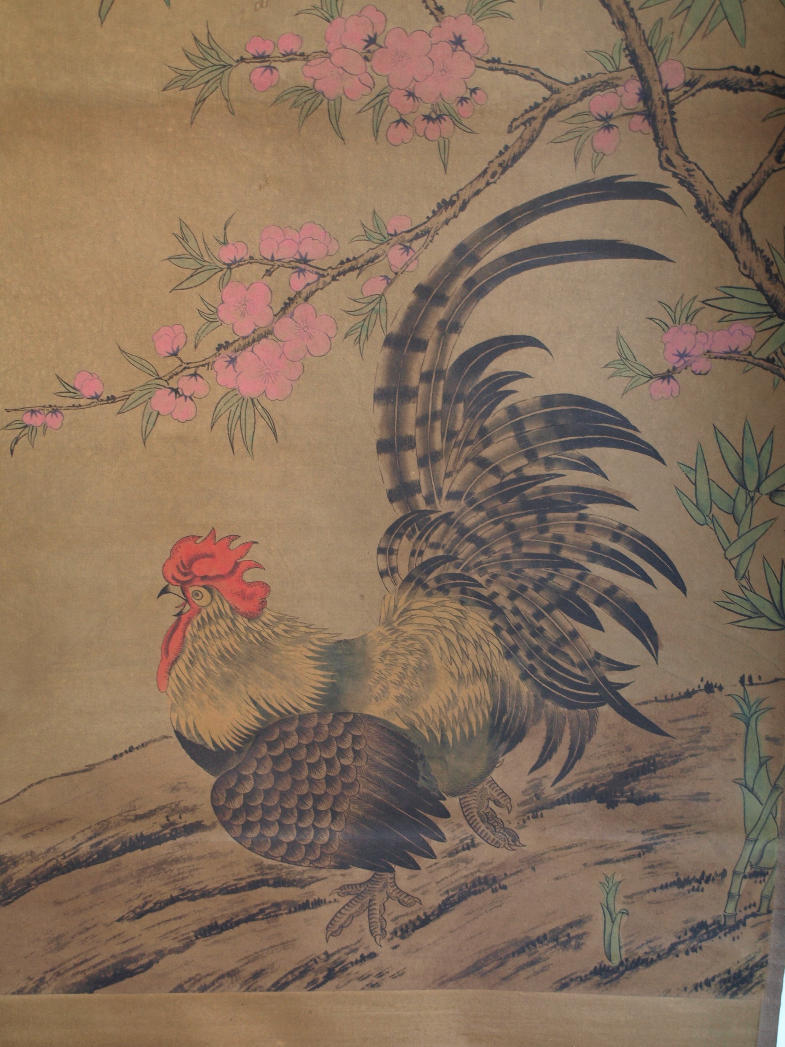 • -Een scroll gemaakt door een Japanse of Chinese kunstenaar, met een voorstelling van een haan bij een bloesemtak.