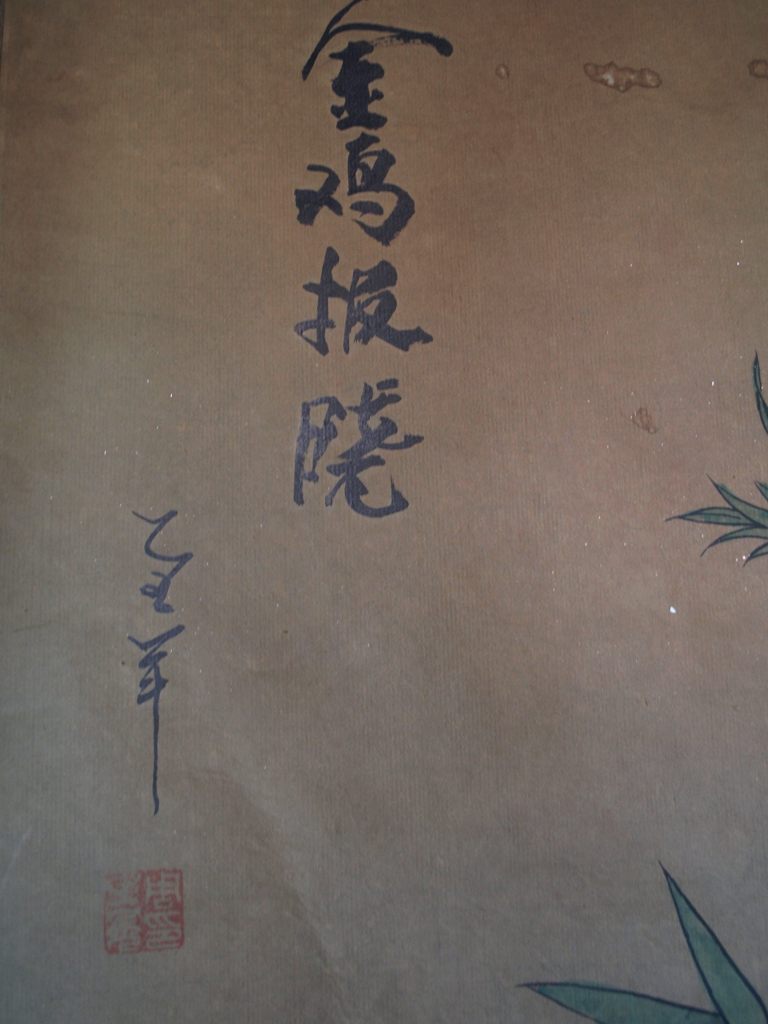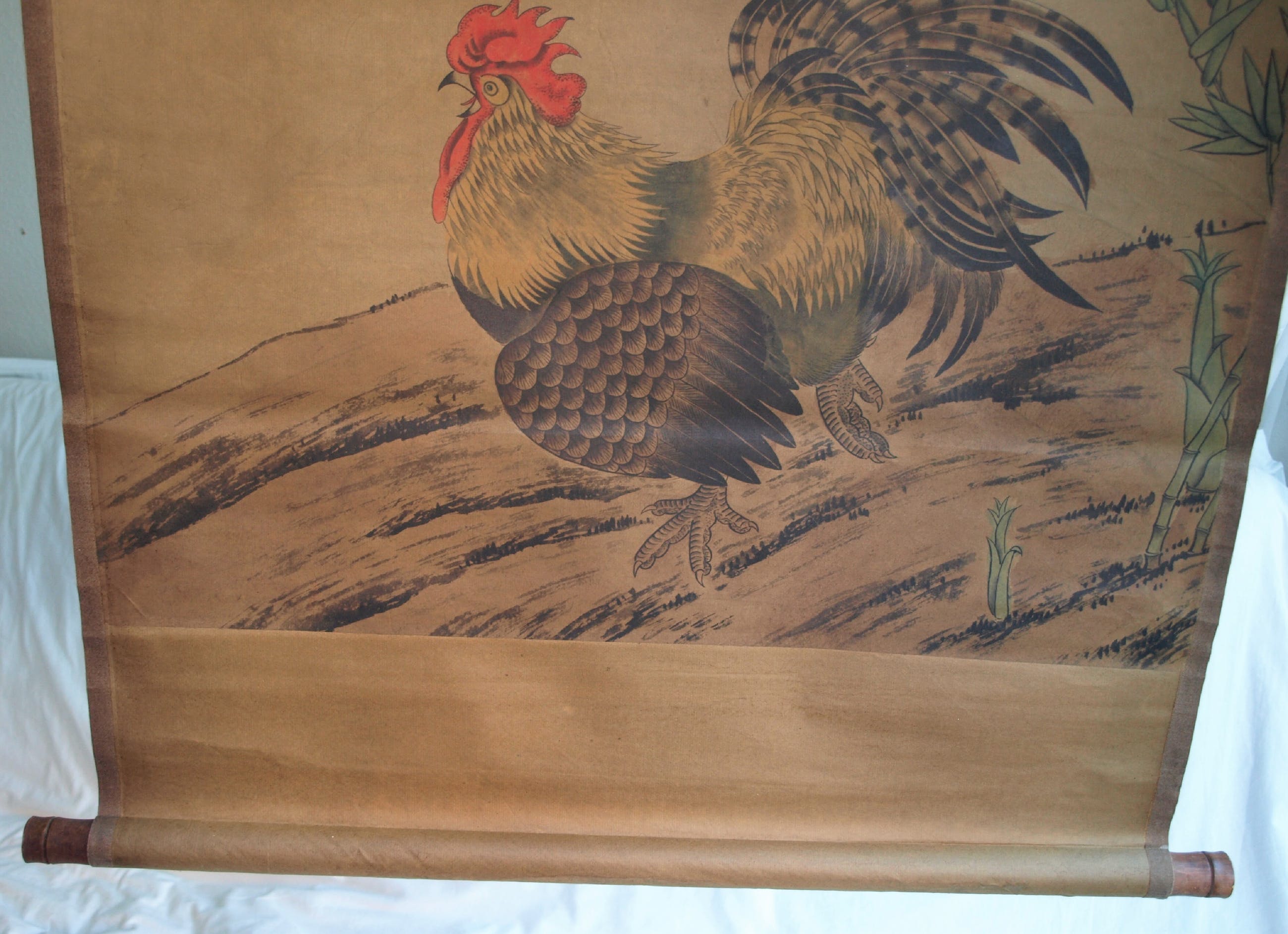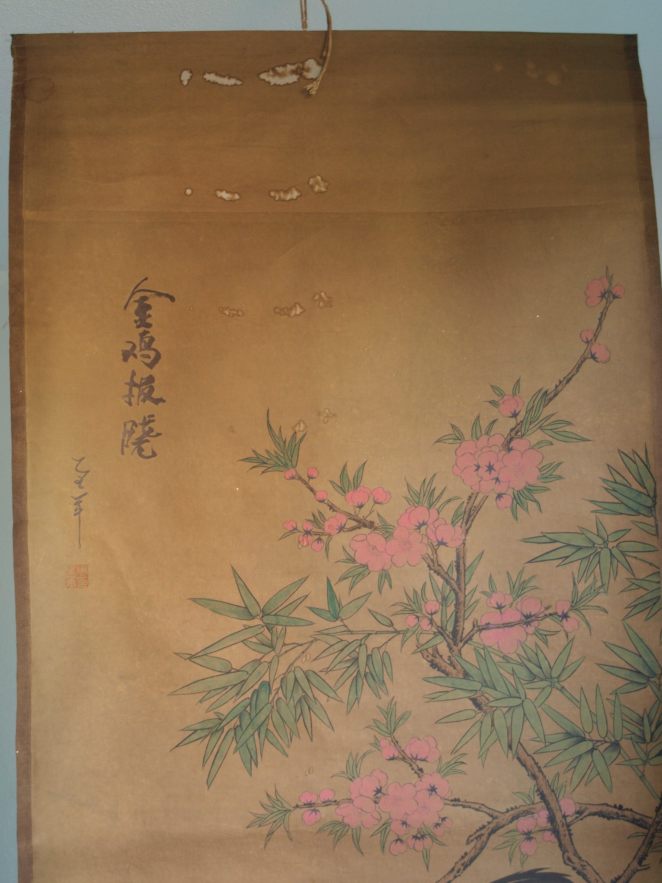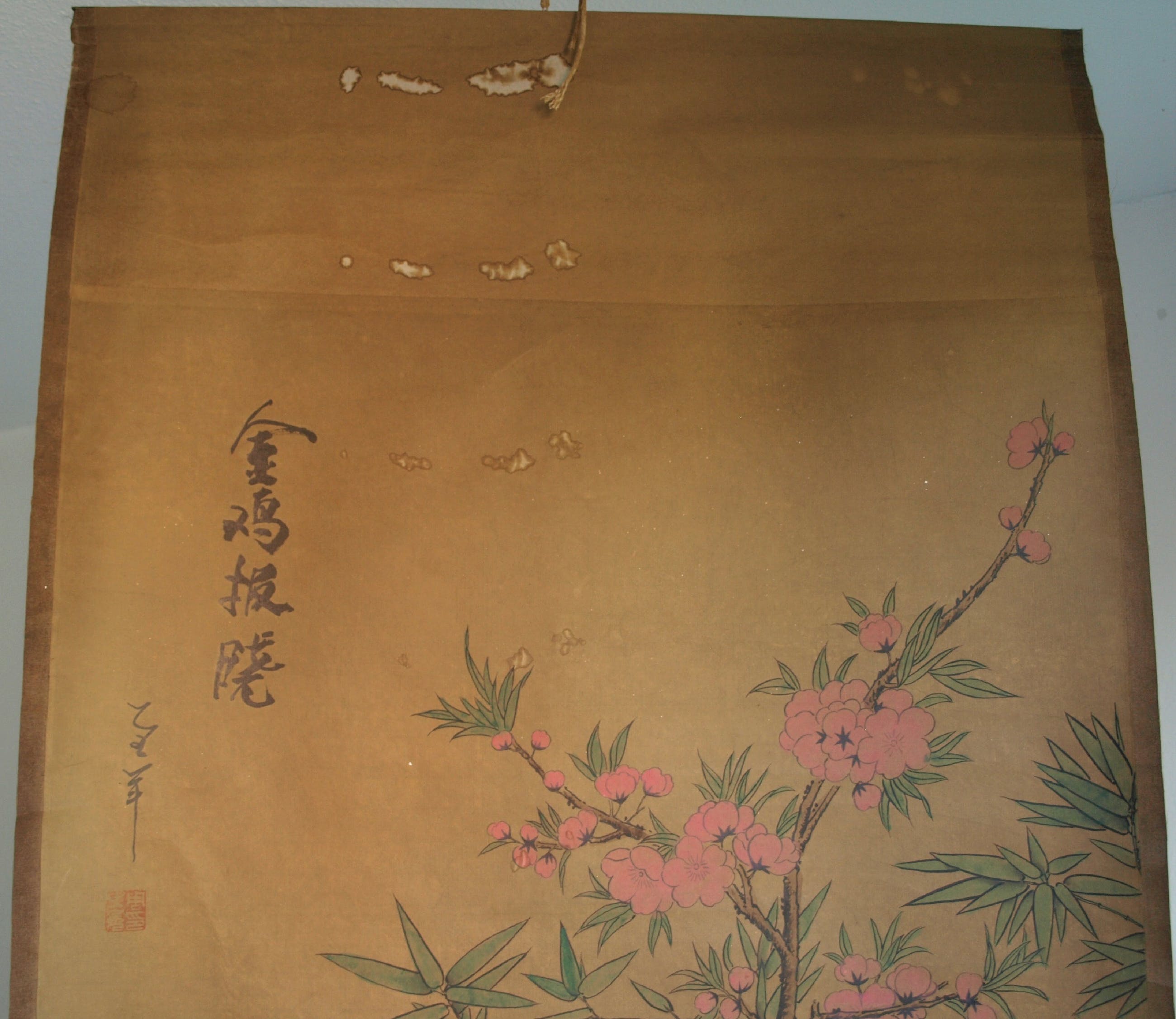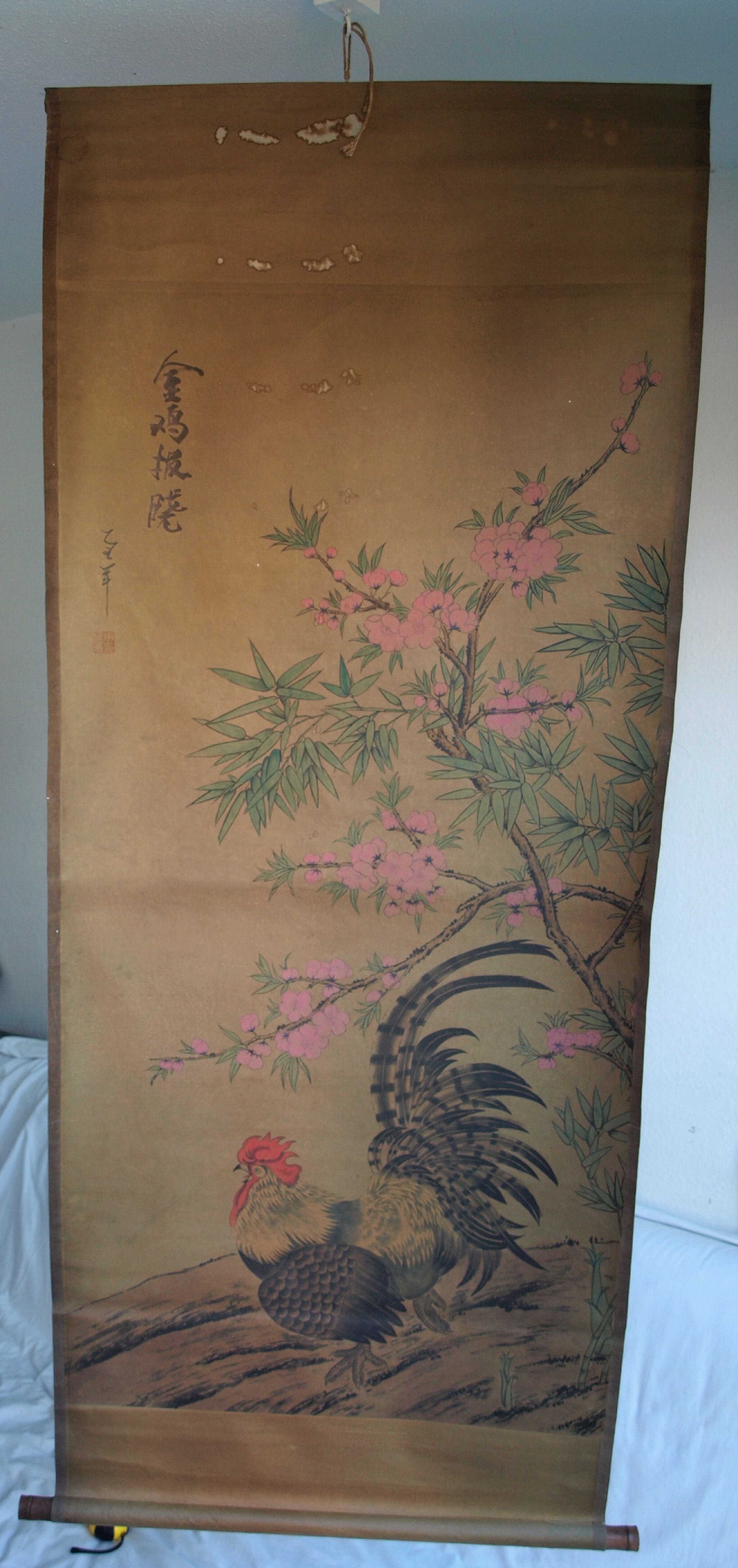 • -Een scroll gemaakt door een Japanse of Chinese kunstenaar, met een voorstelling van een haan bij een bloesemtak.