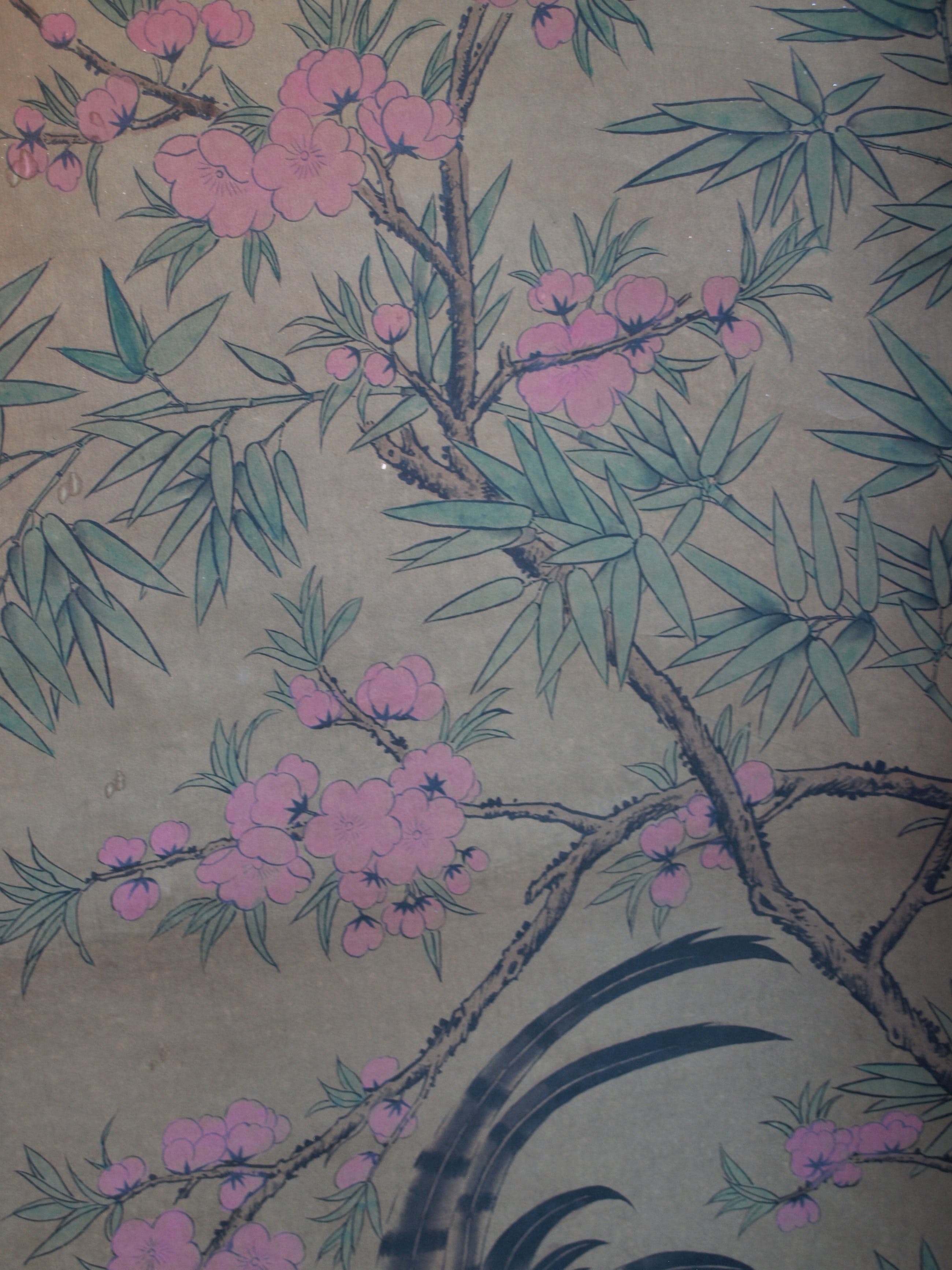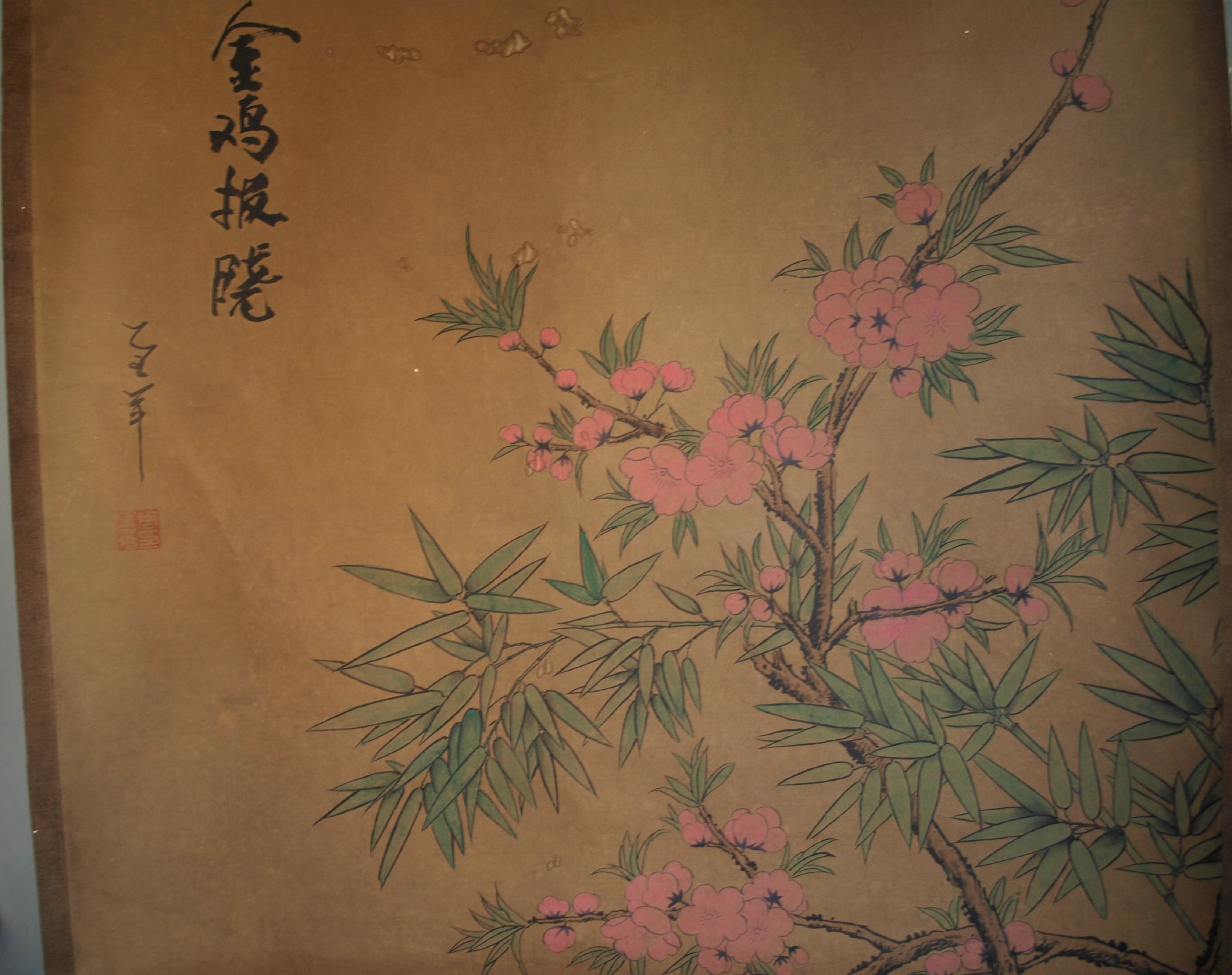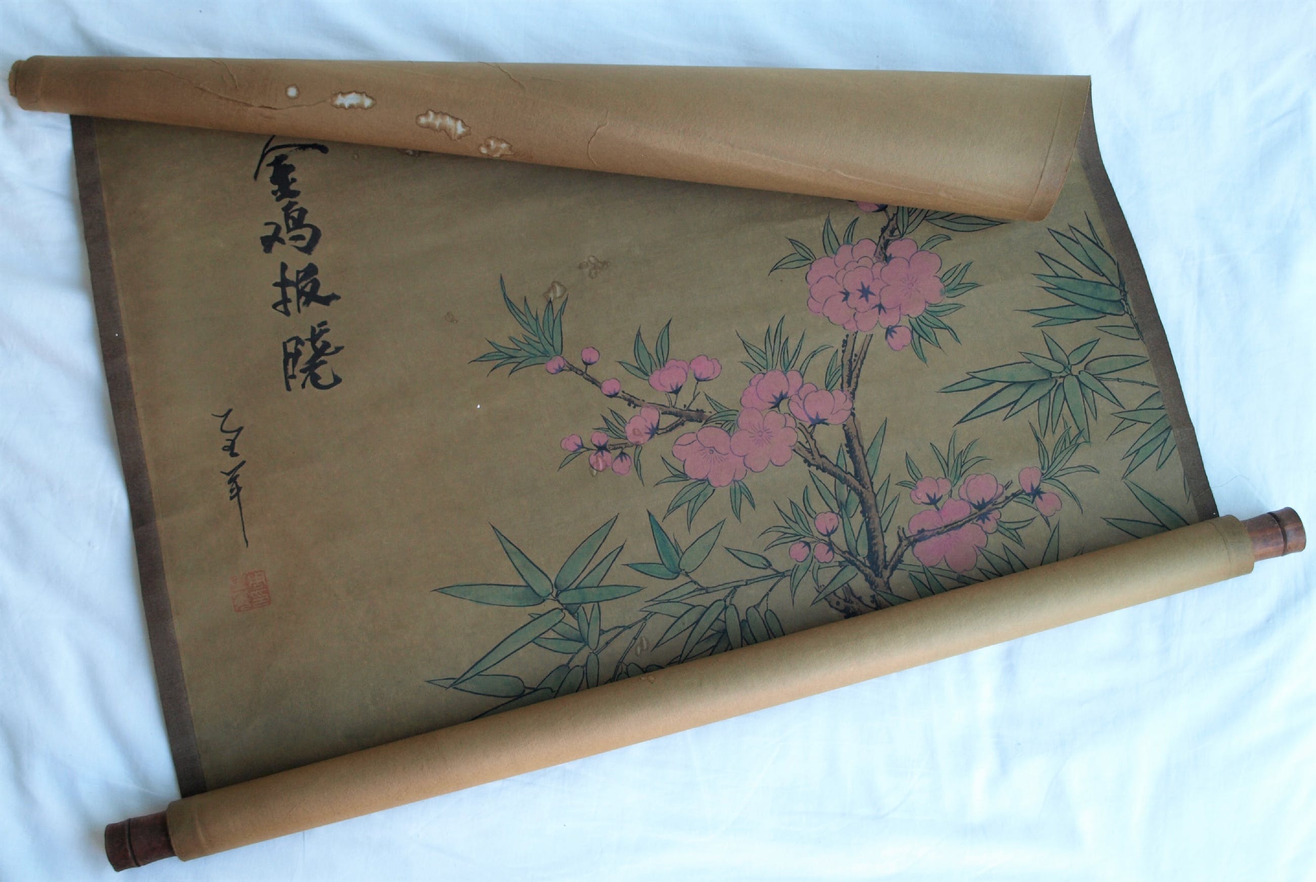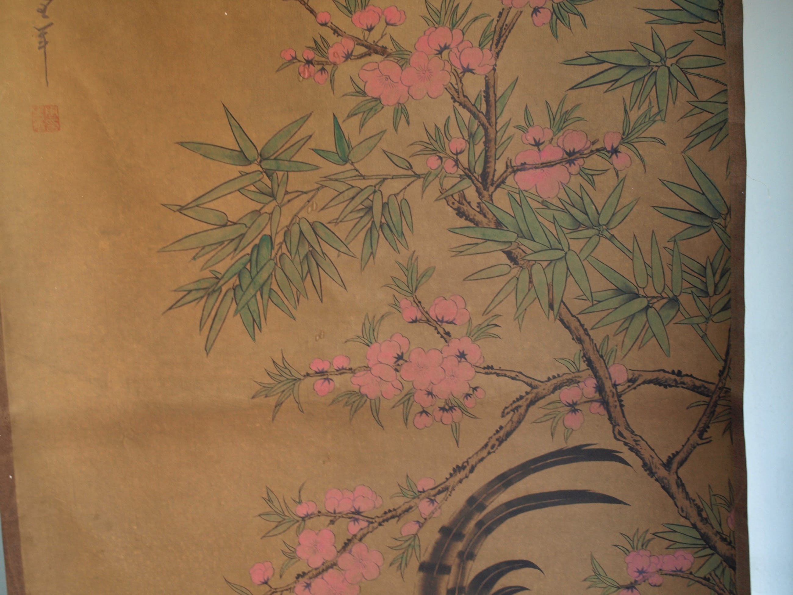 Onbekend - Haan en Bloesem - Aquarelverf en inkt op papier, opgerold op houten stok - Verkocht