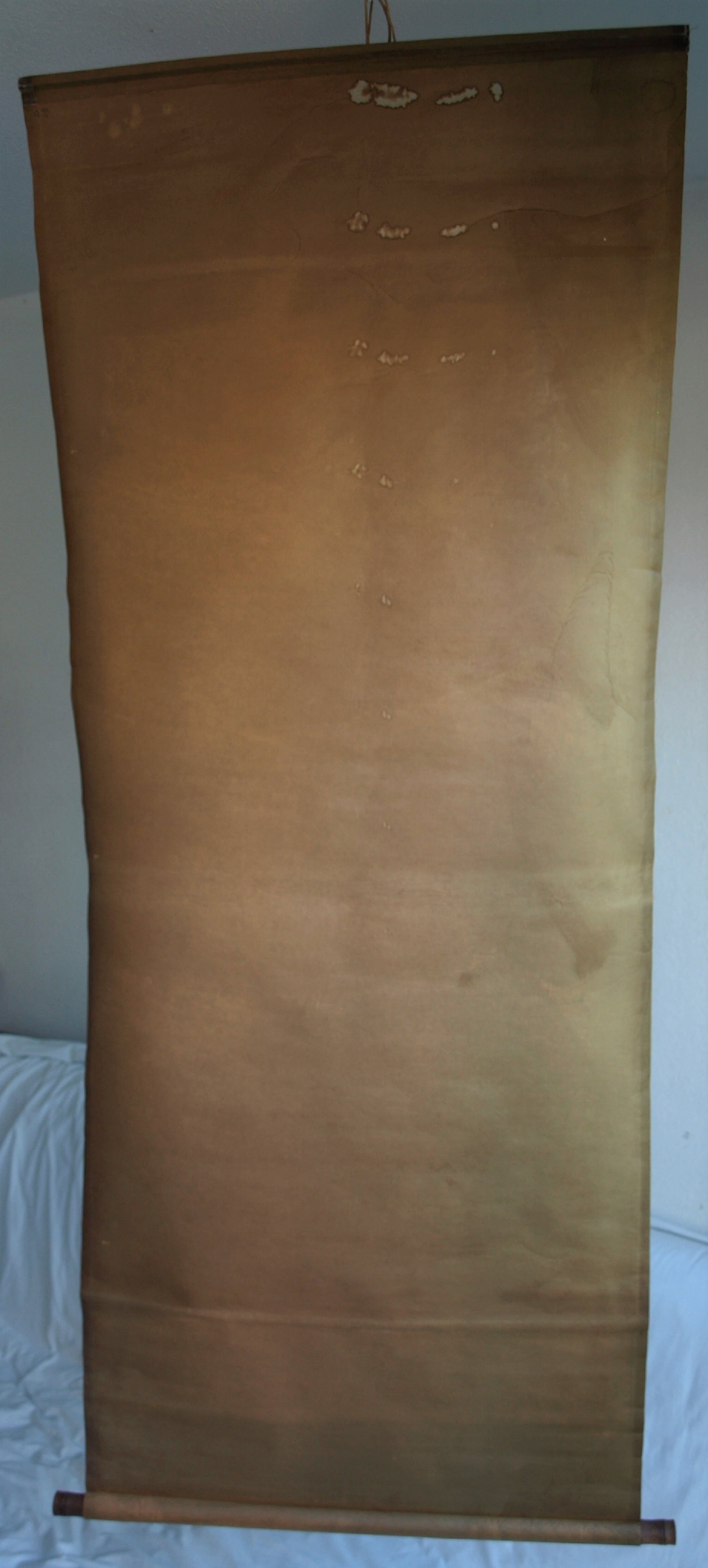 -Aquarelverf en inkt op papier, opgerold en bevestigd aan een houten stok.