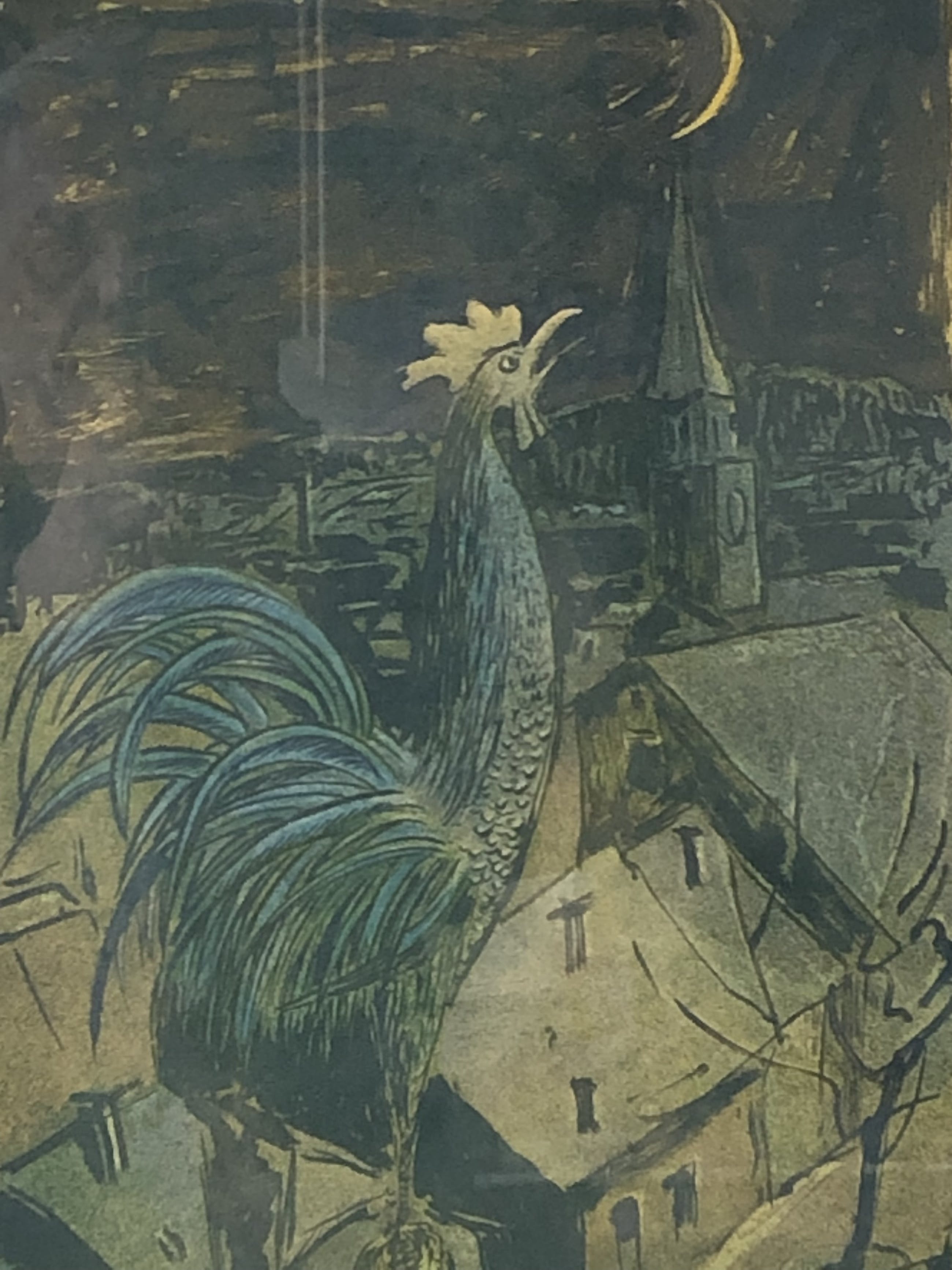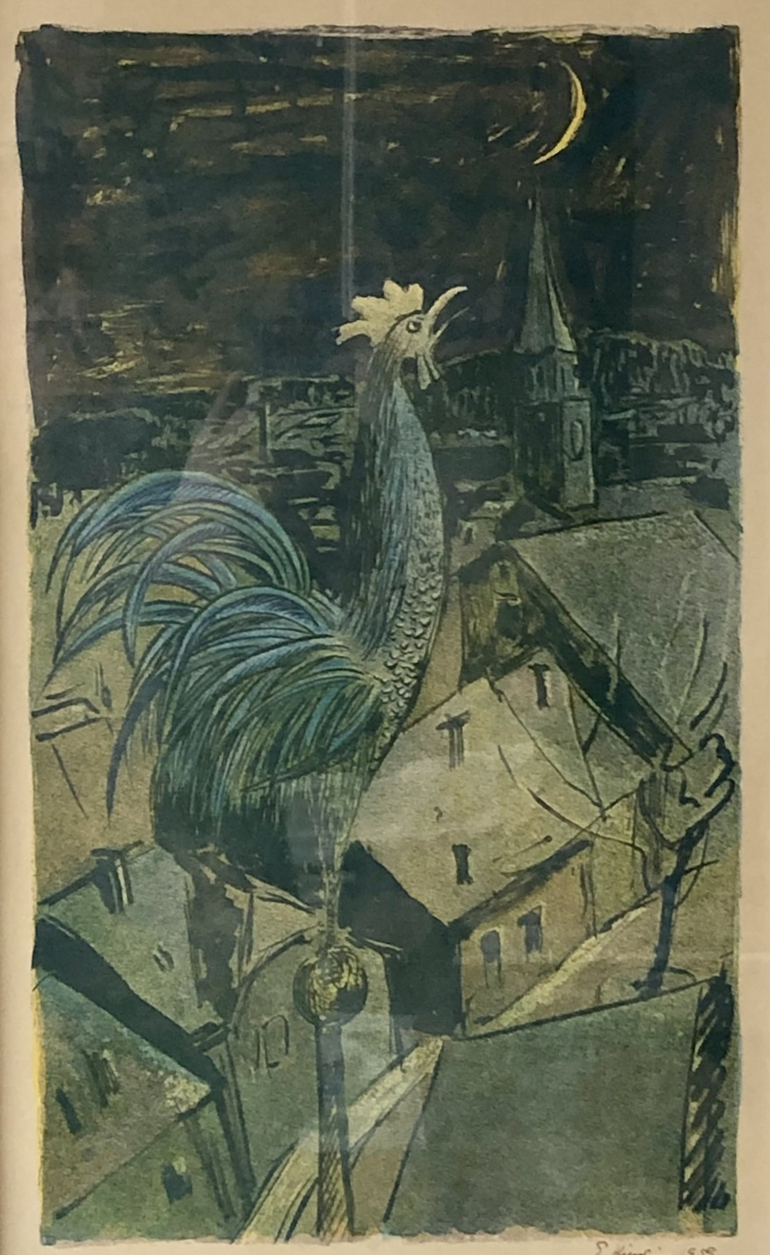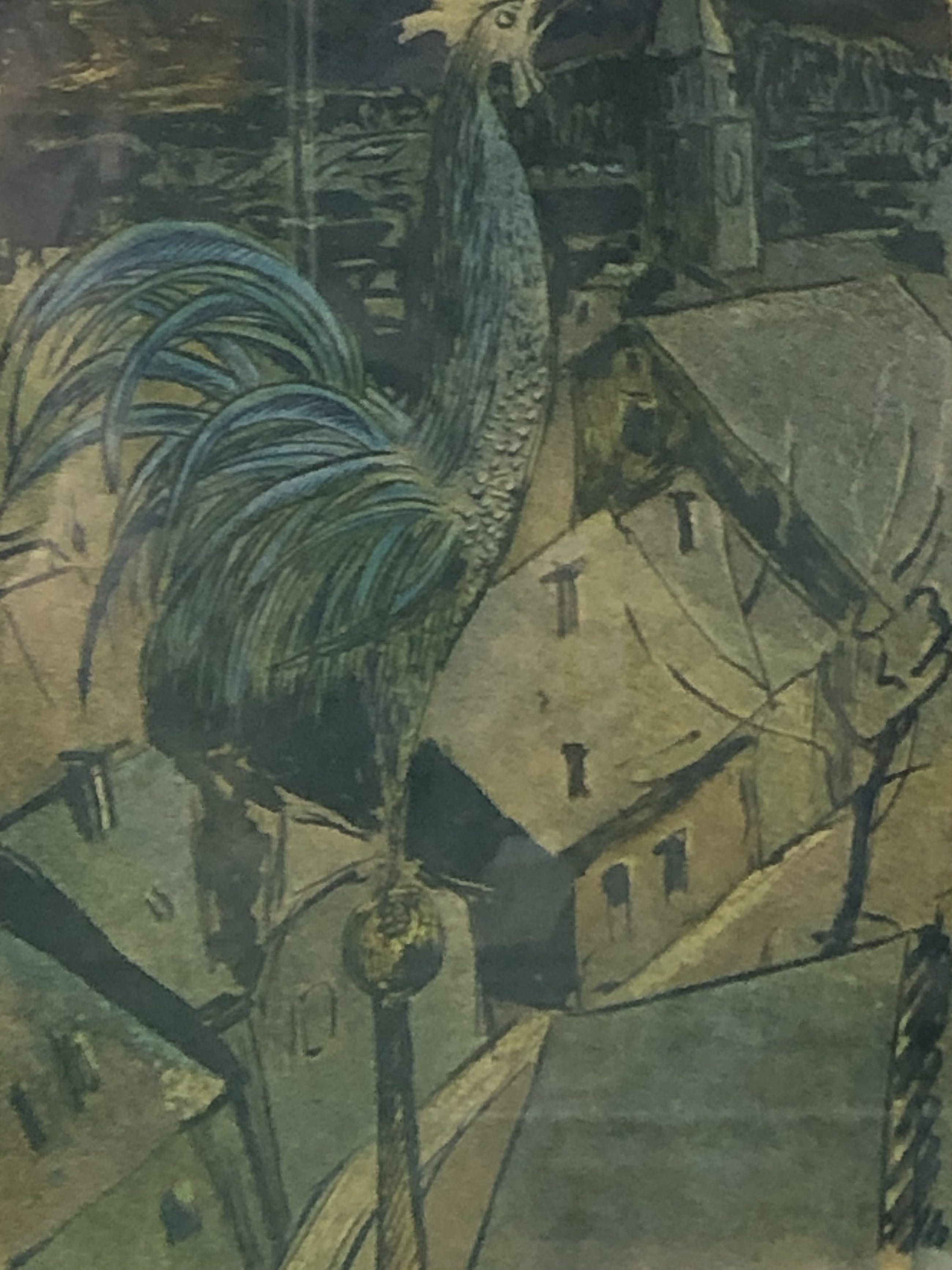 Prachtige kleurenets van een haan op de torenspits uitkijkend over een dorp of stad in de nacht. Vermoedelijk een Duitse kunstenaar gezien de handgeschreven boodschap links onder.