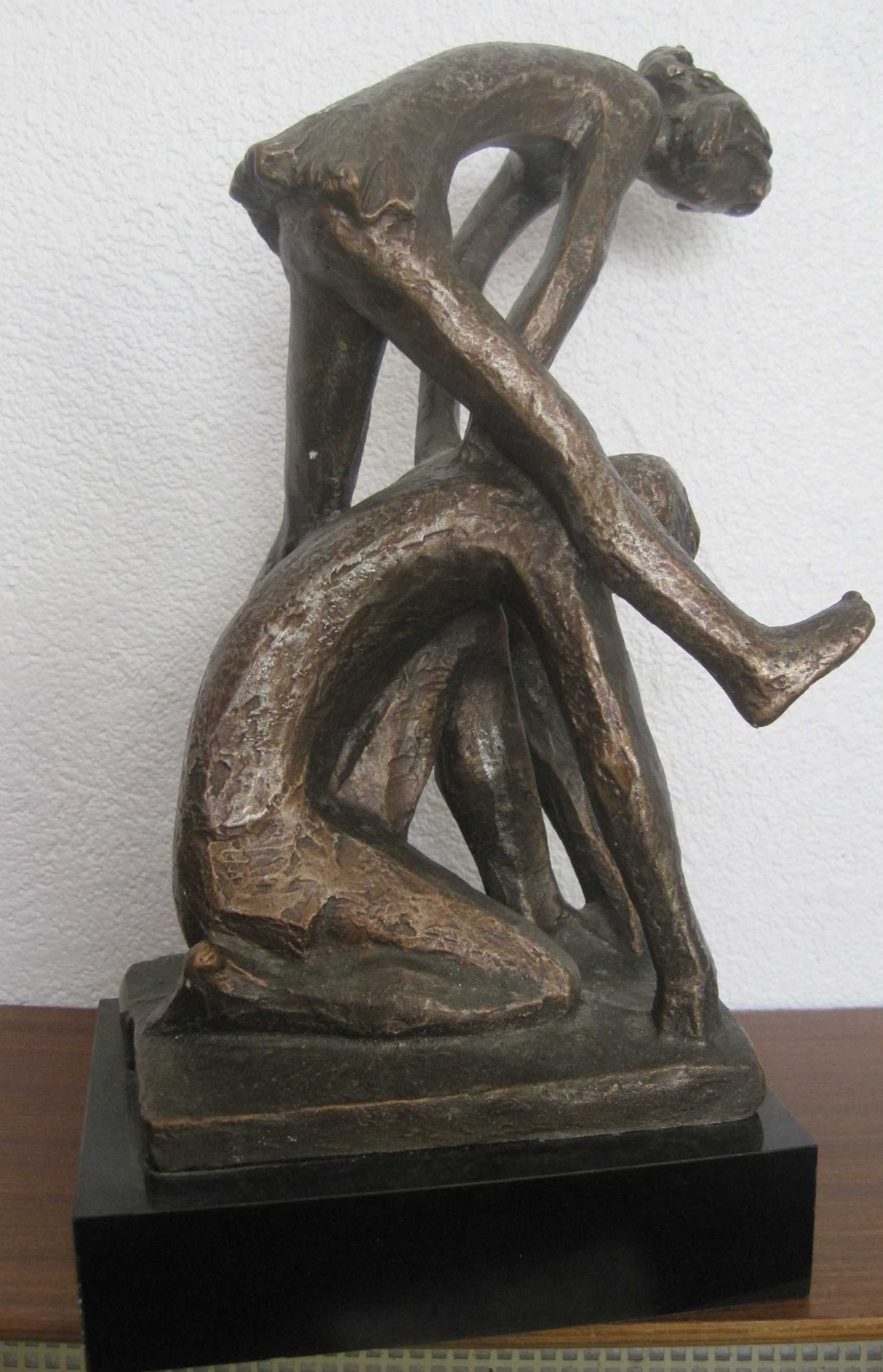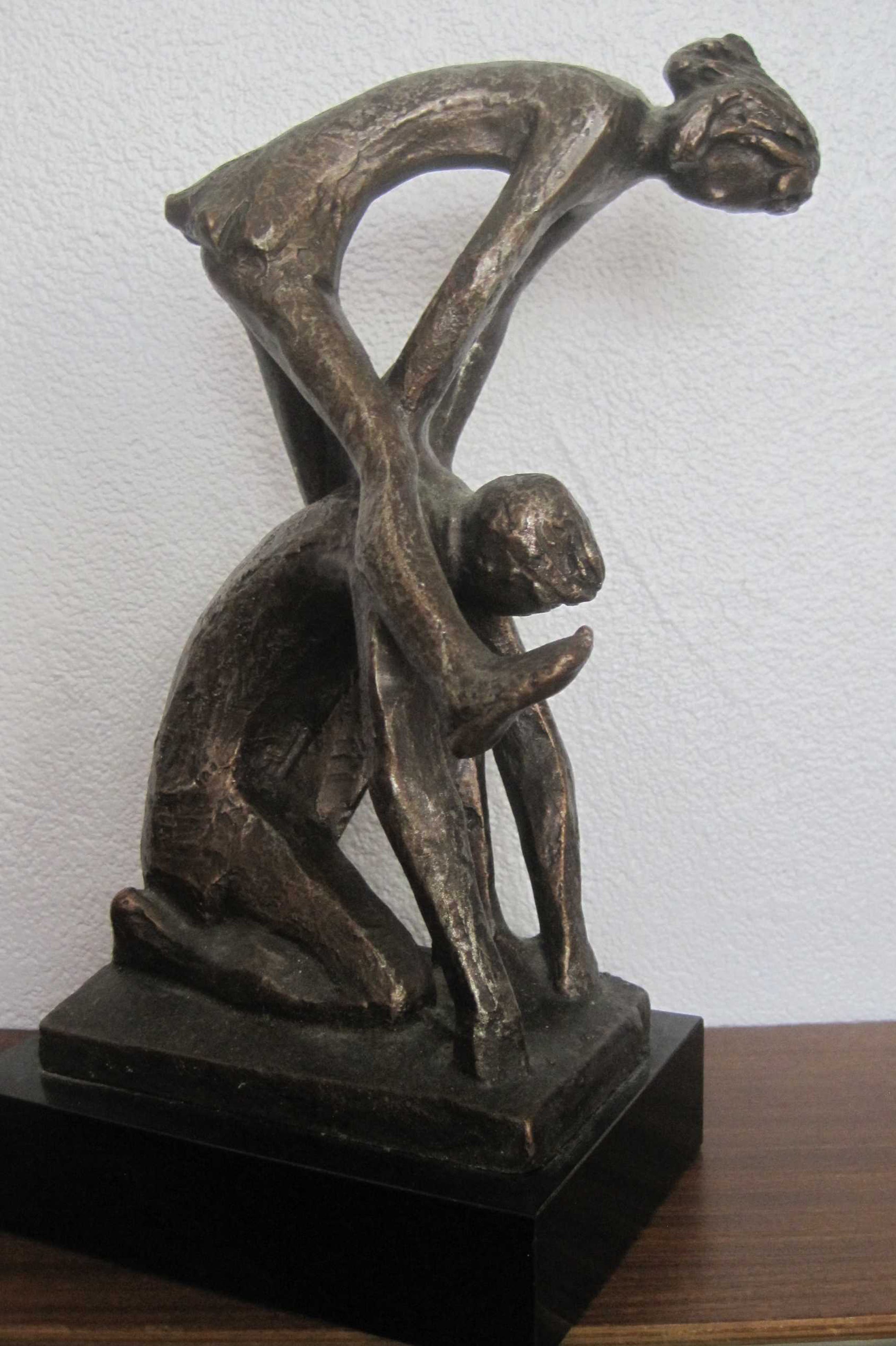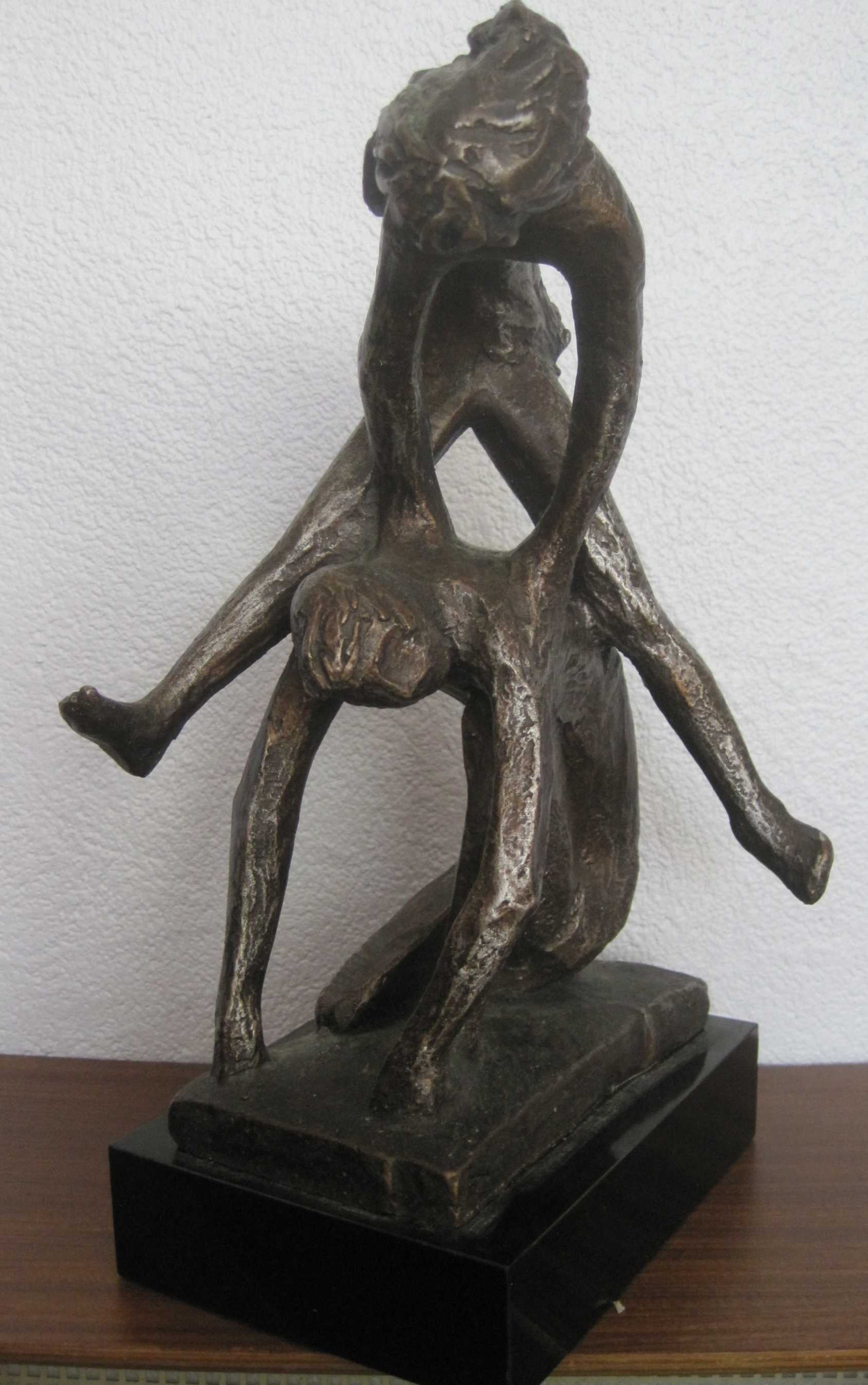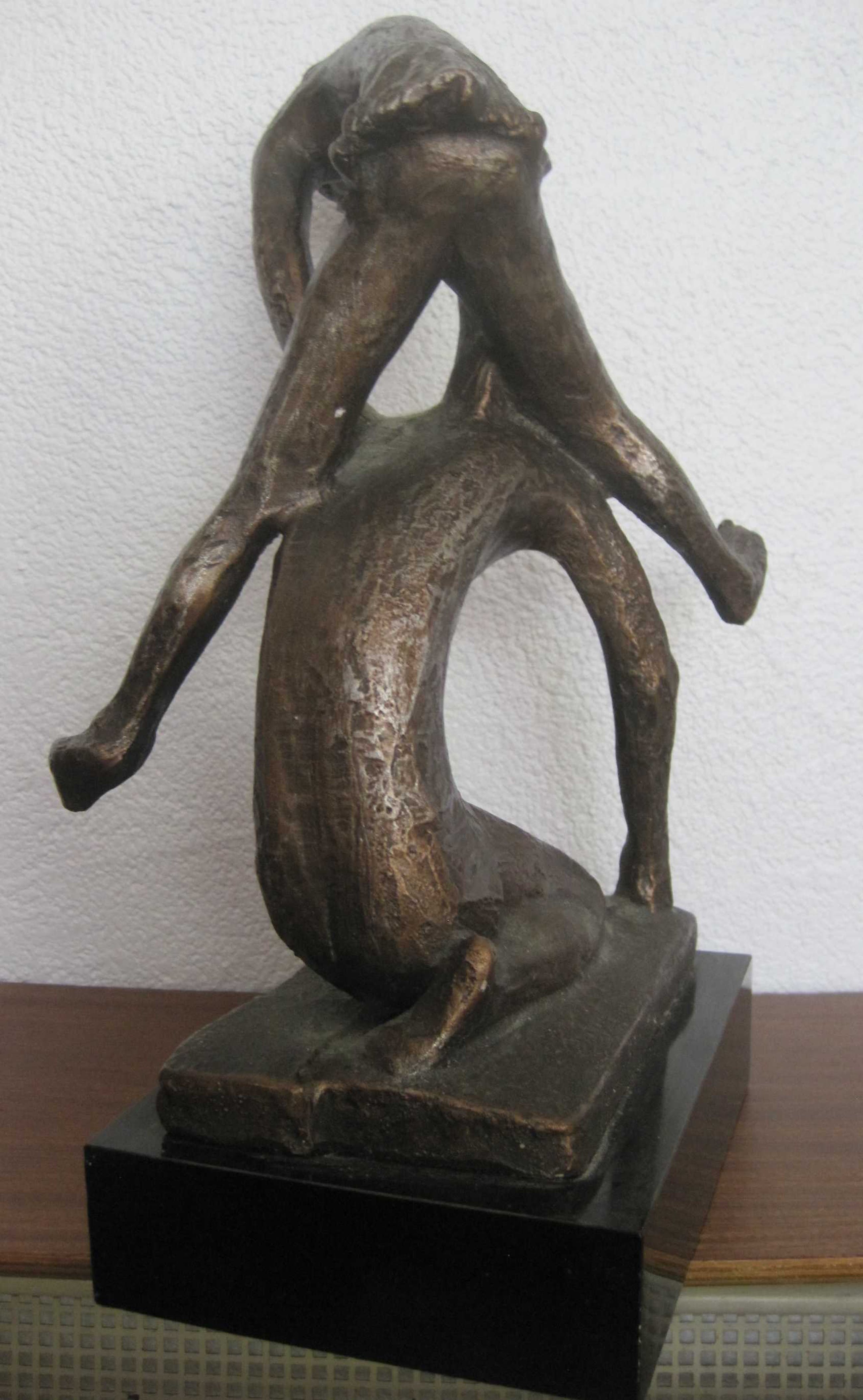 Modern abstract beeld van 2 tieners die haasje over spelen.Een plezierig beeld om naar te kijken.Gemaakt van verbronsd kunststof.Het beeld is gesigneerd of heeft tekst op 2 plaatsen.Helaas niet te ontcijferen voor mij.