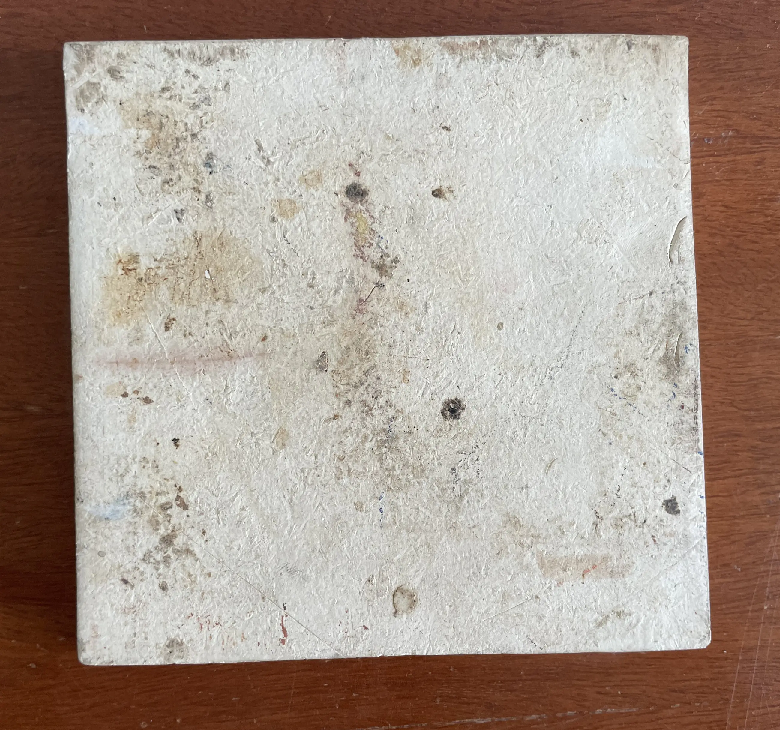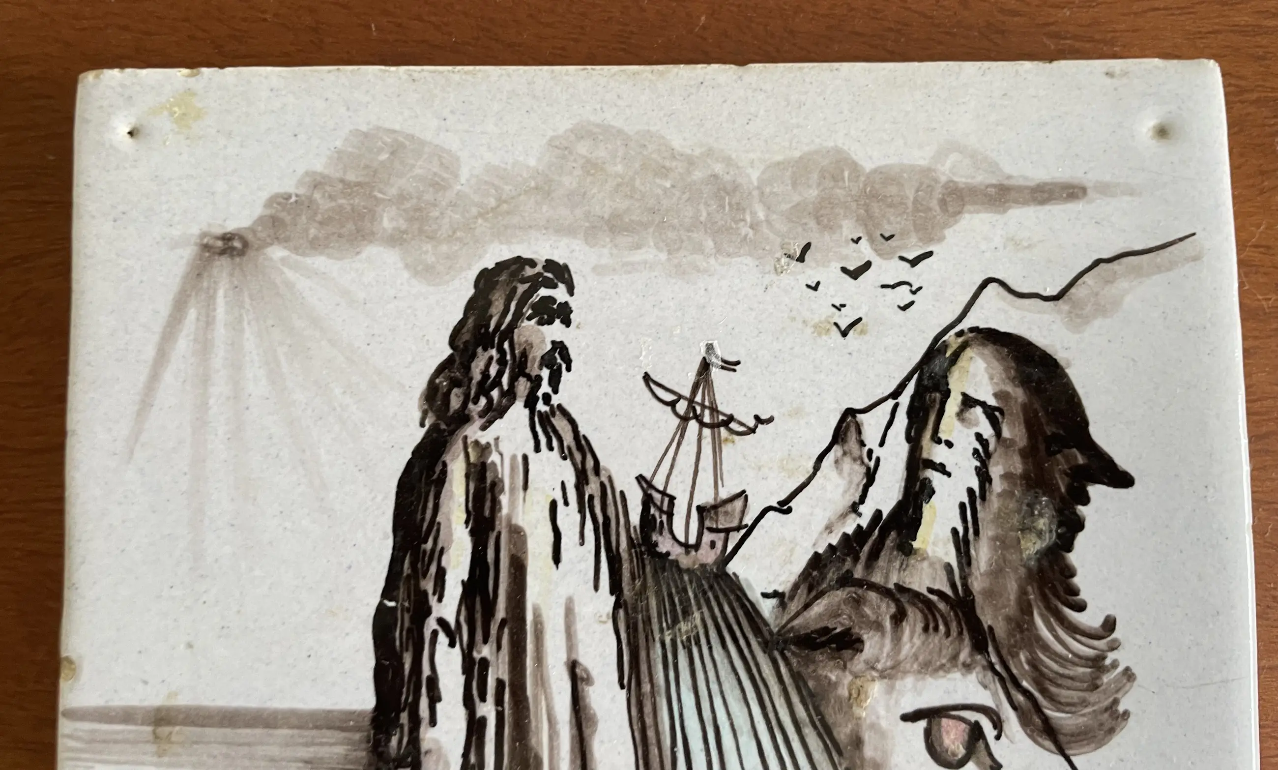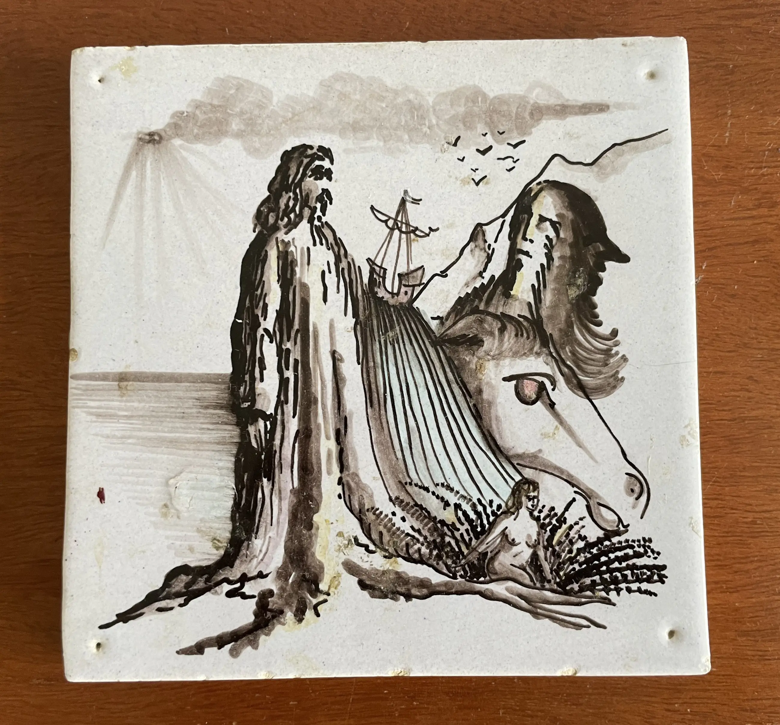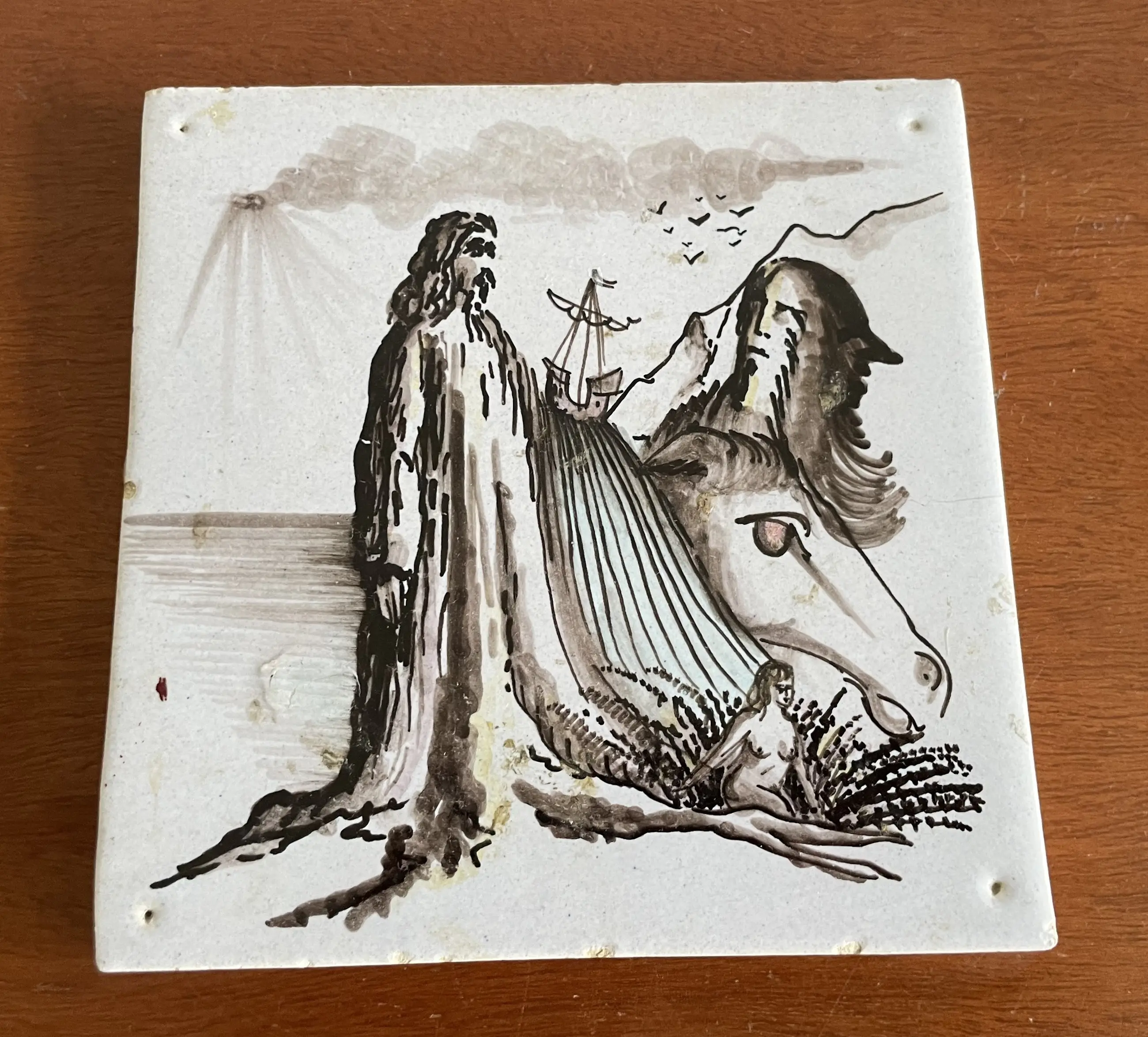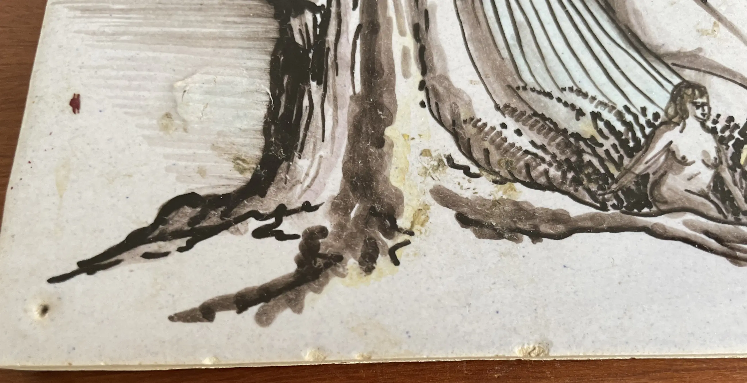 Hand gedecoreerde tegel met een allegorische voorstelling. Heeft wat flinters op de rand, verder in goede conditie. Niet gemerkt,