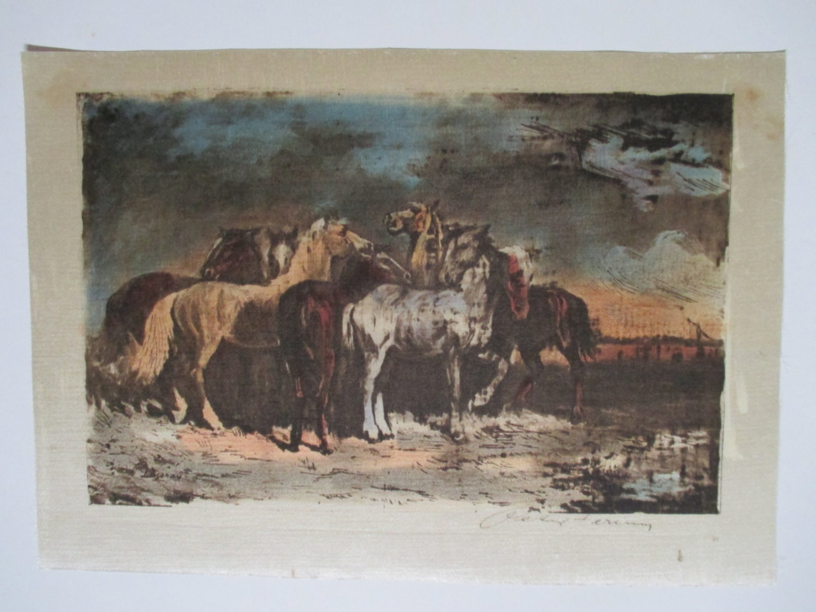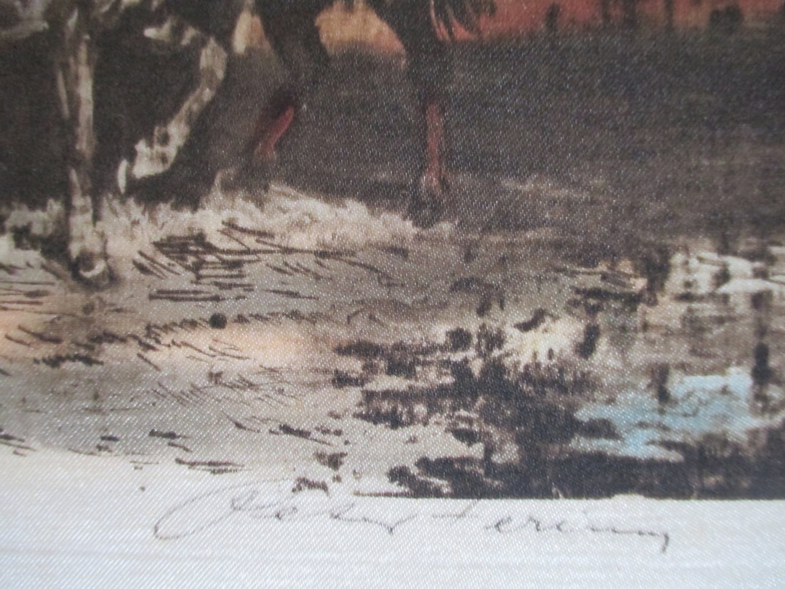 Handgekleurde ets gedrukt op zijde, r.o gesigneerd in pen. Afm. doek 31x22, beeld 26,5x17 cm.