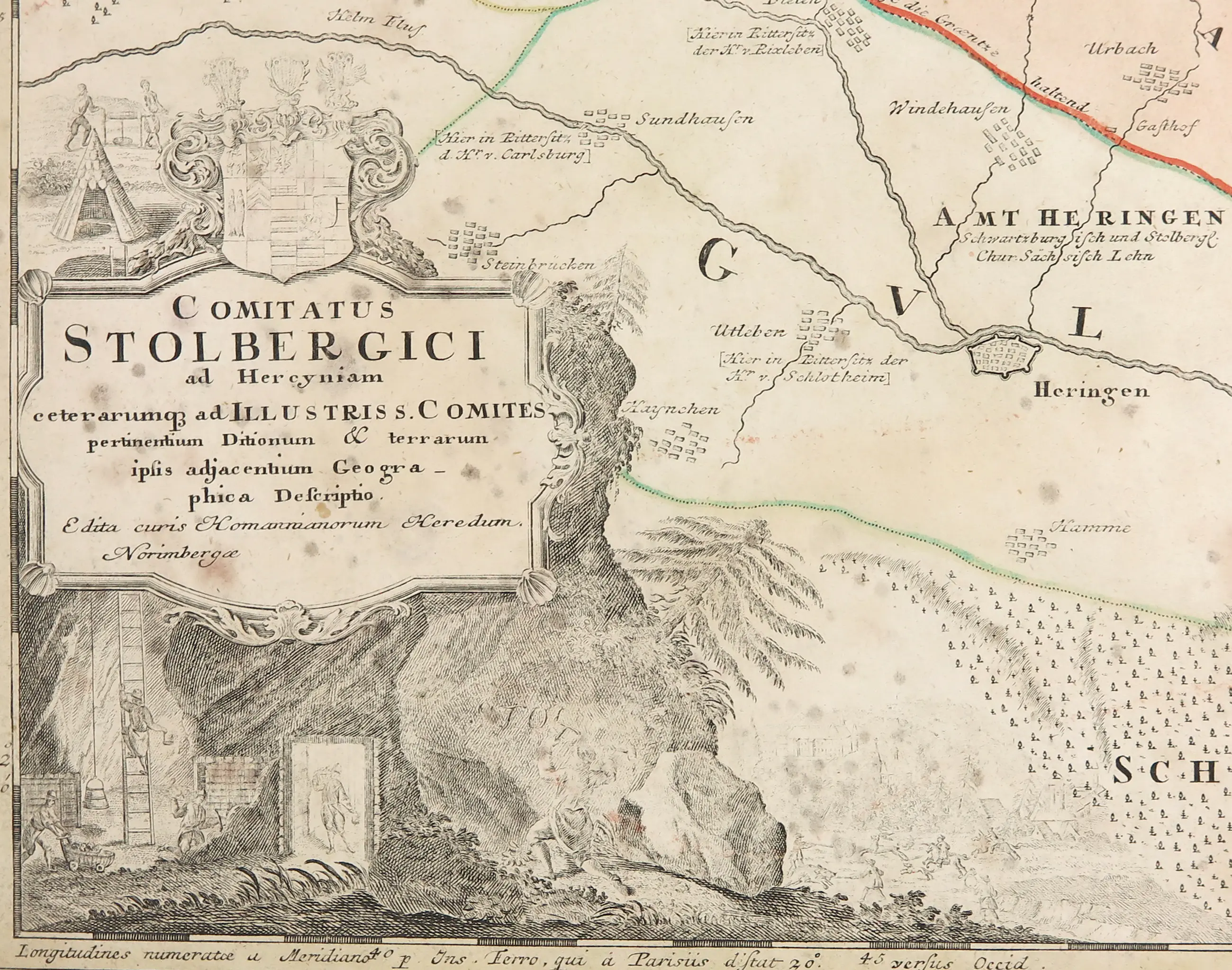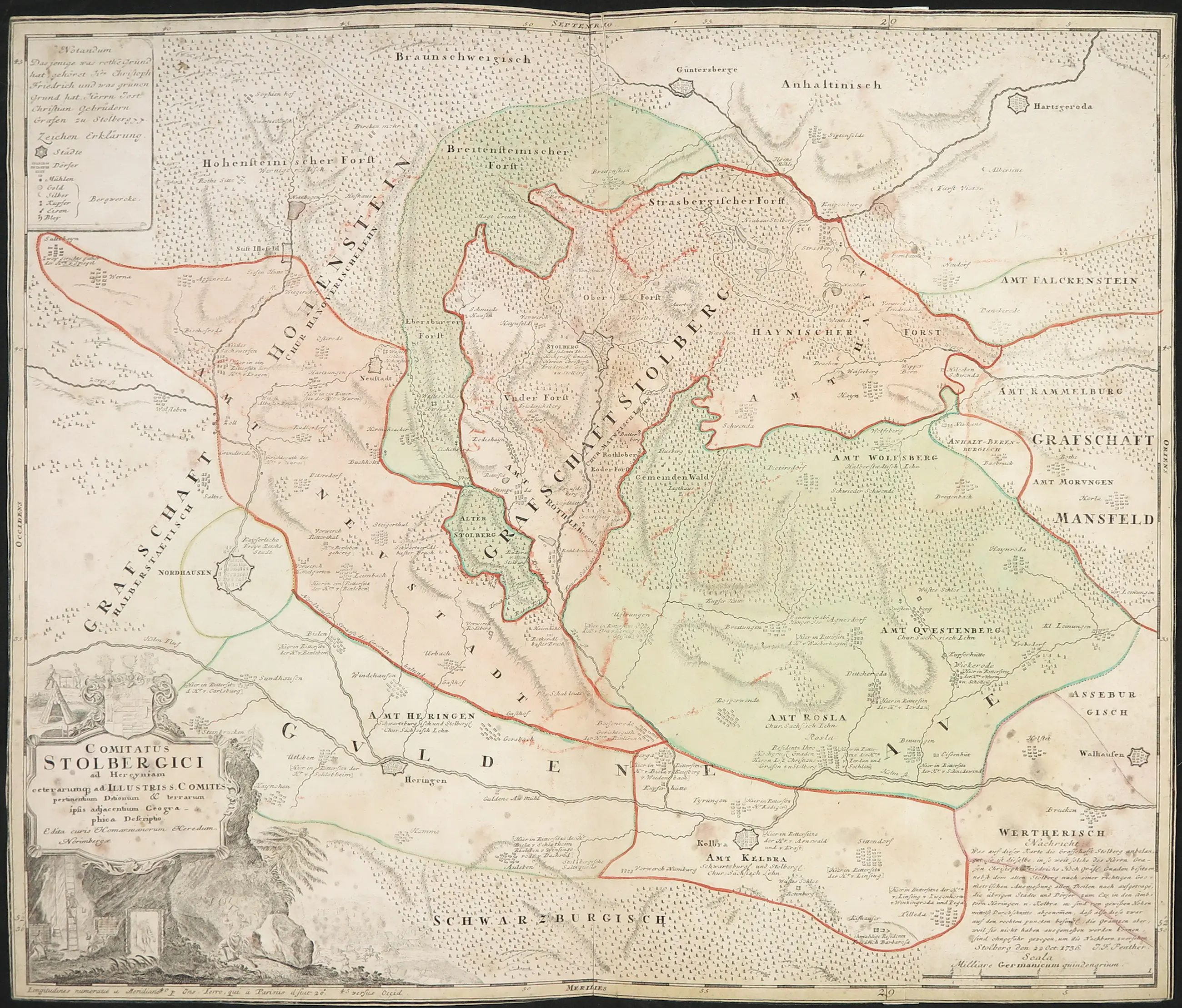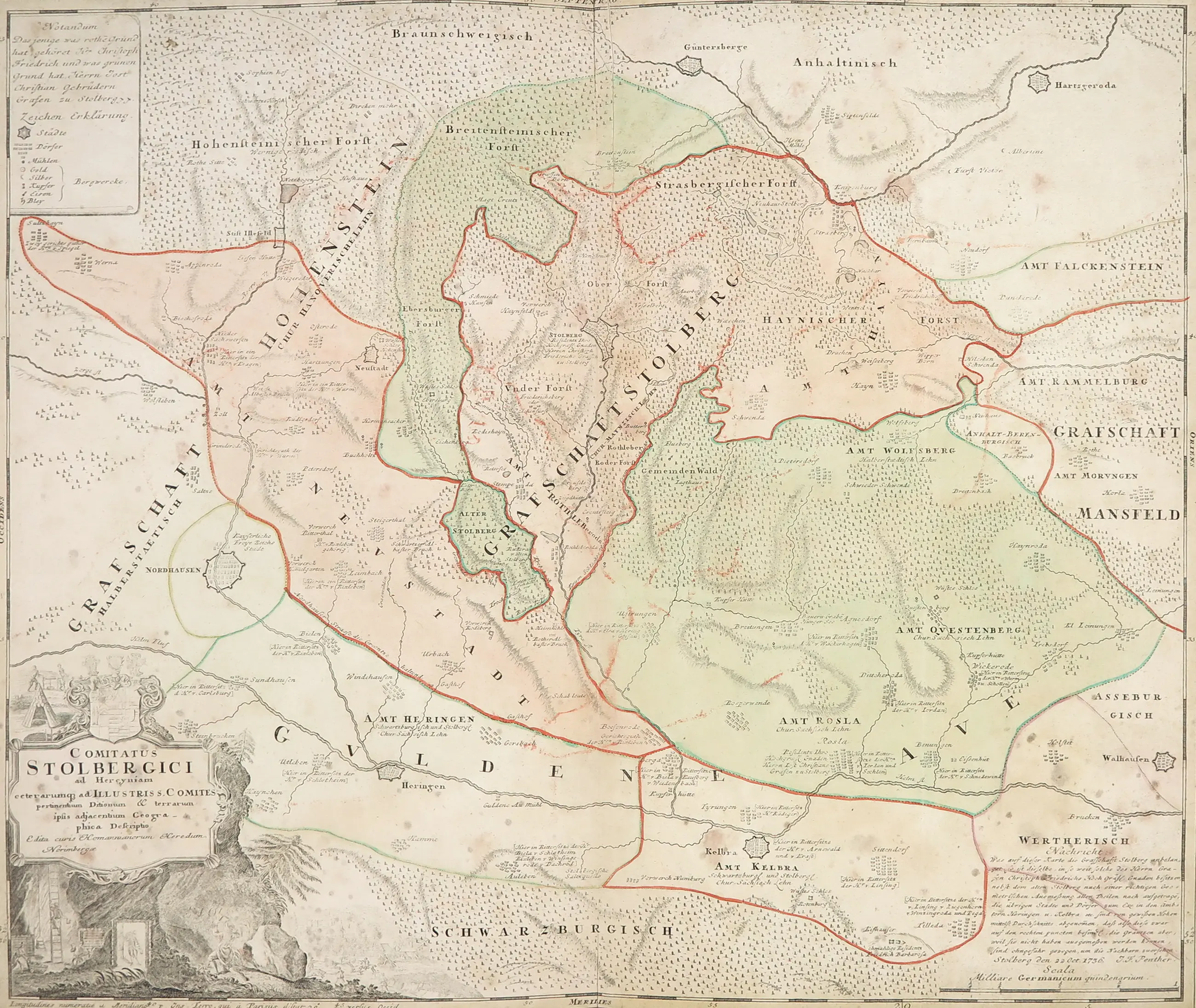 Handgekleurde kopergravure uit 1753: Comitatus Stolbergici ad Hercyniam ceterarumq ad Illustris s.Comites
