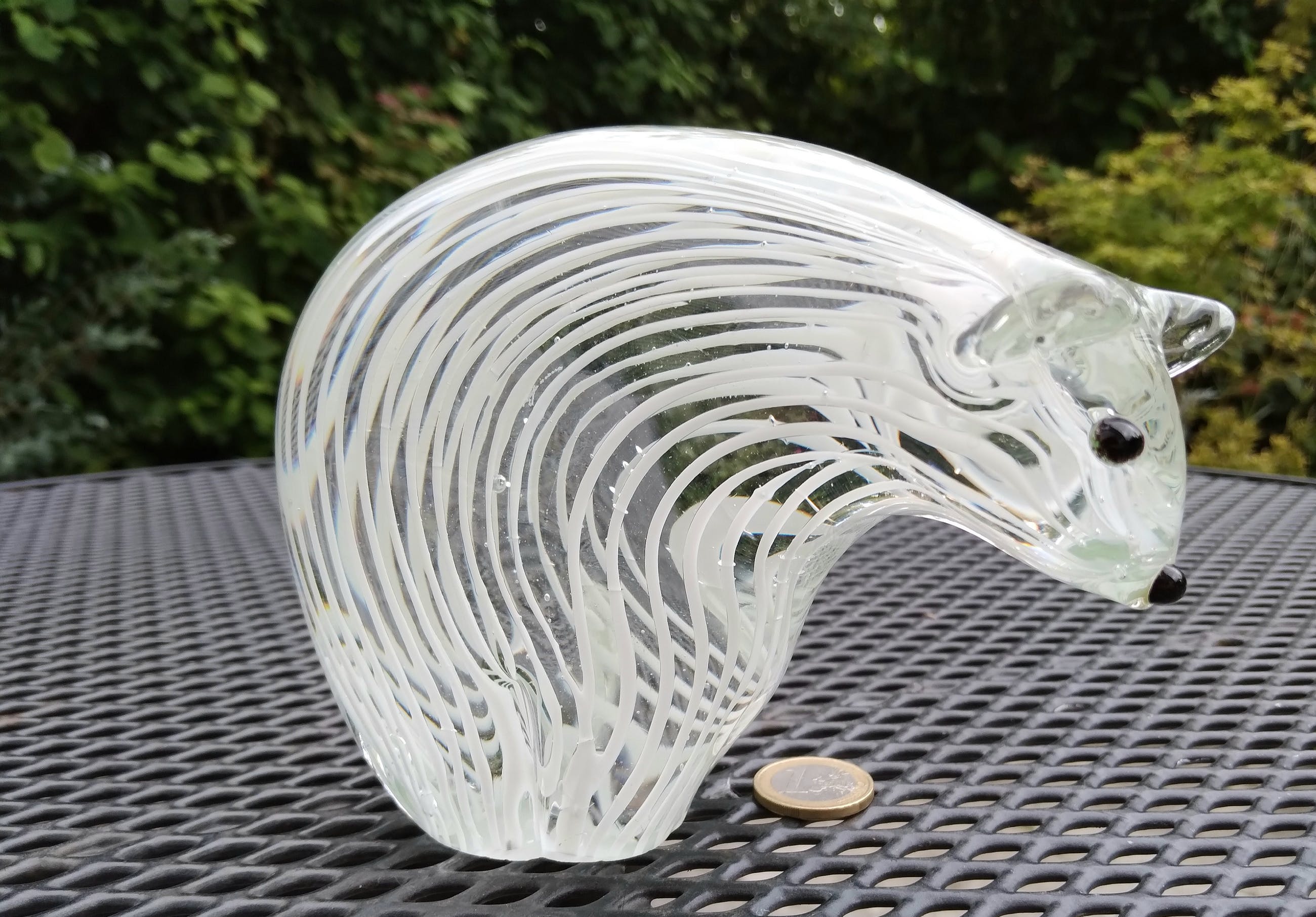Witte lijnen in transparant glas vangen het licht op verschillende manieren, afhankelijk van hoe het licht valt. Bruin/zwarte ogen en neus. Leuke details, zoals het kleine staartje.