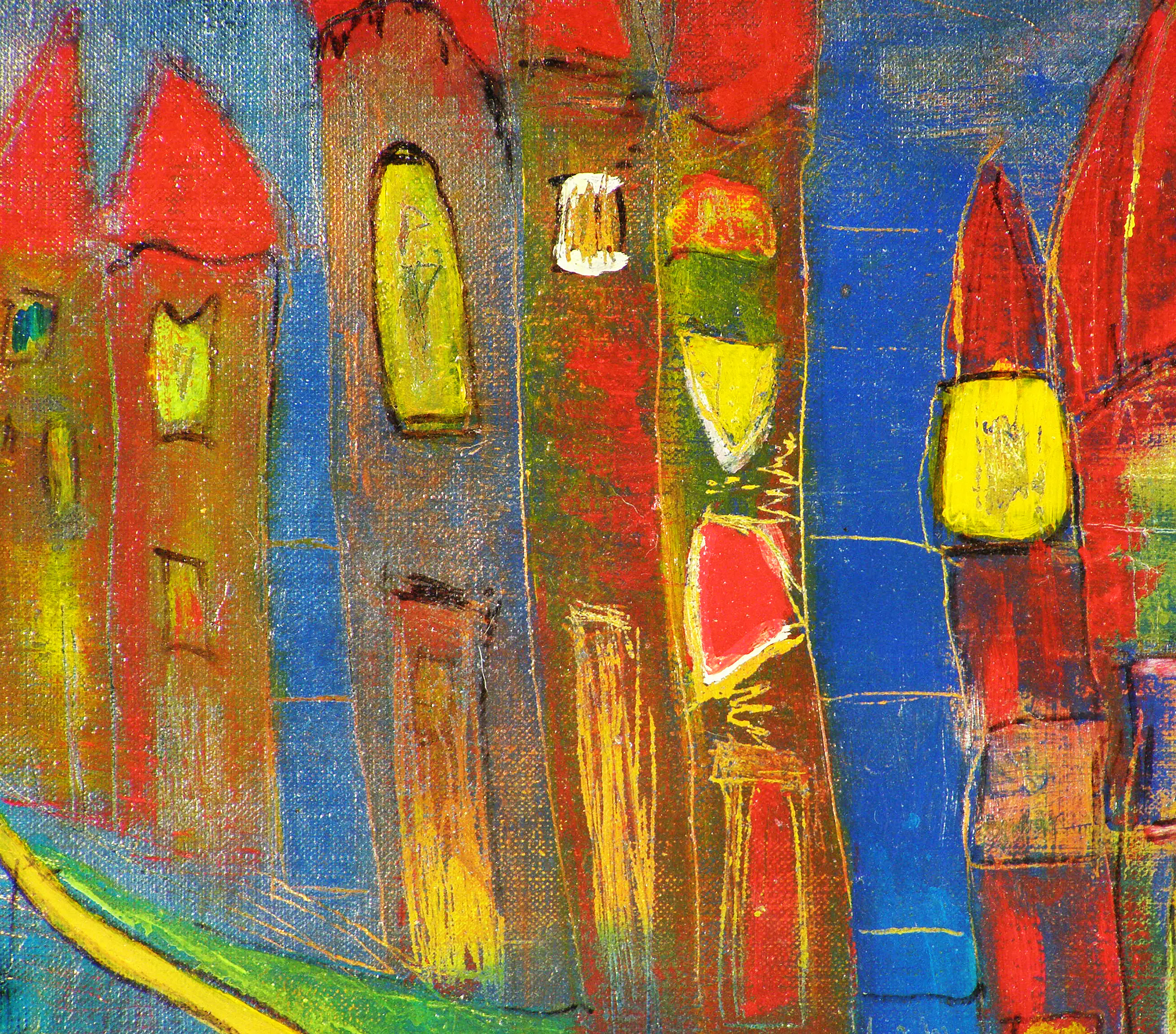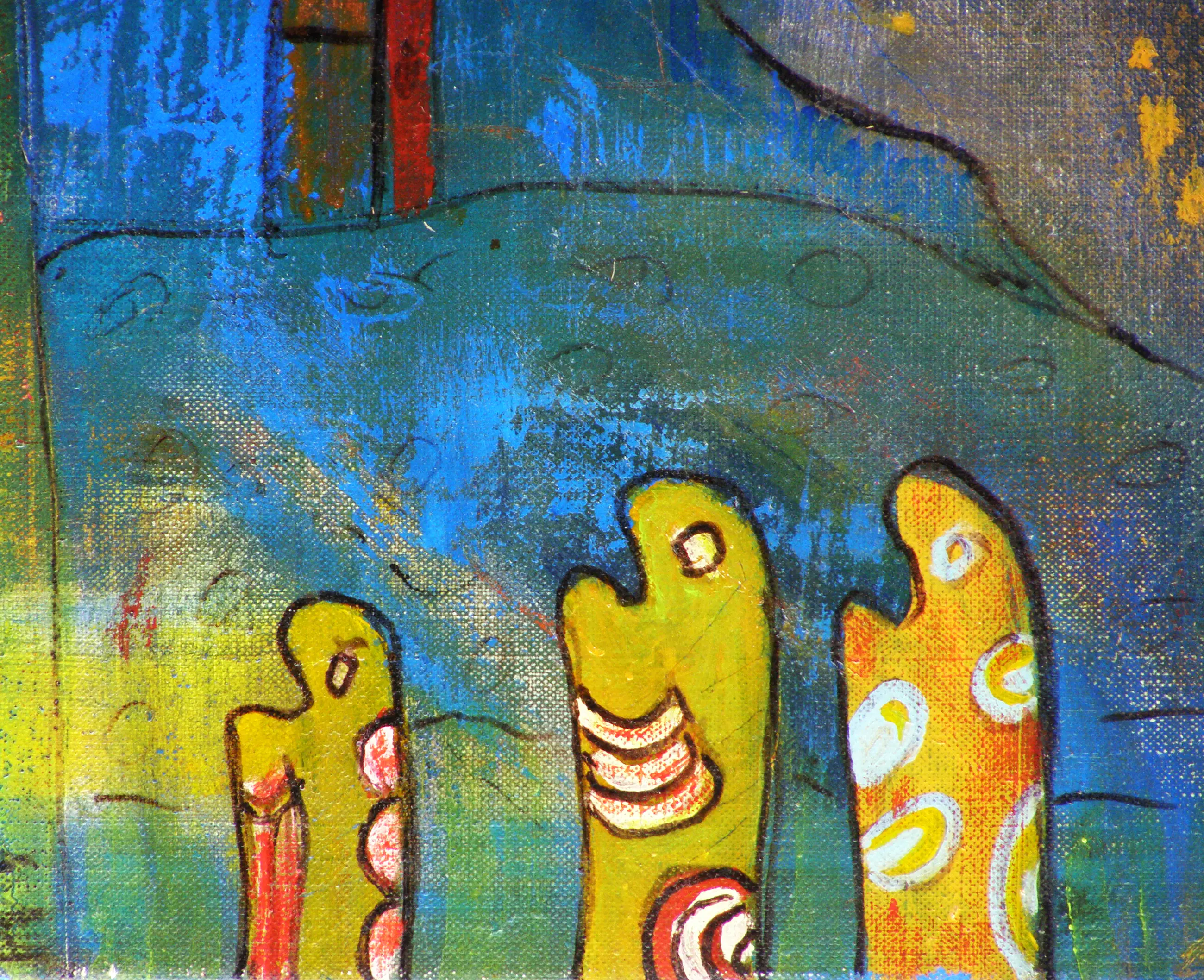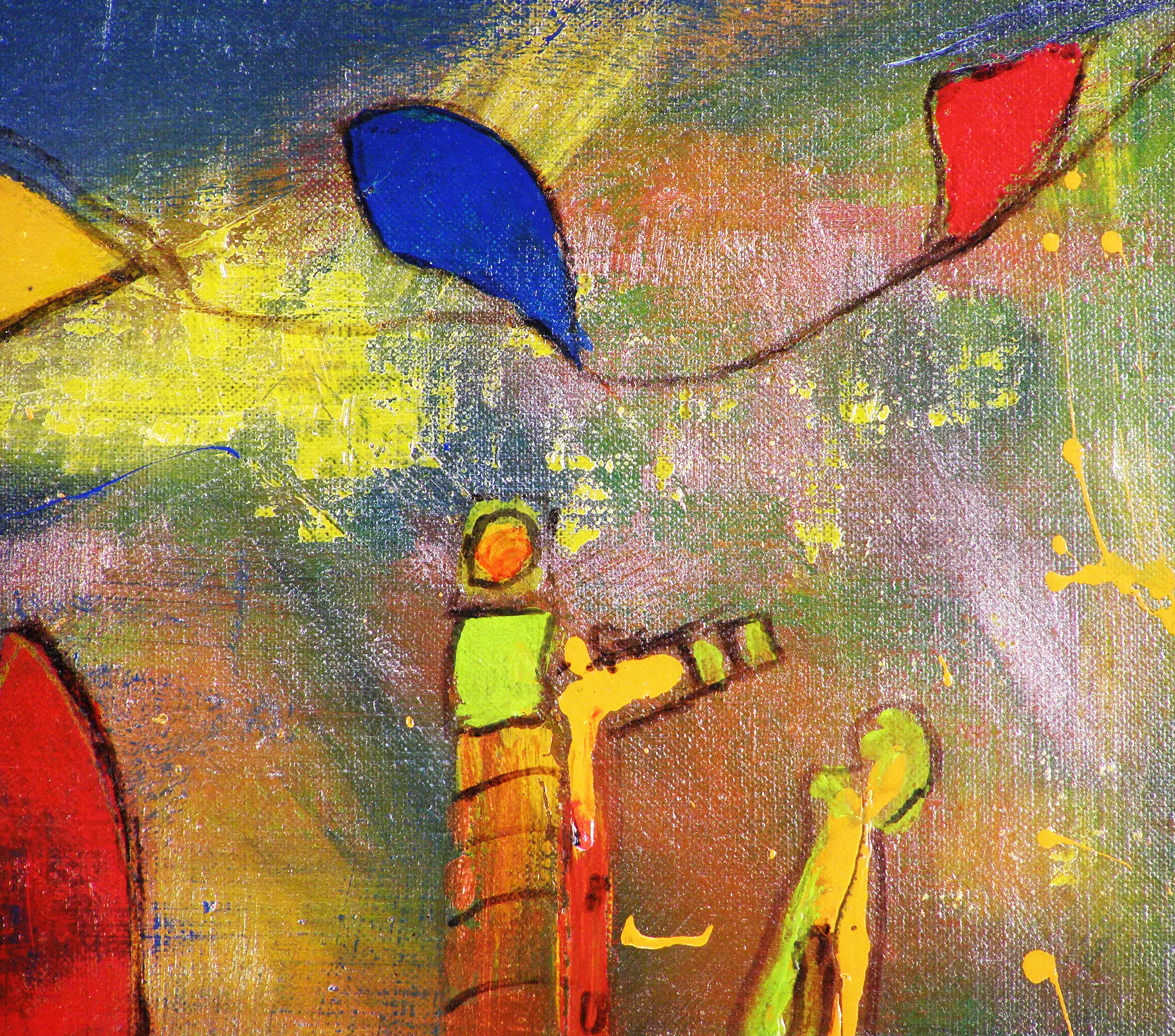 Vrolijke illustratieve afbeelding, ets met inkt, acryl en gouache, gemengde techniek.