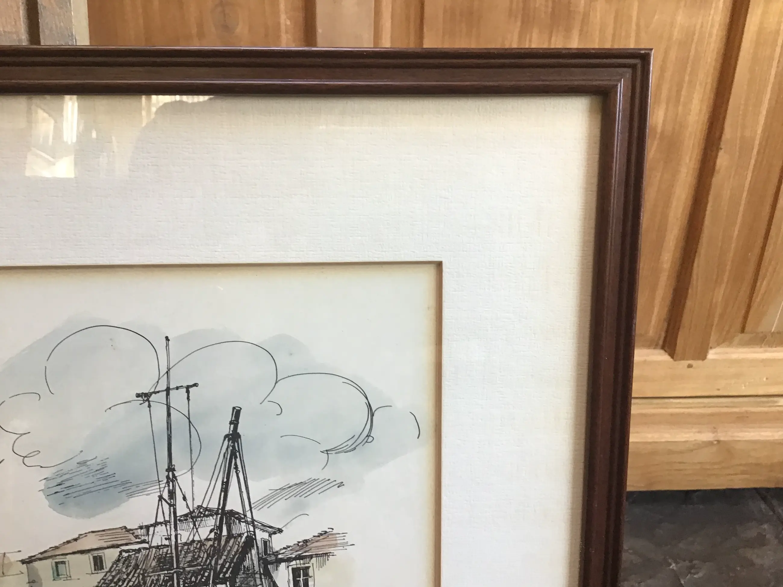 Ingekleurde pentekening/aquarel. Mooi gesigneerd met een ingedrukt papierstempel.