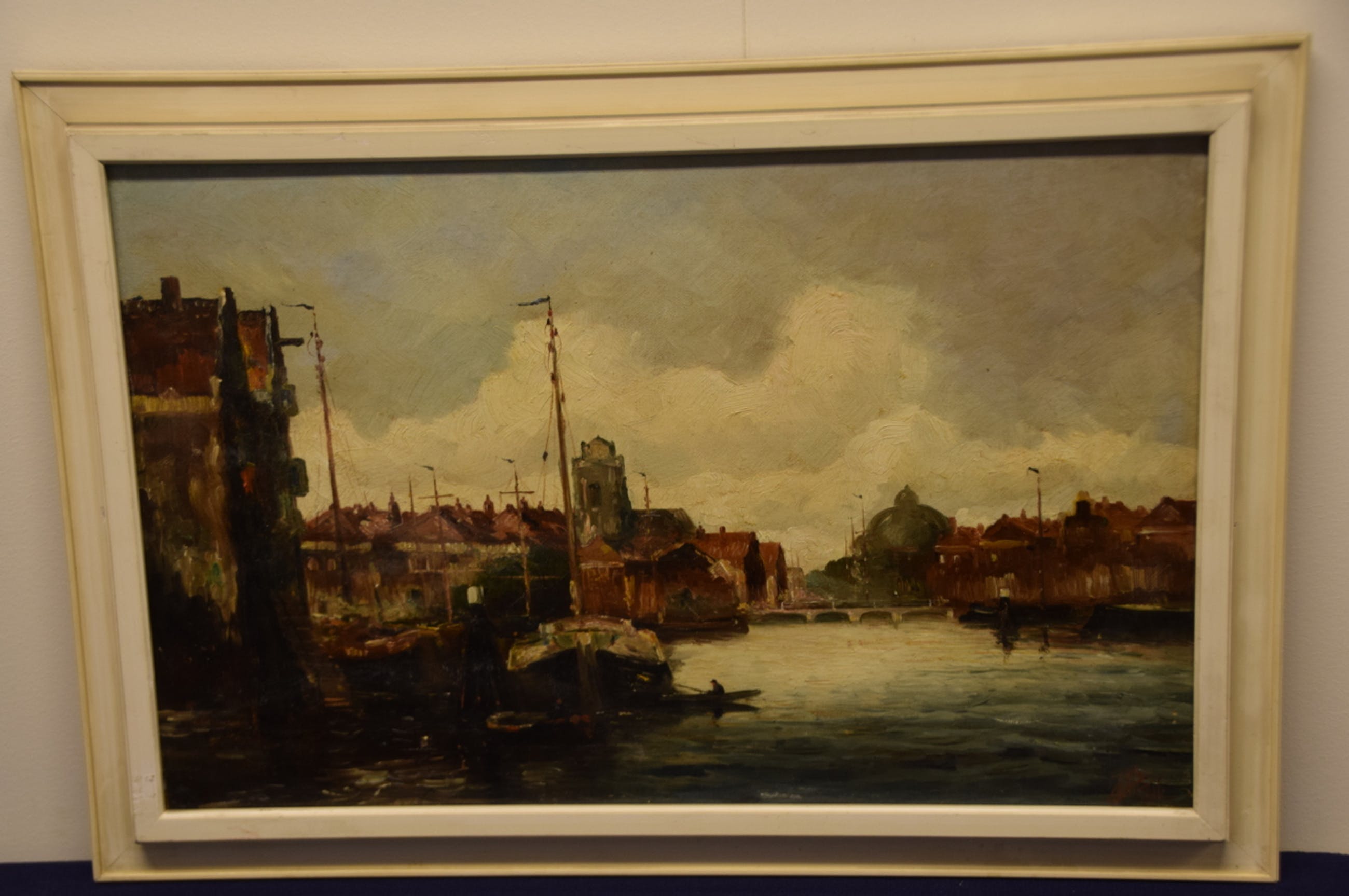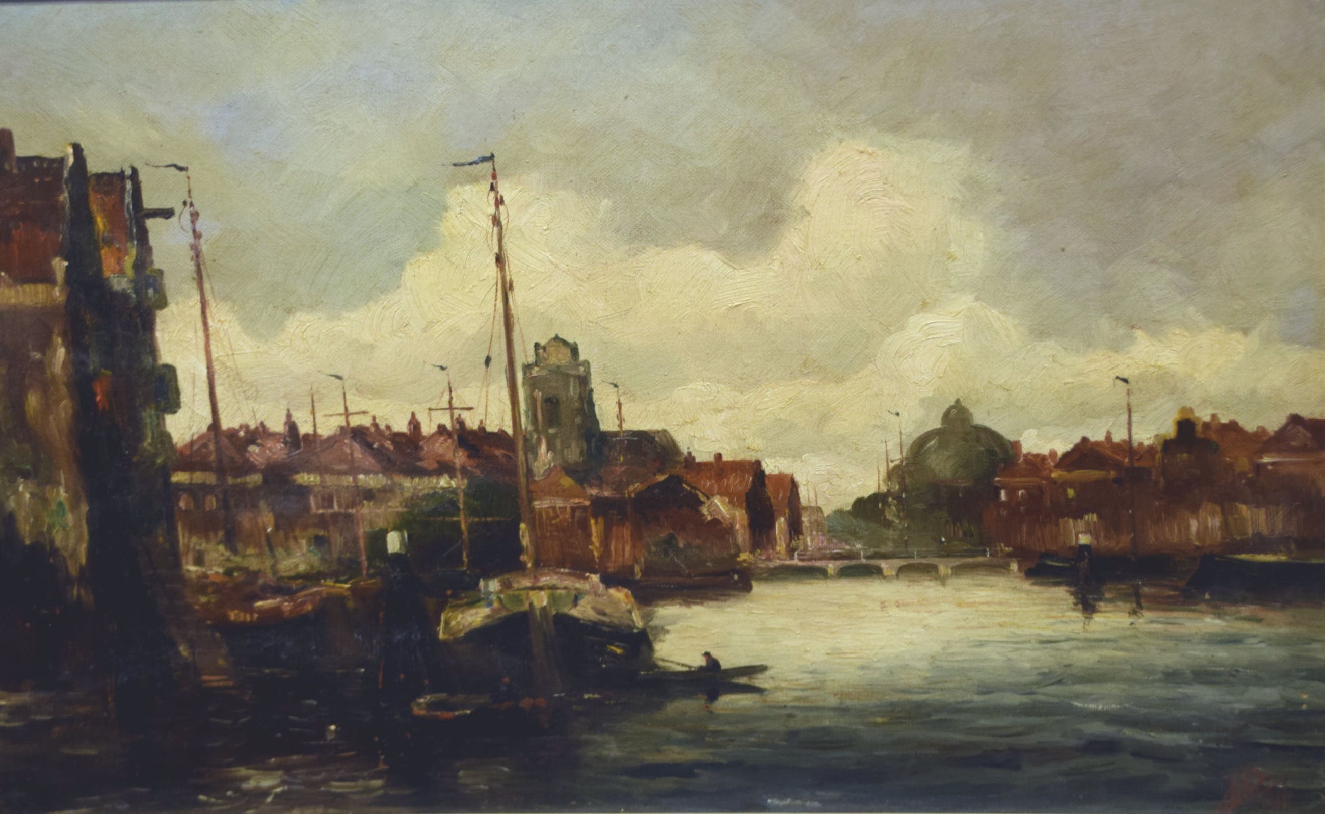 Opmerkingen: Vlot geschilderd havenzicht in impressionistische stijl met heldere toets. Gemonogrammeerd 'J.B.', deze valt echter niet eenduidig naar een specifieke kunstenaar te herleiden. Op de achterzijde zijn enkele onduidelijke aantekeningen in potlood te vinden, alsook een label van kunsthandel Wiebes te Amsterdam. Ingelijst in een goed passende houten lijst.