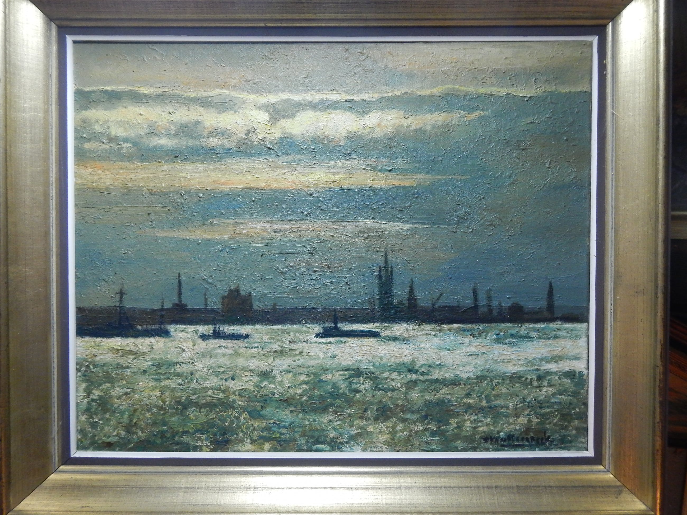 Havengezicht bij zonsondergang door slecht leesbare meester