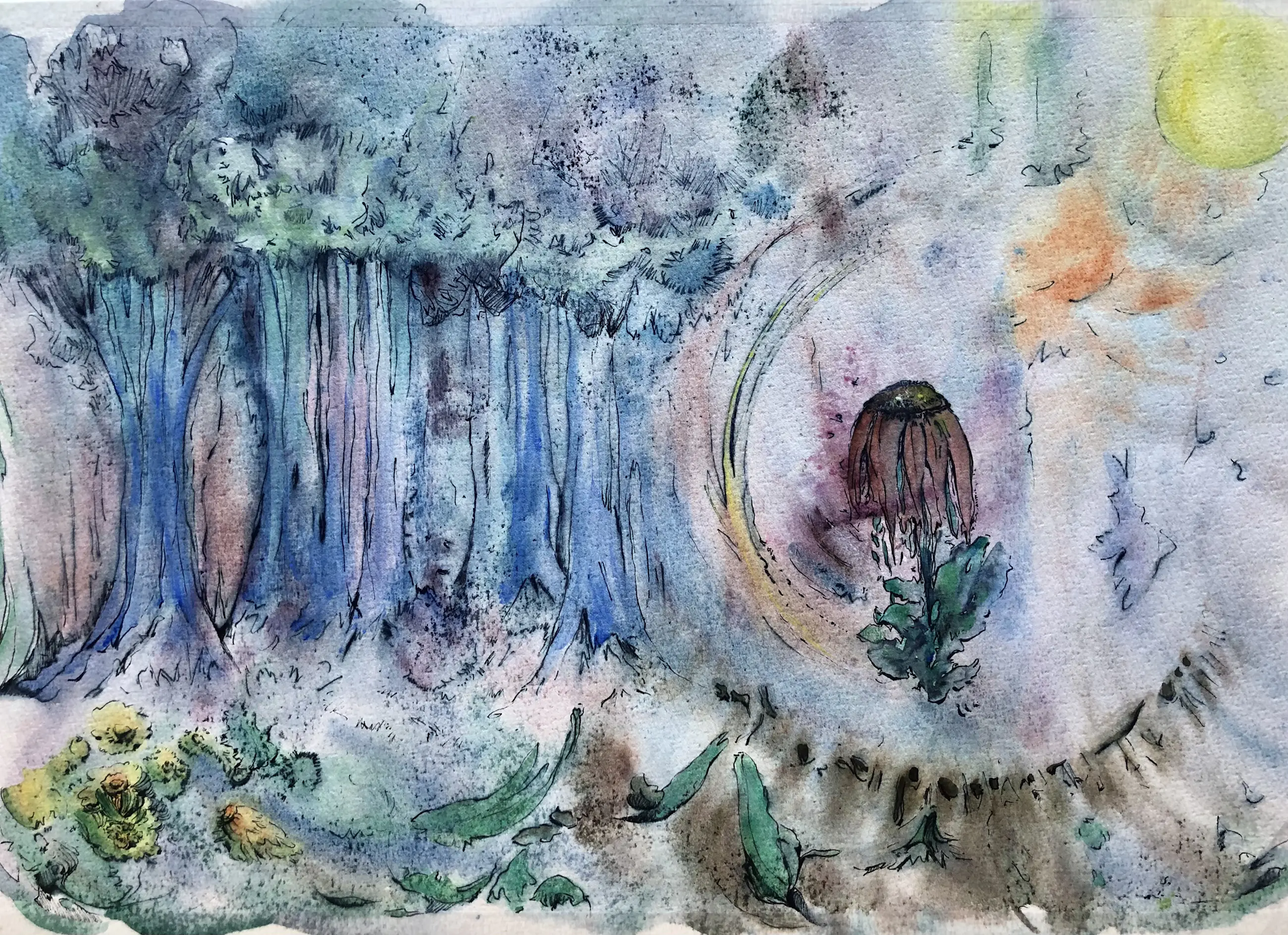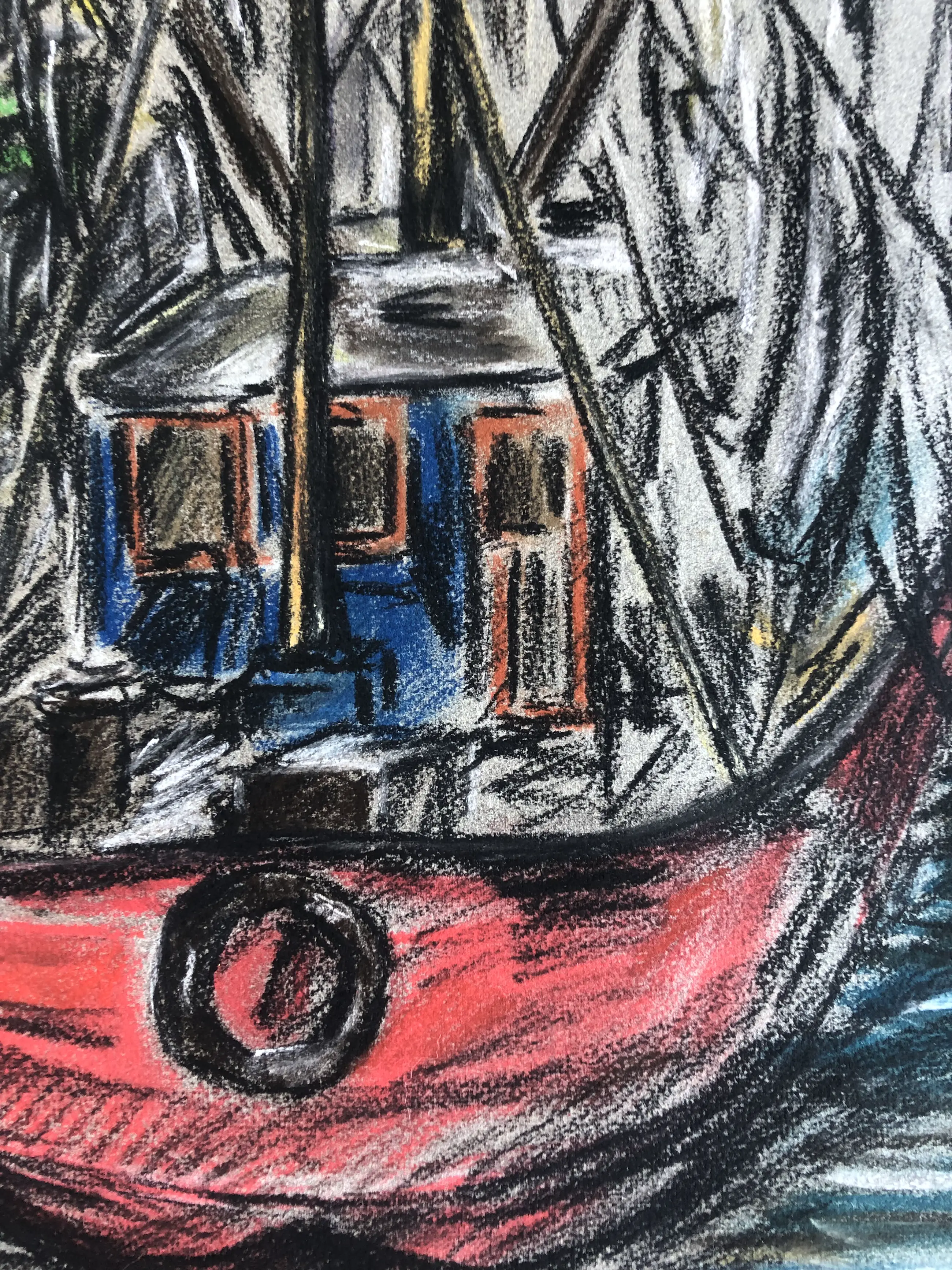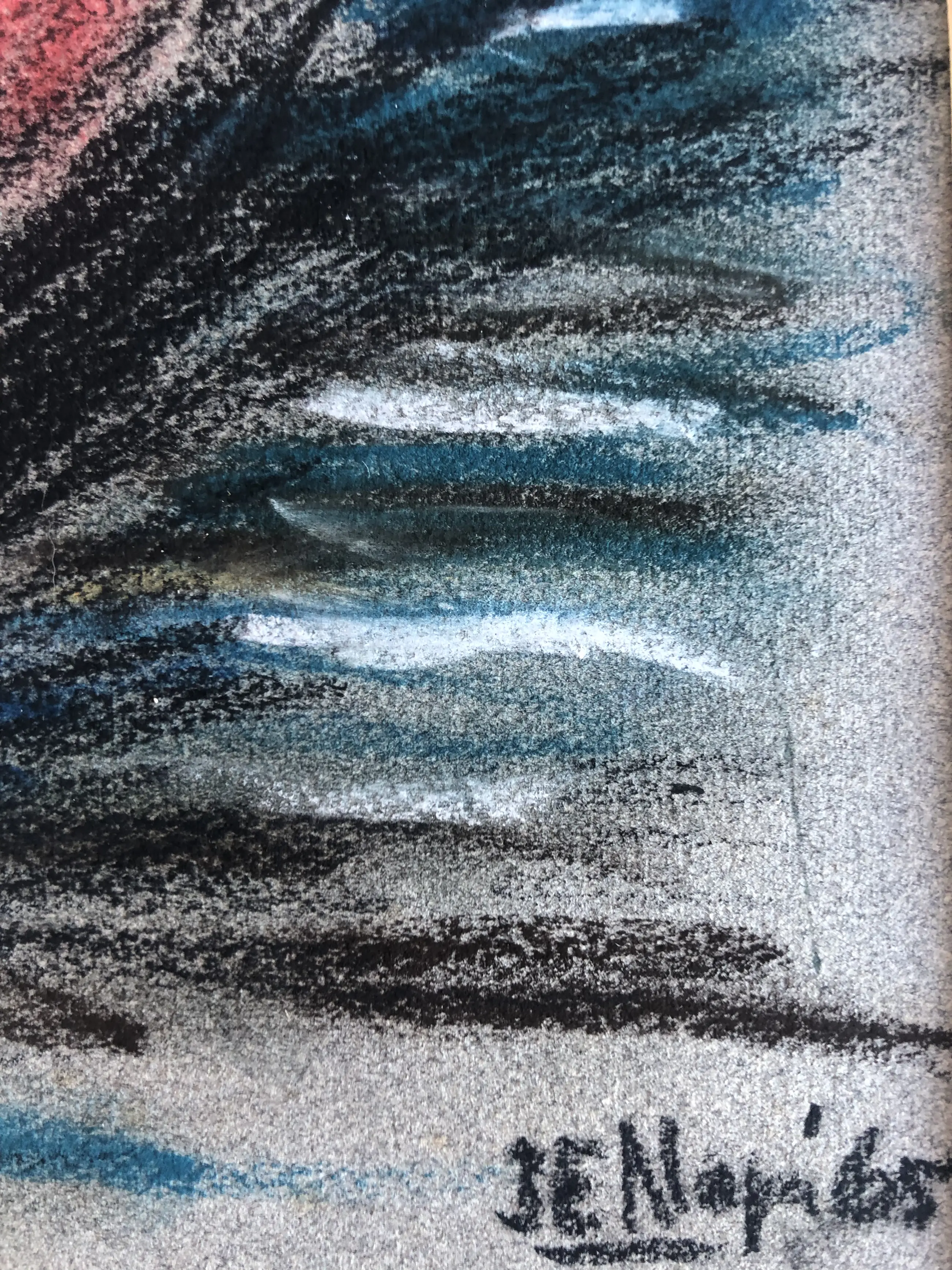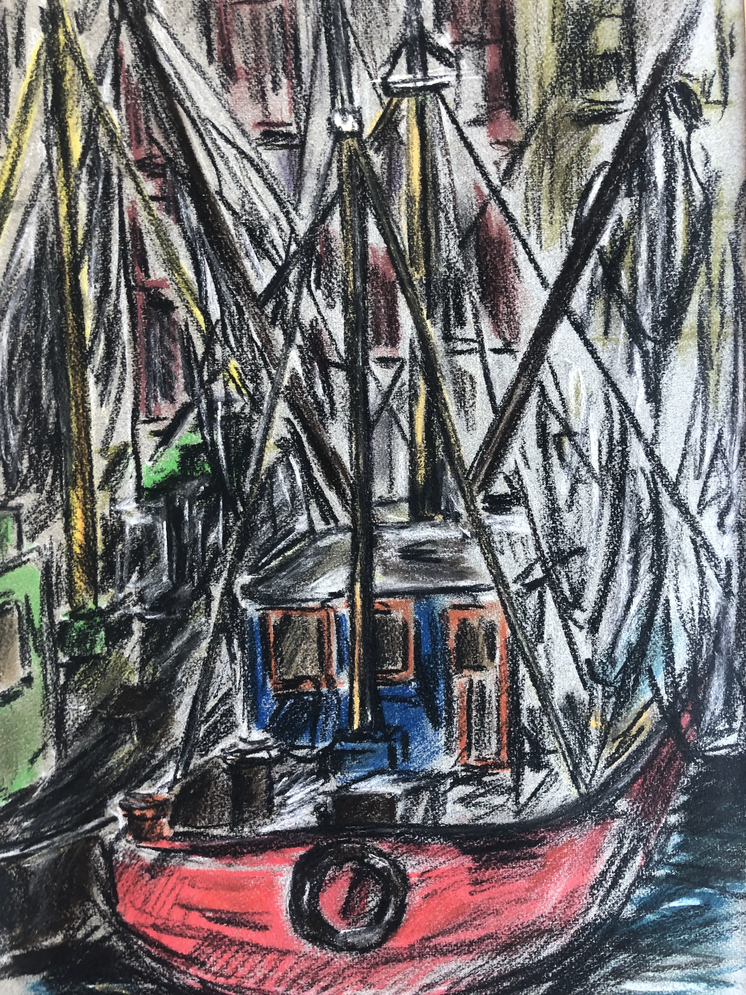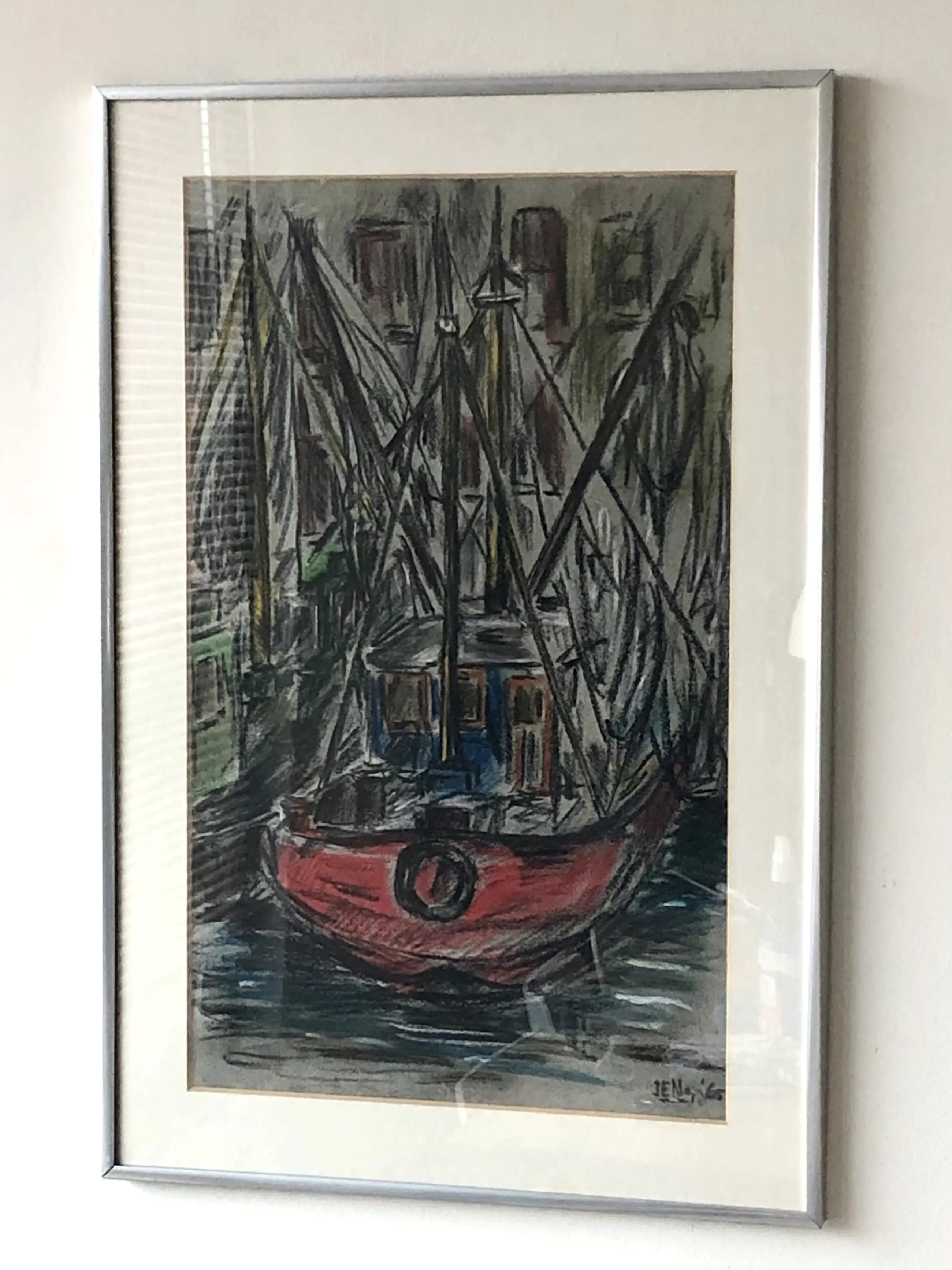 Prachtig kleurig expressionistisch havengezicht van een ons onbekende meester. Het werk is gevat in een nette lijst en passe-partout. Verso een mysterieus landschap in aquarel, zie laatste foto.