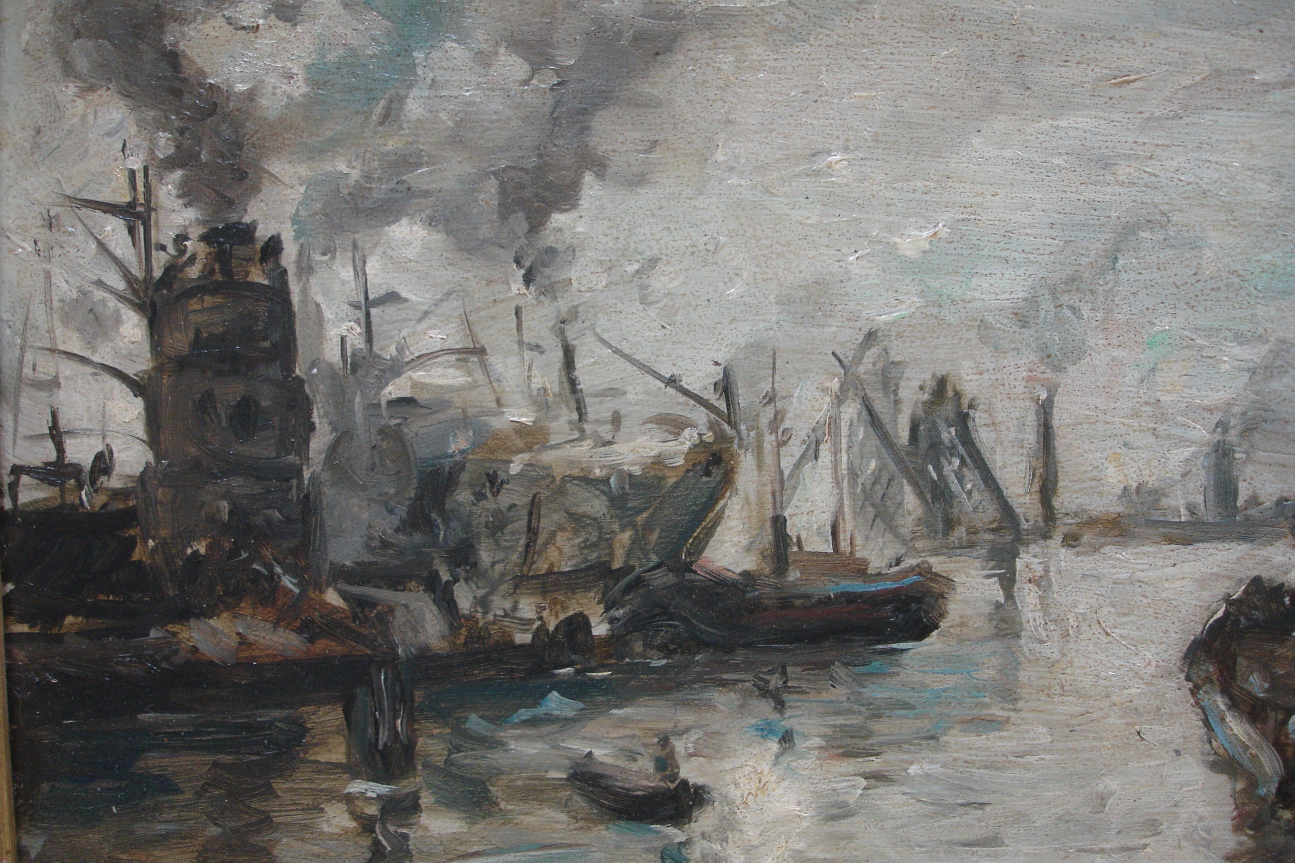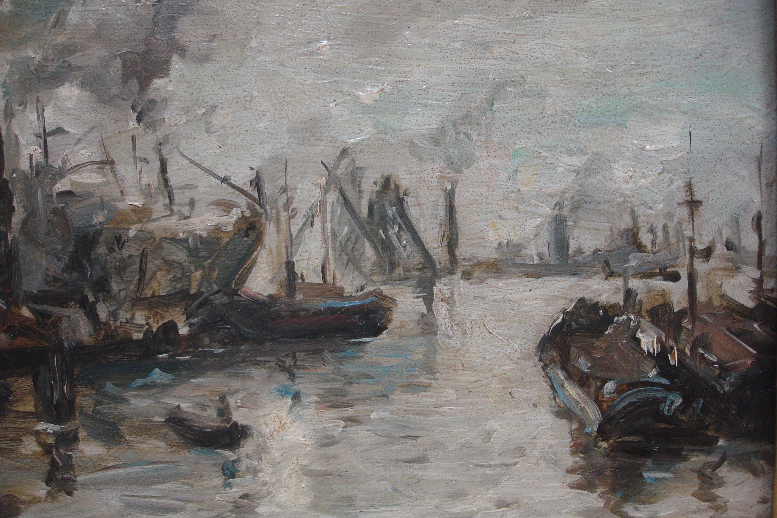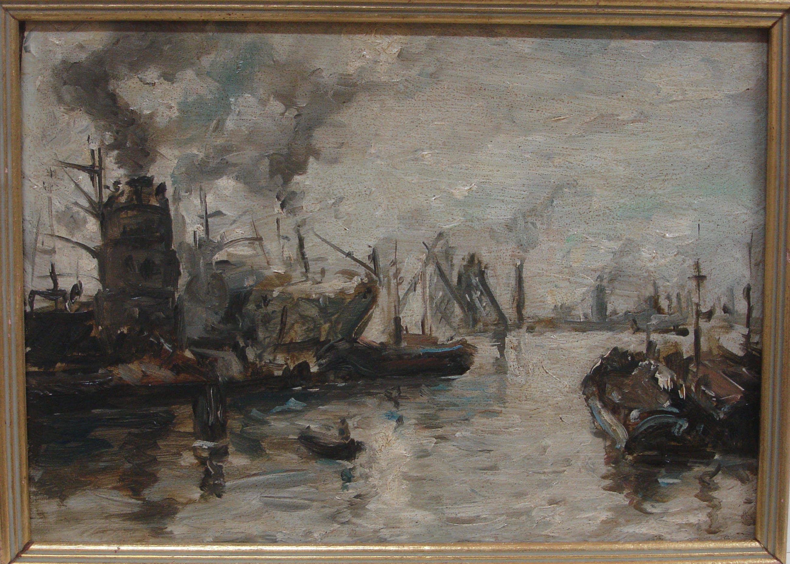 Een prachtig impressionistisch havengezicht van Rotterdam.Olieverf op doek op board.Er zit een simpele lijst om.Onbekende kunstenaar.