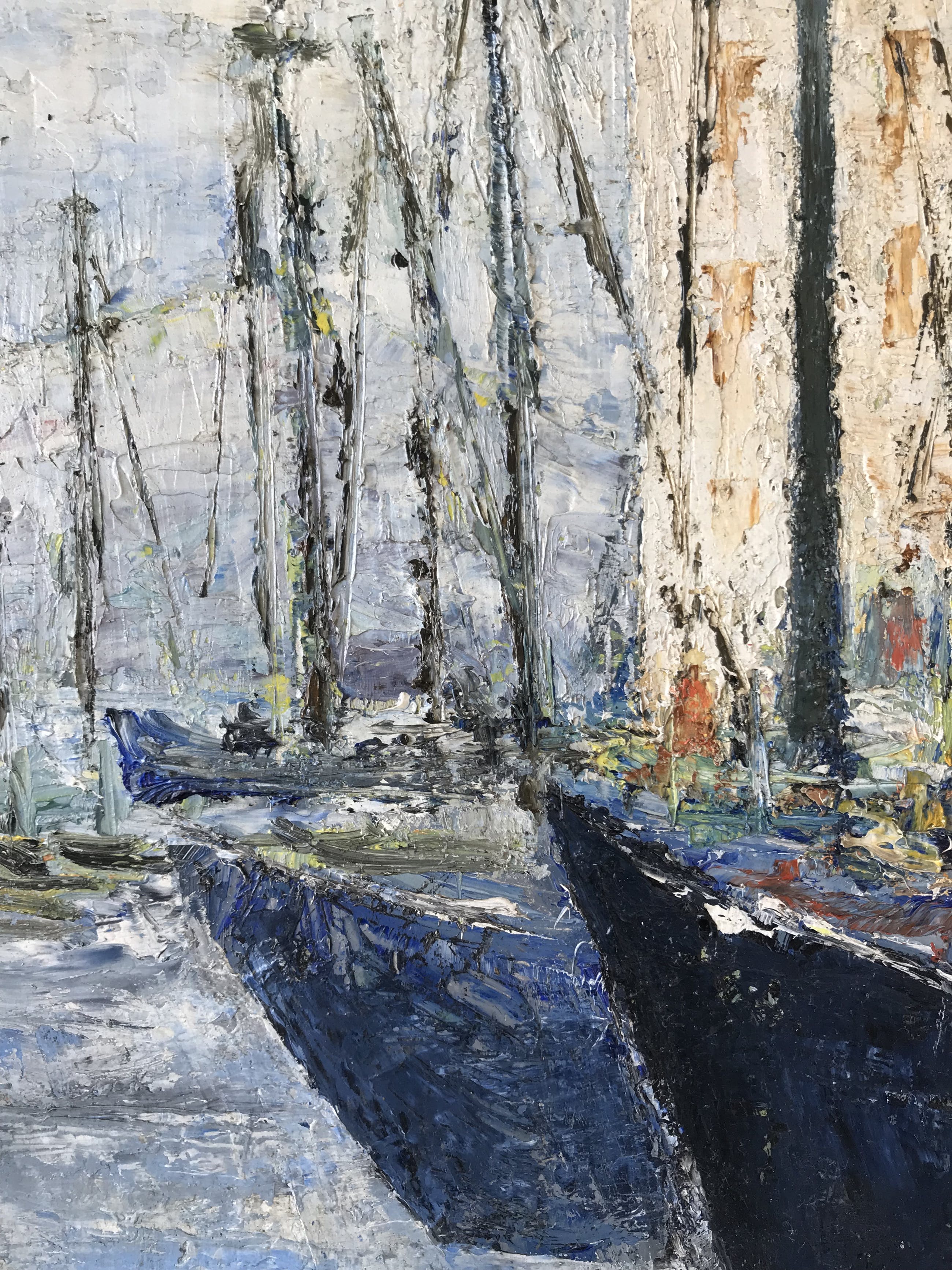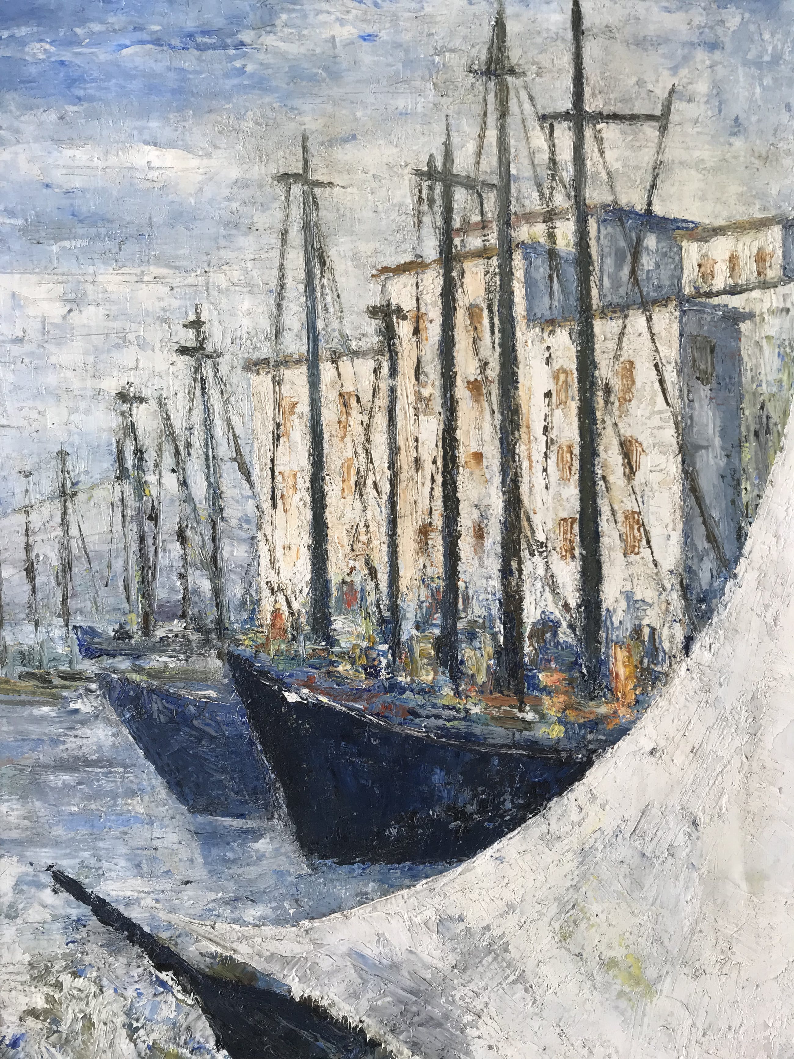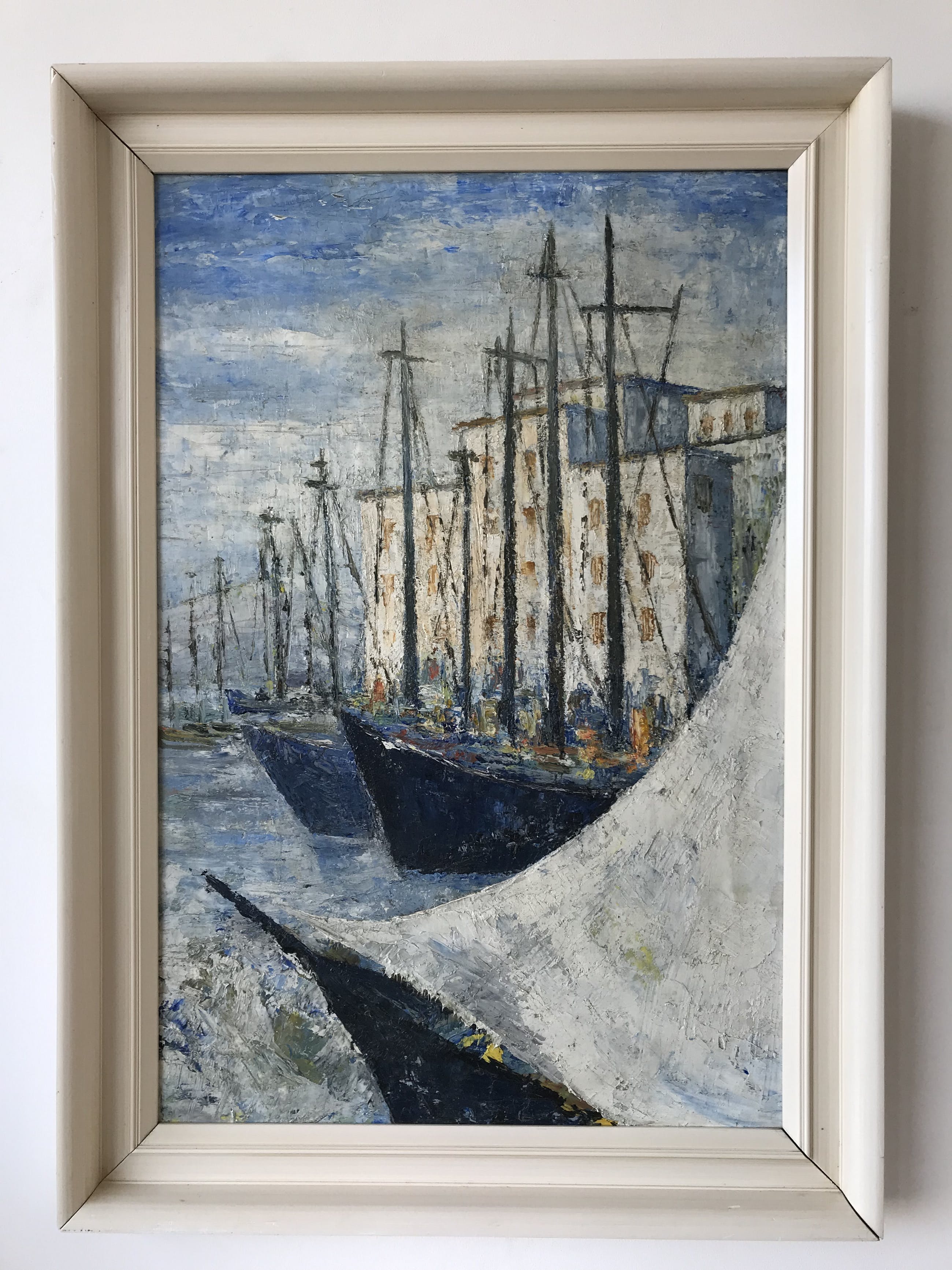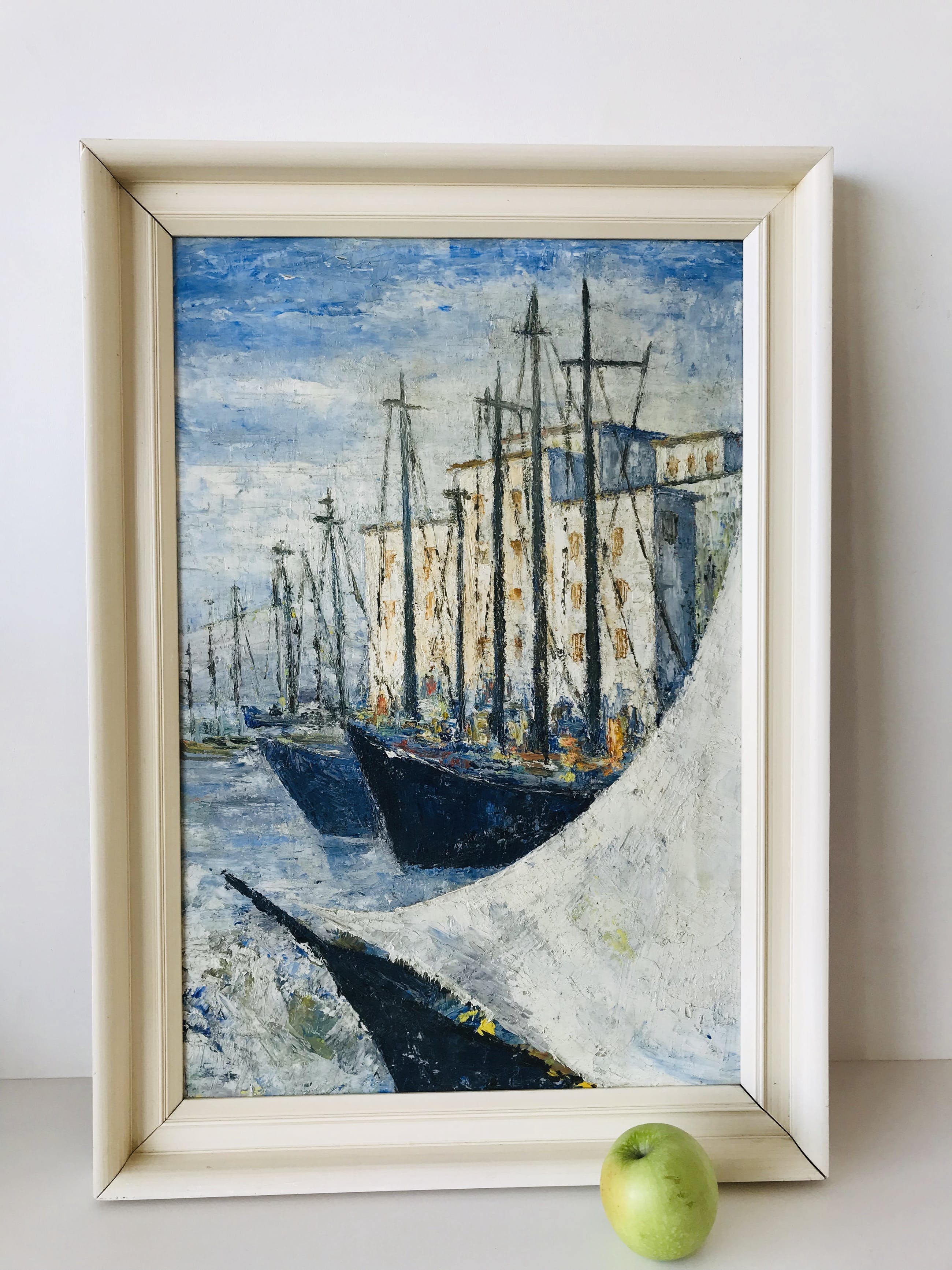 Vakkundig geschilderd olieverfschilderij van een (ons) onbekende haven. Dik in de verf en opgezet met kwast en paletmes. Het schilderij verkeerd in mint conditie, de lijst heeft voor perfectie wat aandacht nodig (zie foto's) Levering in overleg.