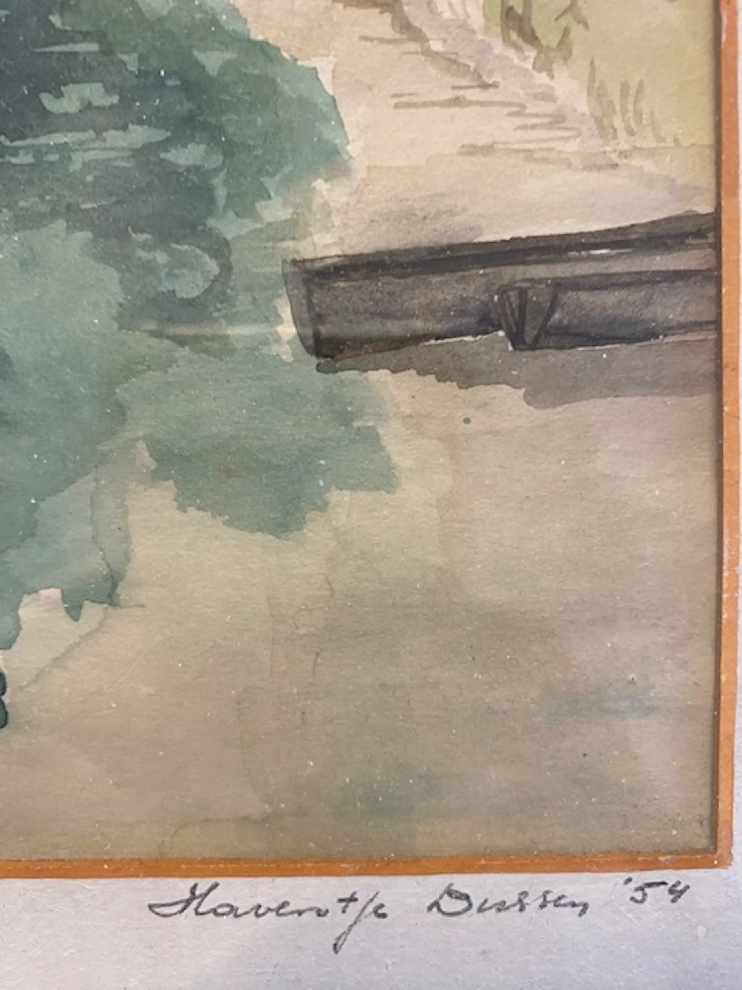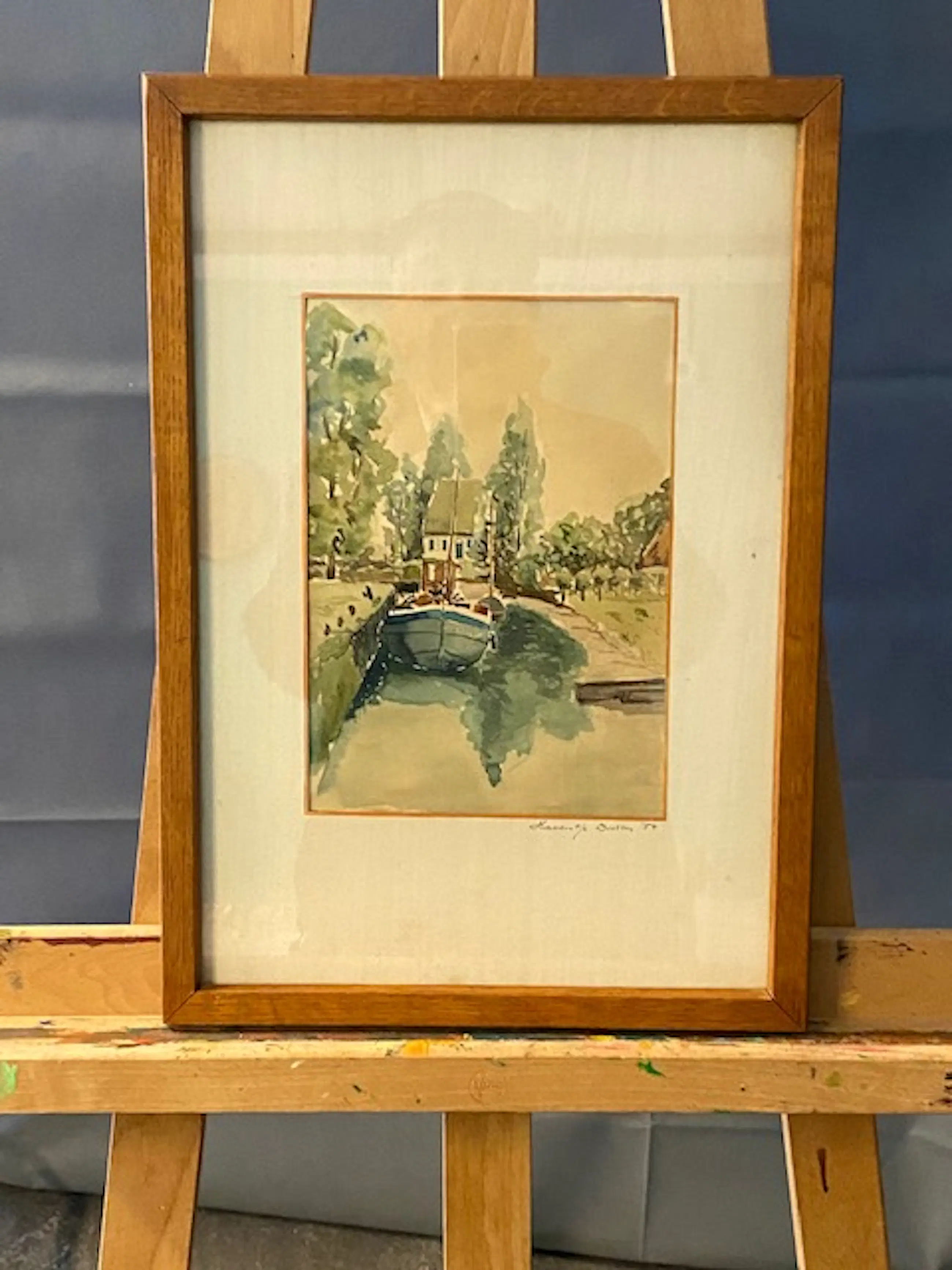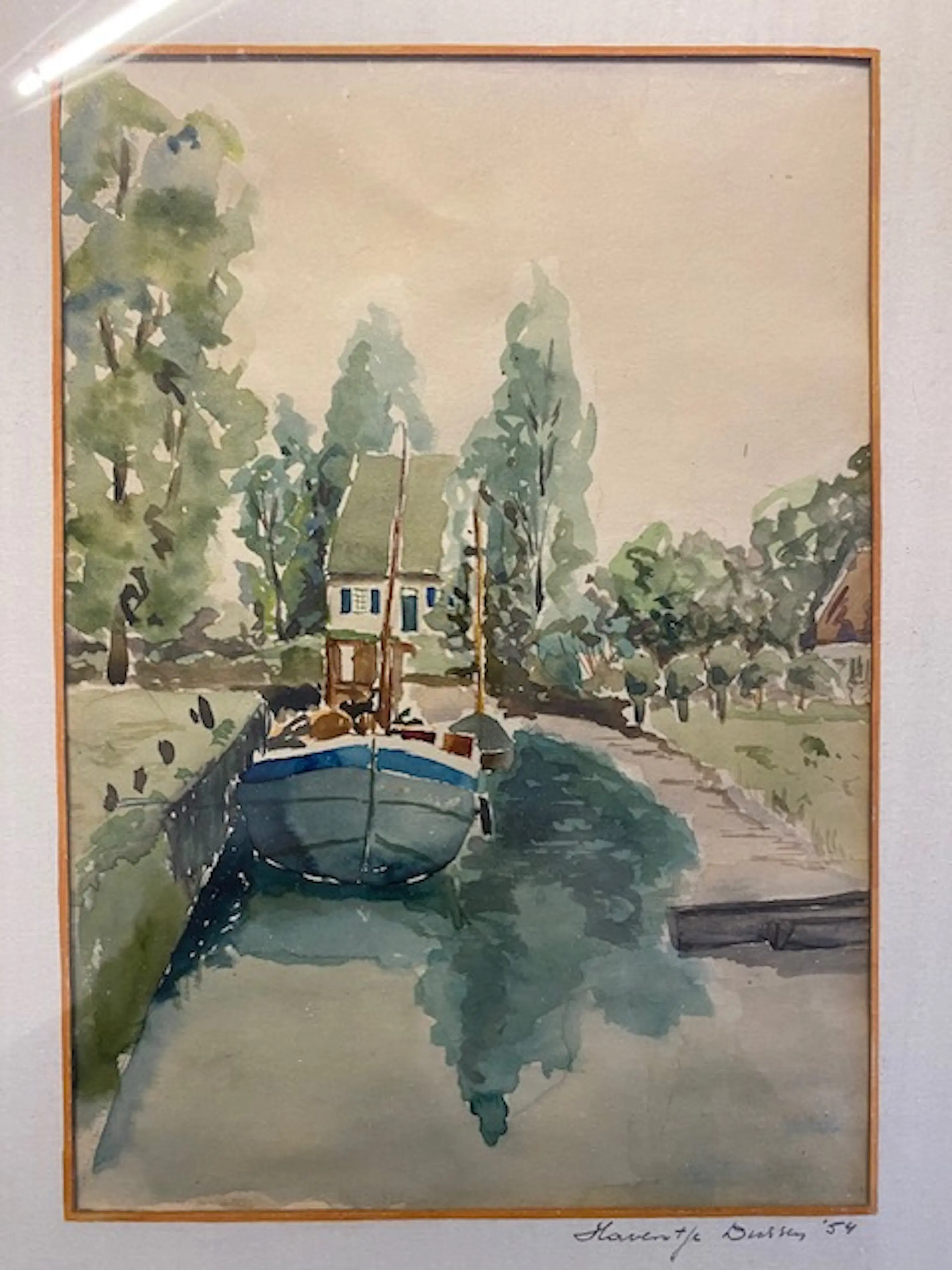 achter glas ingelijste aquarel (waarschijnlijk door Broer Akkermans) van het haventje in het Brabantse Dussen