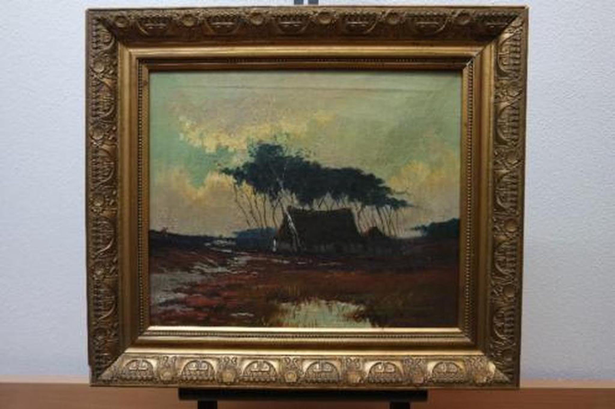 Een mooi heidelandschap met boerderij in een authentieke lijst. Olieverf op doek.