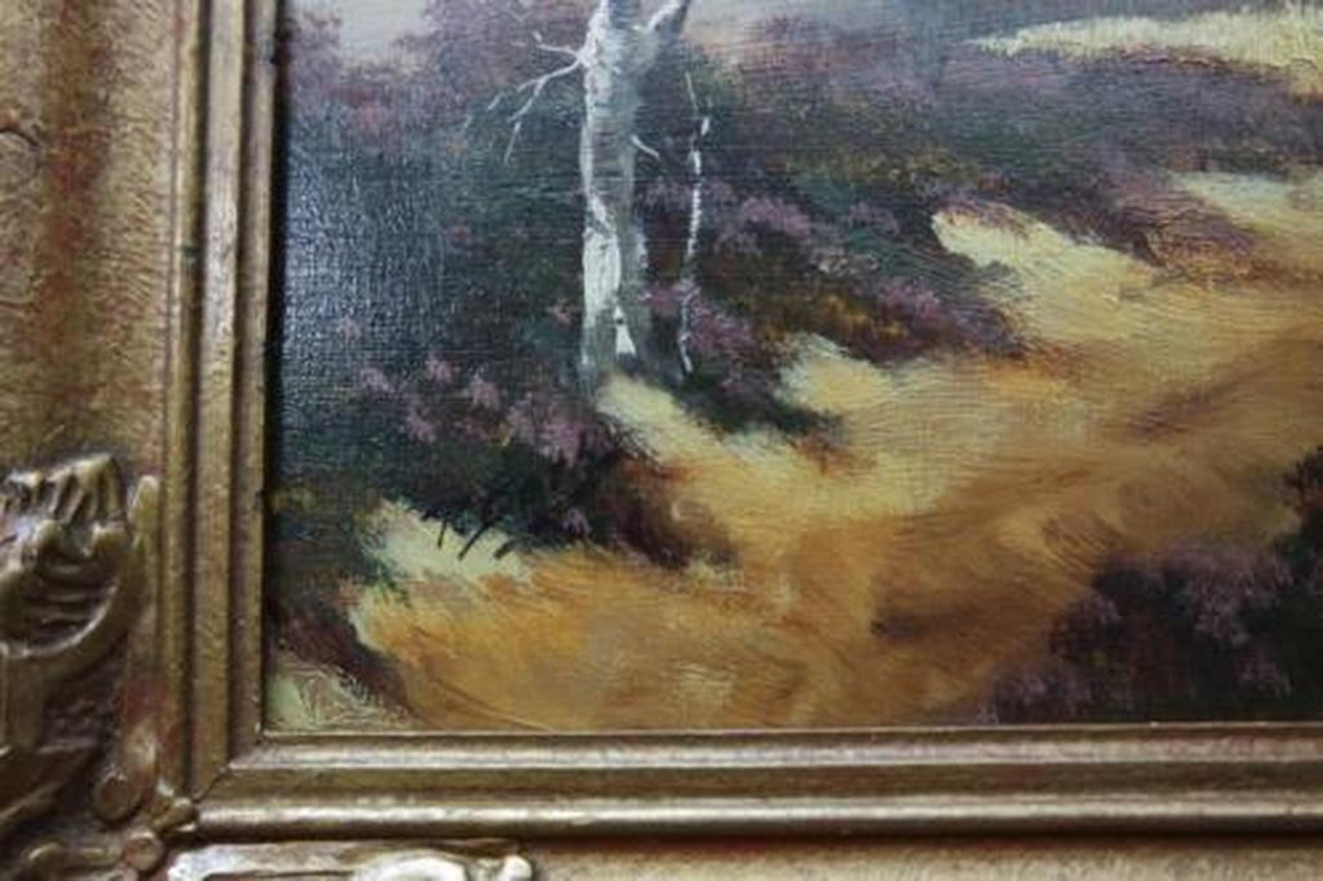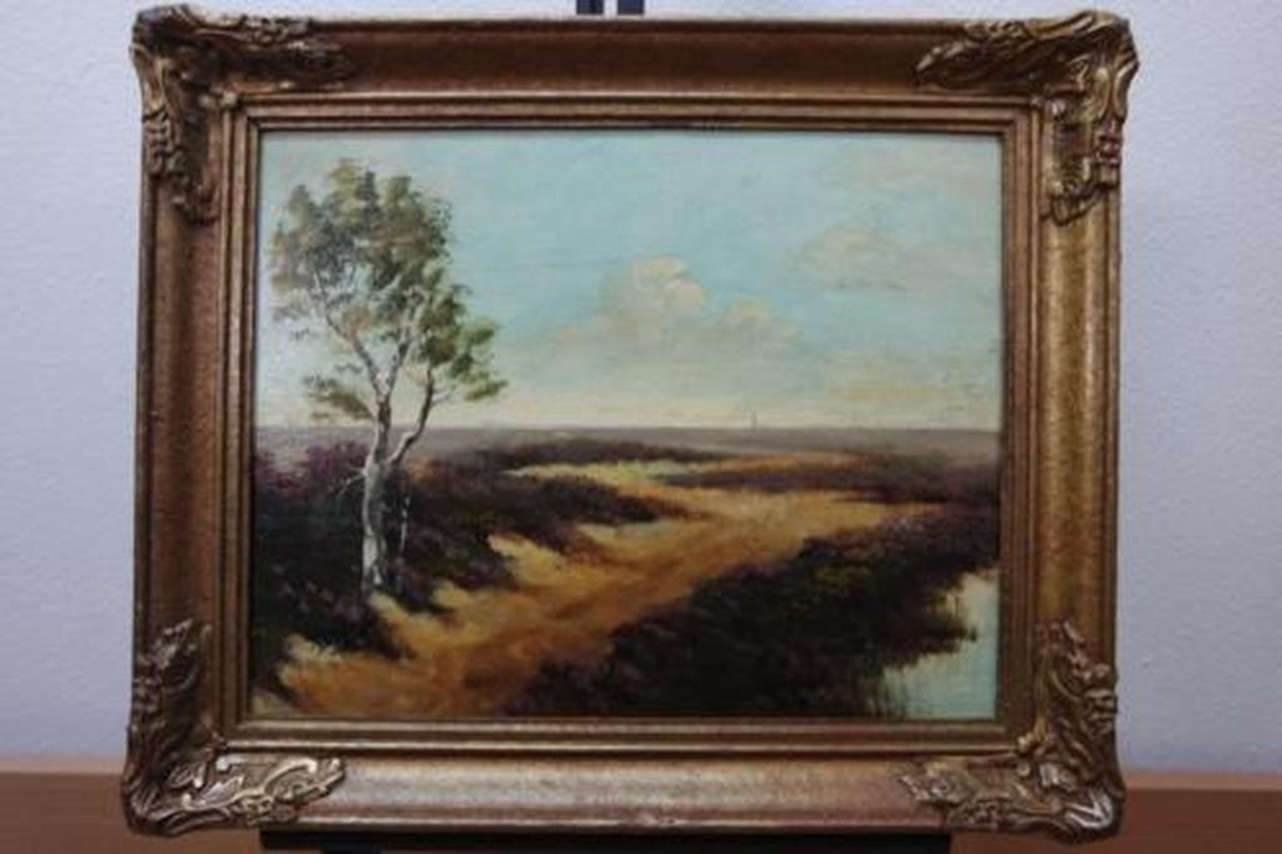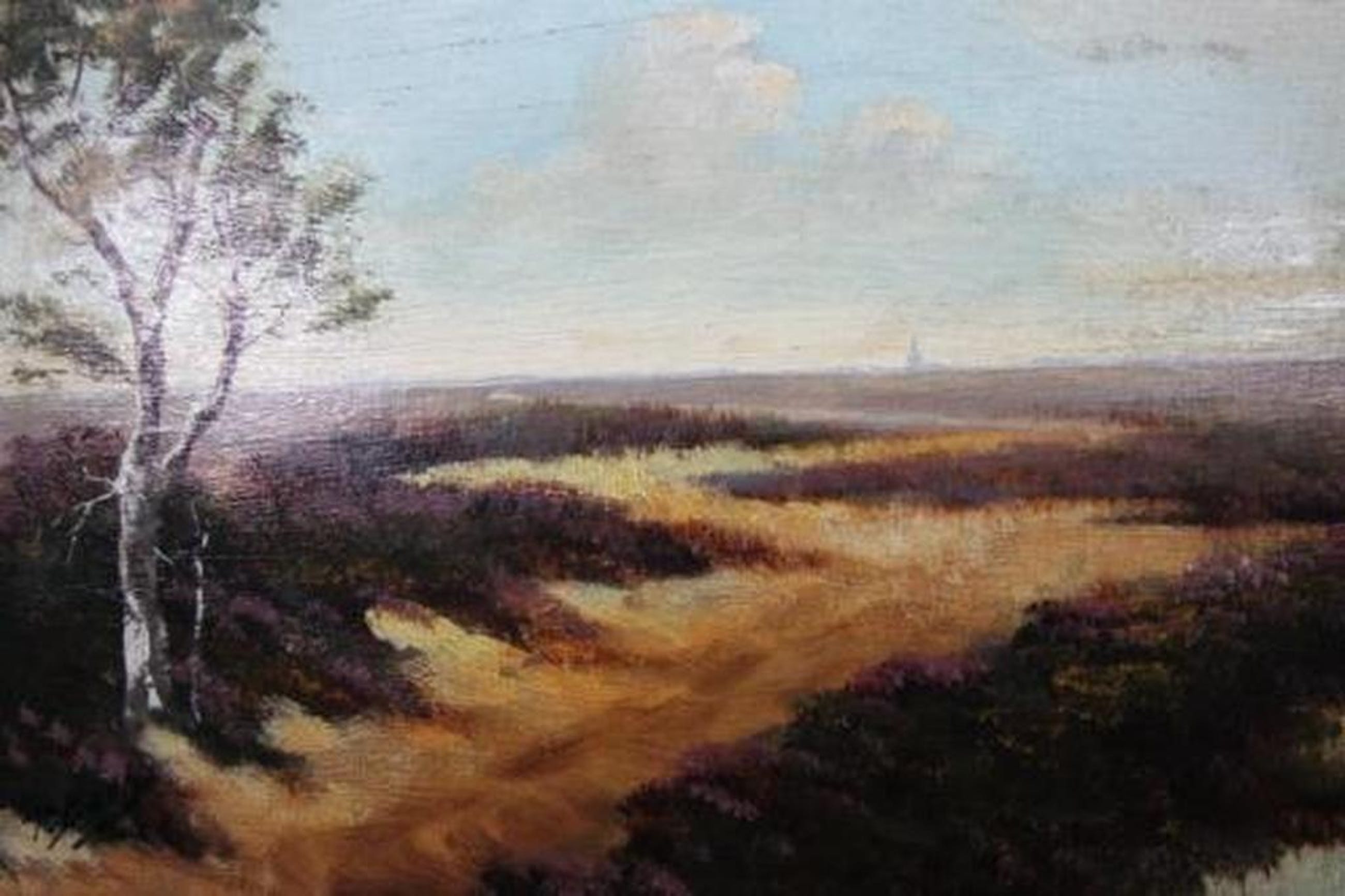 Een fraai heidelandschap (olieverf op paneel) van R. Both. Gesigneerd l.o.