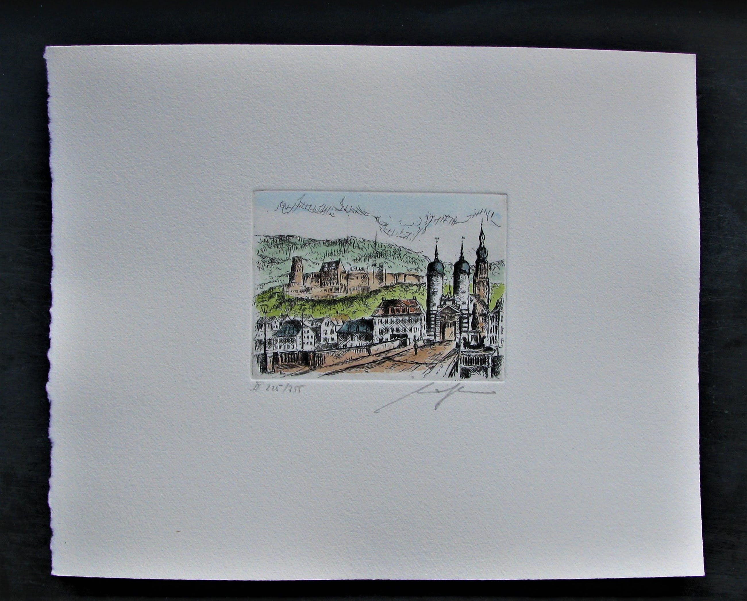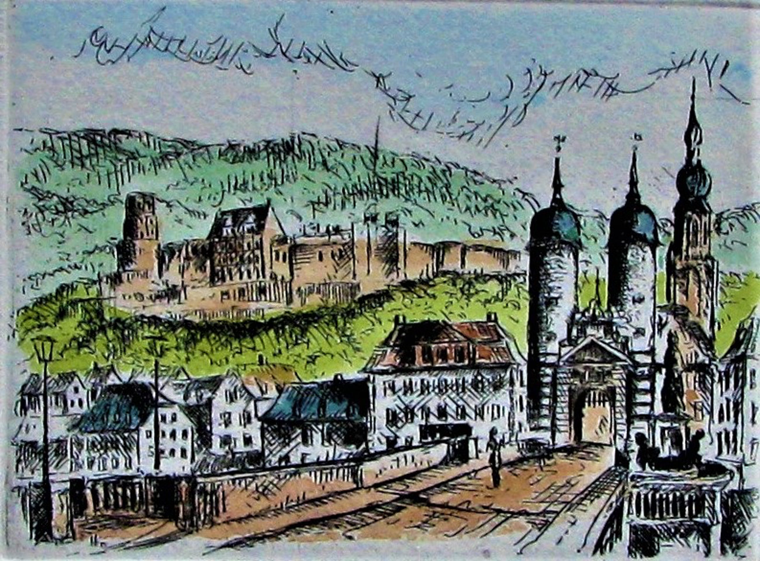 Heidelberg: zeer mooie miniatuurets, met de hand ingekleurd (aquarel) op handgeschept papier.