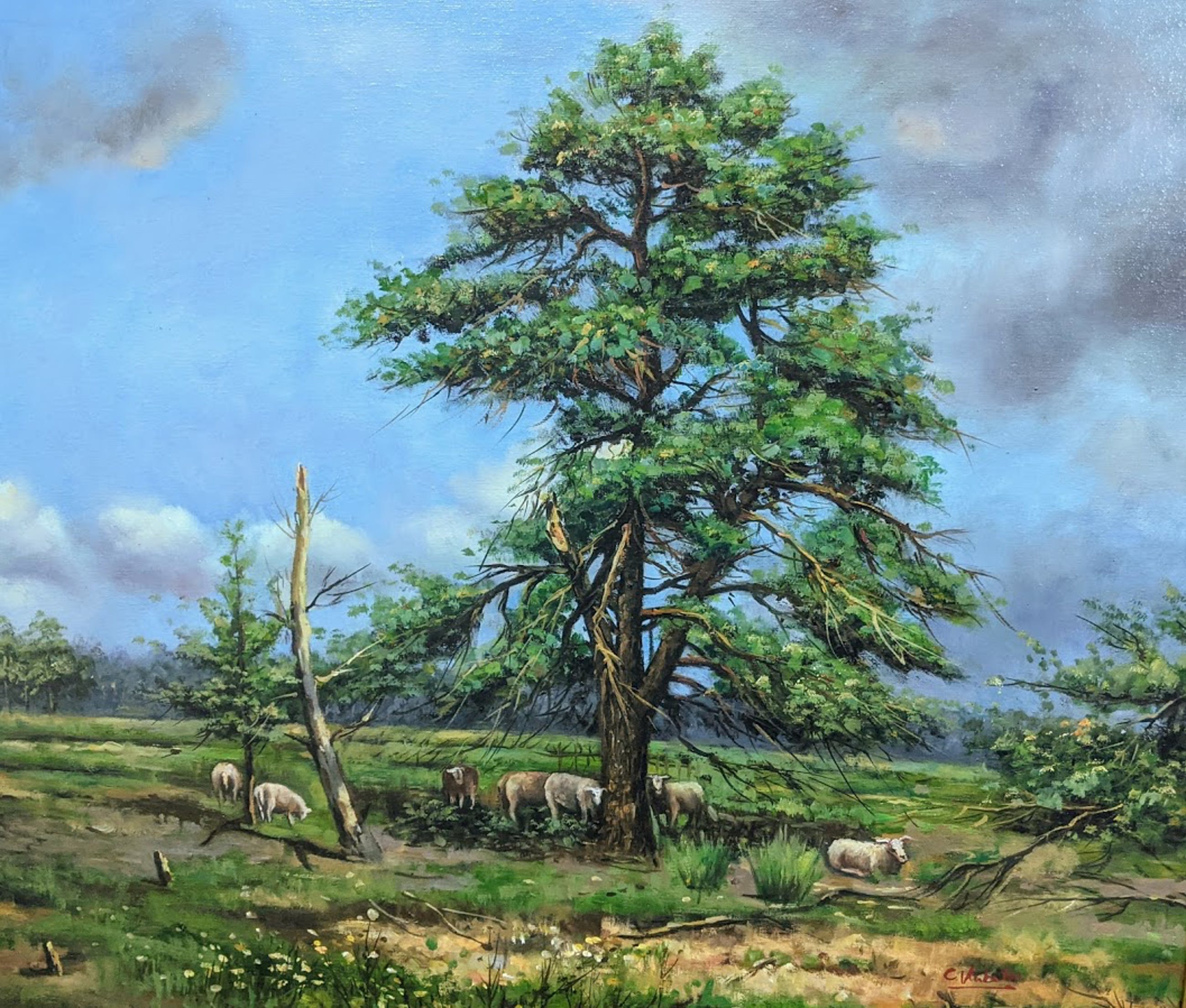 Schilderij is gesigneerd door C. Kintaler. Een voor mij onbekende schilder. Het schilderij heb ik aangeschaft in Dwingeloo. Mogelijk is dit het Dwingelderveld. De kleuren zijn helder en het doek is in uitstekende staat. De lijst is aan de onderzijde beschadigd. Op verzoek kunnen we dit voor u inlijsten tegen meerprijs.