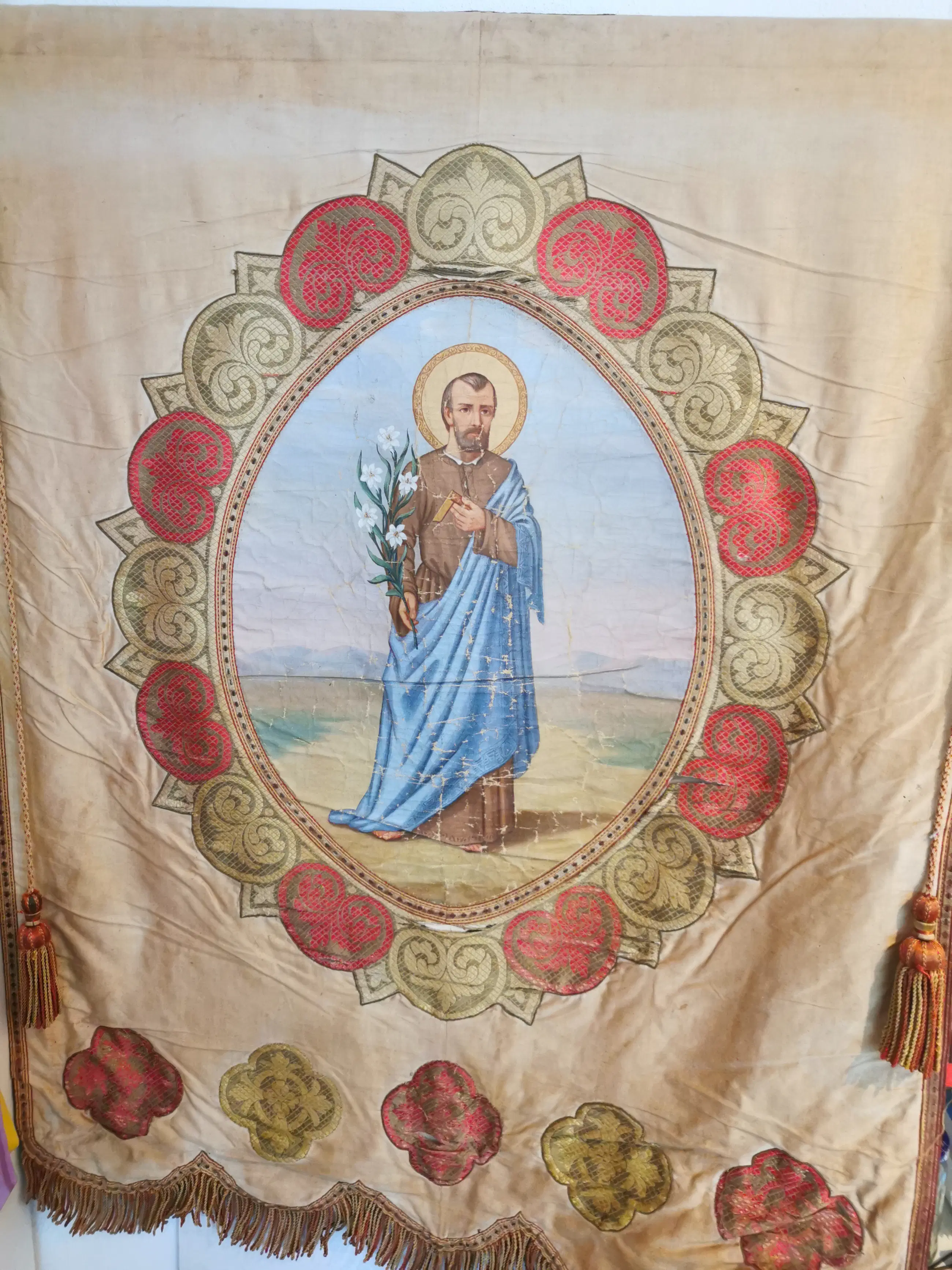 Processie doek met geschilderde afbeelding van de Heilige Jozef met winkelhaak en lelies.