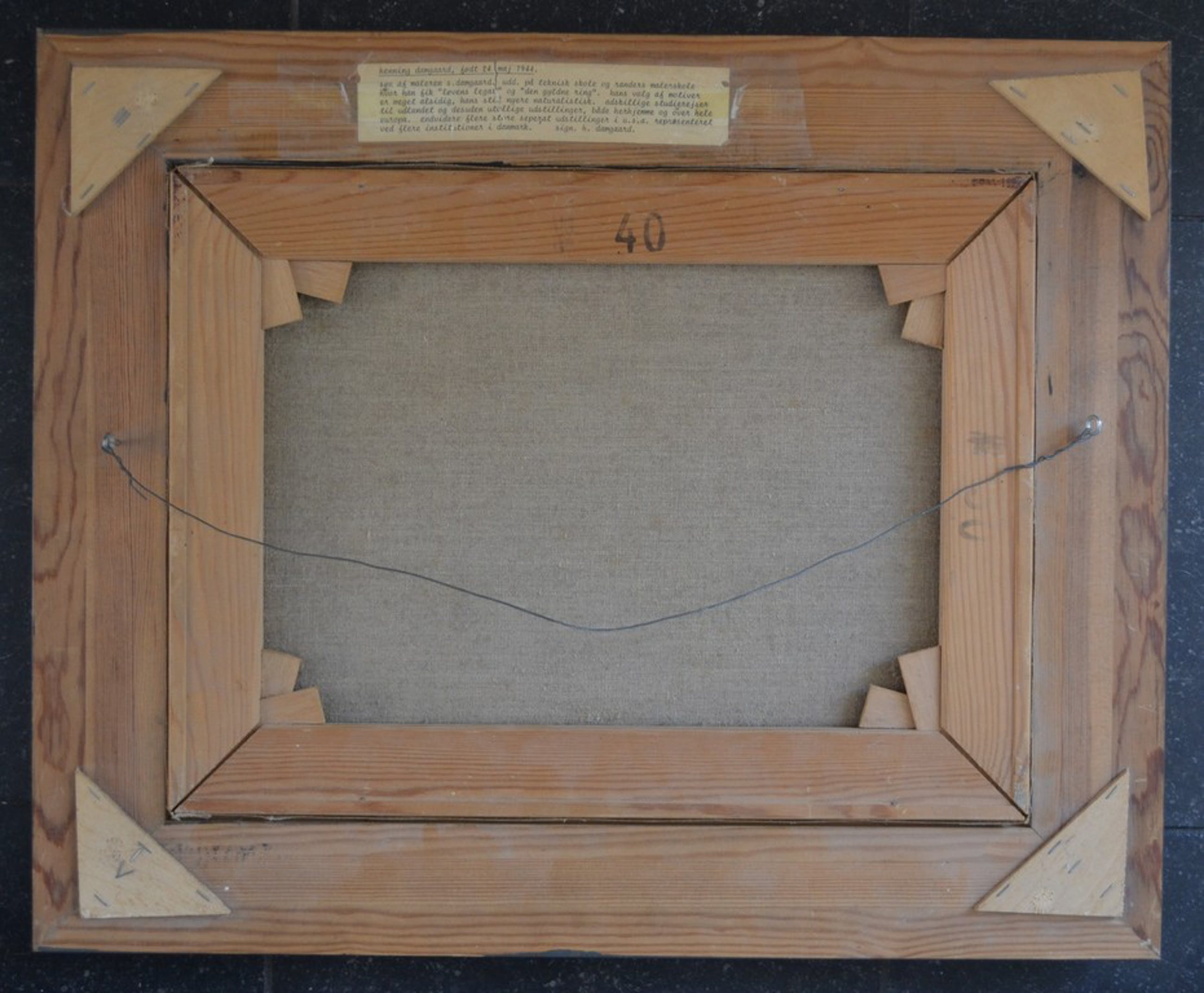 Sfeervol schilderij van een winterslandschap en zonsondergang. Volgens tekst verso, geschilderd door de Deense kunstenaar Henning Damgaard en in uitstekende conditie. Handtekening moeilijk leesbaar.