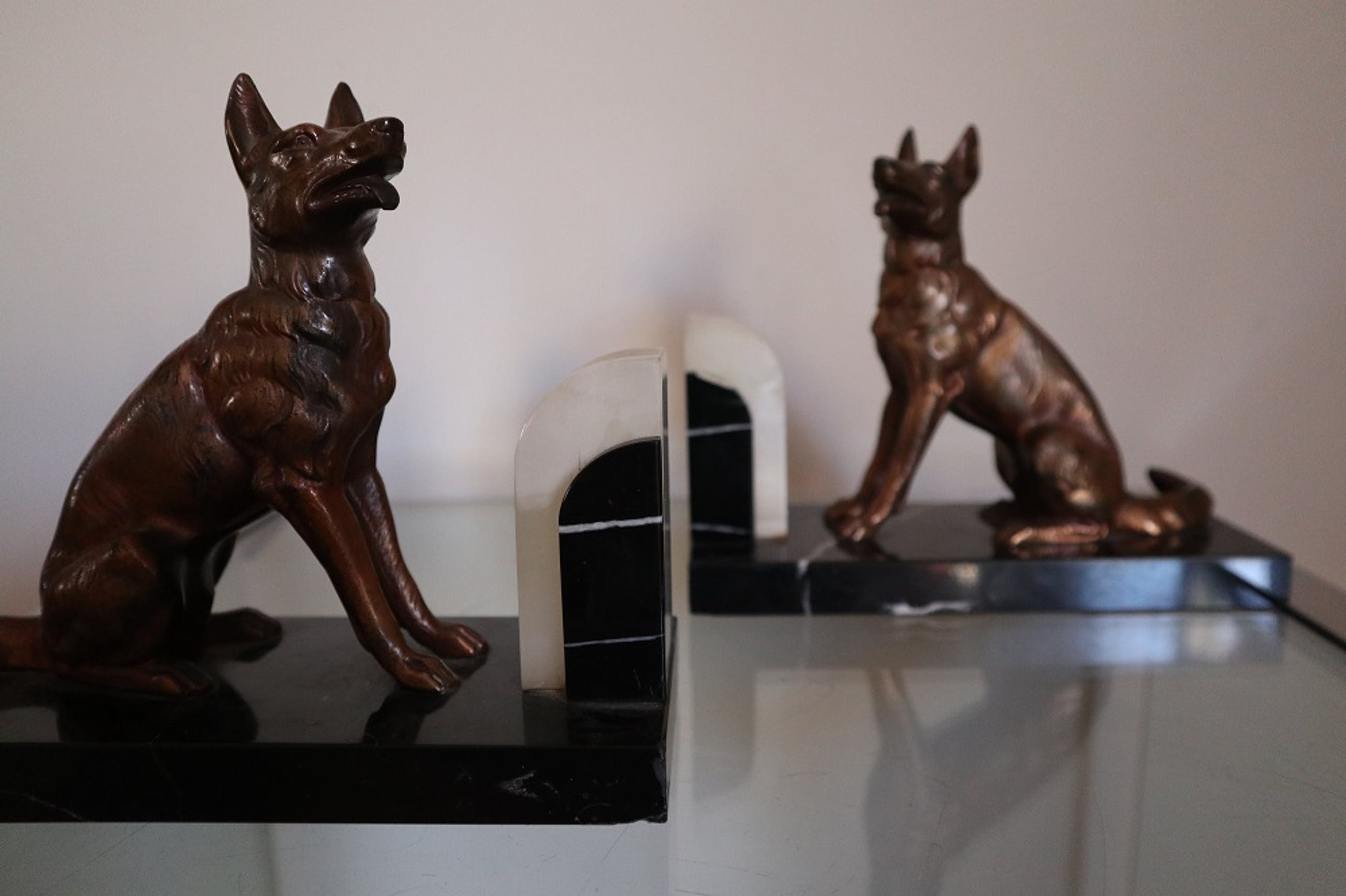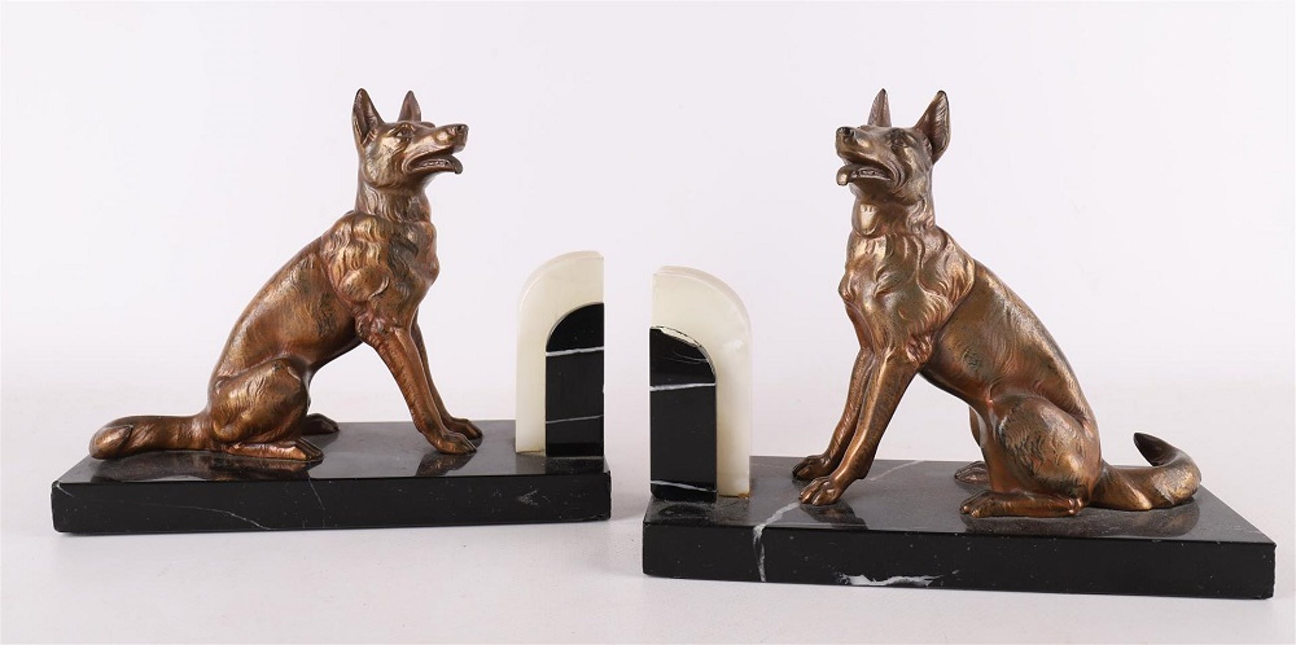 Paar mooie boekensteunen uit de art deco periode, voorstellend twee realistisch vormgegeven herdershonden, gebronsd metaal die rusten op natuursteen.