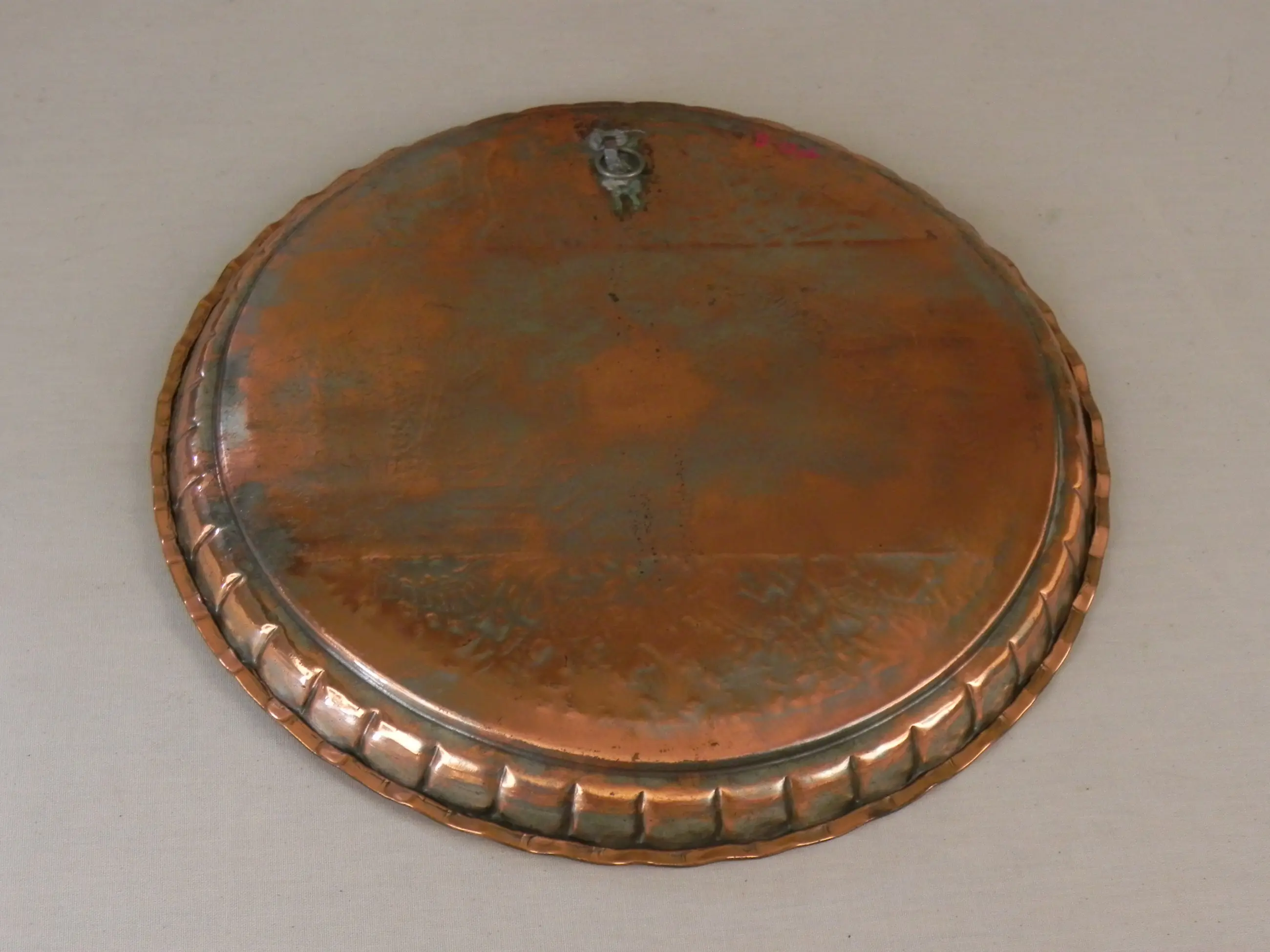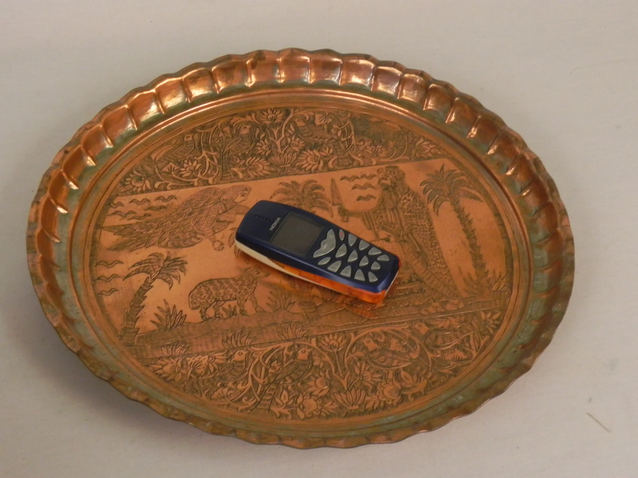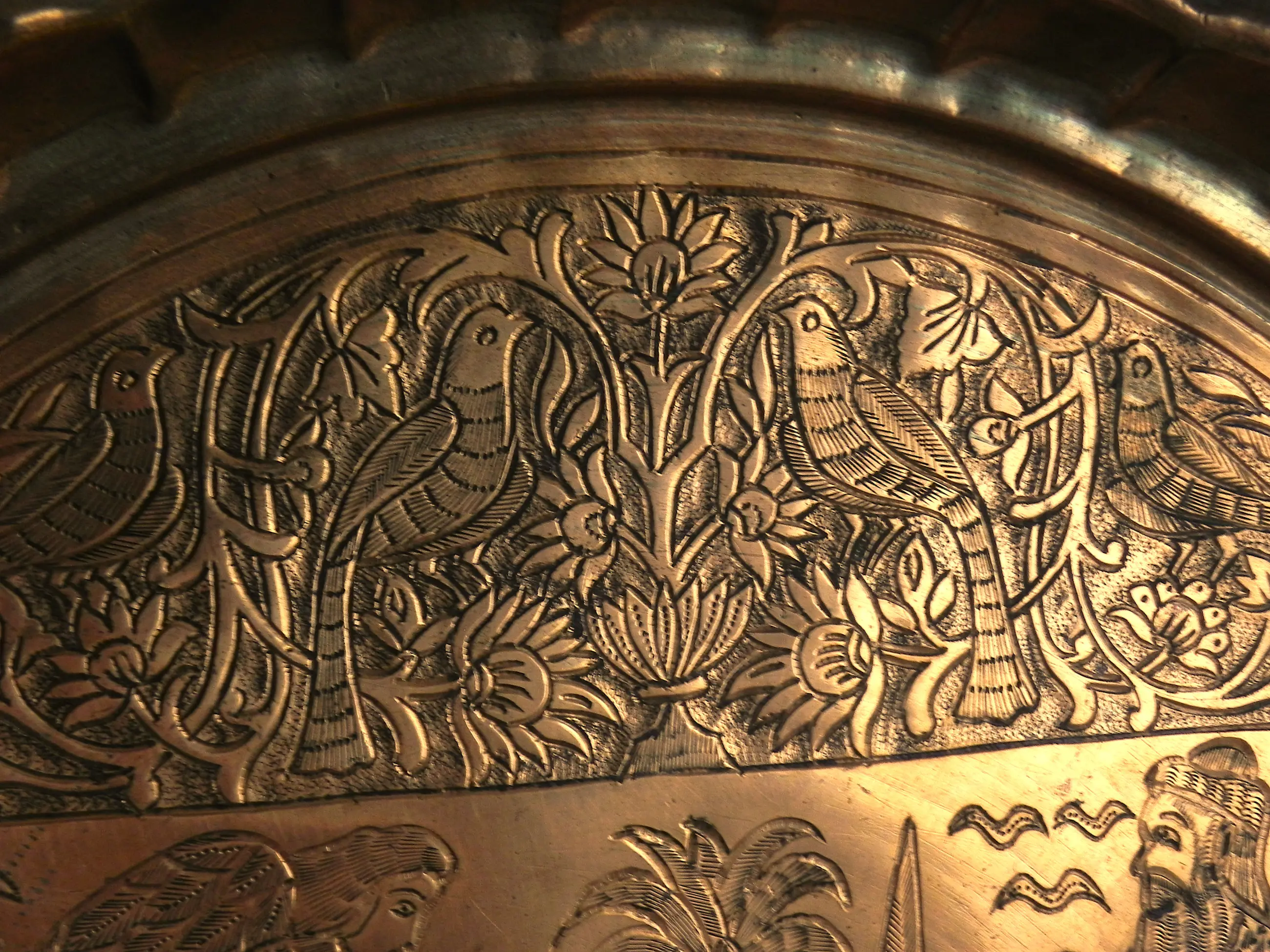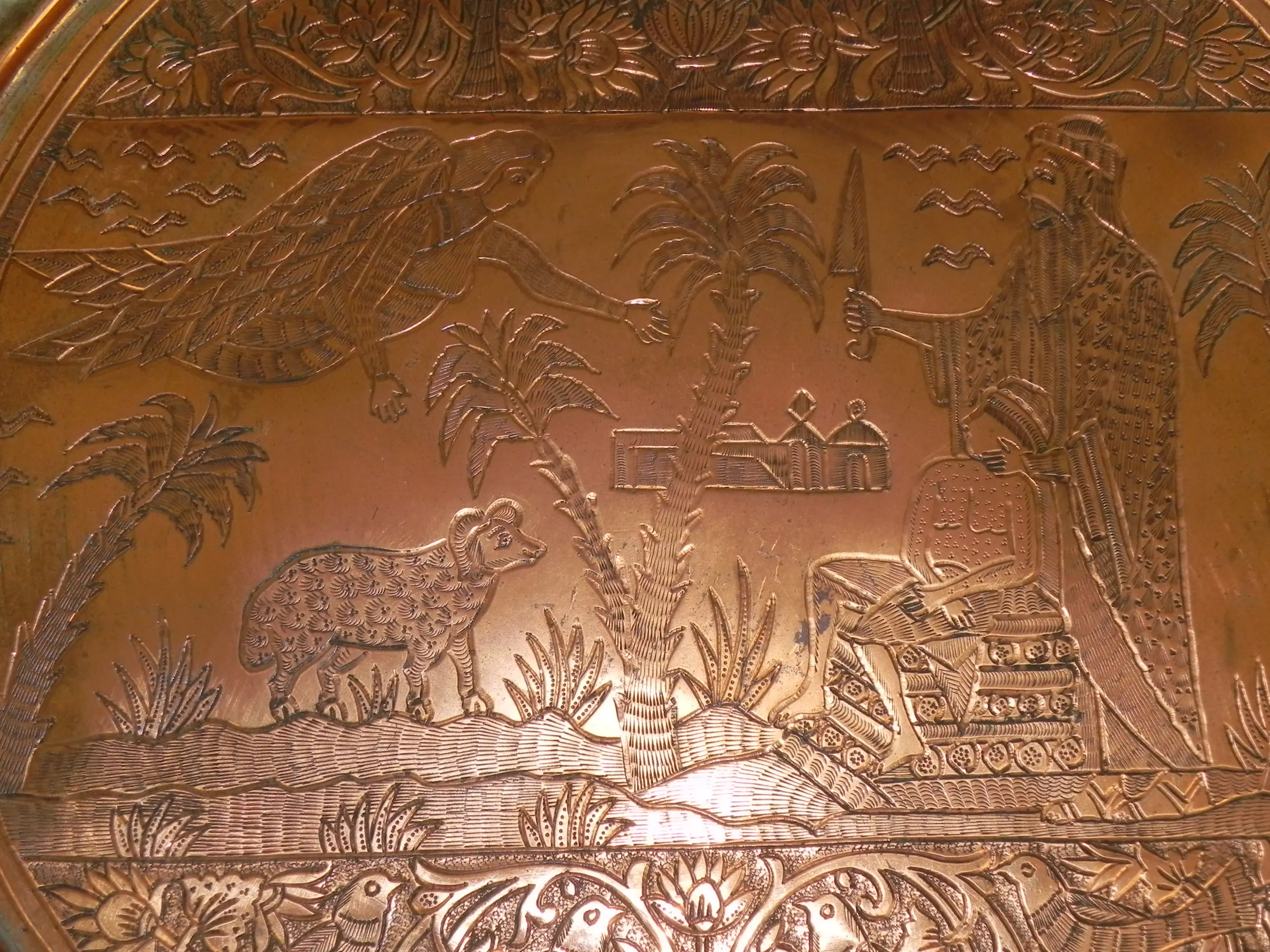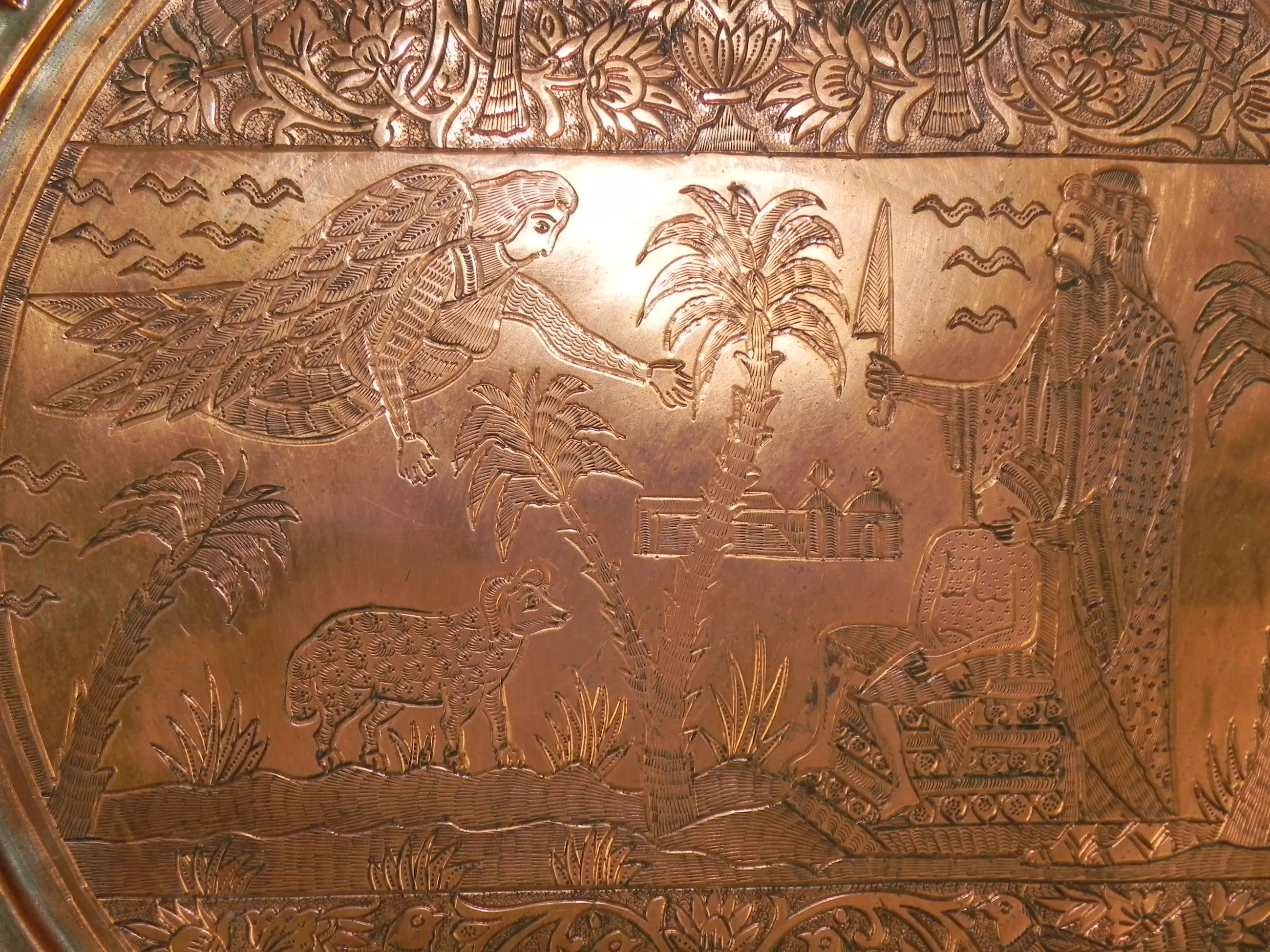 Koperen schaal met de afbeelding van het offer van Isaac door Abraham. Een engel en een ram zijn op de schaal ook te zien.